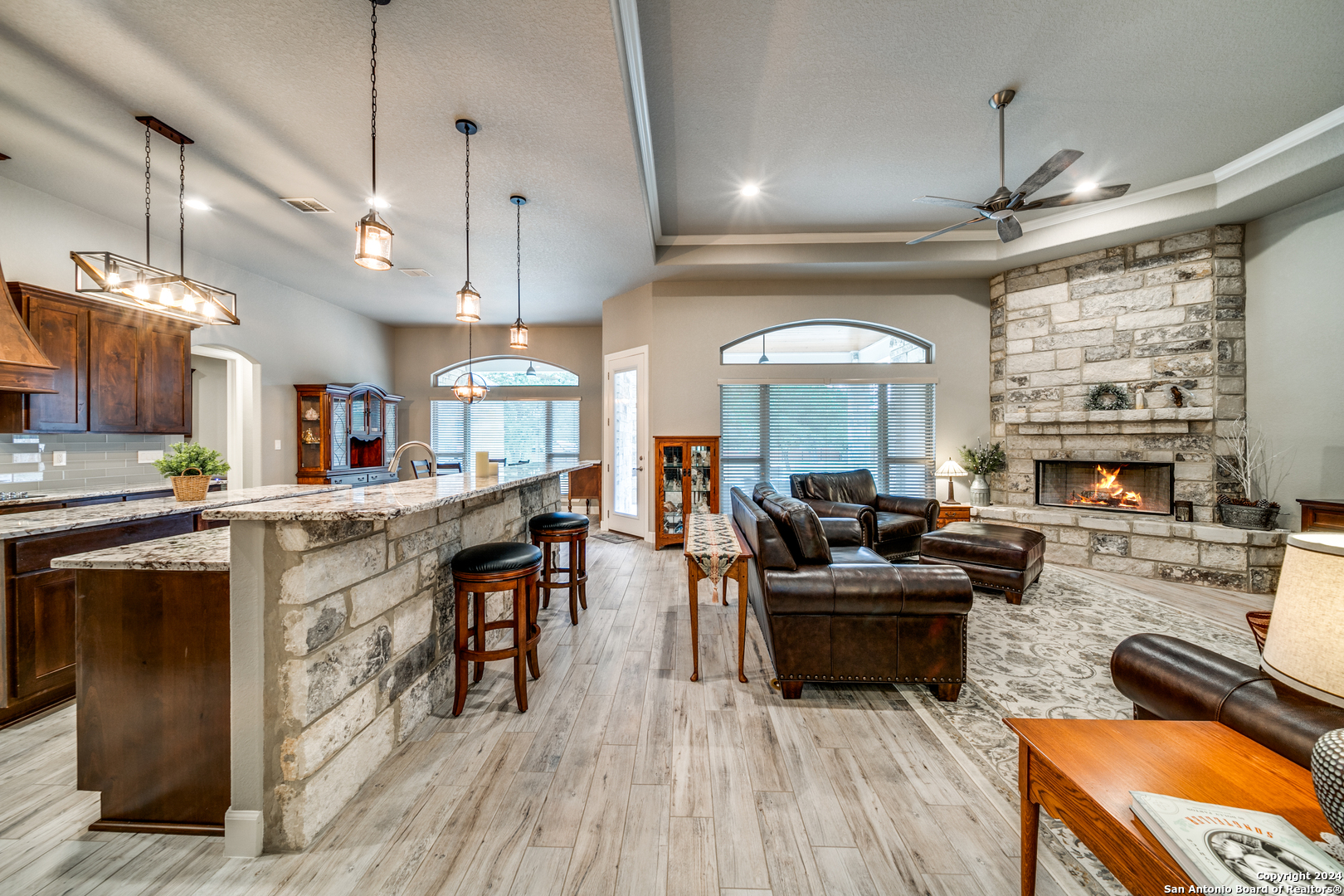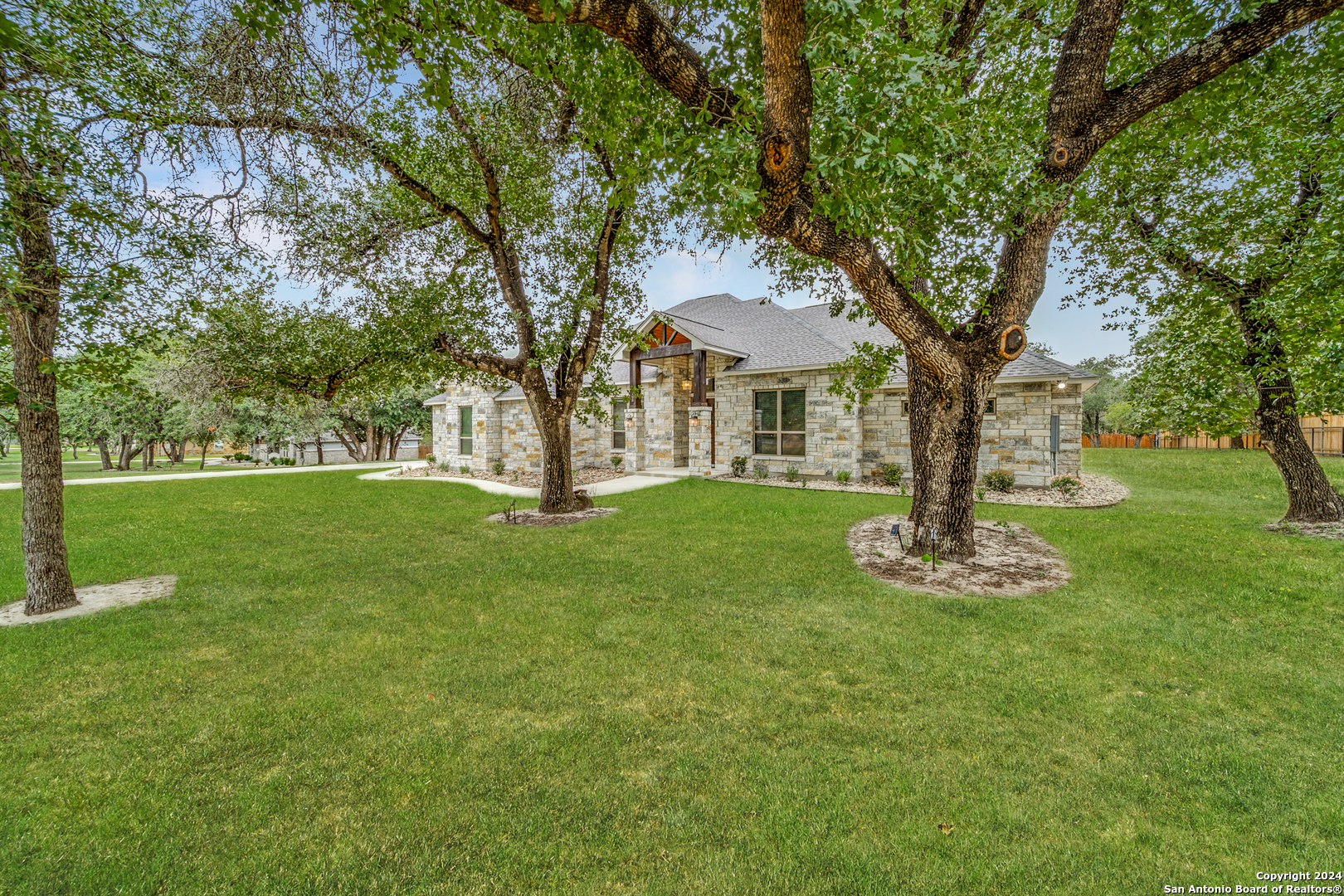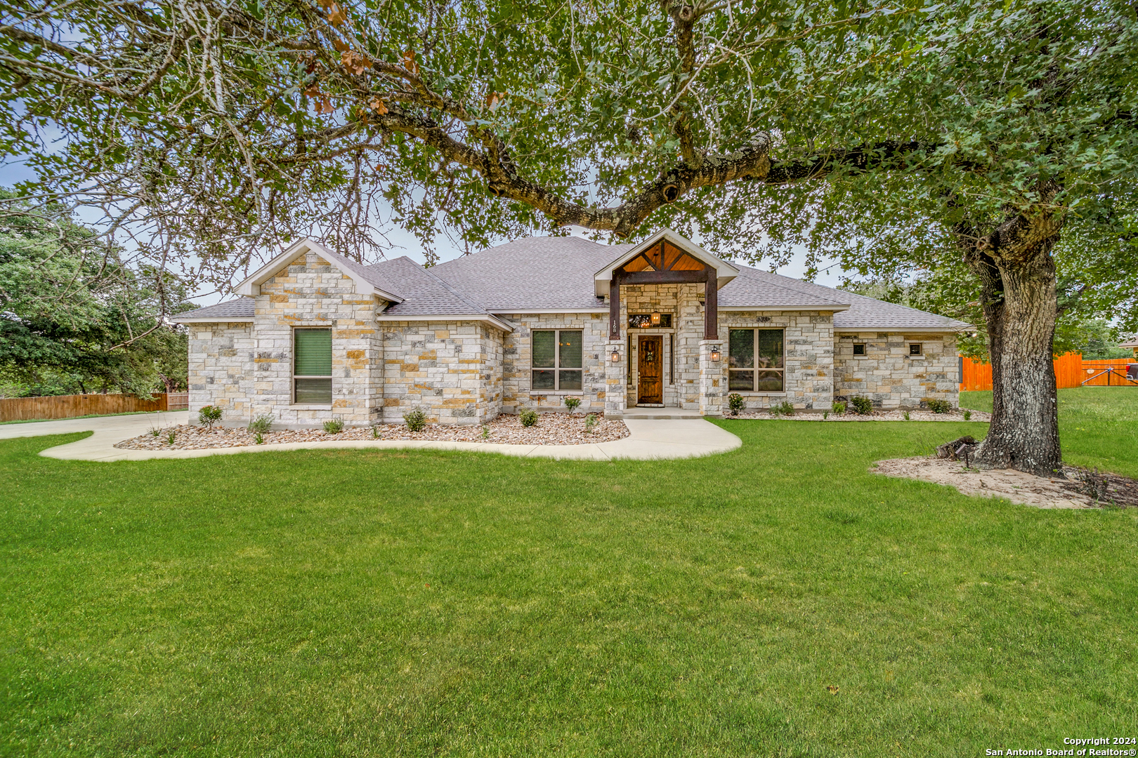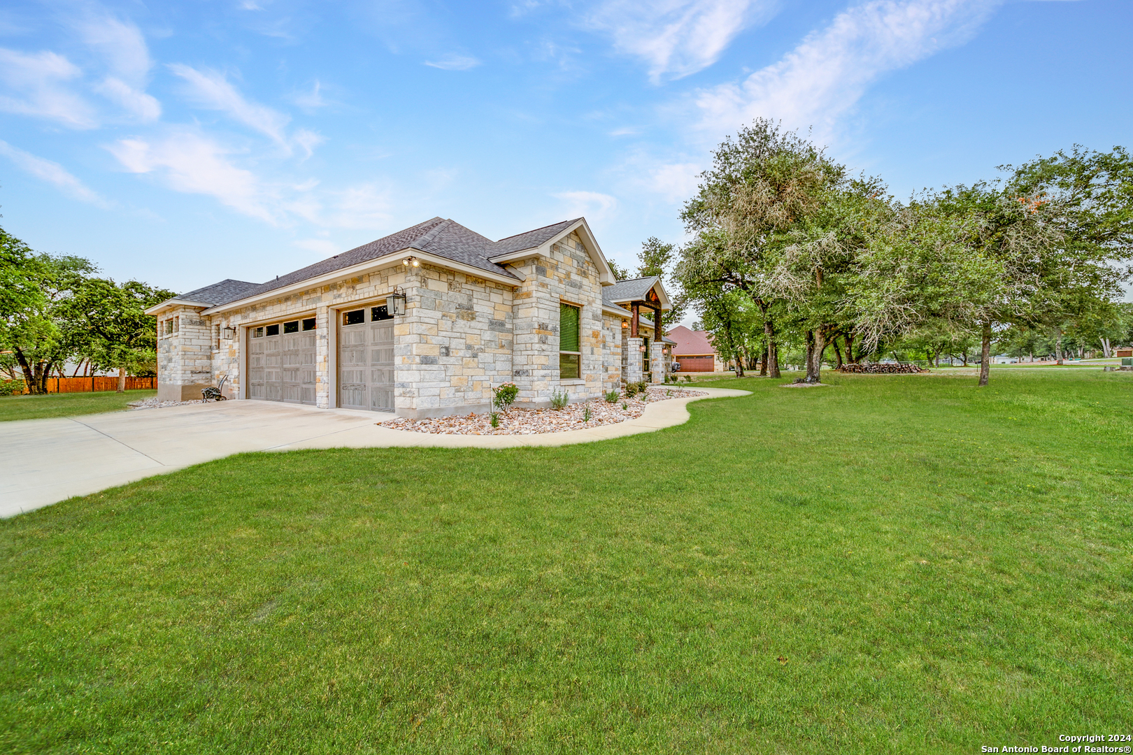 Welcome to this stunning 4-bedroom, 2.5-bath, 3-Car (964 Sqft) garage home that offers a perfect blend of rustic charm and modern convenience in the heart of Eden Crossing subdivision. Nestled on a 1.26-acre lot, the full rock exterior exudes timeless appeal and robust construction, ensuring durability and style. As you step inside, you're greeted by a spacious interior with porcelain wood-look tile, grand 8 ft. doors, high ceilings, granite countertops, crown molded tray ceilings and so much more. The home boasts large bedrooms, each designed with comfort and relaxation in mind. The house also has several features including a tankless water heater, pre-wire for security and surround, exterior soffit lighting, and pre-plumb for water softener. The primary suite is a true sanctuary, offering a serene escape with its generous proportions and an en-suite bathroom that features modern fixtures and ample storage. Enter your oversized laundry room from the primary bathroom or hallway. The heart of this home is undoubtedly its expansive kitchen. A chef's dream, the kitchen is outfitted with sleek upgraded Kitchenaid stainless steel appliances. The abundant counter space and storage options, along with a large central island, ensure that you have everything you need for cooking and entertaining. The living area is equally impressive, with an open and airy layout promoting a seamless flow from room to room. The windows are tinted with XPEL window tint, which allows natural light with UV protection and lowers the heat from the outdoor Texas sun. Step into your oversized three-garage (964 Sqft) at a depth of 27 feet with commercial-grade garage doors for the perfect storage for all your vehicles and shop space. If you need space for your RV, enjoy the 16-foot driveway that leads to your 50 Amp RV electric outlet and drain for water and waste connection. Enjoy quiet evenings on your oversized patio featuring a custom wooden ceiling. This space is prewired for your TV and outdoor speakers while leaving plenty of space for your grill and smoker for the perfect outdoor retreat. This home provides the best of both worlds: a peaceful, rural setting with the convenience of modern amenities. Don't miss the opportunity to own this remarkable home!
