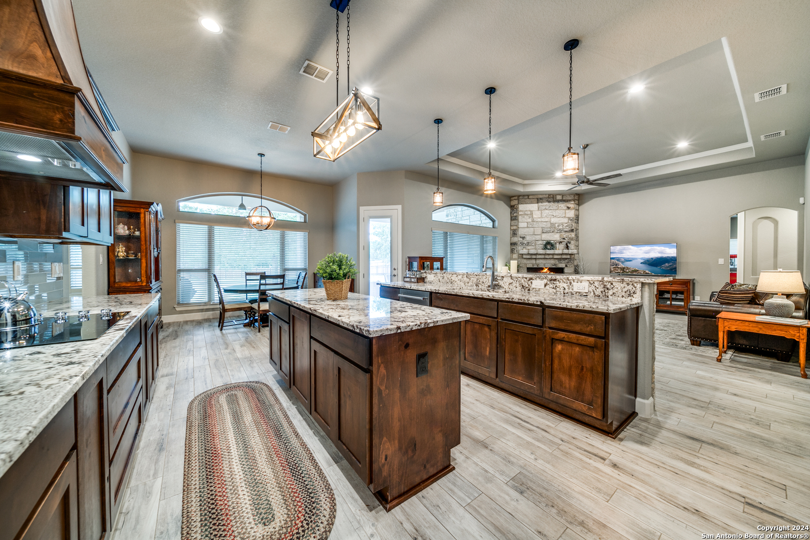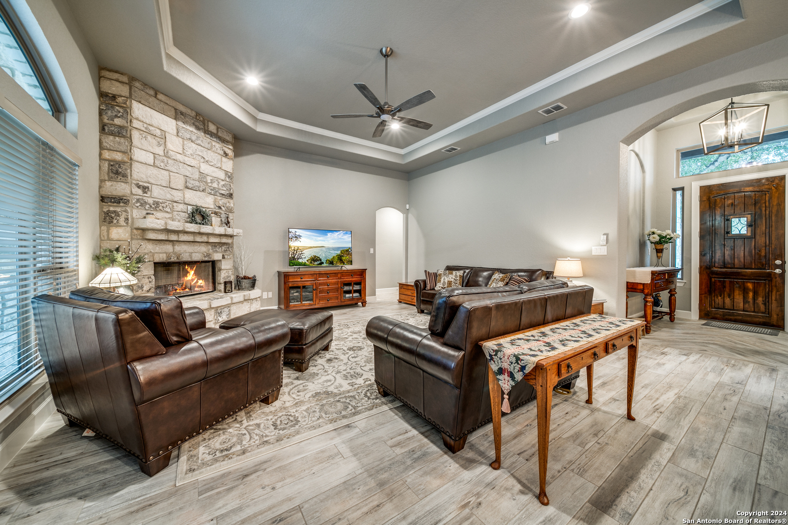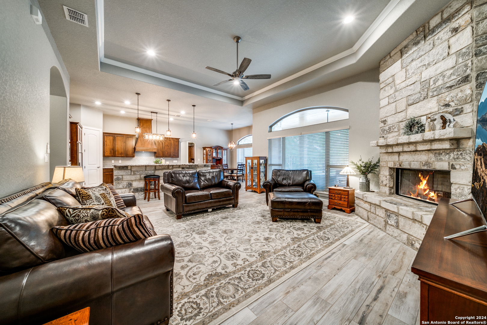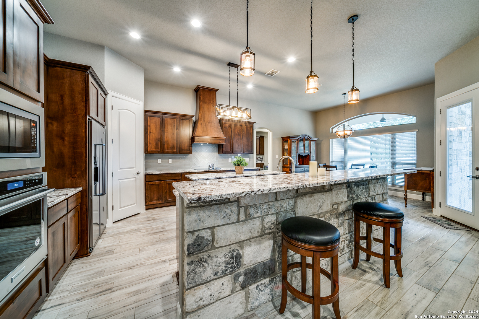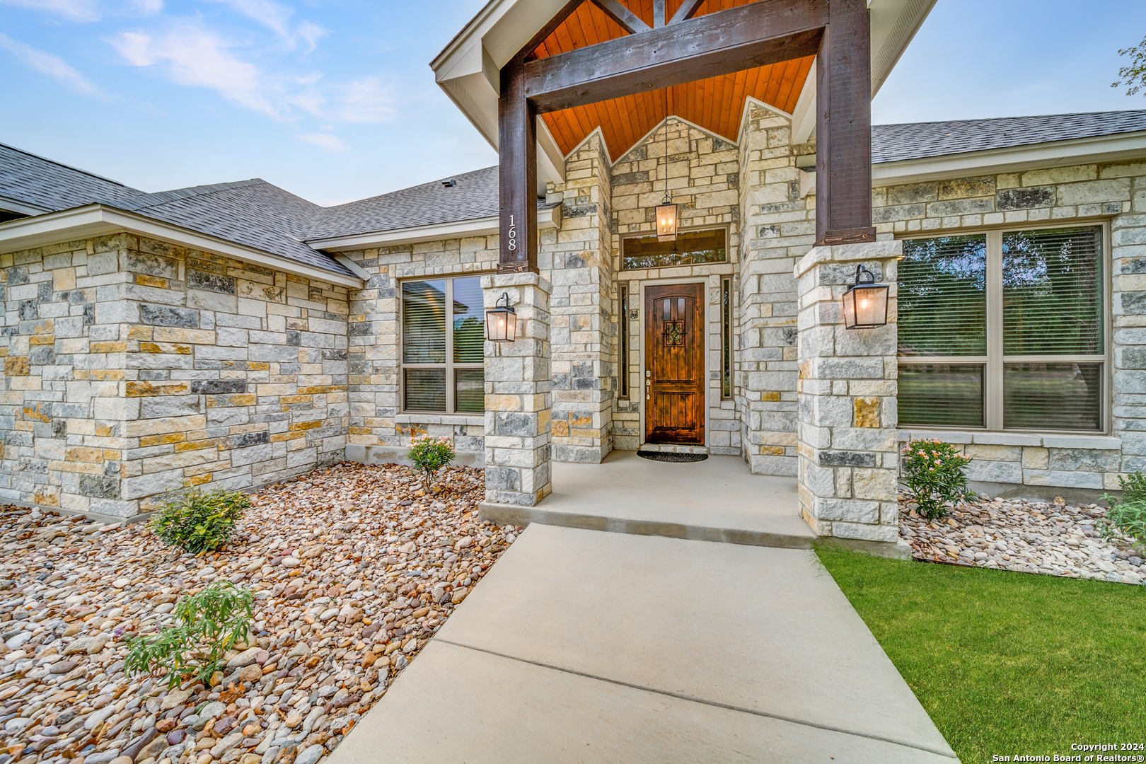 Welcome to this stunning 4-bedroom, 2.5-bath, 3-Car (964 Sqft) garage home that offers a perfect blend of rustic charm and modern convenience in the heart of Eden Crossing subdivision. Nestled on a 1.26-acre lot, the full rock exterior exudes timeless appeal and robust construction, ensuring durability and style. As you step inside, you're greeted by a spacious interior with porcelain wood-look tile, grand 8 ft. doors, high ceilings, granite countertops, crown molded tray ceilings and so much more. The home boasts large bedrooms, each designed with comfort and relaxation in mind. The house also has several features including a tankless water heater, pre-wire for security and surround, exterior soffit lighting, and pre-plumb for water softener. The primary suite is a true sanctuary, offering a serene escape with its generous proportions and an en-suite bathroom that features modern fixtures and ample storage. Enter your oversized laundry room from the primary bathroom or hallway. The heart of this home is undoubtedly its expansive kitchen. A chef's dream, the kitchen is outfitted with sleek upgraded Kitchenaid stainless steel appliances. The abundant counter space and storage options, along with a large central island, ensure that you have everything you need for cooking and entertaining. The living area is equally impressive, with an open and airy layout promoting a seamless flow from room to room. The windows are tinted with XPEL window tint, which allows natural light with UV protection and lowers the heat from the outdoor Texas sun. Step into your oversized three-garage (964 Sqft) at a depth of 27 feet with commercial-grade garage doors for the perfect storage for all your vehicles and shop space. If you need space for your RV, enjoy the 16-foot driveway that leads to your 50 Amp RV electric outlet and drain for water and waste connection. Enjoy quiet evenings on your oversized patio featuring a custom wooden ceiling. This space is prewired for your TV and outdoor speakers while leaving plenty of space for your grill and smoker for the perfect outdoor retreat. This home provides the best of both worlds: a peaceful, rural setting with the convenience of modern amenities. Don't miss the opportunity to own this remarkable home!