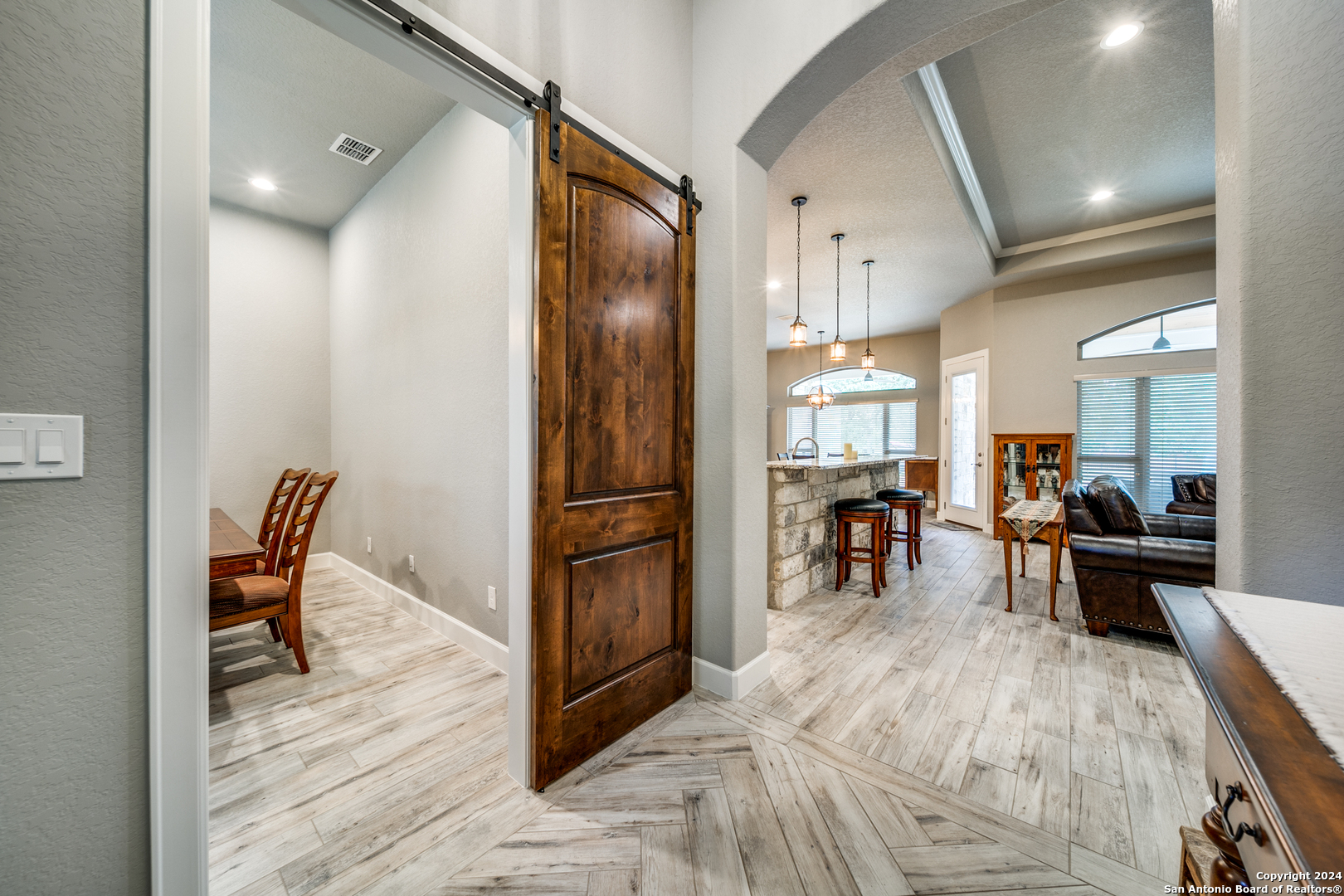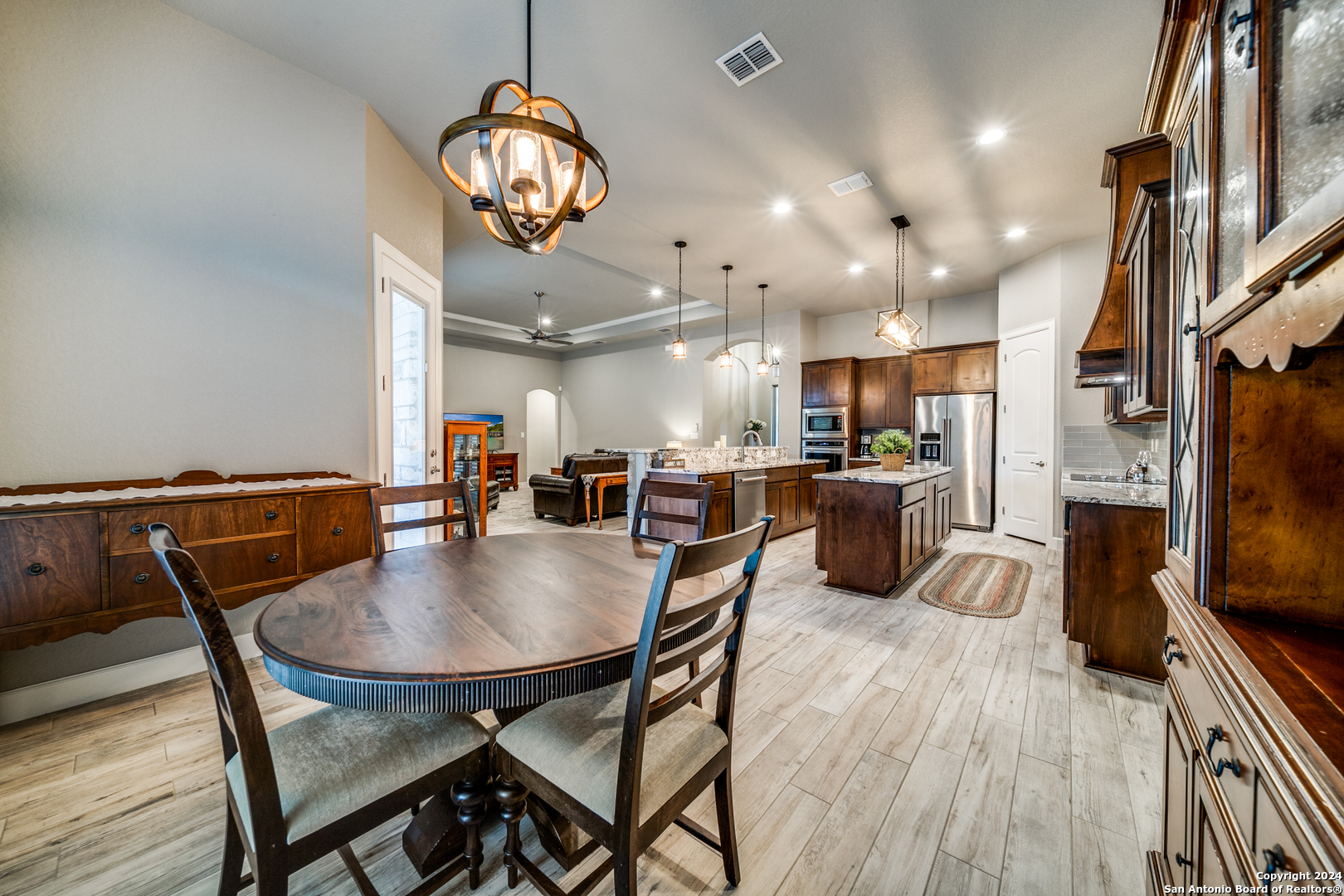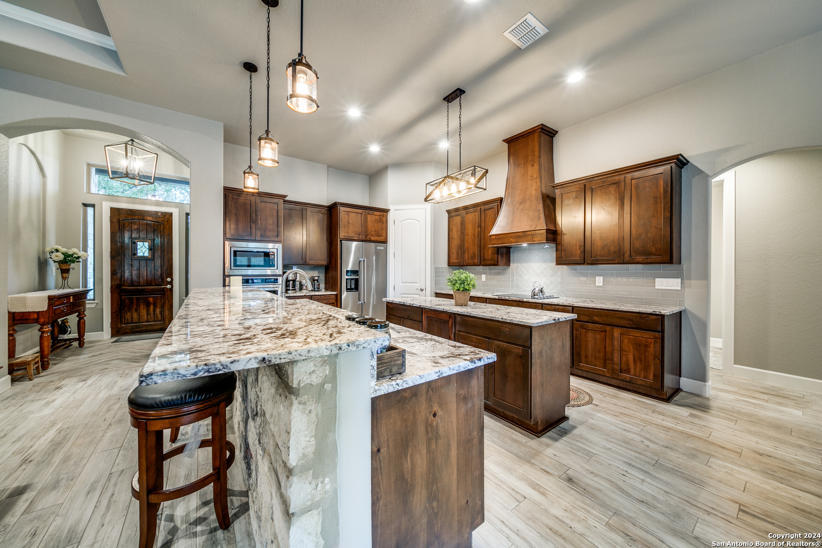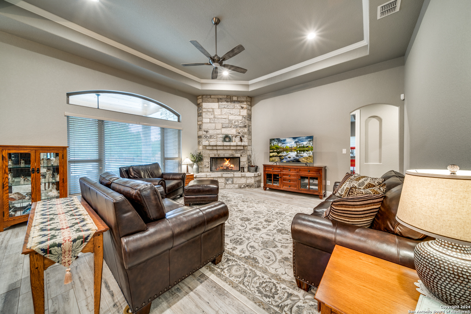 Welcome to this stunning 4-bedroom, 2.5-bath, 3-Car (964 Sqft) garage home that offers a perfect blend of rustic charm and modern convenience in the heart of Eden Crossing subdivision. Nestled on a 1.26-acre lot, the full rock exterior exudes timeless appeal and robust construction, ensuring durability and style. As you step inside, you're greeted by a spacious interior with porcelain wood-look tile, grand 8 ft. doors, high ceilings, granite countertops, crown molded tray ceilings and so much more. The home boasts large bedrooms, each designed with comfort and relaxation in mind. The house also has several features including a tankless water heater, pre-wire for security and surround, exterior soffit lighting, and pre-plumb for water softener. The primary suite is a true sanctuary, offering a serene escape with its generous proportions and an en-suite bathroom that features modern fixtures and ample storage. Enter your oversized laundry room from the primary bathroom or hallway. The heart of this home is undoubtedly its expansive kitchen. A chef's dream, the kitchen is outfitted with sleek upgraded Kitchenaid stainless steel appliances. The abundant counter space and storage options, along with a large central island, ensure that you have everything you need for cooking and entertaining. The living area is equally impressive, with an open and airy layout promoting a seamless flow from room to room. The windows are tinted with XPEL window tint, which allows natural light with UV protection and lowers the heat from the outdoor Texas sun. Step into your oversized three-garage (964 Sqft) at a depth of 27 feet with commercial-grade garage doors for the perfect storage for all your vehicles and shop space. If you need space for your RV, enjoy the 16-foot driveway that leads to your 50 Amp RV electric outlet and drain for water and waste connection. Enjoy quiet evenings on your oversized patio featuring a custom wooden ceiling. This space is prewired for your TV and outdoor speakers while leaving plenty of space for your grill and smoker for the perfect outdoor retreat. This home provides the best of both worlds: a peaceful, rural setting with the convenience of modern amenities. Don't miss the opportunity to own this remarkable home!