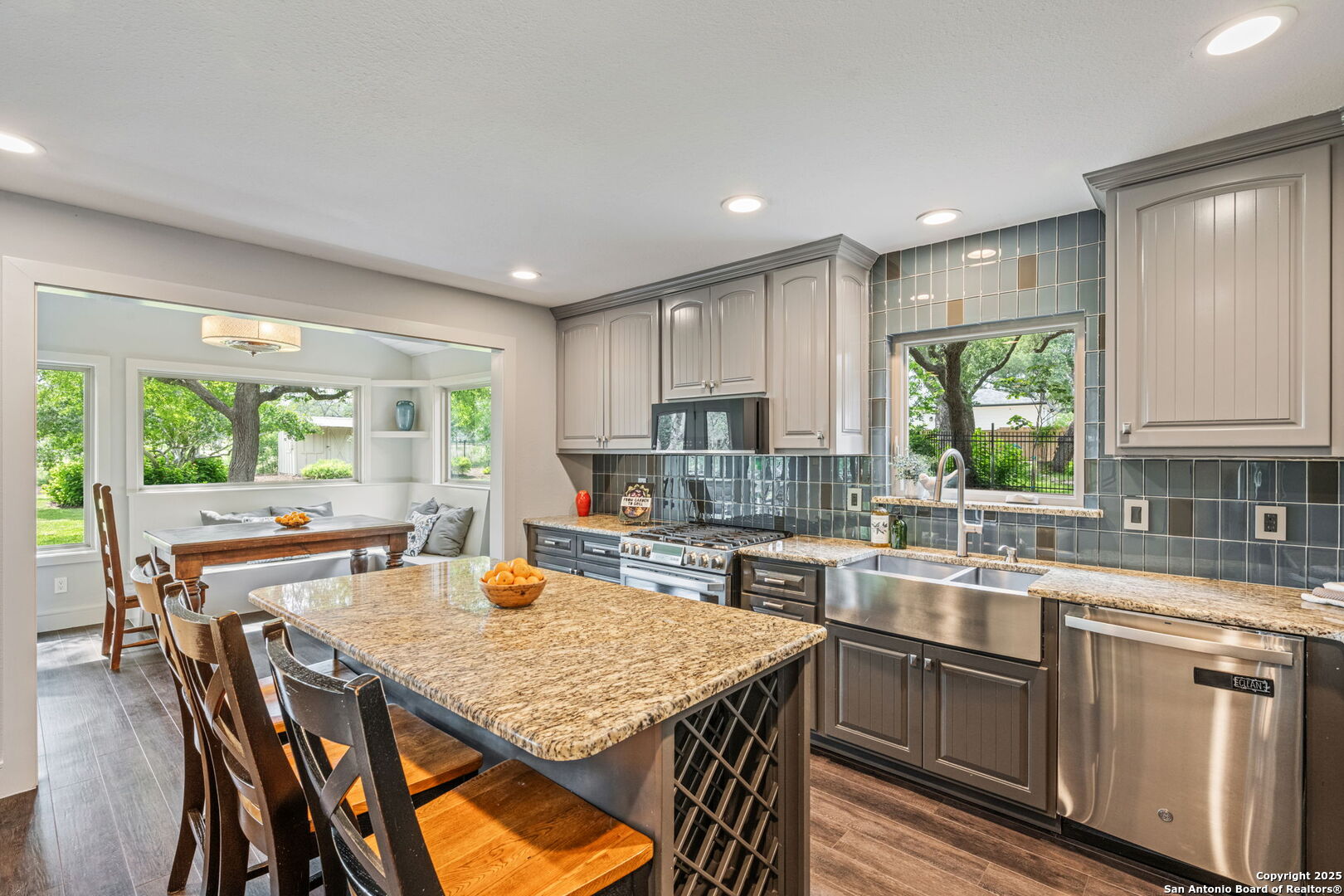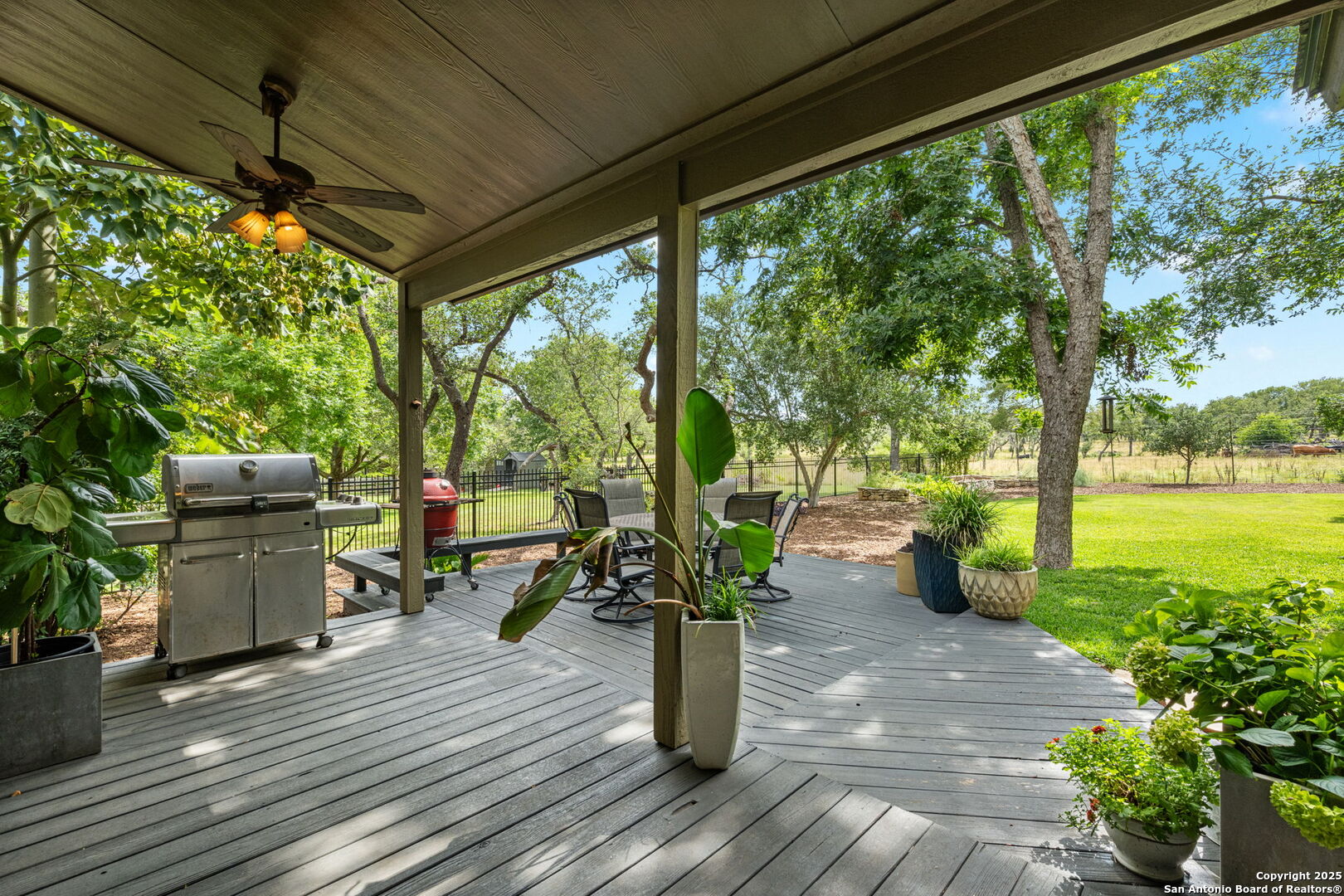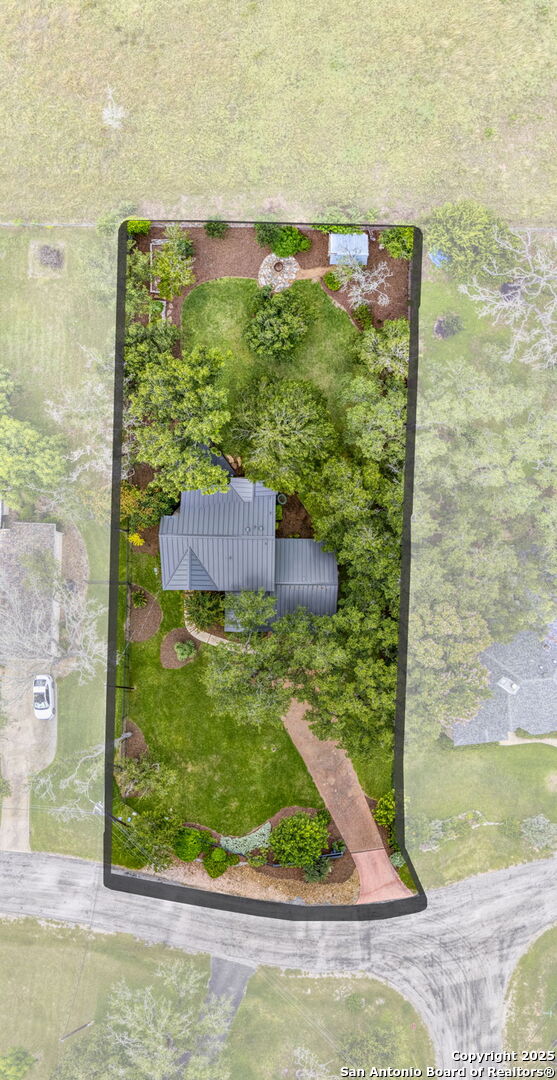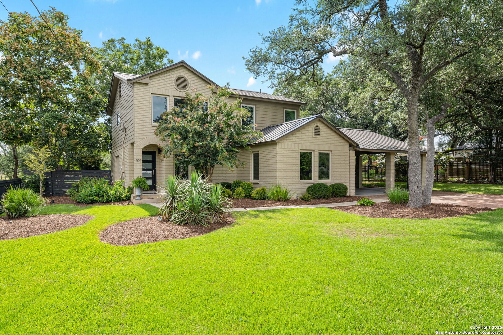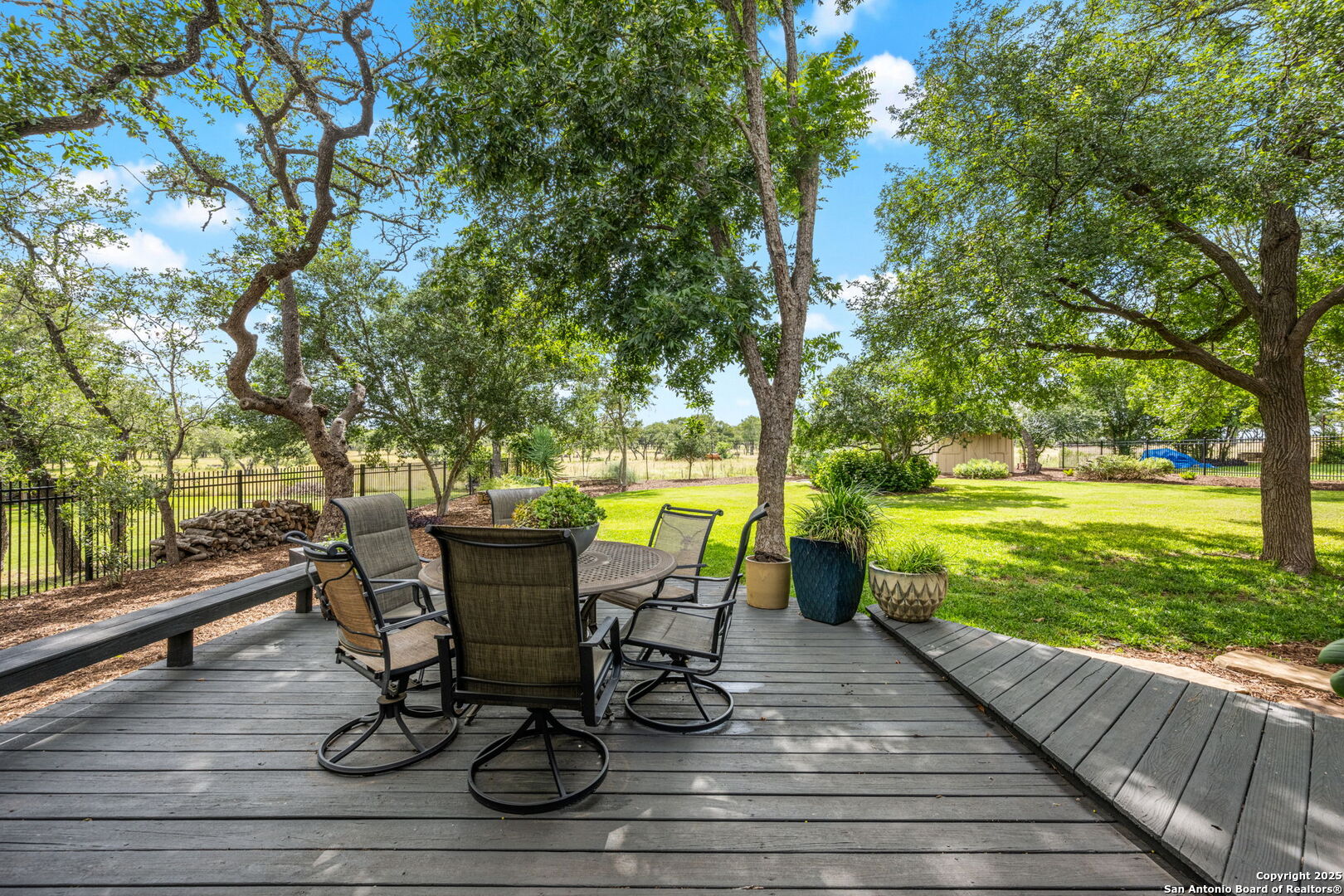 Welcome home to 104 Arrowhead Lane in popular Ranger Creek! Stylishly updated throughout, this home has it all: on-trend finishes, gas cooking in the kitchen, a tankless water heater, replacement windows, a propane tank, lush landscaping, and much more! On the main level, you'll find an open living and dining room that flows into a chef-ready kitchen with a kitchen island, and a breakfast/dining area with built-in banquet benches with storage. The second living area is ideal for family movie nights and provides a built-in drop zone off the carport entry. The laundry room doubles as a prep space with granite counters, cabinetry, and a beverage cooler located conveniently off the kitchen and second living space. As you walk up the tile-accented stairs to the second level, you find an expansive primary suite with sconces, LVP flooring, an attached bath with double sinks, custom oak cabinetry, and a walk-in closet with modular components for easy storage options! The hall bath is stylishly updated and serves the secondary bedrooms. The beautifully landscaped yard is a nature lover's paradise with native trees, mulched beds with native plantings, and raised garden beds with drip irrigation. A further appeal of this home is that it is fenced, gated and the driveway is clad in attractive pavers. The 8x12 storage building has served as a chicken coop for 4-H projects, gardening tools/supplies, and more! The expansive deck provides space to relax & entertain...the large backyard gives you room to roam and play! Ranger Creek is a short drive from IH10, schools + appealing Downtown Boerne and offers a community pool, tennis, and a clubhouse.
