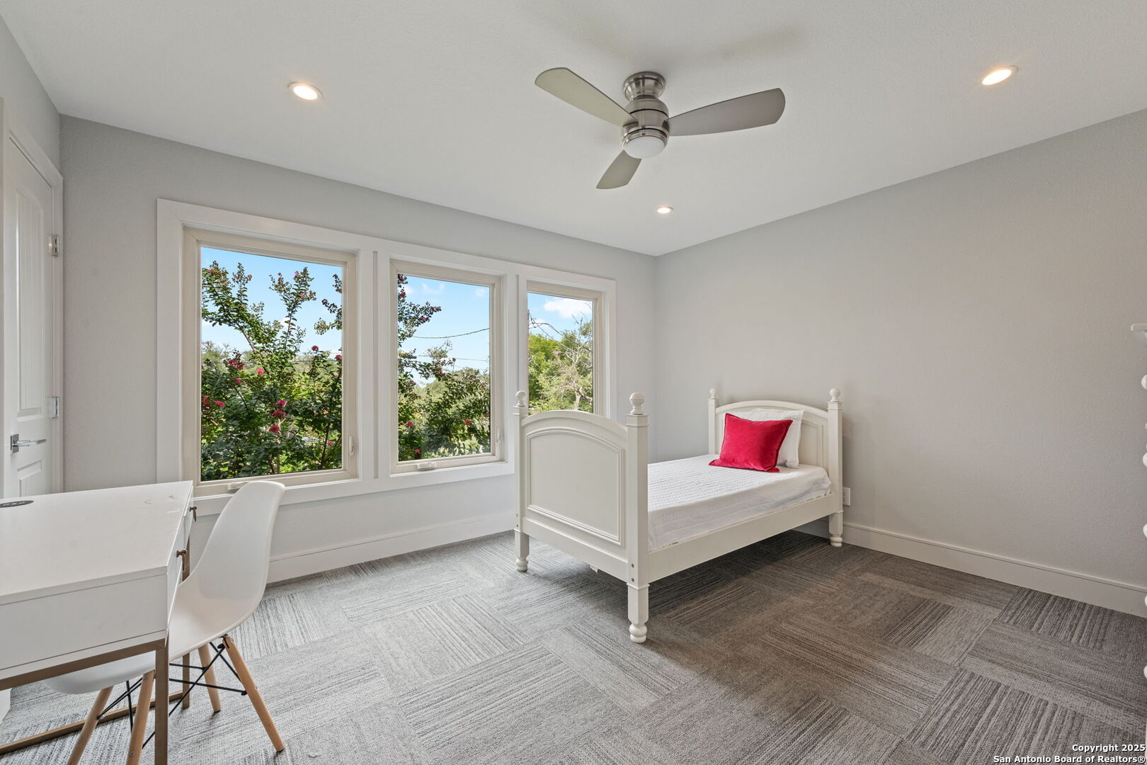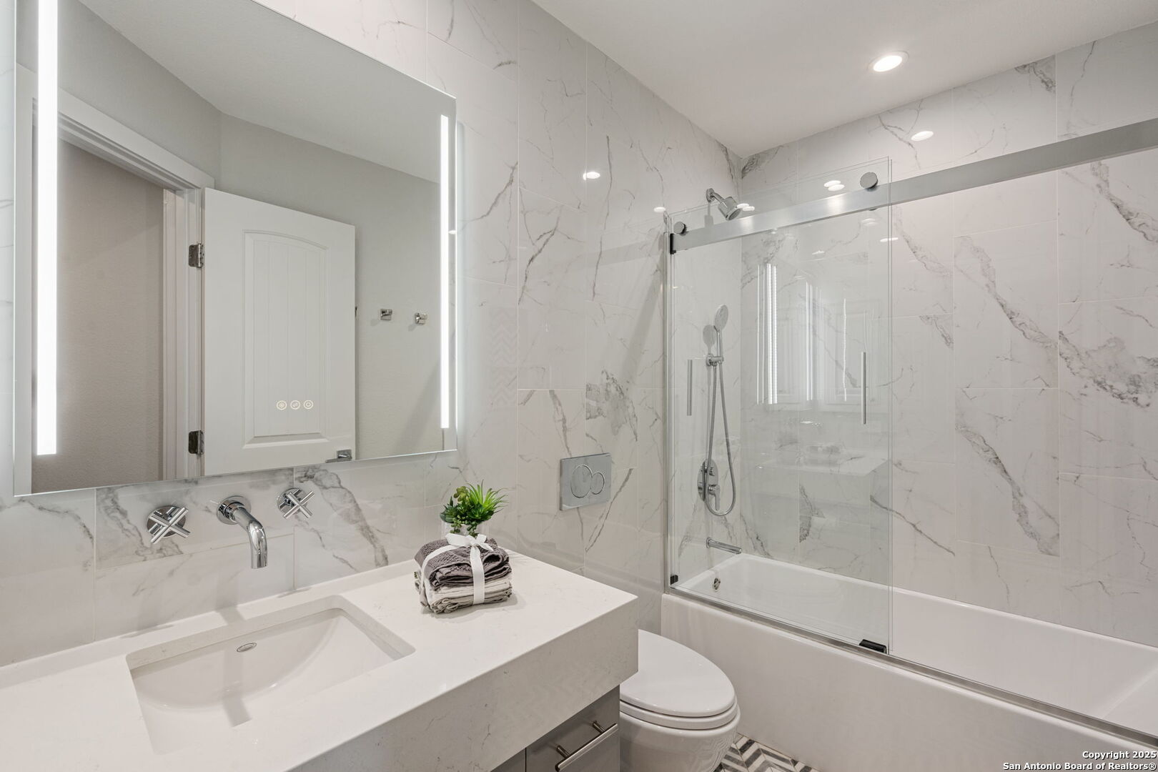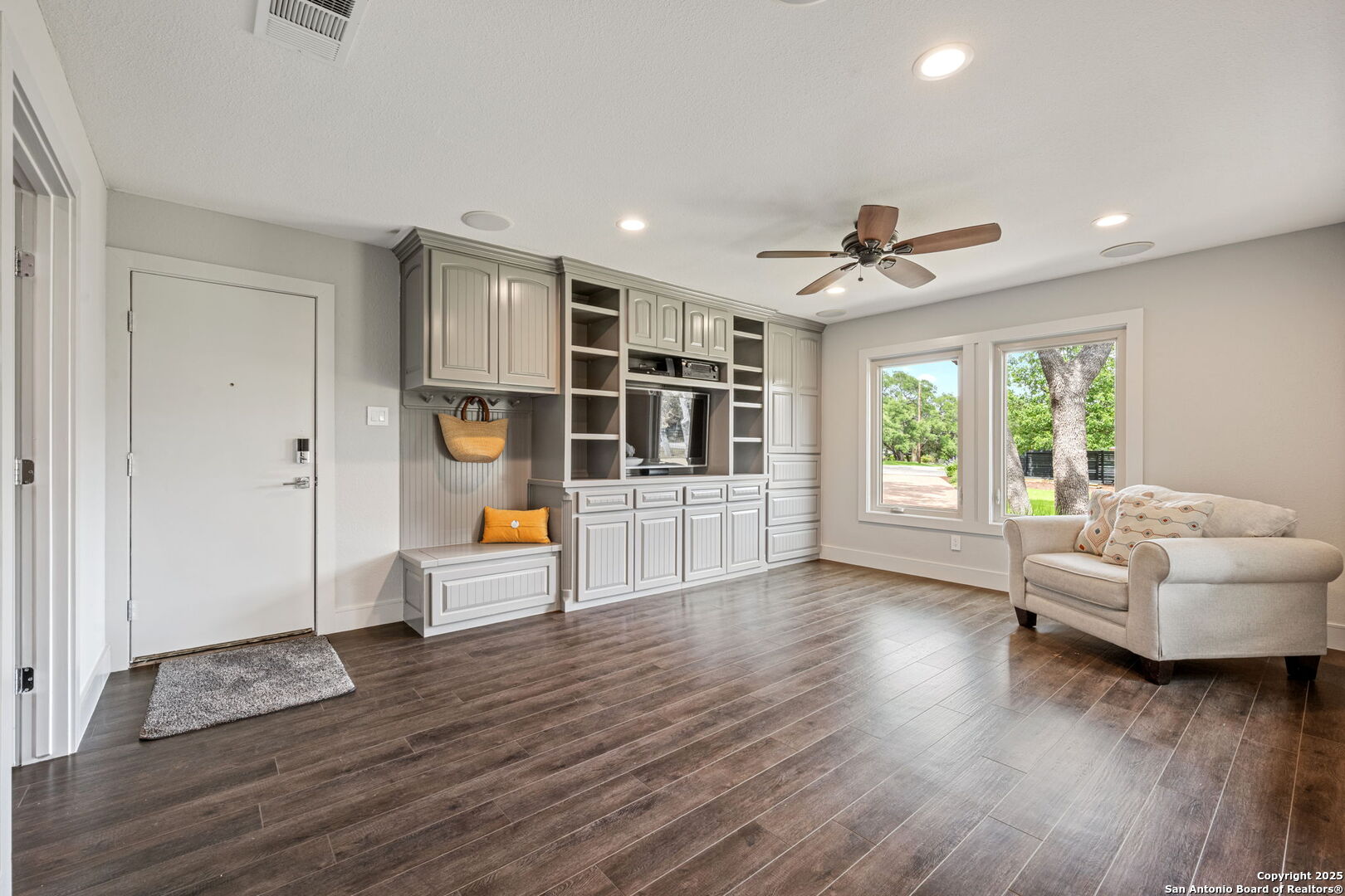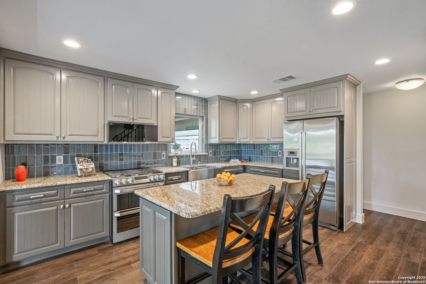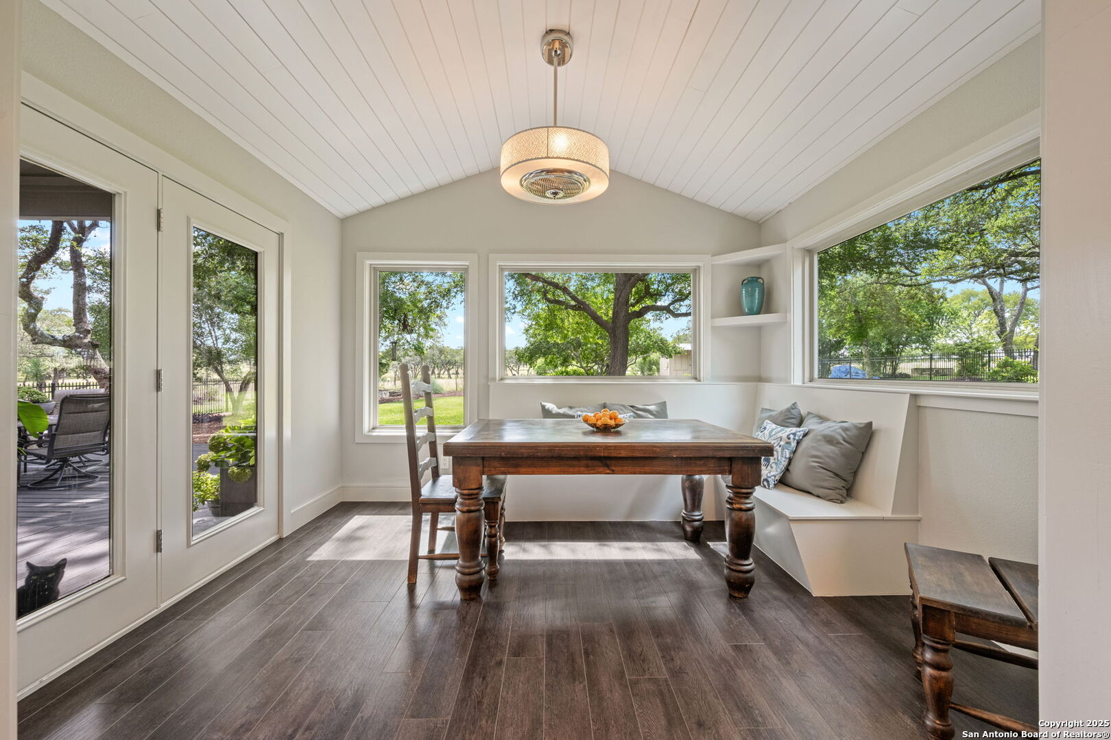 Welcome home to 104 Arrowhead Lane in popular Ranger Creek! Stylishly updated throughout, this home has it all: on-trend finishes, gas cooking in the kitchen, a tankless water heater, replacement windows, a propane tank, lush landscaping, and much more! On the main level, you'll find an open living and dining room that flows into a chef-ready kitchen with a kitchen island, and a breakfast/dining area with built-in banquet benches with storage. The second living area is ideal for family movie nights and provides a built-in drop zone off the carport entry. The laundry room doubles as a prep space with granite counters, cabinetry, and a beverage cooler located conveniently off the kitchen and second living space. As you walk up the tile-accented stairs to the second level, you find an expansive primary suite with sconces, LVP flooring, an attached bath with double sinks, custom oak cabinetry, and a walk-in closet with modular components for easy storage options! The hall bath is stylishly updated and serves the secondary bedrooms. The beautifully landscaped yard is a nature lover's paradise with native trees, mulched beds with native plantings, and raised garden beds with drip irrigation. A further appeal of this home is that it is fenced, gated and the driveway is clad in attractive pavers. The 8x12 storage building has served as a chicken coop for 4-H projects, gardening tools/supplies, and more! The expansive deck provides space to relax & entertain...the large backyard gives you room to roam and play! Ranger Creek is a short drive from IH10, schools + appealing Downtown Boerne and offers a community pool, tennis, and a clubhouse.