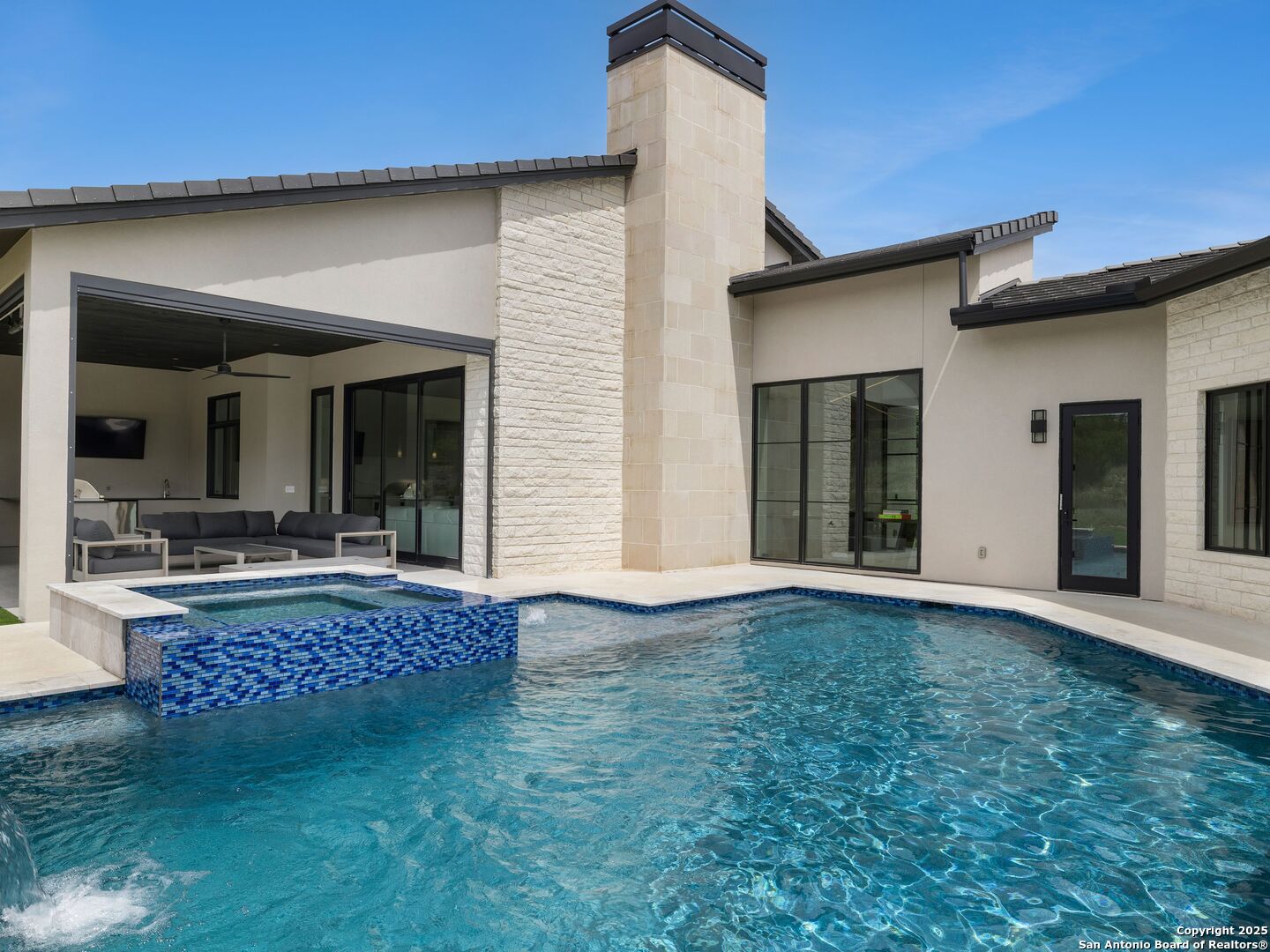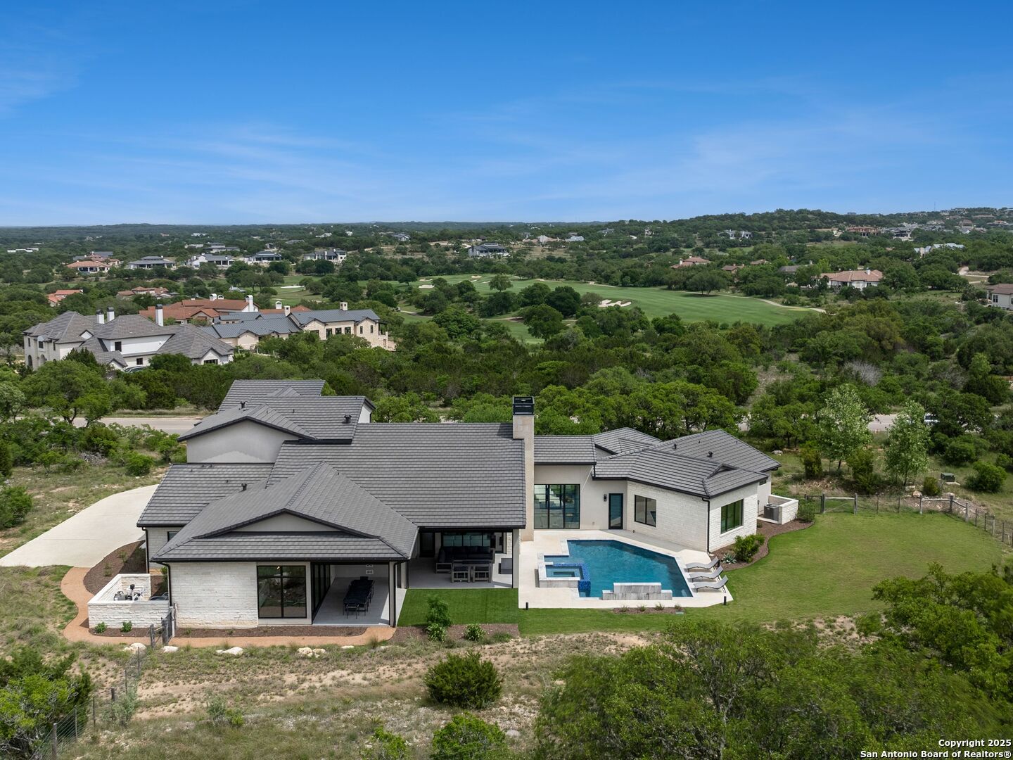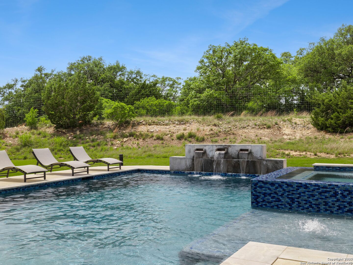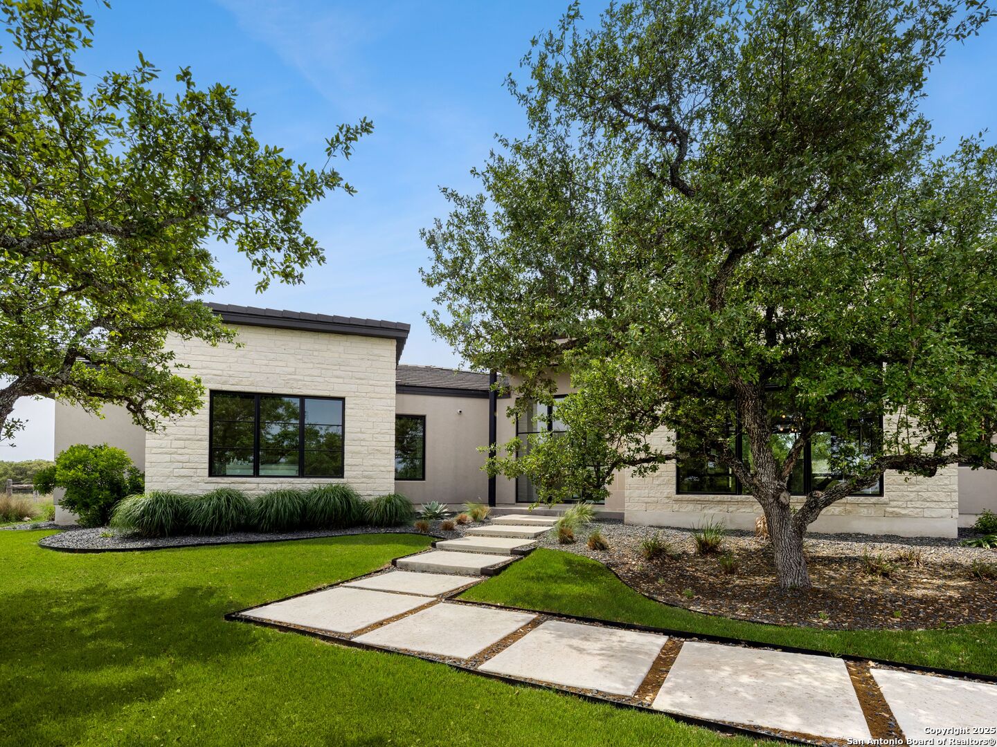 Set within the prestigious Clubs Village at Cordillera Ranch, this custom-built Garner Home offers a refined expression of modern Hill Country living. Thoughtfully designed to balance comfort and elegance, the residence presents a harmonious blend of clean architectural lines, natural light, and well-appointed spaces throughout. Dramatic glass entry doors open to tranquil views of the outdoor oasis and pool and spa. Inside, soaring ceilings and a soft, neutral palette create a sense of calm and openness, while curated finishes add subtle sophistication. The chef's kitchen serves as both a functional workspace and a design centerpiece, with quartzite countertops, a waterfall island, and a full suite of Thermador appliances. It flows seamlessly into the main living area, anchored by a striking floor-to-ceiling stone fireplace. The primary suite is a private sanctuary with a dedicated sitting area and a spa-style bath featuring dual vanities, a freestanding soaking tub, oversized walk-in shower, and separate dressing areas. Upstairs, two additional bedrooms share a private lounge and a covered balcony with long-range views. A main-level guest suite provides privacy and convenience for visitors. The game room is well-suited for entertaining, with a full bar and sliding glass doors that open directly to the outdoor living space for seamless integration. A separate fitness room provides an option for a fifth bedroom, home office, or creative studio. Outdoors, the setting is equally compelling, with a summer kitchen, multiple lounge areas, and a resort-inspired pool and spa. This property includes a Master Full Golf Right to The Clubs of Cordillera Ranch and enjoys access to top-rated Boerne ISD schools. Offering privacy, amenities, and an elevated lifestyle, this home captures the essence of luxury in one of the Hill Country's most sought-after communities.