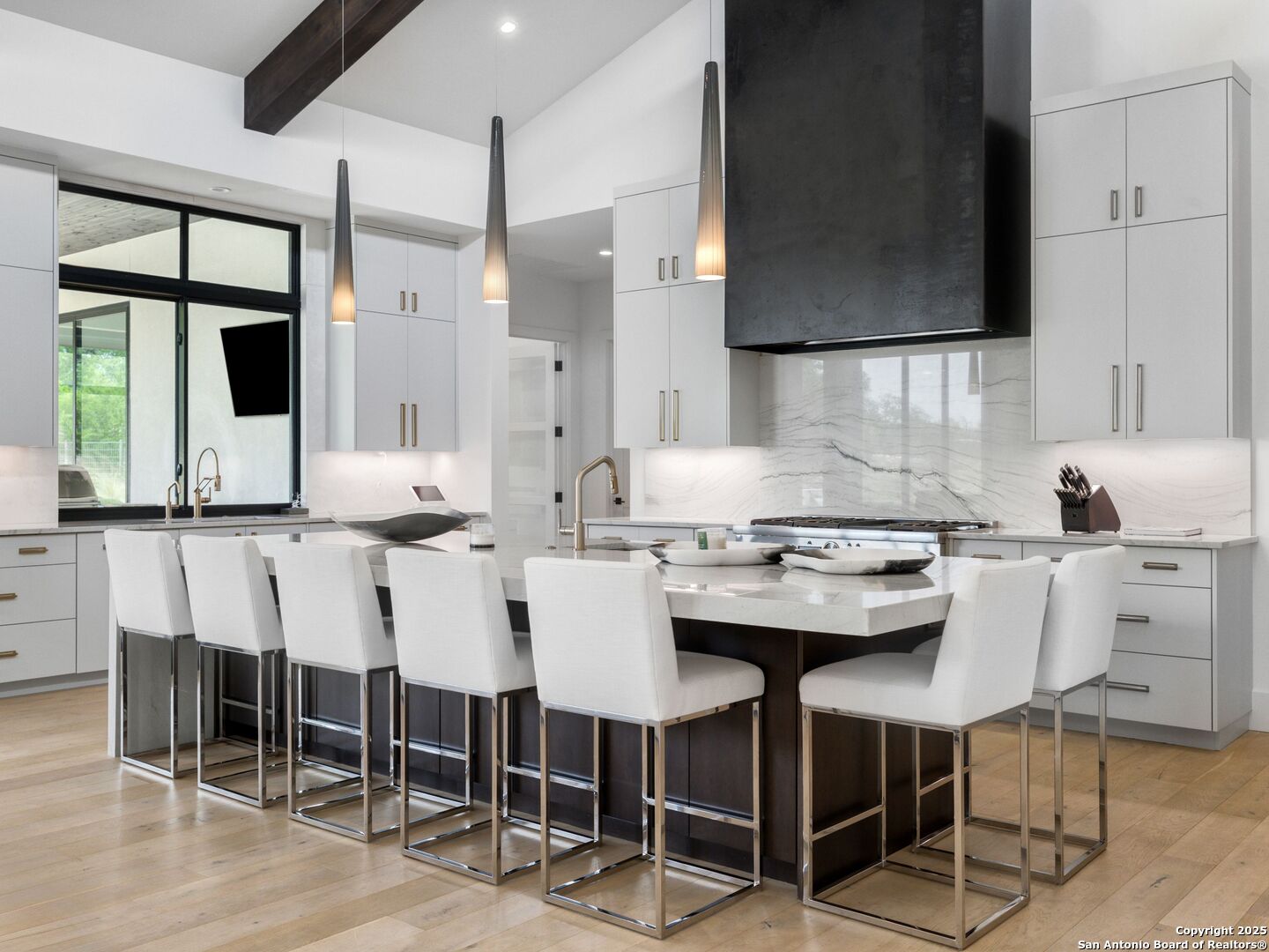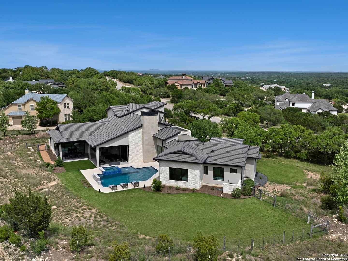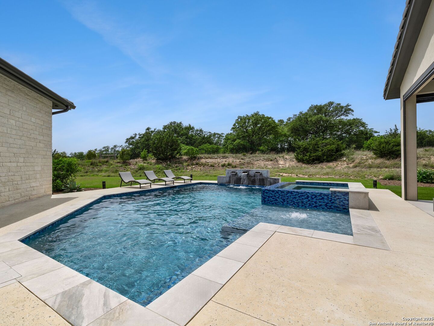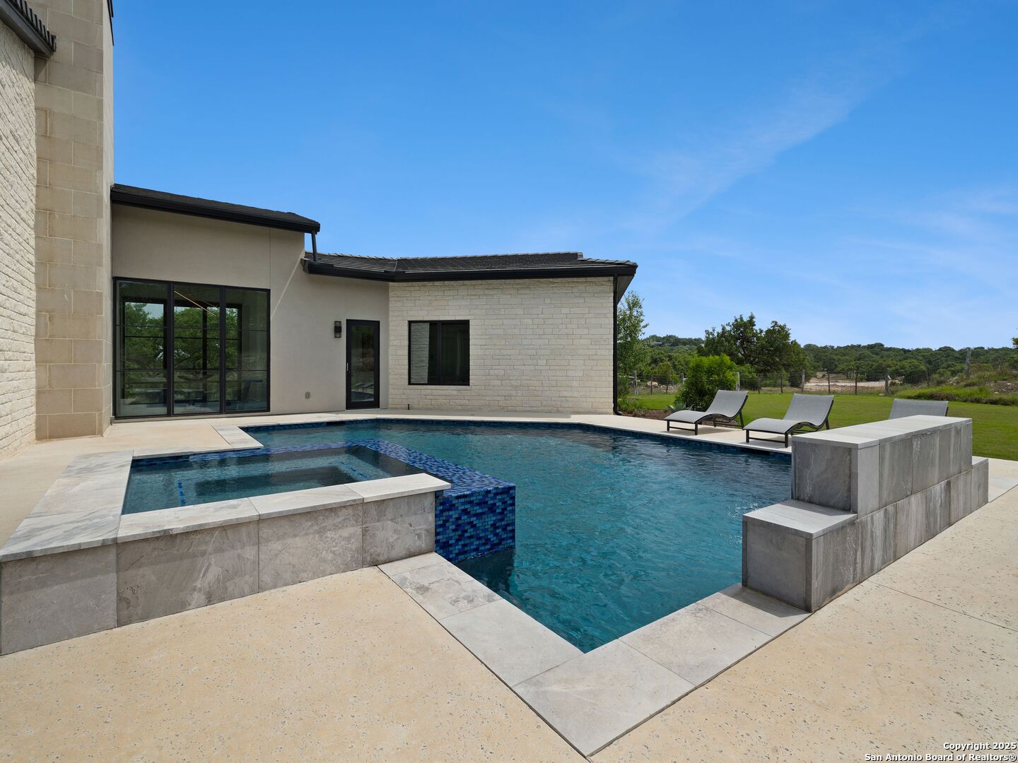 Set within the prestigious Clubs Village at Cordillera Ranch, this custom-built Garner Home offers a refined expression of modern Hill Country living. Thoughtfully designed to balance comfort and elegance, the residence presents a harmonious blend of clean architectural lines, natural light, and well-appointed spaces throughout. Dramatic glass entry doors open to tranquil views of the outdoor oasis and pool and spa. Inside, soaring ceilings and a soft, neutral palette create a sense of calm and openness, while curated finishes add subtle sophistication. The chef's kitchen serves as both a functional workspace and a design centerpiece, with quartzite countertops, a waterfall island, and a full suite of Thermador appliances. It flows seamlessly into the main living area, anchored by a striking floor-to-ceiling stone fireplace. The primary suite is a private sanctuary with a dedicated sitting area and a spa-style bath featuring dual vanities, a freestanding soaking tub, oversized walk-in shower, and separate dressing areas. Upstairs, two additional bedrooms share a private lounge and a covered balcony with long-range views. A main-level guest suite provides privacy and convenience for visitors. The game room is well-suited for entertaining, with a full bar and sliding glass doors that open directly to the outdoor living space for seamless integration. A separate fitness room provides an option for a fifth bedroom, home office, or creative studio. Outdoors, the setting is equally compelling, with a summer kitchen, multiple lounge areas, and a resort-inspired pool and spa. This property includes a Master Full Golf Right to The Clubs of Cordillera Ranch and enjoys access to top-rated Boerne ISD schools. Offering privacy, amenities, and an elevated lifestyle, this home captures the essence of luxury in one of the Hill Country's most sought-after communities.