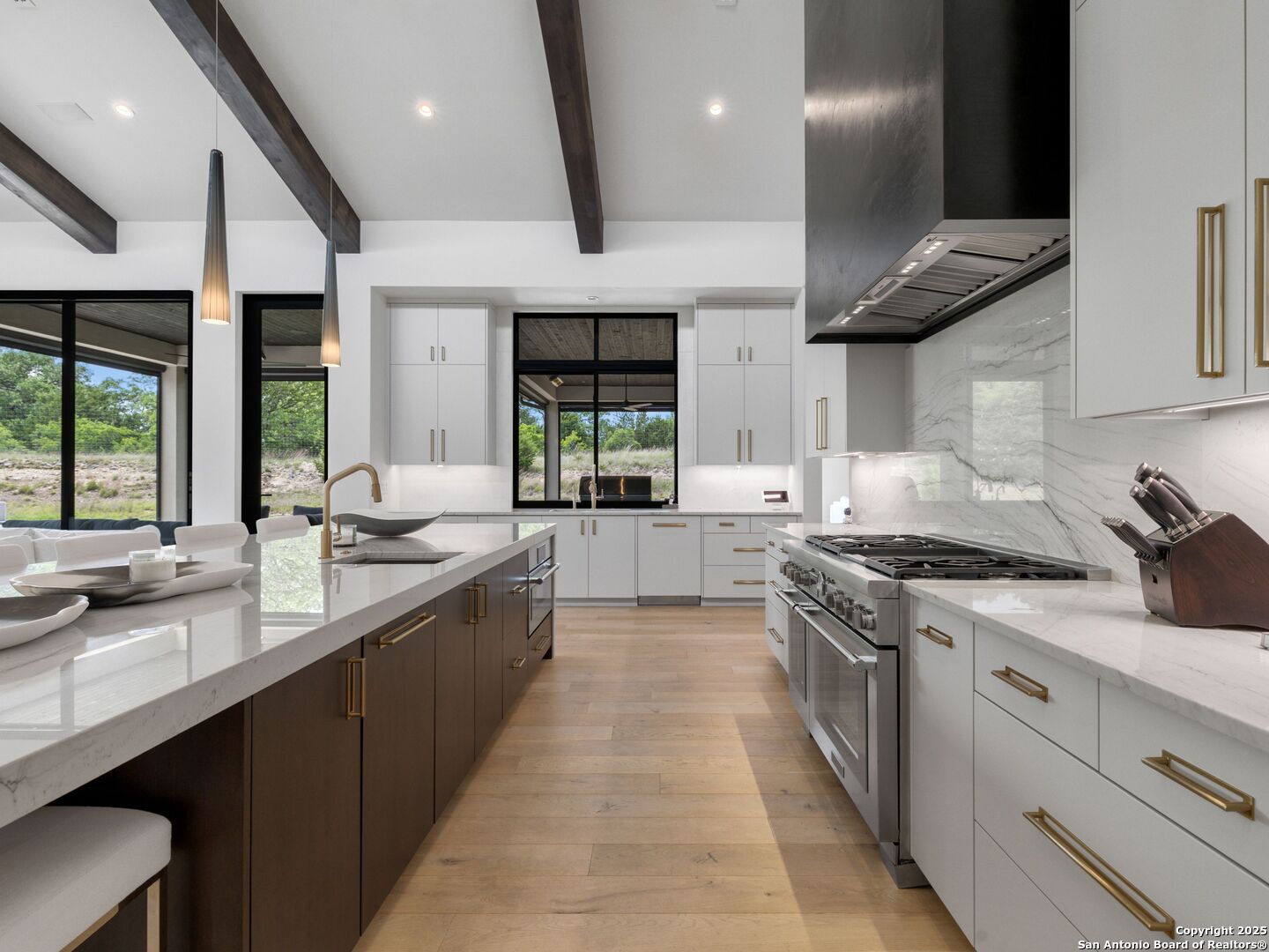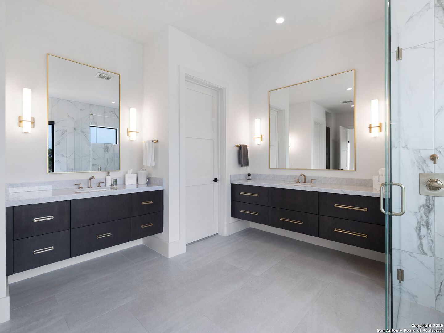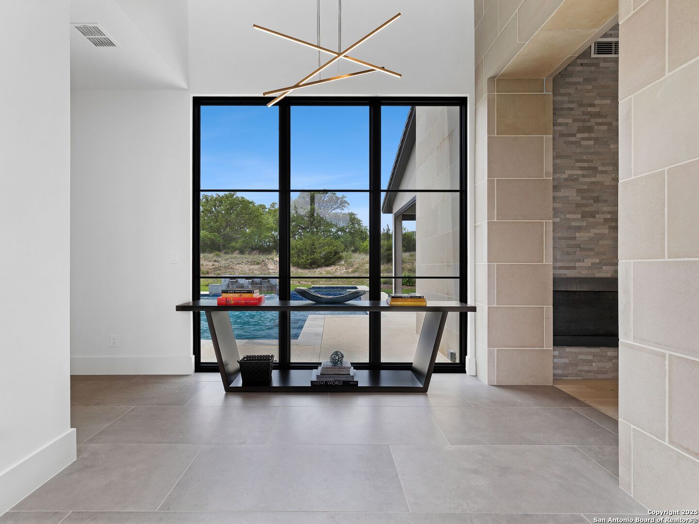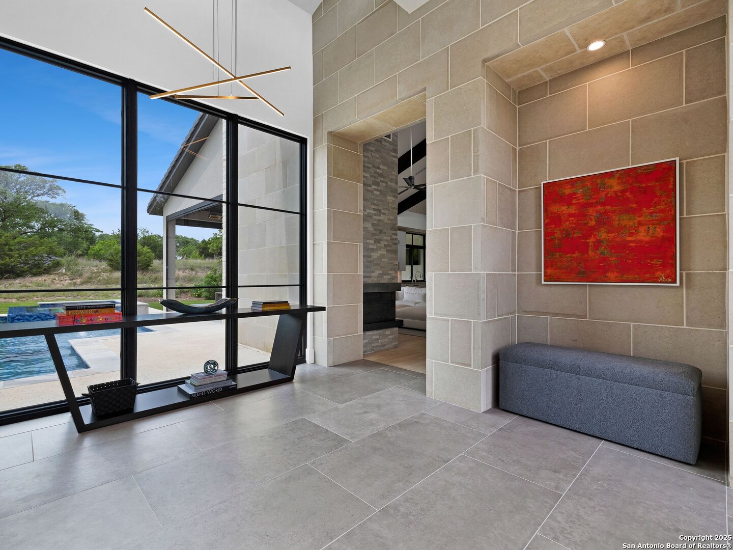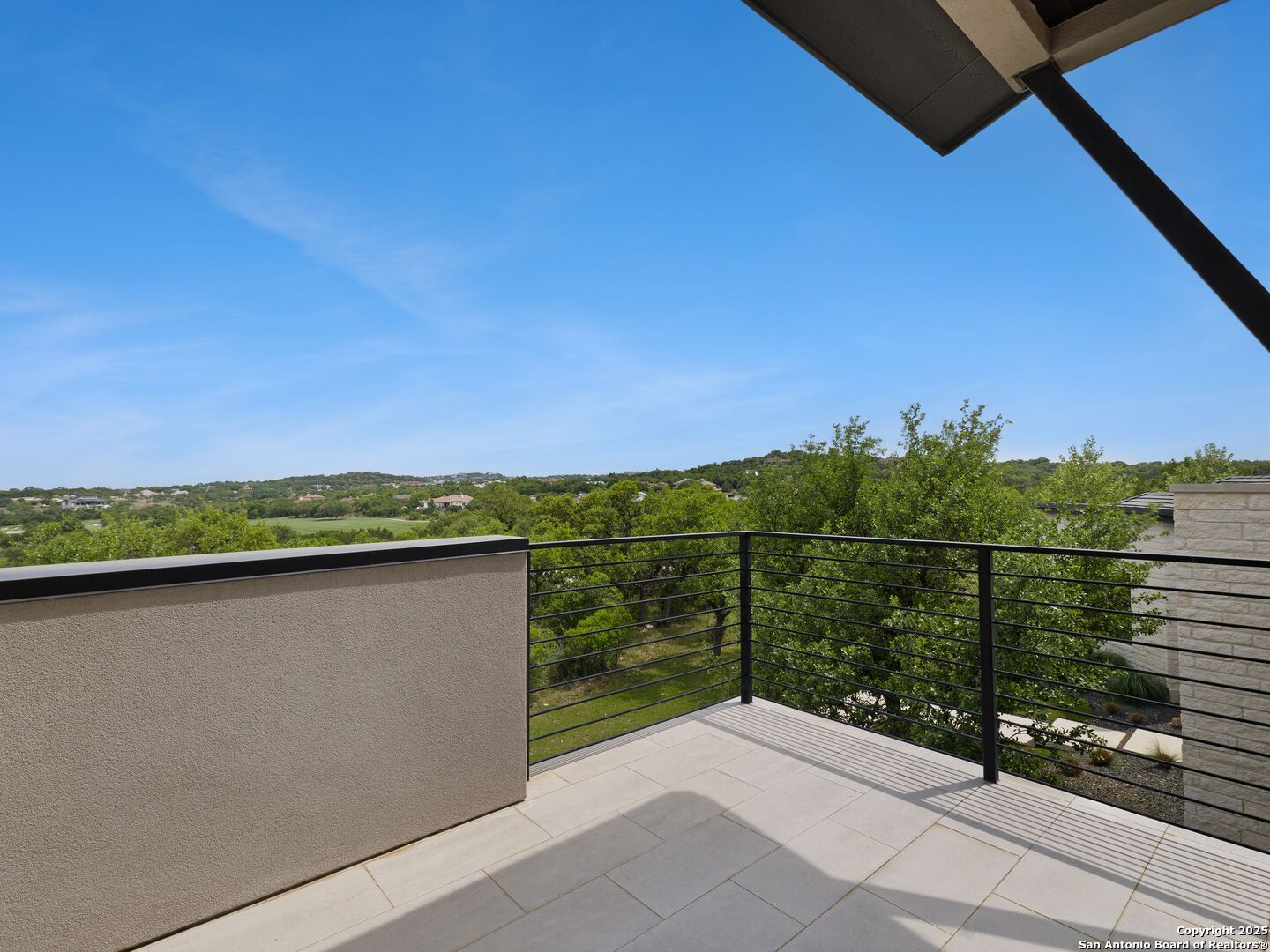 Set within the prestigious Clubs Village at Cordillera Ranch, this custom-built Garner Home offers a refined expression of modern Hill Country living. Thoughtfully designed to balance comfort and elegance, the residence presents a harmonious blend of clean architectural lines, natural light, and well-appointed spaces throughout. Dramatic glass entry doors open to tranquil views of the outdoor oasis and pool and spa. Inside, soaring ceilings and a soft, neutral palette create a sense of calm and openness, while curated finishes add subtle sophistication. The chef's kitchen serves as both a functional workspace and a design centerpiece, with quartzite countertops, a waterfall island, and a full suite of Thermador appliances. It flows seamlessly into the main living area, anchored by a striking floor-to-ceiling stone fireplace. The primary suite is a private sanctuary with a dedicated sitting area and a spa-style bath featuring dual vanities, a freestanding soaking tub, oversized walk-in shower, and separate dressing areas. Upstairs, two additional bedrooms share a private lounge and a covered balcony with long-range views. A main-level guest suite provides privacy and convenience for visitors. The game room is well-suited for entertaining, with a full bar and sliding glass doors that open directly to the outdoor living space for seamless integration. A separate fitness room provides an option for a fifth bedroom, home office, or creative studio. Outdoors, the setting is equally compelling, with a summer kitchen, multiple lounge areas, and a resort-inspired pool and spa. This property includes a Master Full Golf Right to The Clubs of Cordillera Ranch and enjoys access to top-rated Boerne ISD schools. Offering privacy, amenities, and an elevated lifestyle, this home captures the essence of luxury in one of the Hill Country's most sought-after communities.