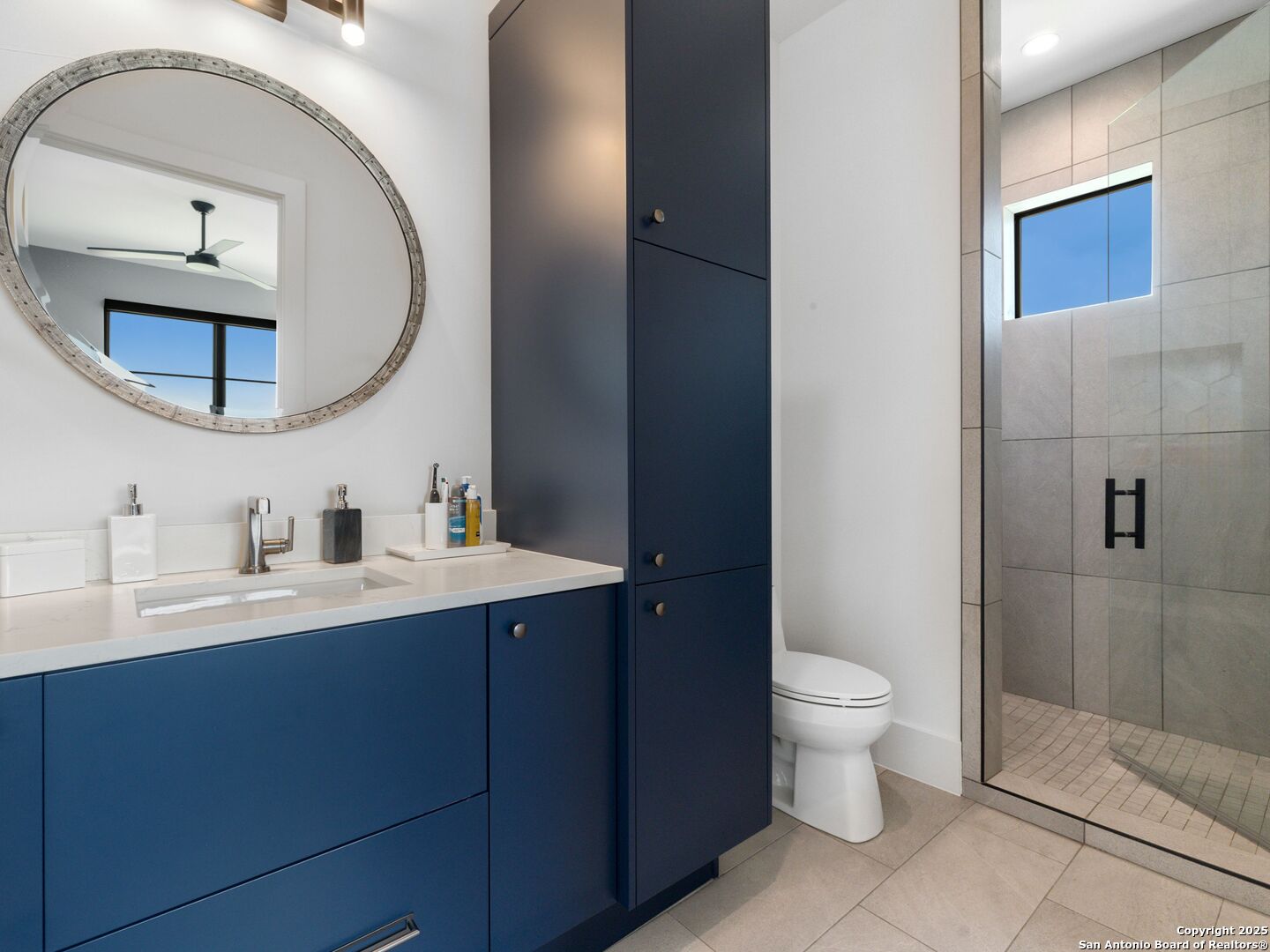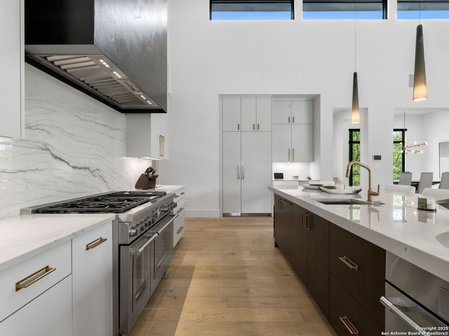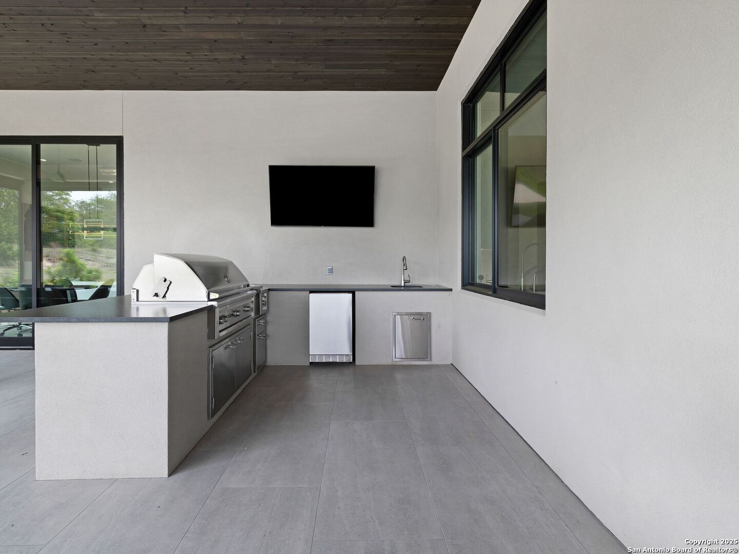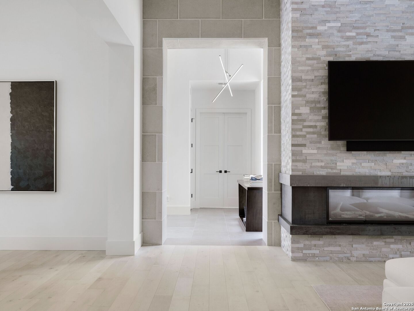 Set within the prestigious Clubs Village at Cordillera Ranch, this custom-built Garner Home offers a refined expression of modern Hill Country living. Thoughtfully designed to balance comfort and elegance, the residence presents a harmonious blend of clean architectural lines, natural light, and well-appointed spaces throughout. Dramatic glass entry doors open to tranquil views of the outdoor oasis and pool and spa. Inside, soaring ceilings and a soft, neutral palette create a sense of calm and openness, while curated finishes add subtle sophistication. The chef's kitchen serves as both a functional workspace and a design centerpiece, with quartzite countertops, a waterfall island, and a full suite of Thermador appliances. It flows seamlessly into the main living area, anchored by a striking floor-to-ceiling stone fireplace. The primary suite is a private sanctuary with a dedicated sitting area and a spa-style bath featuring dual vanities, a freestanding soaking tub, oversized walk-in shower, and separate dressing areas. Upstairs, two additional bedrooms share a private lounge and a covered balcony with long-range views. A main-level guest suite provides privacy and convenience for visitors. The game room is well-suited for entertaining, with a full bar and sliding glass doors that open directly to the outdoor living space for seamless integration. A separate fitness room provides an option for a fifth bedroom, home office, or creative studio. Outdoors, the setting is equally compelling, with a summer kitchen, multiple lounge areas, and a resort-inspired pool and spa. This property includes a Master Full Golf Right to The Clubs of Cordillera Ranch and enjoys access to top-rated Boerne ISD schools. Offering privacy, amenities, and an elevated lifestyle, this home captures the essence of luxury in one of the Hill Country's most sought-after communities.