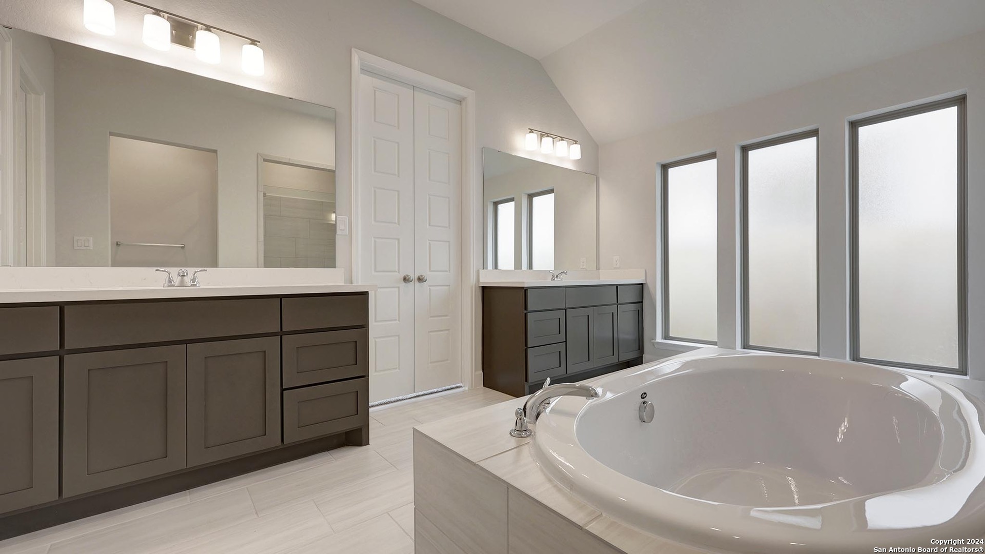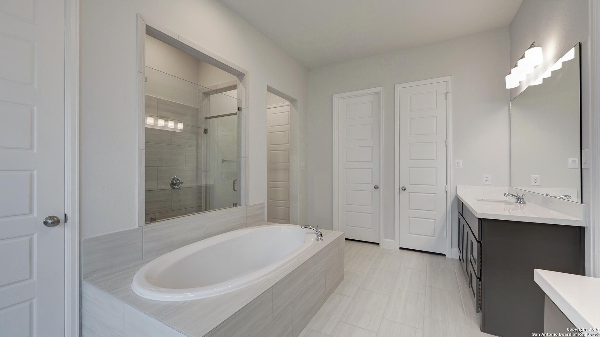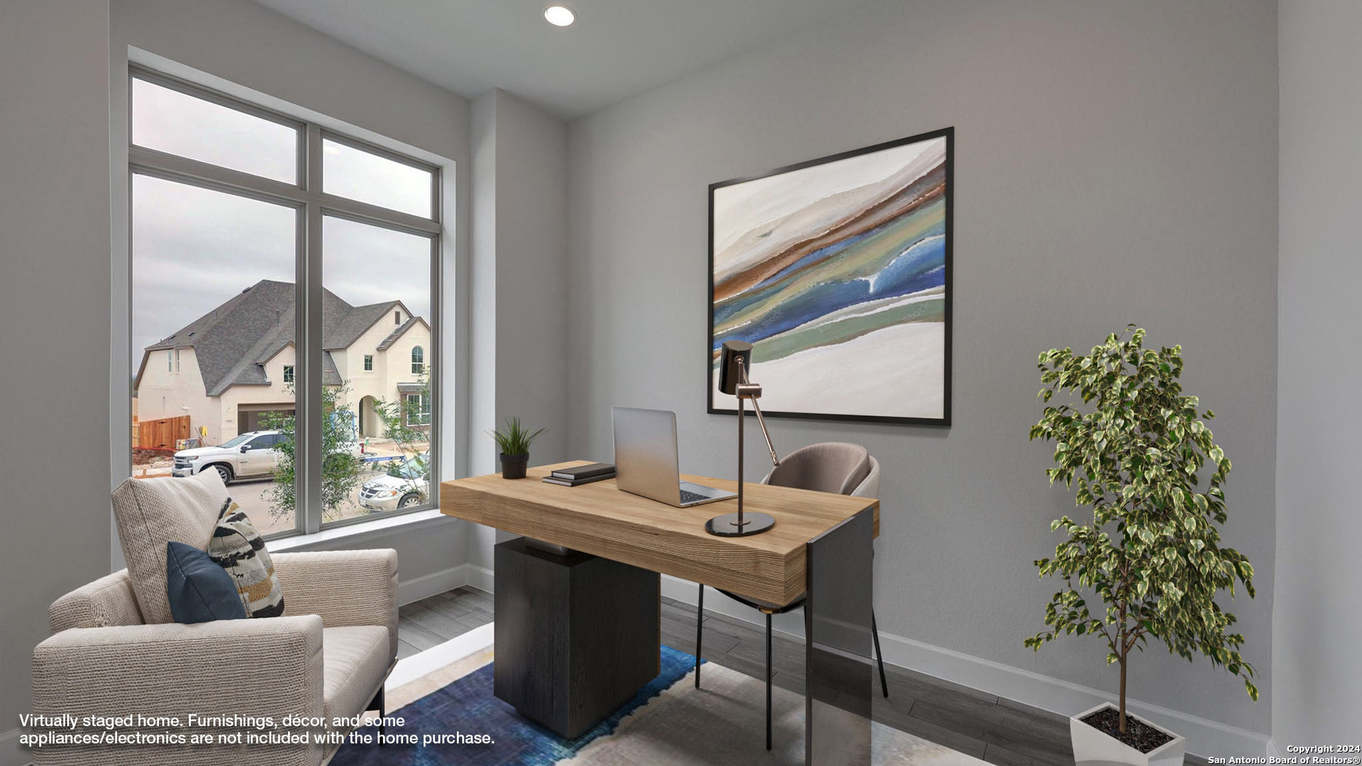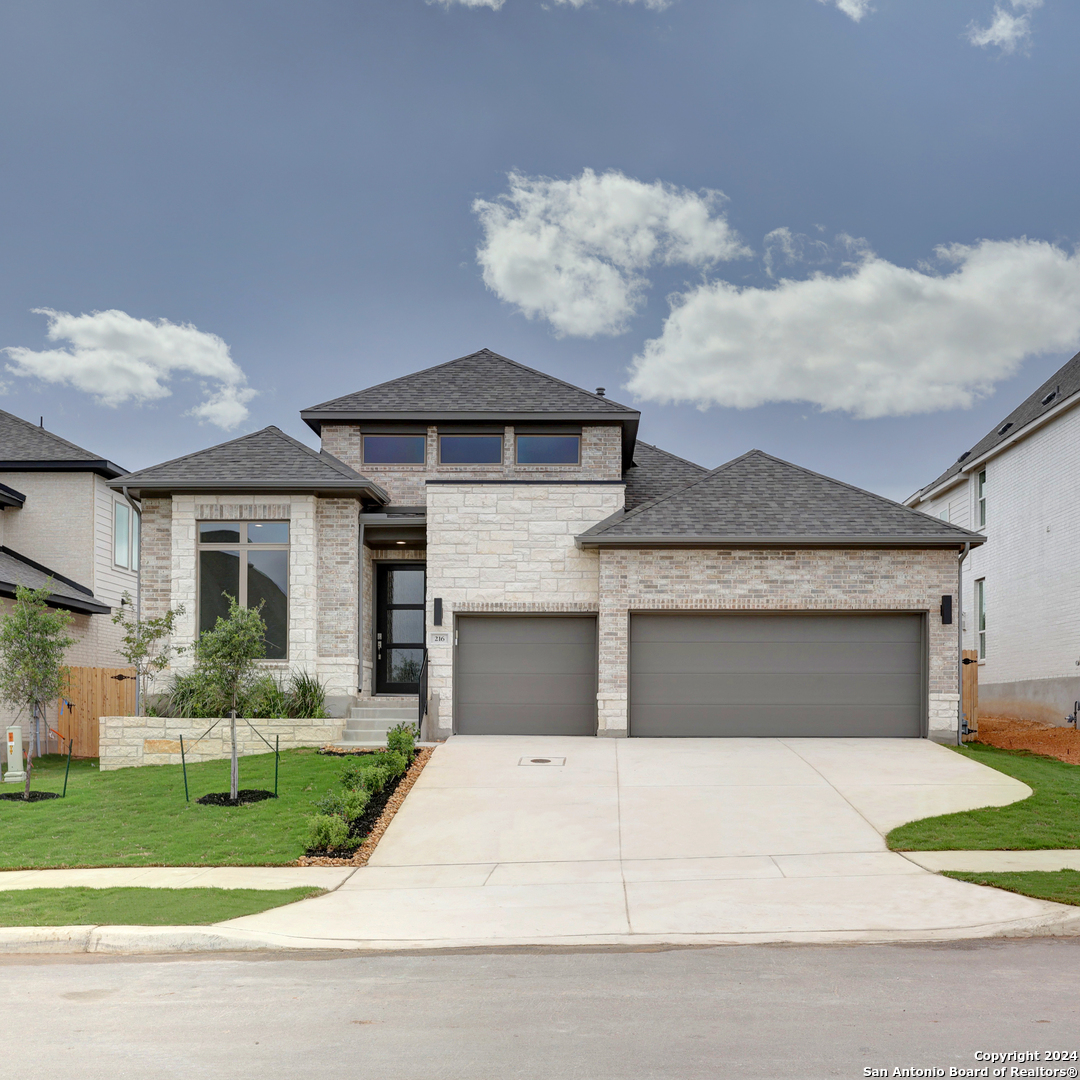 Home office with French doors set at entry with 12-foot ceiling. Extended entry highlights coffered ceiling. Open kitchen features generous counter space, a 5-burner gas cooktop, corner walk-in pantry and island with built-in seating space. Dining area flows into open family room with a cast stone fireplace and a wall of windows. Primary suite includes bedroom with wall of windows. Dual vanities, garden tub, separate glass-enclosed shower and two large walk-in closets in primary bath. A guest suite with private bath adds to this four-bedroom home. Covered backyard patio. Mud room off three-car garage.