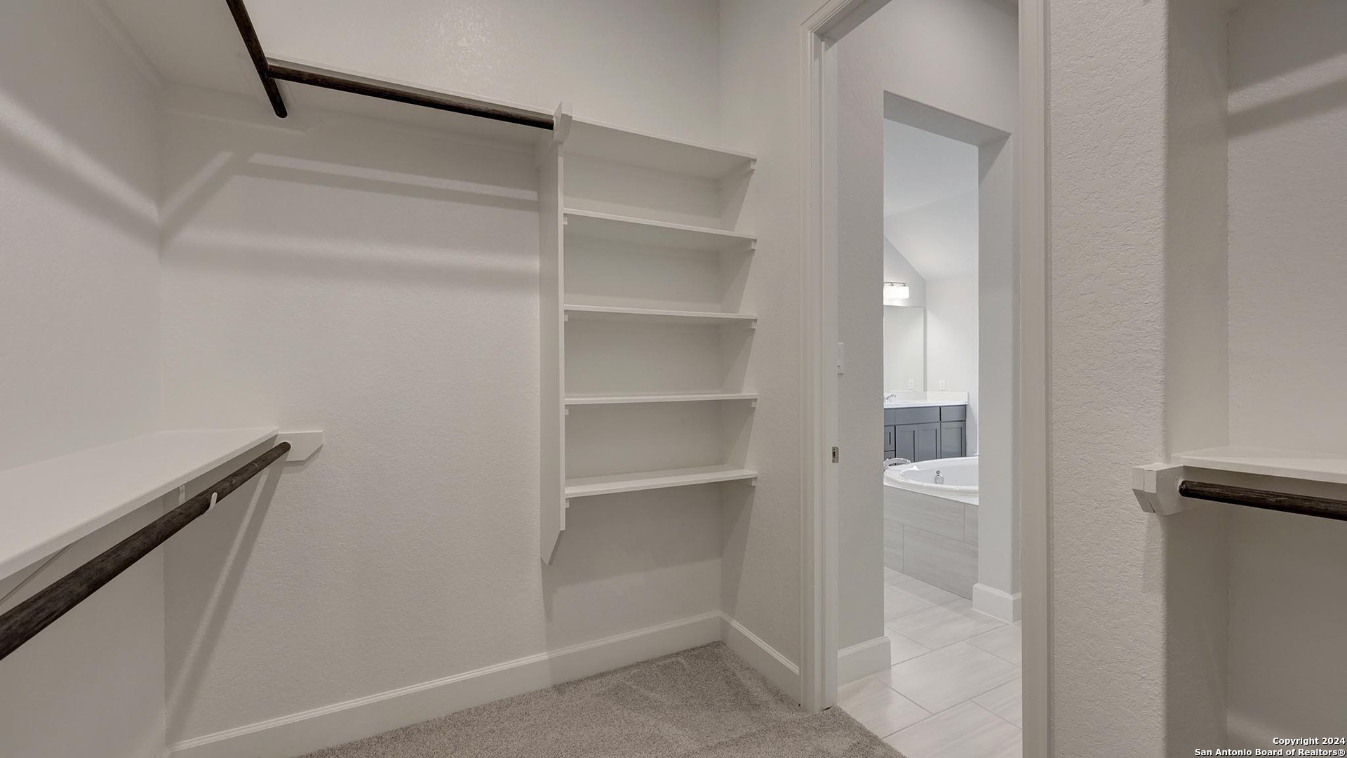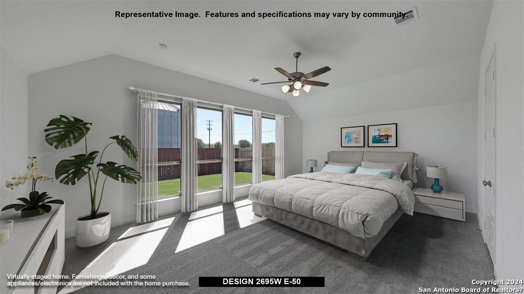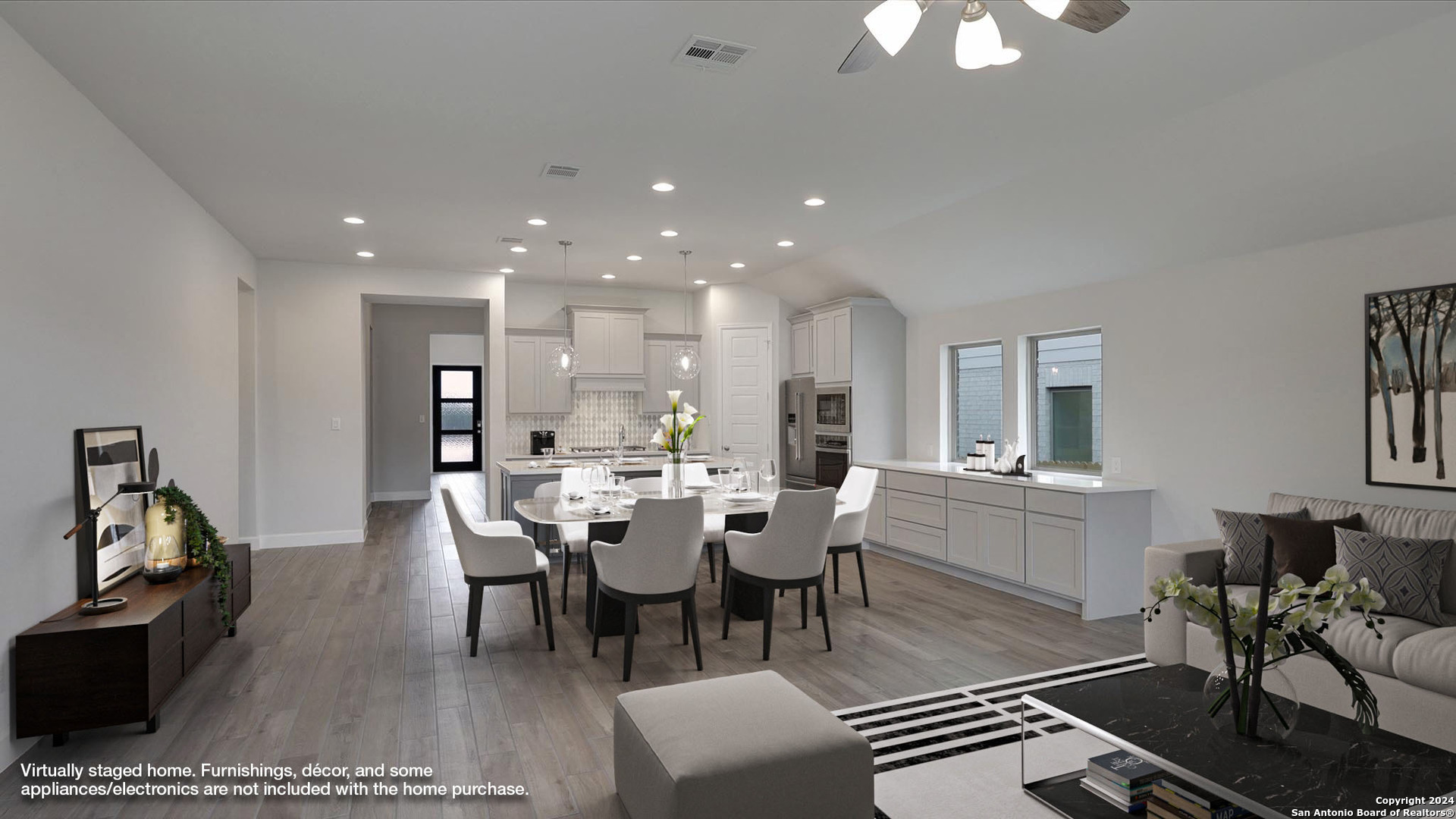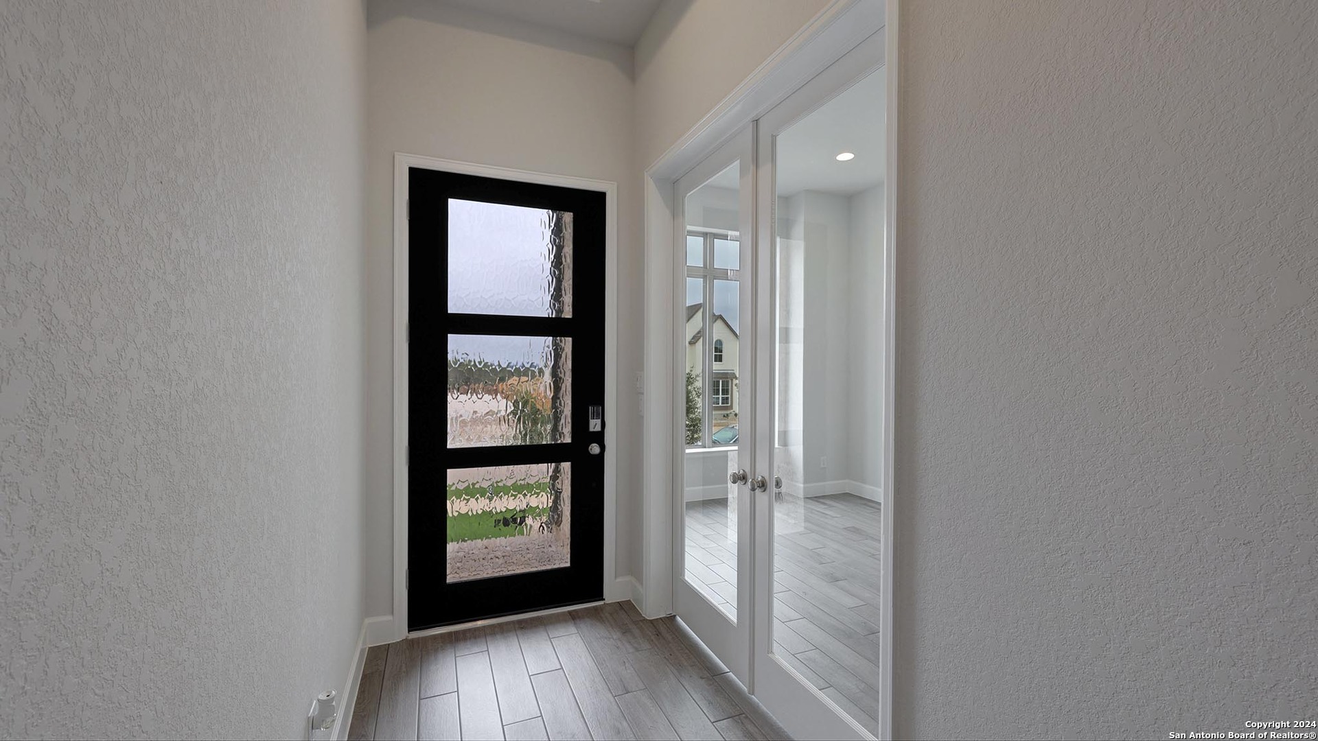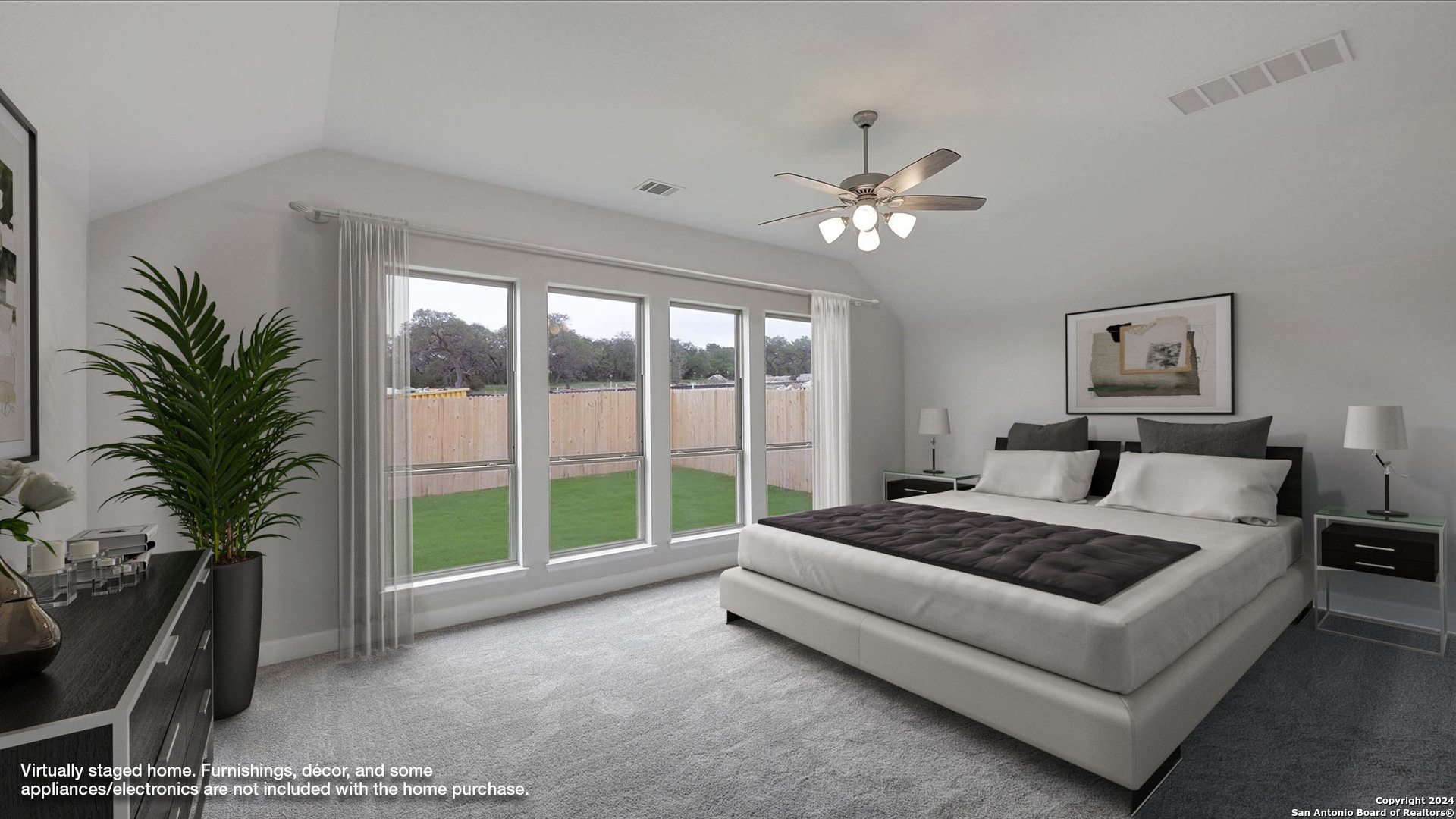Home office with French doors set at entry with 12-foot ceiling. Extended entry highlights coffered ceiling. Open kitchen features generous counter space, a 5-burner gas cooktop, corner walk-in pantry and island with built-in seating space. Dining area flows into open family room with a cast stone fireplace and a wall of windows. Primary suite includes bedroom with wall of windows. Dual vanities, garden tub, separate glass-enclosed shower and two large walk-in closets in primary bath. A guest suite with private bath adds to this four-bedroom home. Covered backyard patio. Mud room off three-car garage.