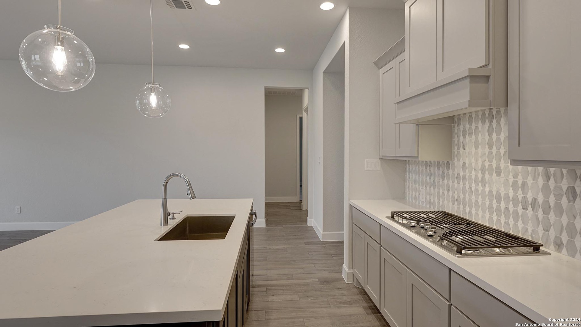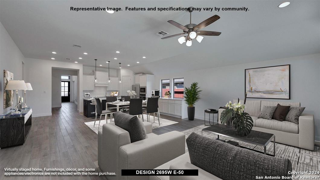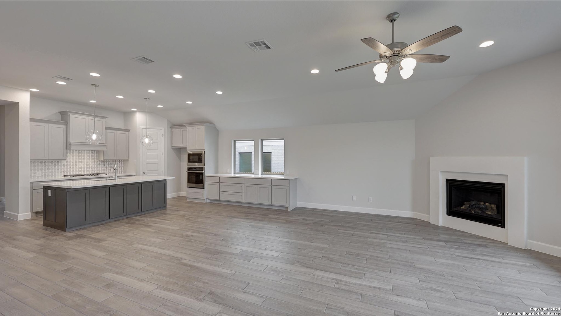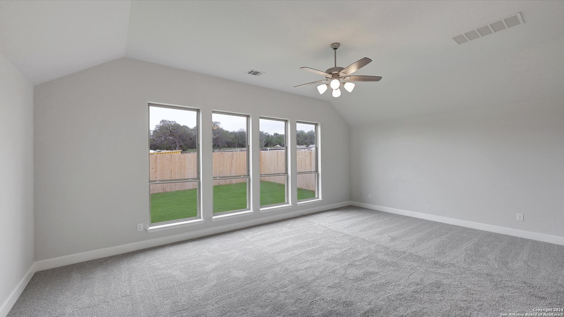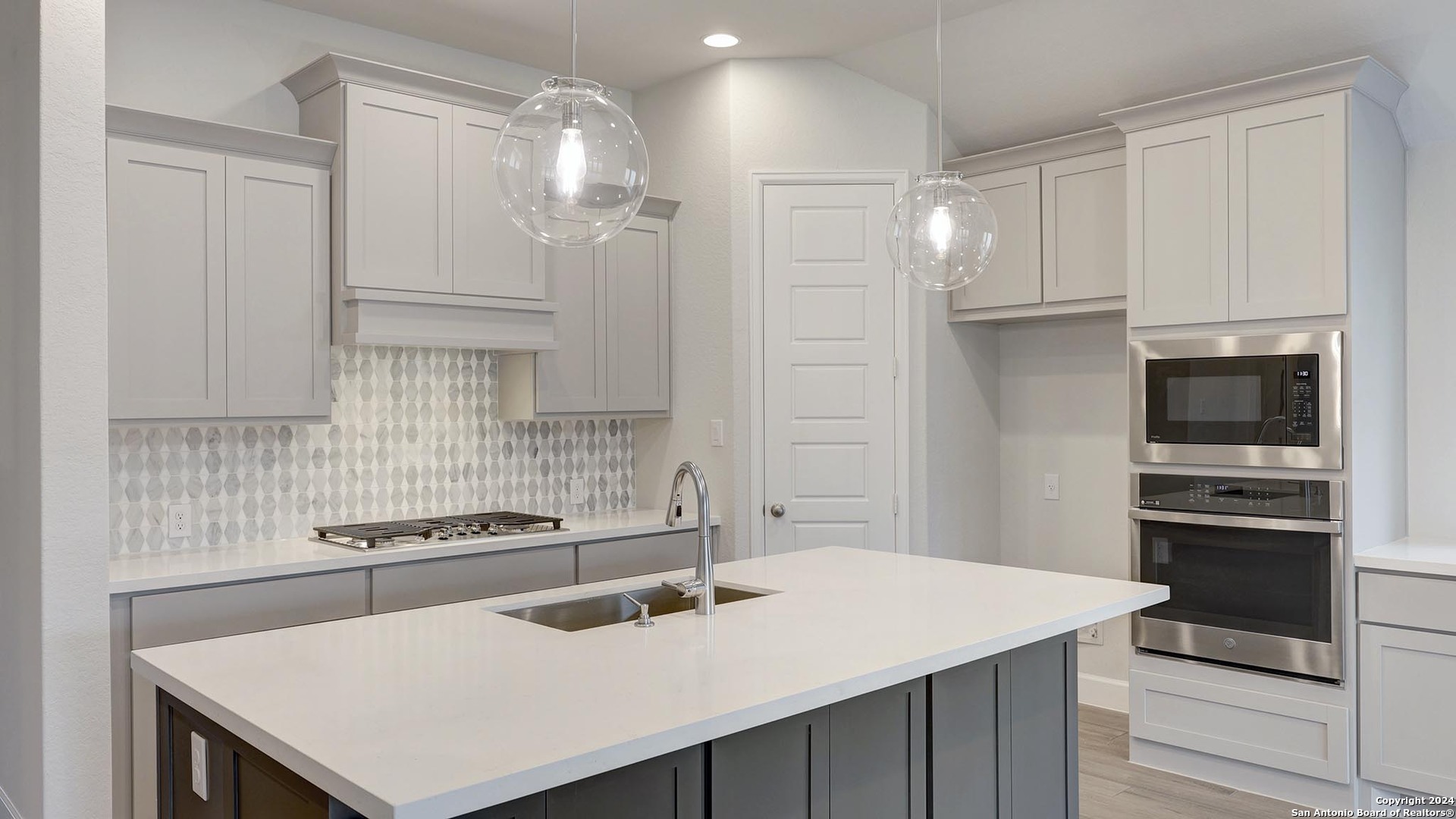 Home office with French doors set at entry with 12-foot ceiling. Extended entry highlights coffered ceiling. Open kitchen features generous counter space, a 5-burner gas cooktop, corner walk-in pantry and island with built-in seating space. Dining area flows into open family room with a cast stone fireplace and a wall of windows. Primary suite includes bedroom with wall of windows. Dual vanities, garden tub, separate glass-enclosed shower and two large walk-in closets in primary bath. A guest suite with private bath adds to this four-bedroom home. Covered backyard patio. Mud room off three-car garage.