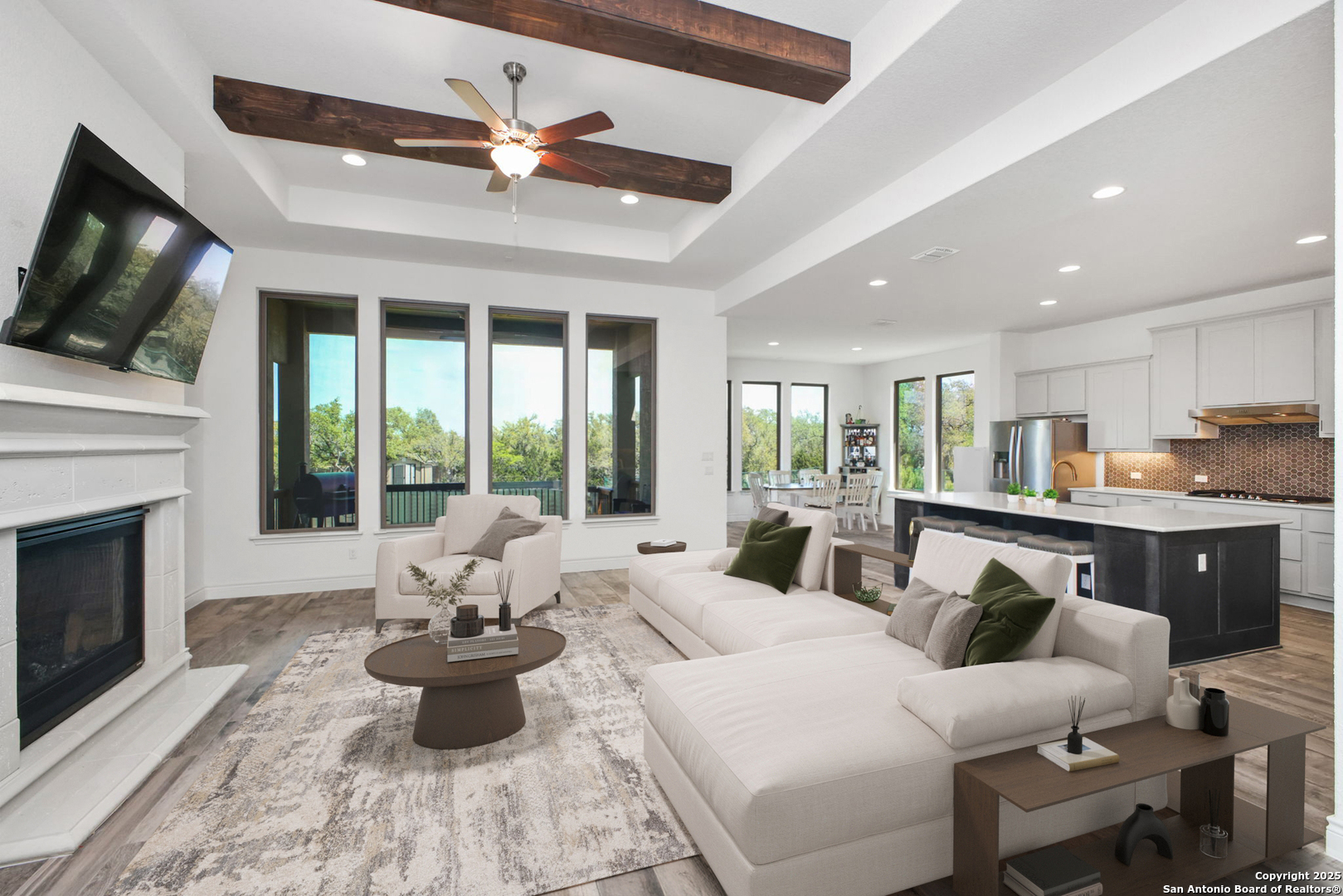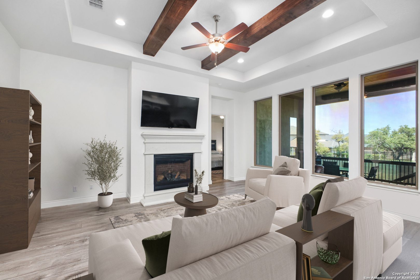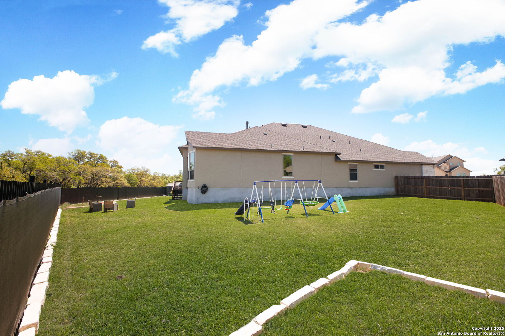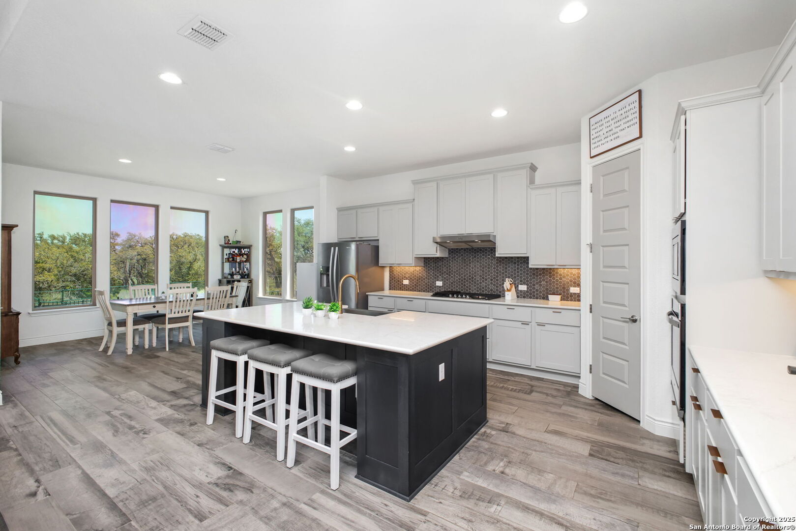 THIS WEEKEND ONLY! Property offered at $599,999.00 ! Oct 31st - Nov. 2nd. Perched on a quiet cul-de-sac in the Estates section of Ventana, this single-story estate home offers the perfect balance of space & privacy. Set on a sprawling 0.30-acre lot with no direct rear neighbors, the home showcases sweeping hill country views and unforgettable sunrises and sunsets that glow through nine oversized windows lining the back of the home. Inside, you'll find a flexible, open layout with tall ceilings throughout, four bedrooms, and three full bathrooms. One bedroom is currently used as a home office with glass French doors, and a large flex room with full-size barn doors is ready to become your media room, game room, or formal dining space. Level 17 tile flooring spans the entire home-durable, low-maintenance, and elegant. The owner's suite is a true retreat, complete with vaulted ceiling, bay window, spa-like en suite with walk-in shower, soaking tub, dual vanities, and a massive closet that stretches halfway across the home. Every secondary bedroom has direct access to its own full bath and walk-in closet. In the kitchen, an extended island, light gold hardware, stainless appliances, and a casual dining area come together in a space built for both daily living and entertaining. Outside, enjoy peaceful mornings or weekend gatherings on the epoxied patio, with gas hookup and iron fencing with privacy screen. The oversized lot is ready for your future pool, garden, or outdoor kitchen-with easy access through a lockable double gate, perfect for a golf cart or trailer. Located in sought-after Comal ISD and surrounded by families in a peaceful, friendly community, this home is just minutes from H-E-B Plus, Hwy 281, and the shops and restaurants of Hwy 46-offering a hill country lifestyle that's still close to everything.