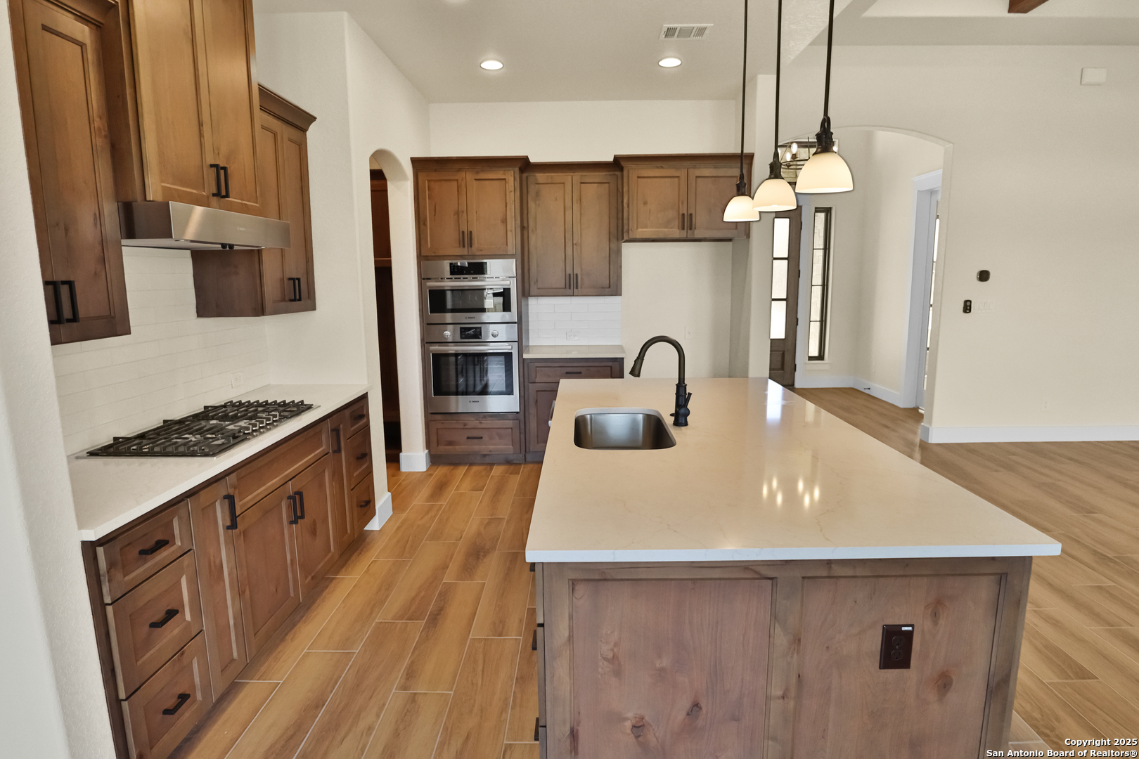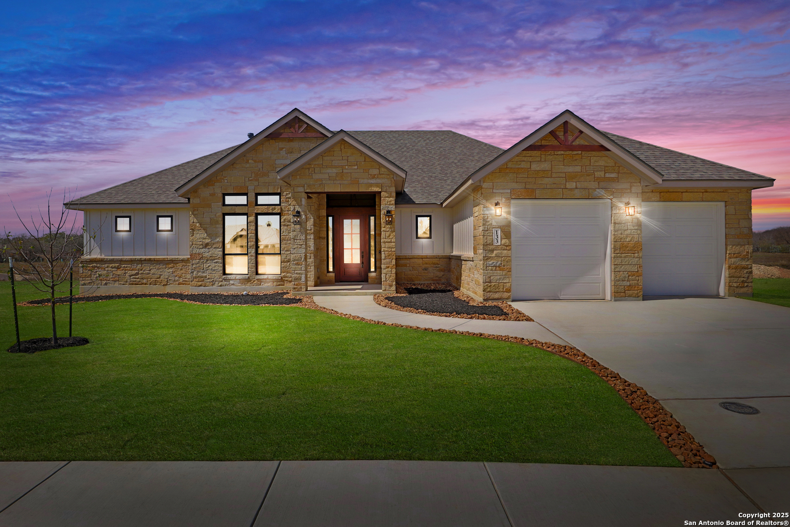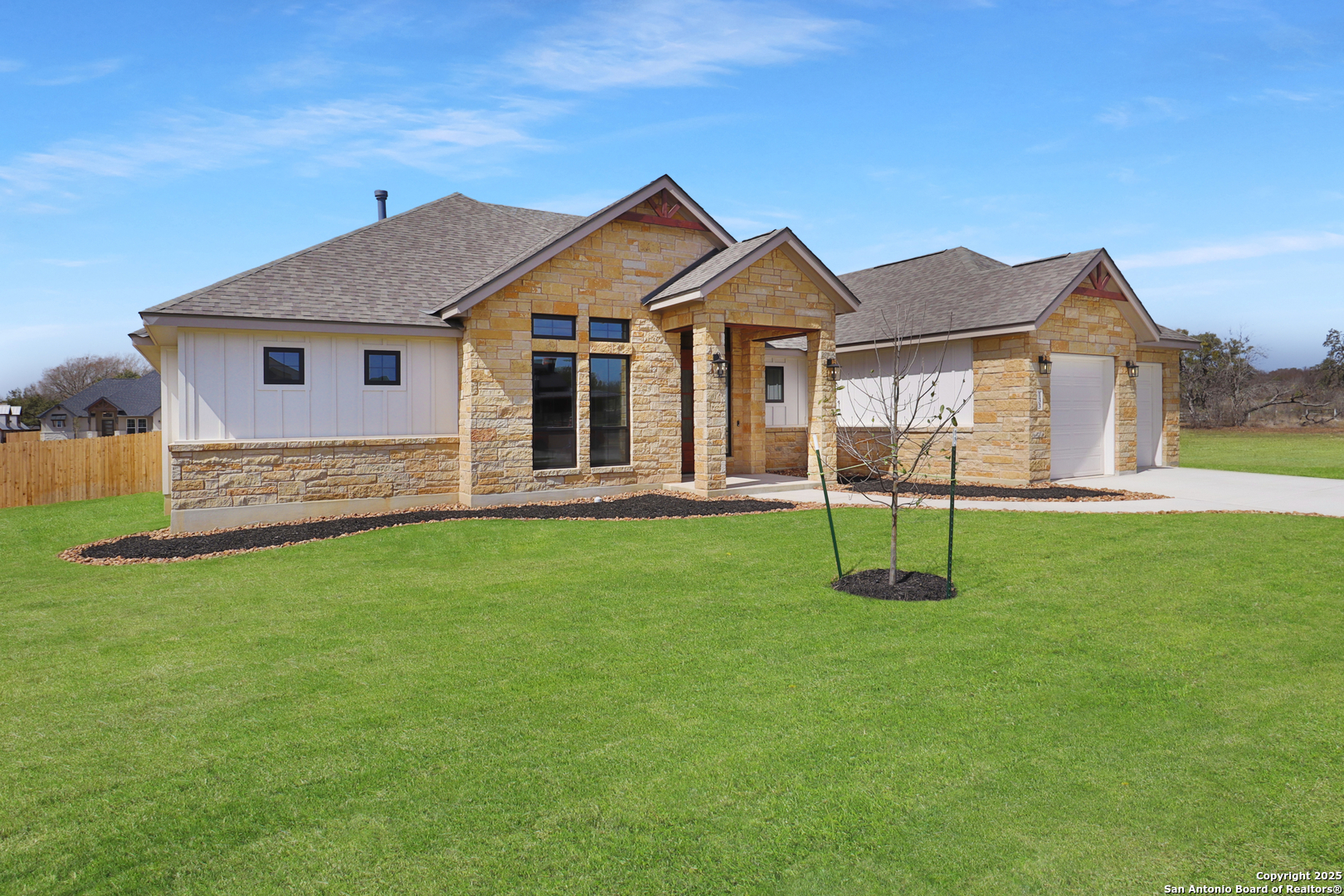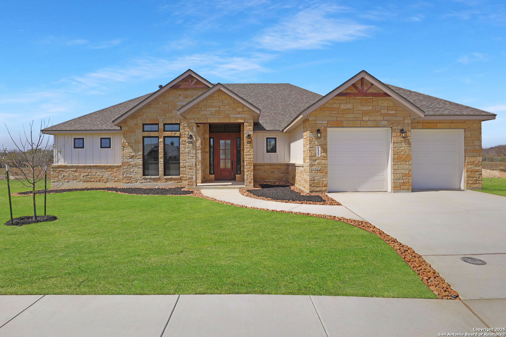 This luxurious custom quality home is located on a quiet cul-de-sac in Castroville's Country Village Estates just minutes from west San Antonio. The home is 2,535 sq. ft. and features 3 bedrooms, 2.5 baths, a dedicated office, and an oversized 2 car garage. A large kitchen island, stainless Bosch appliances, quartz counters, custom cabinets with soft close hinges, pull-out spice racks and a Butler's pantry with custom features are sure to impress. The full-height stone fireplace, flanked by built in shelving and cabinets, is a focal point in the living room. Primary Bedroom has a luxurious bath with a free-standing tub, oversized tile shower, and dual vanities. Energy efficiency is a primary focus with a 49 HERS rating including composite frame Energy Star Low-E windows, spray foam insulation in exterior walls (R-18), roof rafters (R-20), and attic walls (R-15), comfort thermostat for energy savings, continuous hot water with tankless gas water heater, EPA WaterSense toilets, and Energy Star fixtures and appliances throughout. This Builder's attention to detail makes this a must-see property!
