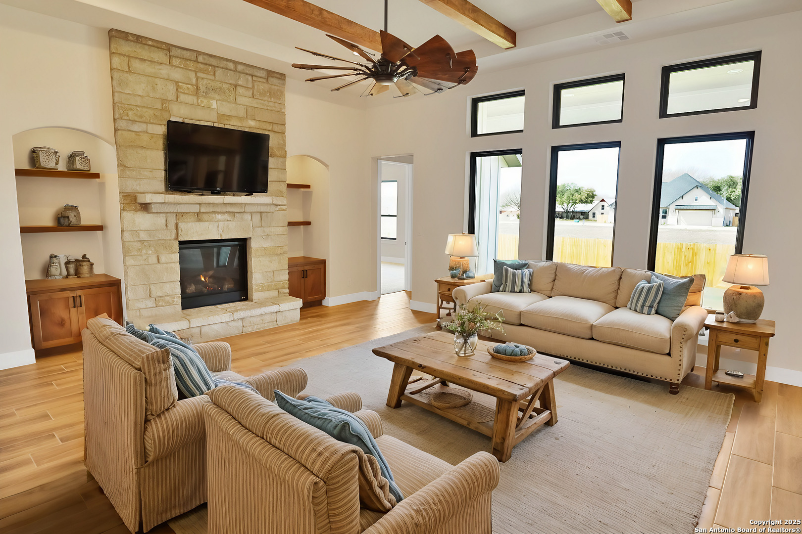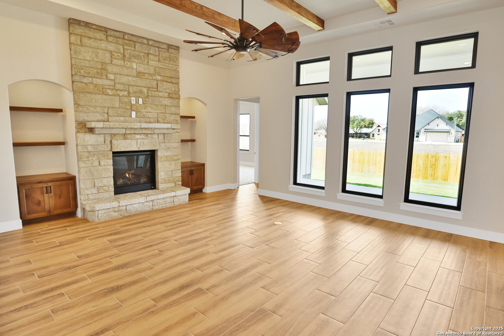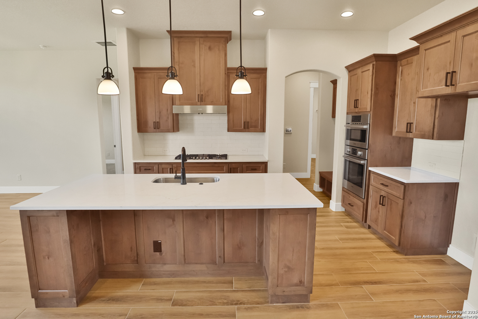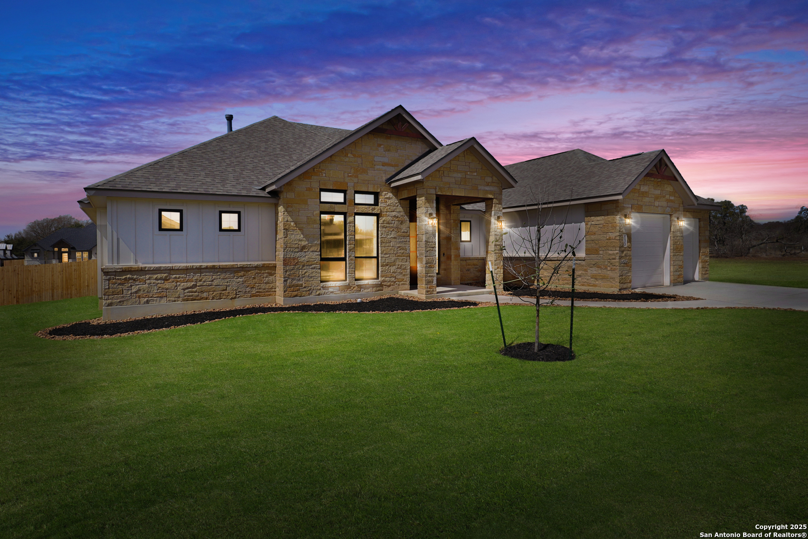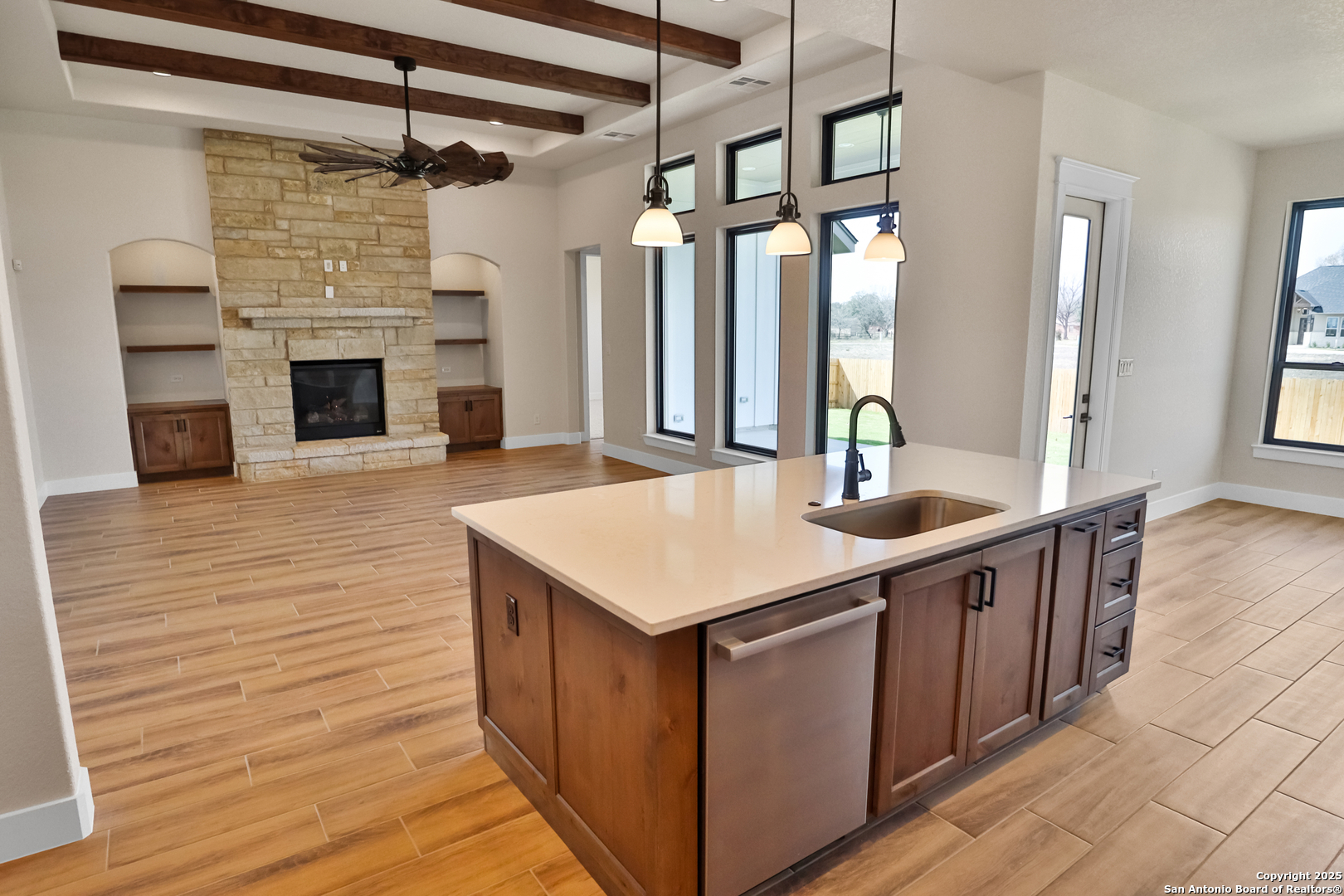 This luxurious custom quality home is located on a quiet cul-de-sac in Castroville's Country Village Estates just minutes from west San Antonio. The home is 2,535 sq. ft. and features 3 bedrooms, 2.5 baths, a dedicated office, and an oversized 2 car garage. A large kitchen island, stainless Bosch appliances, quartz counters, custom cabinets with soft close hinges, pull-out spice racks and a Butler's pantry with custom features are sure to impress. The full-height stone fireplace, flanked by built in shelving and cabinets, is a focal point in the living room. Primary Bedroom has a luxurious bath with a free-standing tub, oversized tile shower, and dual vanities. Energy efficiency is a primary focus with a 49 HERS rating including composite frame Energy Star Low-E windows, spray foam insulation in exterior walls (R-18), roof rafters (R-20), and attic walls (R-15), comfort thermostat for energy savings, continuous hot water with tankless gas water heater, EPA WaterSense toilets, and Energy Star fixtures and appliances throughout. This Builder's attention to detail makes this a must-see property!