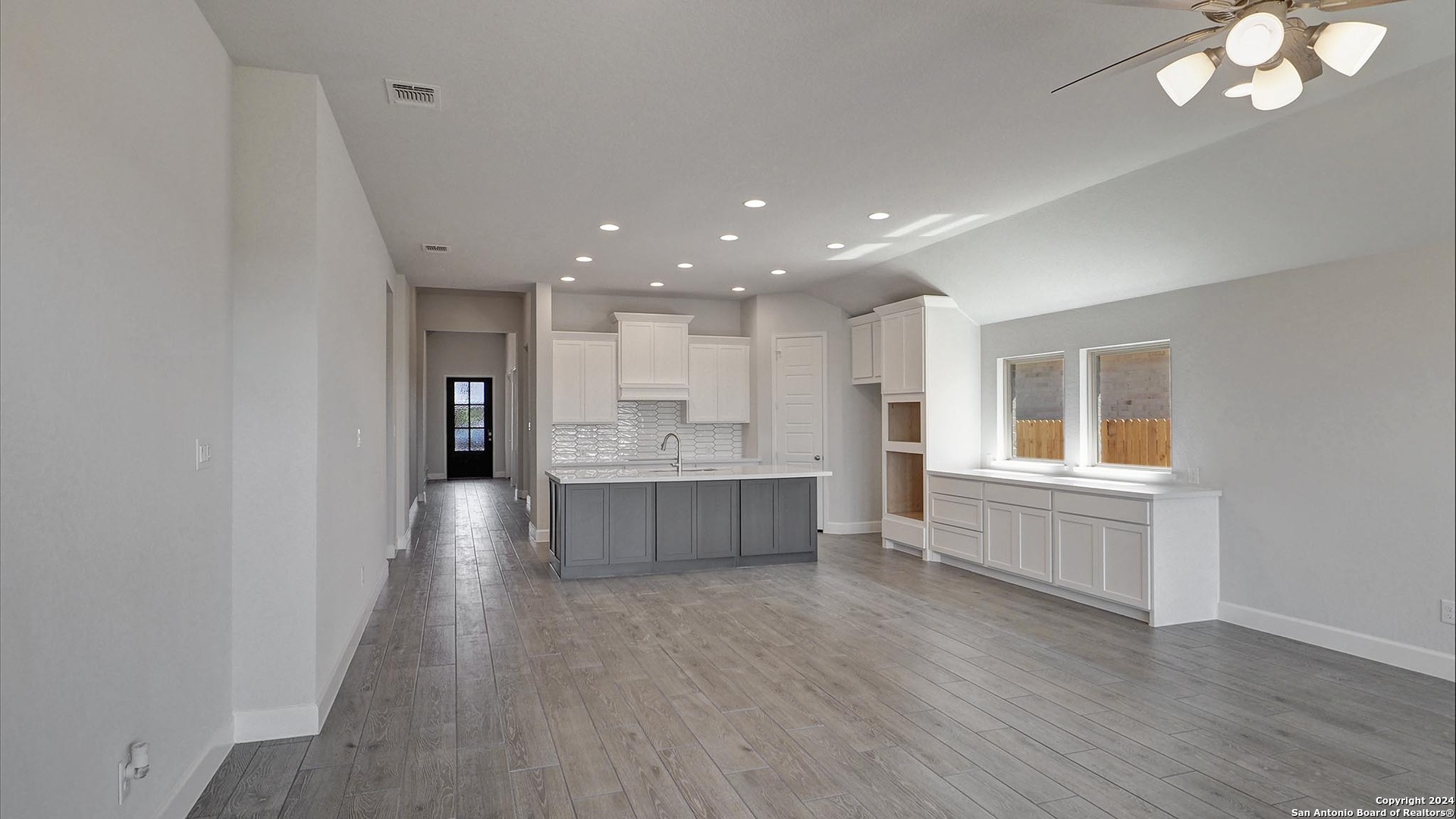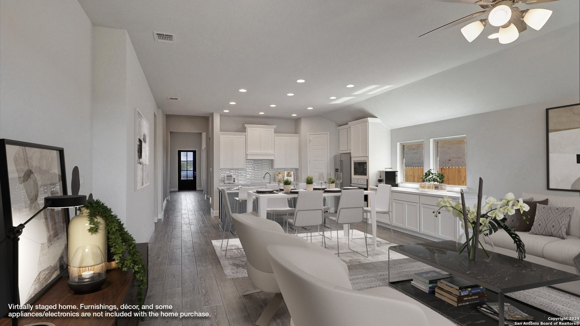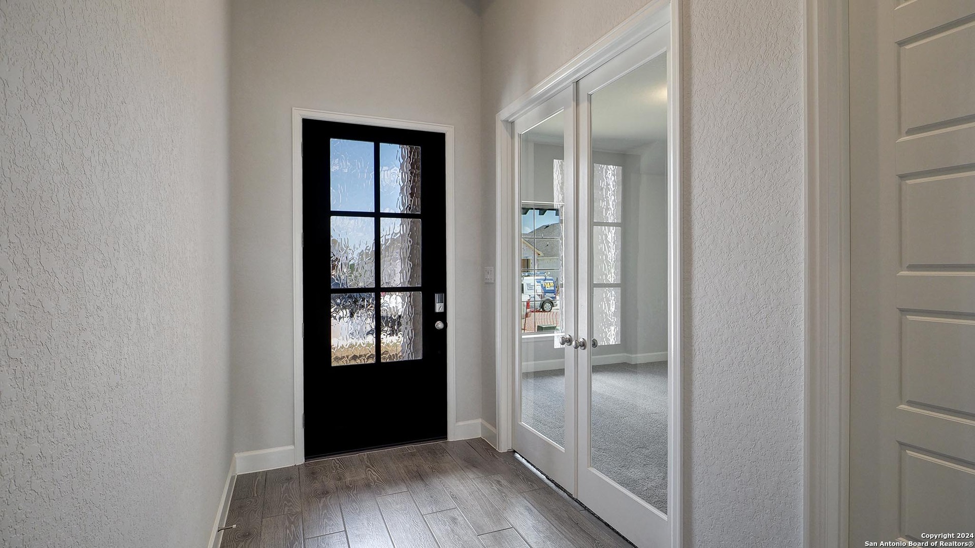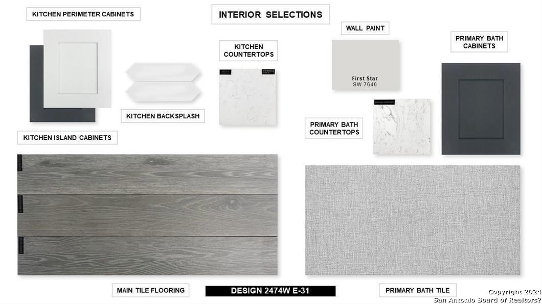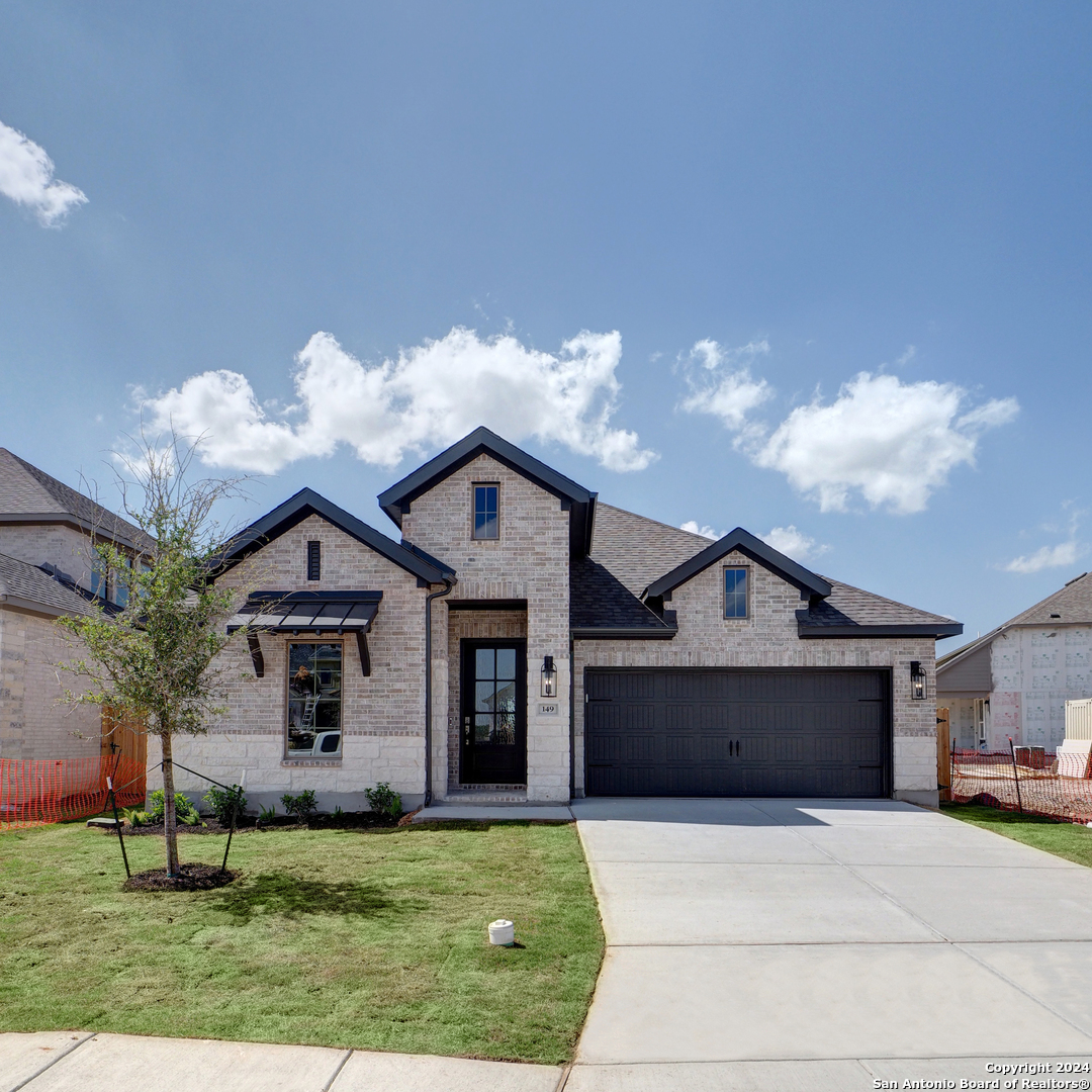 Entry with 13-foot ceilings framed by game room with French doors. Extended entry flows to the kitchen and dining area. Island kitchen with built-in seating space and a corner walk-in pantry. Family room with a wall of windows. Secluded primary suite. Primary bath offers dual vanities, garden tub, separate glass enclosed shower and two walk-in closets. Guest suite with a full bathroom and a walk-in closet. Secondary bedrooms and a utility room complete this one-story design. Covered backyard patio. Mud room just off the three-car garage.