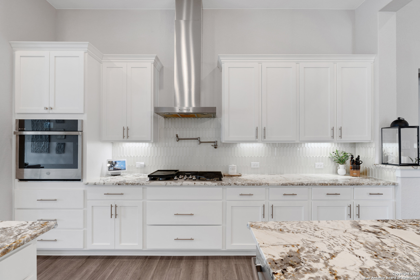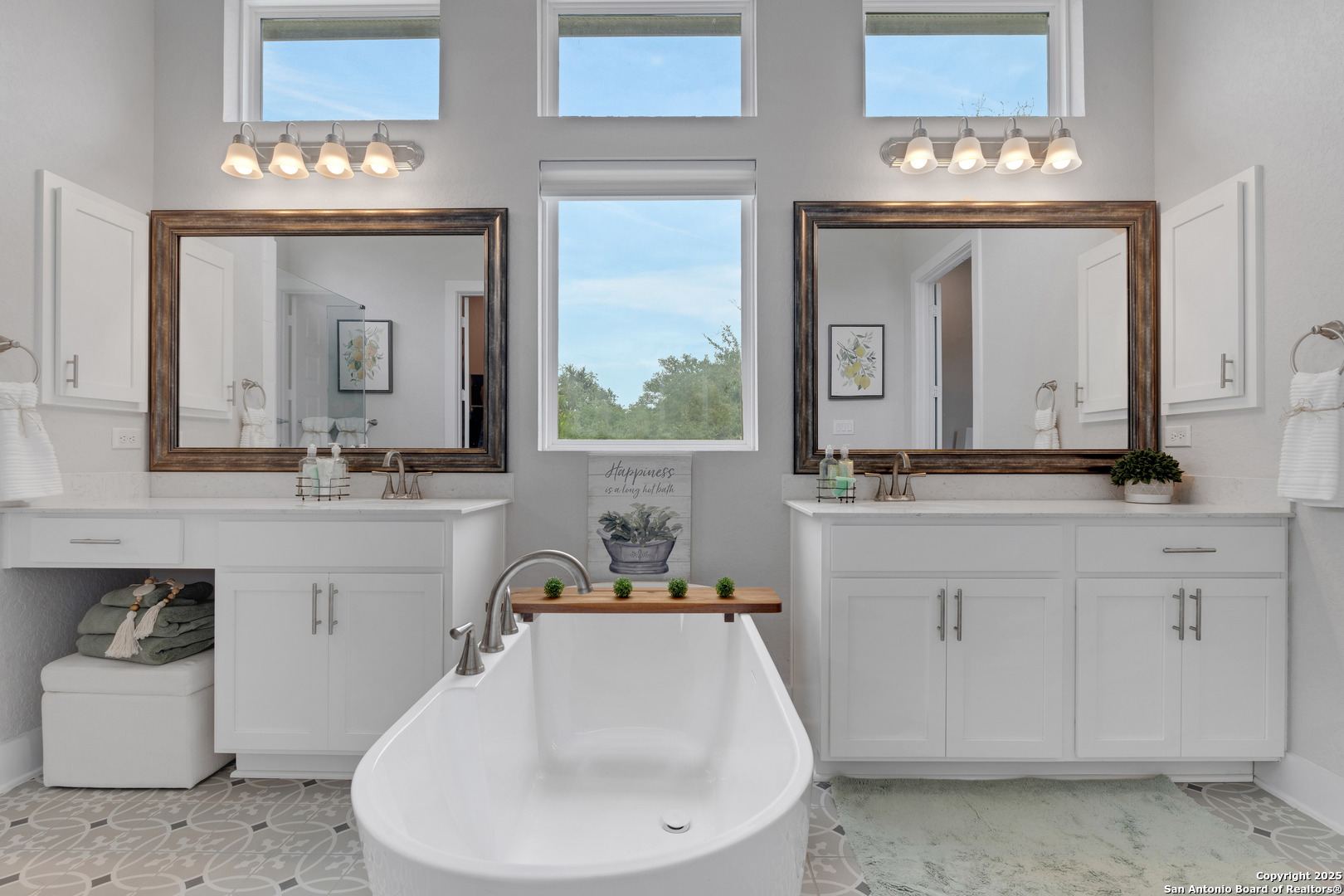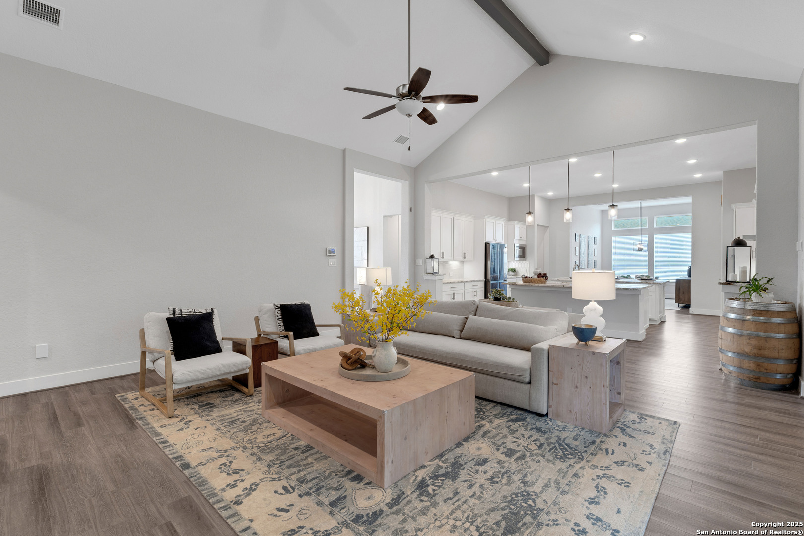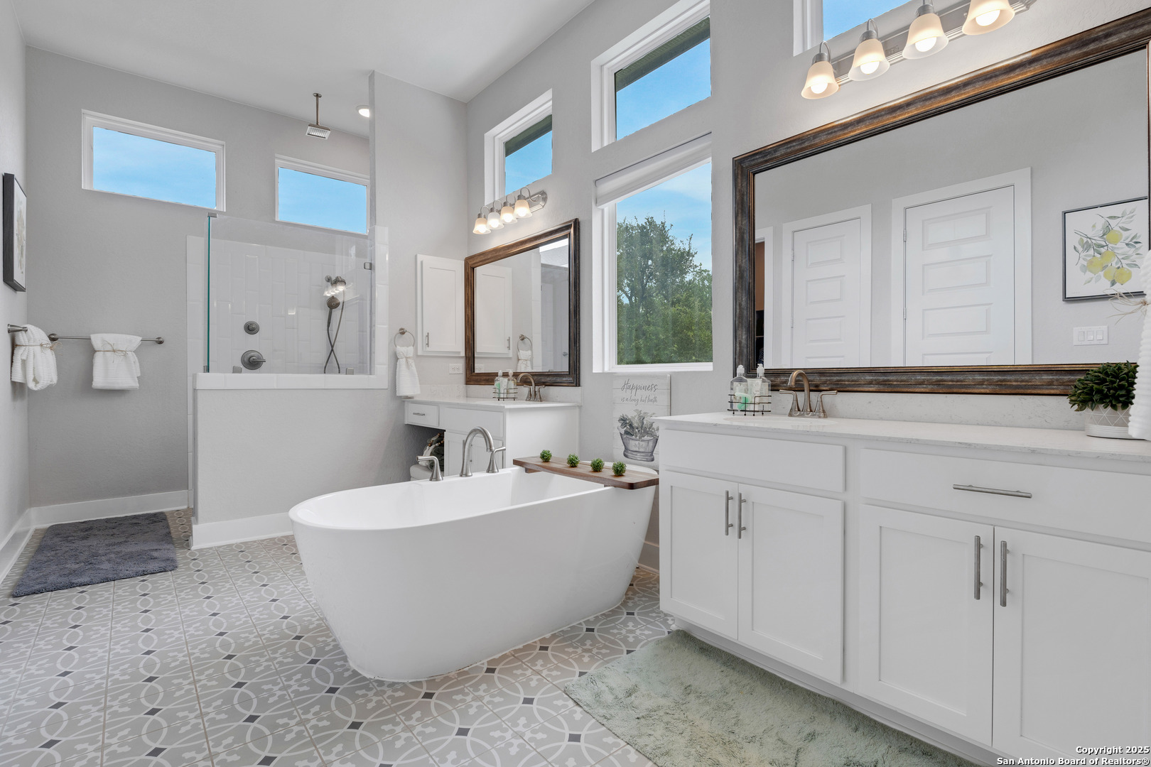 3.88% VA Assumable Loan available! Congratulations! You have found your next home! This absolutely stunning one-story home features one of Chesmar's most popular floor plans with soaring ceilings and a wide open layout that's built for both everyday living and entertaining! At the heart of the home is a spacious family room complete with custom-built-ins and a dramatic fireplace! The chef's kitchen features double islands, an oversized walk-in pantry, TONS of cabinetry and counter space, a reverse osmosis system, stainless steel appliances including a GE Profile five-burner gas cooktop, a convenient pot filler, and not one but two breakfast bars! Step outside to experience the incredible outdoor living area, beginning with a screened-in patio showcasing a cozy gas fireplace and stamped concrete floor. This opens to what just might be the most impressive backyard in the neighborhood! Enjoy the luxury of an in-ground pool with quad massaging jets, a sun deck with a sparkling fountain, and a state-of-the-art system that allows the pool to be heated or cooled to your preference. The .47 acre greenbelt lot is fully fenced and has a full sprinkler system to take care of the 20 mature trees that shade the professionally landscaped yard! The private primary suite offers custom window treatments, direct access to the outdoor living area, and a spa-like bathroom with a freestanding soaking tub, oversized walk-in shower, dual vanities, linen storage, and a custom walk-in closet with triple hanging rods and built-ins. Each spacious secondary bedroom has a private bath & a walk-in closet! The dedicated study features 12' ceilings and French doors for the ultimate work at home space! All mounted televisions are INCLUDED! Luxury utility room with cabinets, granite counters, refrigerator space, hanging rod and a drop zone just outside the door! The three car split garage boasts epoxy floors, custom storage shelving and a Defender Series water softener! Great location with easy access to Highway 90 & Loop 1604! Located in Medina Valley ISD with convenient access to Highway 90 and Loop 1604. Just minutes from Castroville attractions including Alsatian Golf Club, Castroville Regional Park, Haby's Alsatian Bakery, the Hillside Boutique Hotel, and more!