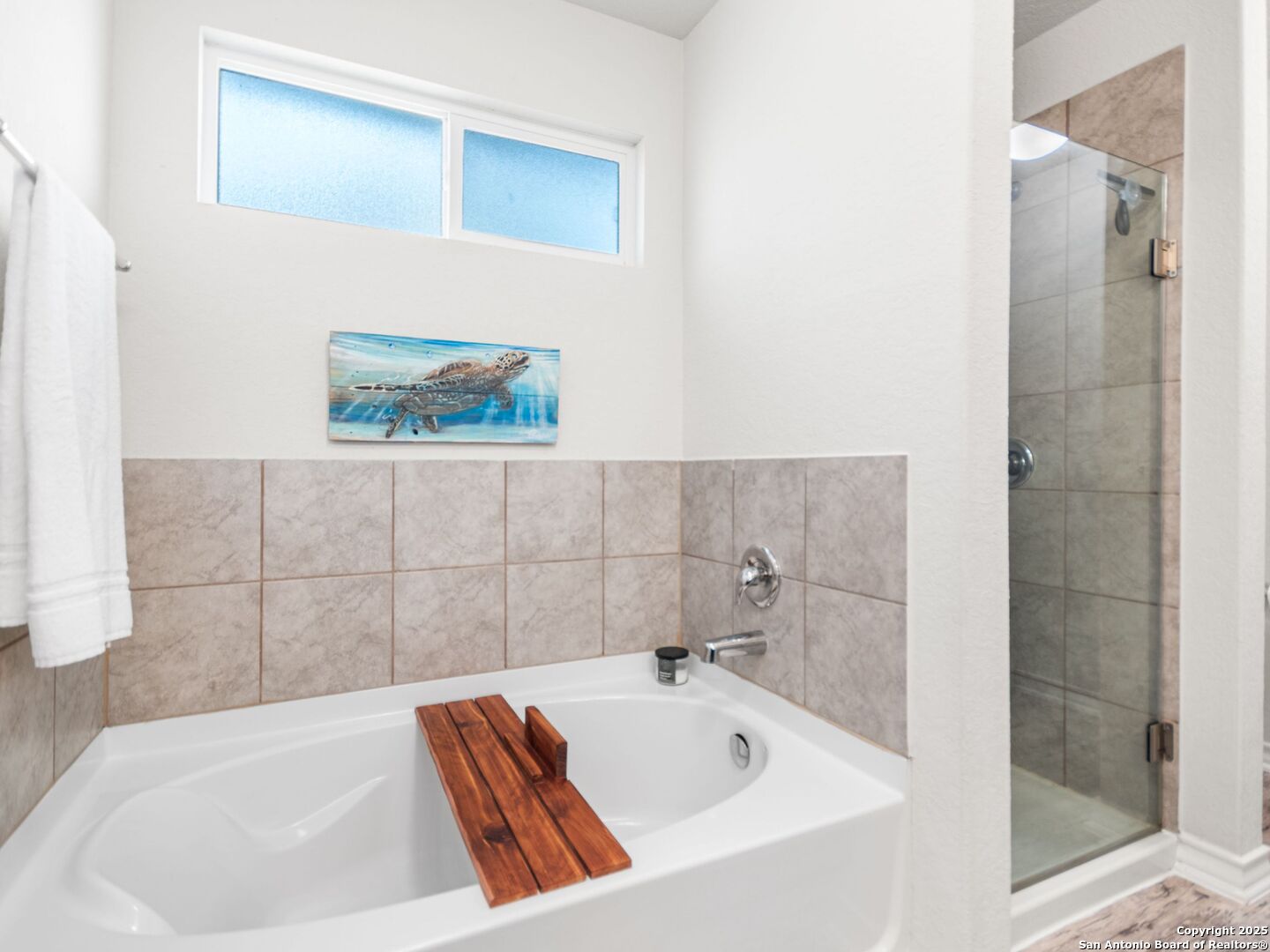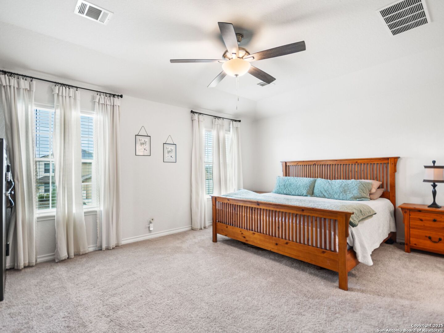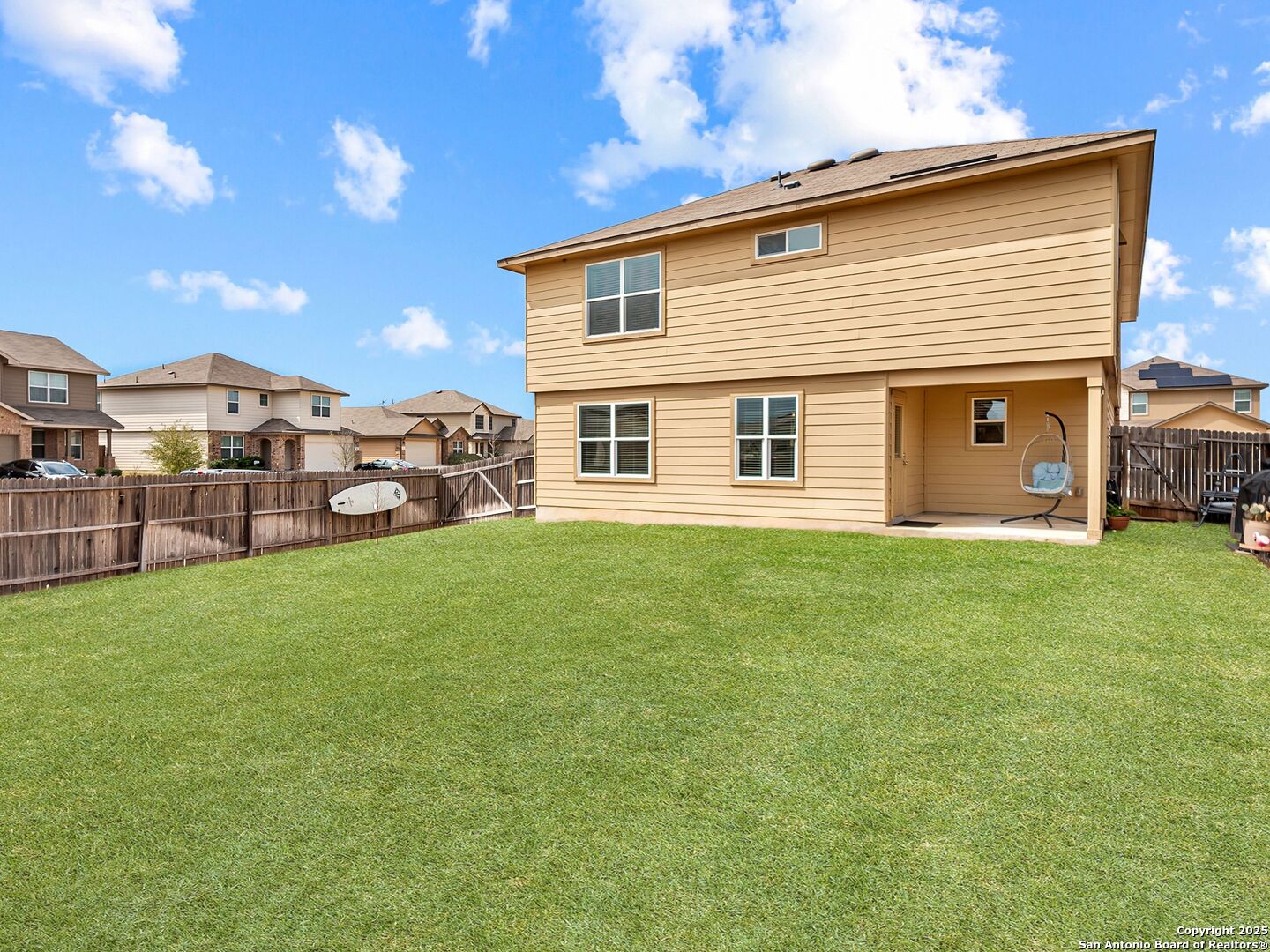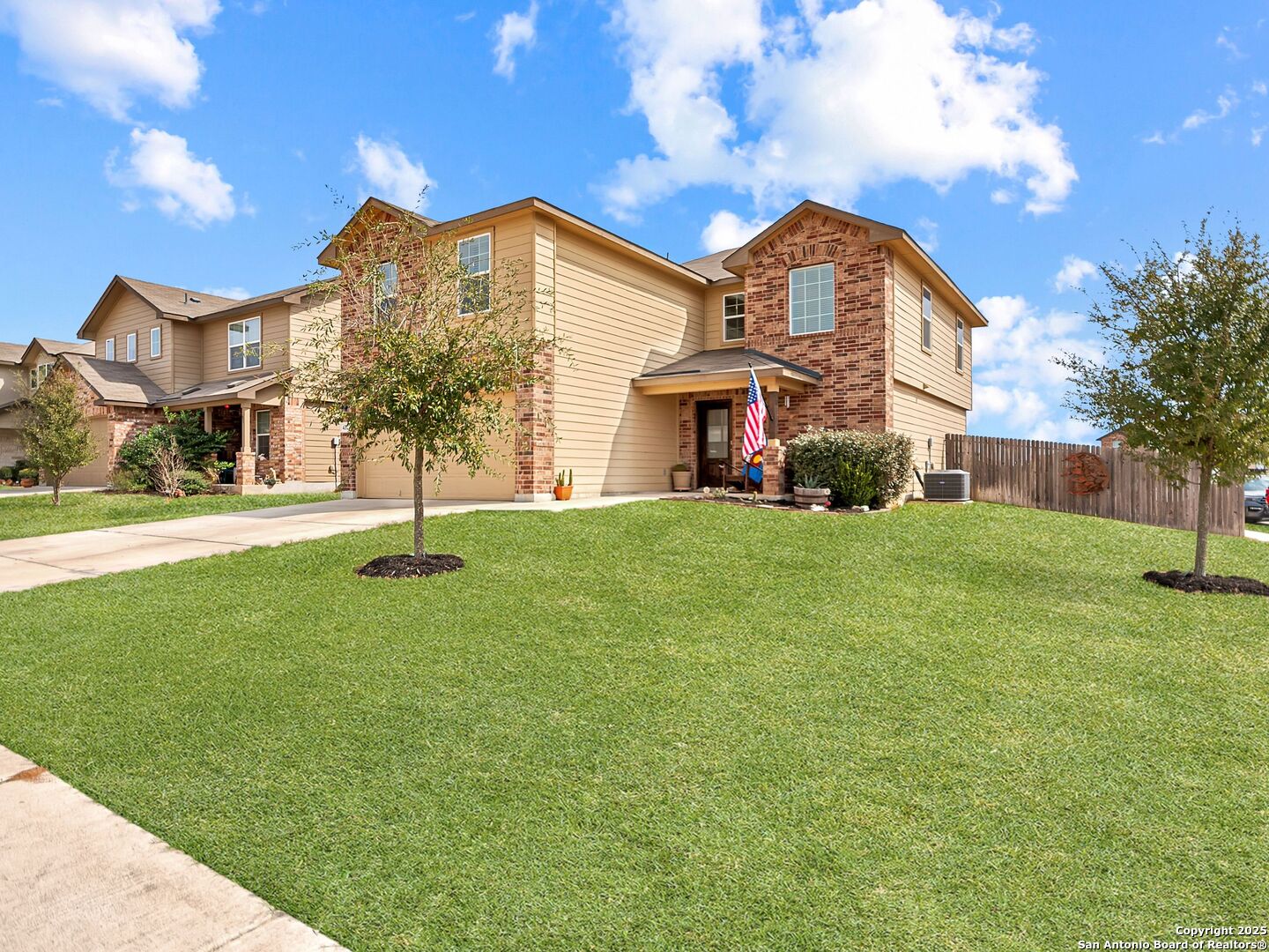Ideally situated in the highly rated Schertz-Cibolo-Universal City ISD, this well-maintained home offers unbeatable access to JBSA-Randolph, Fort Sam Houston, downtown Cibolo's shopping and dining, Crescent Bend Nature Park, and major highways including I-35 and Loop 1604. The spacious two-story layout features an open-concept design where the living, dining, and kitchen areas seamlessly connect, all with durable wood-look vinyl flooring. The kitchen is both stylish and functional, with granite countertops, a large island with breakfast bar, stainless steel appliances, abundant counter space, and a walk-in pantry. Upstairs, you'll find all bedrooms, a generous game room, and a conveniently located laundry room. The private primary suite includes a soaking tub, separate shower, double vanities, and a large walk-in closet. Built-in bookshelves add charm and utility to the secondary bedrooms. Sitting on a corner lot, the home enjoys added privacy, a fully fenced backyard, covered front and rear porches, a two-car garage, sprinkler system, and a water softener.