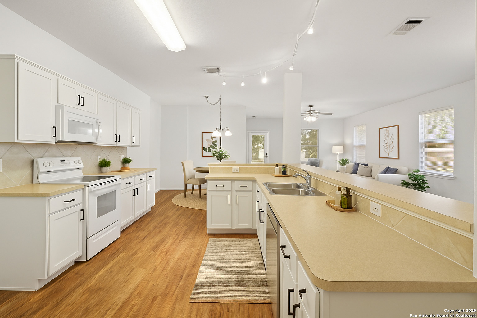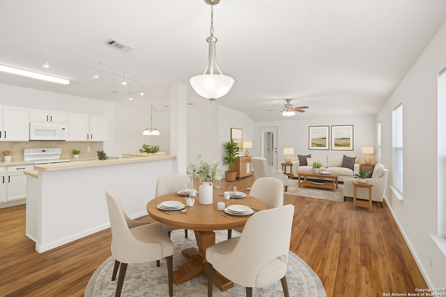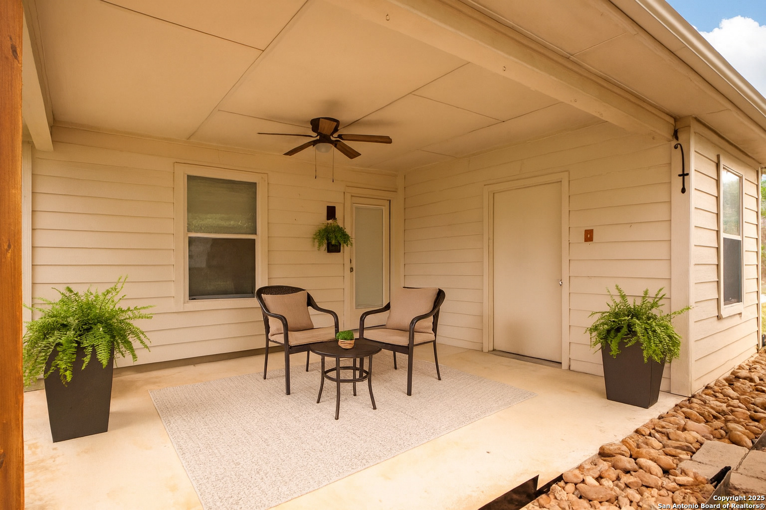 Located on a quiet cul-de-sac and corner lot in the Fairways at Scenic Hills, this well-maintained one-story Pulte home features the popular Orleans II floor plan with 3 bedrooms, 2 full baths, and a private home office with French doors. Recent updates include new hardwood flooring, brand new carpet, fresh interior paint, updated blinds, recent water heater, and smoke detectors. The open kitchen offers bar seating, ample storage, and connects seamlessly to the living and dining areas-perfect for gatherings. The spacious primary suite includes a walk-in closet and a renovated bath with dual vanities, a soaking tub, and a walk-in shower. Enjoy the oversized covered back patio with ceiling fan, mature trees, gutters, and a large, enclosed workshop or storage space. Foundation & plumbing upgrades recently completed with a transferable warranty. With no Bexar County taxes, recent landscaping, and access to top-rated Comal ISD schools, this move-in ready home offers unbeatable value and charm.
