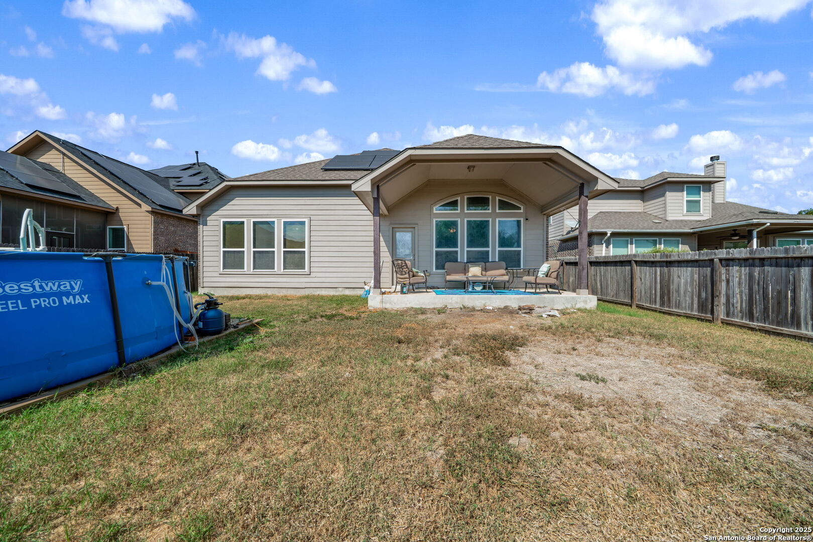 ASSUMABLE VA LOAN 3.250% FOR QUALIFIED VETERANS! Welcome to this beautiful 4-bedroom, 3-bathroom home located in the highly desired Parc at Escondido community. Built by Castlerock Homes, this 2,511-square-foot residence combines modern efficiency with timeless comfort. The home features soaring ceilings, large windows that fill the space with natural light, an open floor plan, a separate dining area, solar panels for energy savings, and a spacious game room. The kitchen is designed with both style and functionality in mind, offering a custom tile backsplash, walk-in pantry, and an abundance of counter space-perfect for cooking and entertaining. All bedrooms are conveniently located on the main level, with a versatile game room upstairs that can serve as a media room, playroom, or home gym. The primary suite is a serene retreat showcasing large windows, elegant wood floors, and a spa-like bathroom complete with two separate sinks, a garden tub, separate shower, and a generous walk-in closet. The backyard is ideal for outdoor enjoyment, featuring a covered patio, privacy fence, and an above-ground pool. Conveniently located near JBSA-Randolph and Fort Sam Houston, shopping, restaurants, and major highways, this home offers the perfect blend of luxury, efficiency, and convenience.