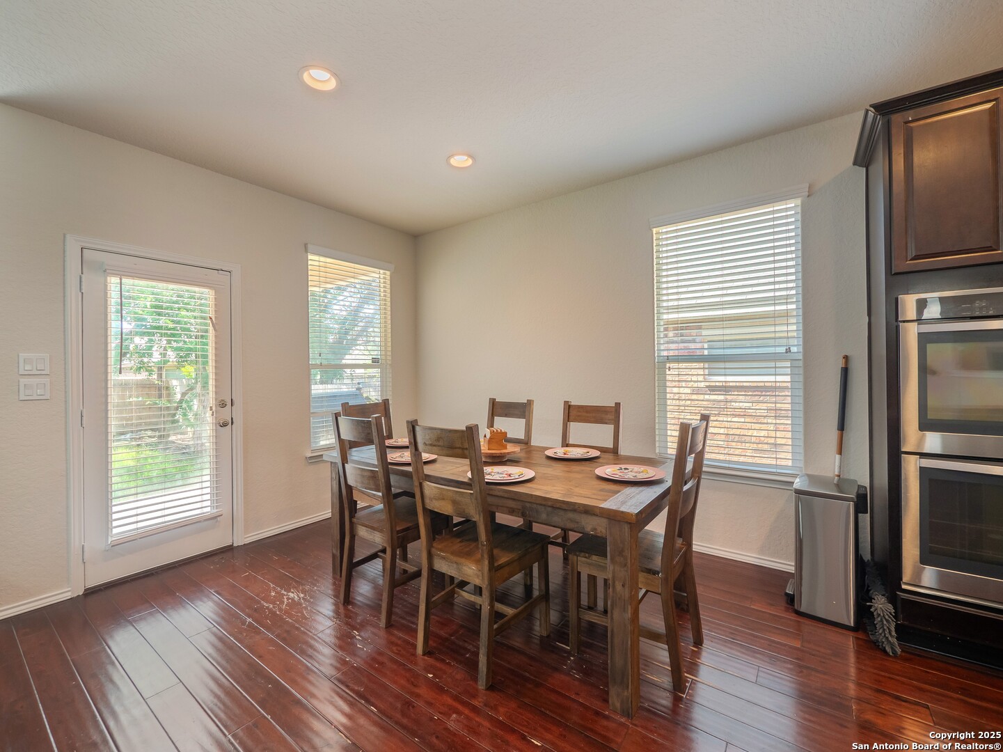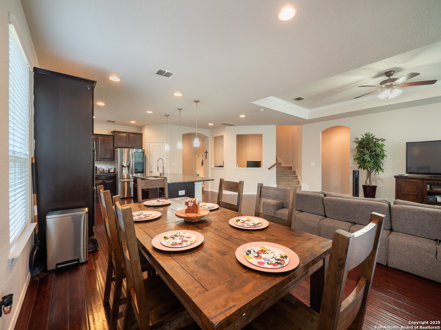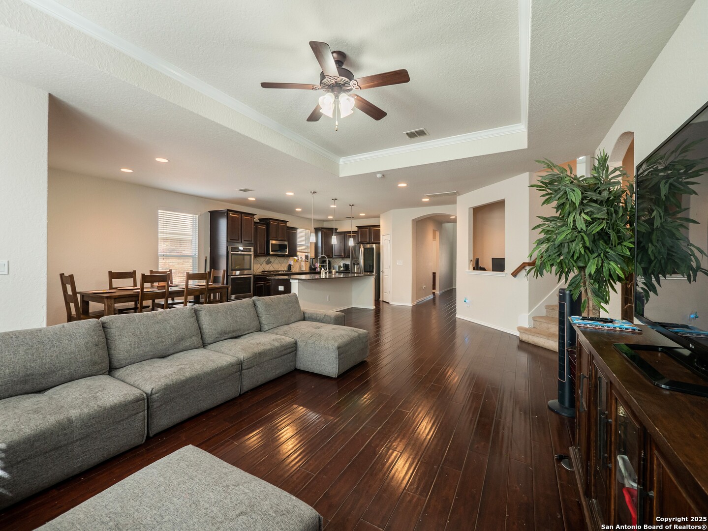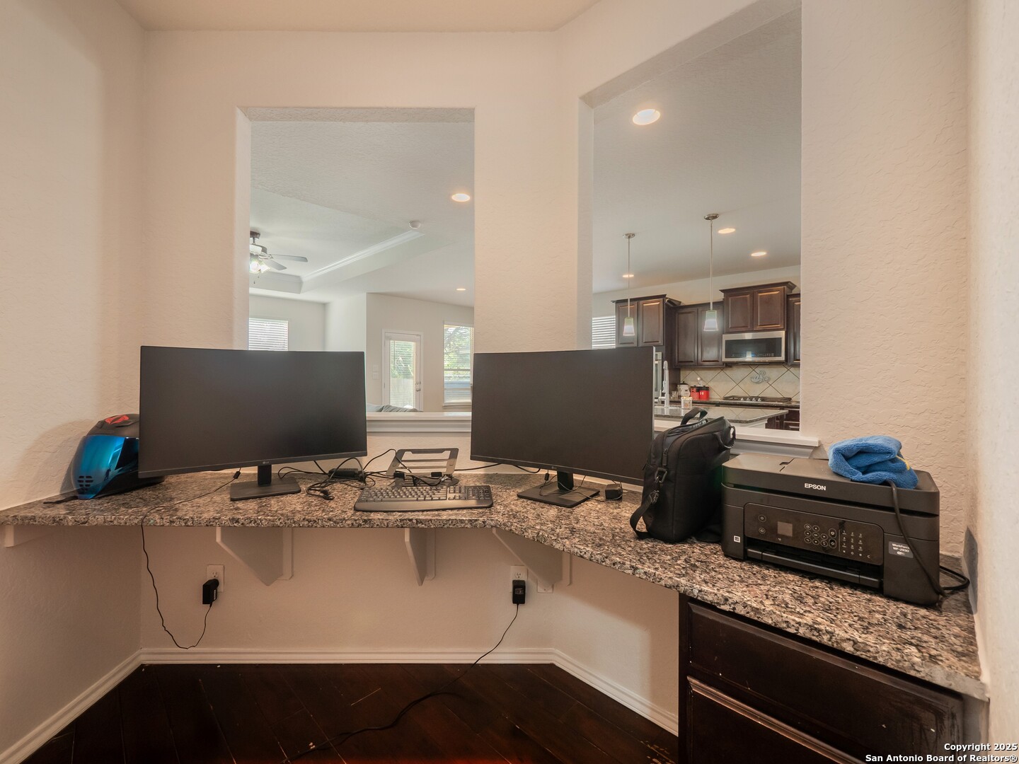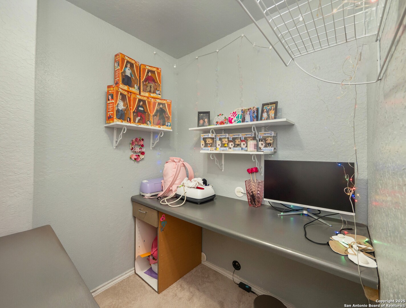 Welcome to this beautifully designed 5-bedroom, 4-bath, two-story home offering 2,923 sq ft of comfortable living space on a 0.14-acre lot. This home combines thoughtful design with everyday functionality. Step into a high-ceiling foyer that leads into an open-concept layout featuring a spacious living, dining, and kitchen combo. A tray ceiling highlights the living room, while the huge kitchen island offers plenty of prep and seating space - perfect for entertaining. A mudroom, a dedicated office, and a laundry room are all conveniently located on the main level. The primary bedroom is located on the main floor and boasts a spacious walk-in closet and a private ensuite bath with a dual vanity and walk-in shower. A secondary bedroom is also located downstairs, offering flexible space for guests or multigenerational living. All bedrooms are carpeted for added comfort. Upstairs, you'll find a carpeted versatile game room or media room, along with an additional office, ideal for remote work or study space. Enjoy the outdoors on the covered patio slab overlooking a fully fenced wooden backyard - perfect for relaxing or entertaining. Additional highlights include a two-car attached garage, sidewalk and curb appeal. Located in a quiet, low-traffic neighborhood - perfect for casual walks at any time of day - and just five lots down from the neighborhood playground. Perfectly situated just minutes from Dean H. Krueger Elementary School, H-E-B Plus, Walmart, and Neighborhood Walmart. Offers easy access to Loop 1604 and is centrally located between Alamo Ranch and La Cantera, and conventionally positioned between major attractions like SeaWorld and Six Flags Fiesta Texas. Close to Old Town Helotes, which hosts a farmers market on the first Saturday of each month. The City of Helotes also features annual events such as a rodeo, carnival, and parades - including Christmas parade. This home offers space, flexibility, and convenience - all in one well-appointed package. Schedule your tour today!
