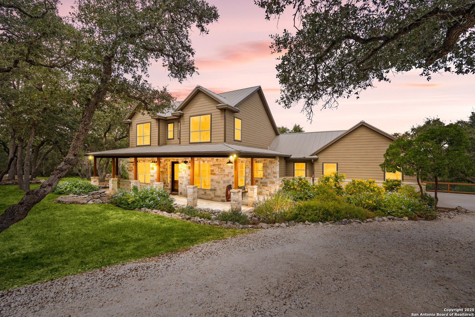 This two-story custom-built home sits on 4.85 acres in the gated and peaceful community of Retalbo Ranch. Surrounded by mature oak trees, the property offers privacy, natural beauty, and plenty of room to enjoy outdoor living. The first floor features a spacious living room with a custom floor-to-ceiling fireplace, outside access, and a wall of windows that fill the space with natural light. The living area flows into the kitchen and dining space, accented with a beamed ceiling. The kitchen includes stainless steel appliances, gas cooking, a walk-in pantry, breakfast bar, and generous counter and cabinet space. A separate study provides an ideal spot for a home office or quiet retreat. The split primary bedroom is also on the first floor, offering a private ensuite bath, along with a secondary bedroom and full bath. Upstairs, you'll find two additional bedrooms and a second living area, perfect for a media or game room. Both front and back covered porches extend the living space outdoors. The backyard is designed for gatherings, with a large covered and open patio/deck offering treetop views of the Hill Country, an additional patio with a firepit, a sprawling lawn, and shady oak trees. Additional highlights include an oversized insulated two-car garage, insulated garage door, and the comfort of a serene community setting. This property combines space, function, and natural surroundings-schedule your personal tour today!