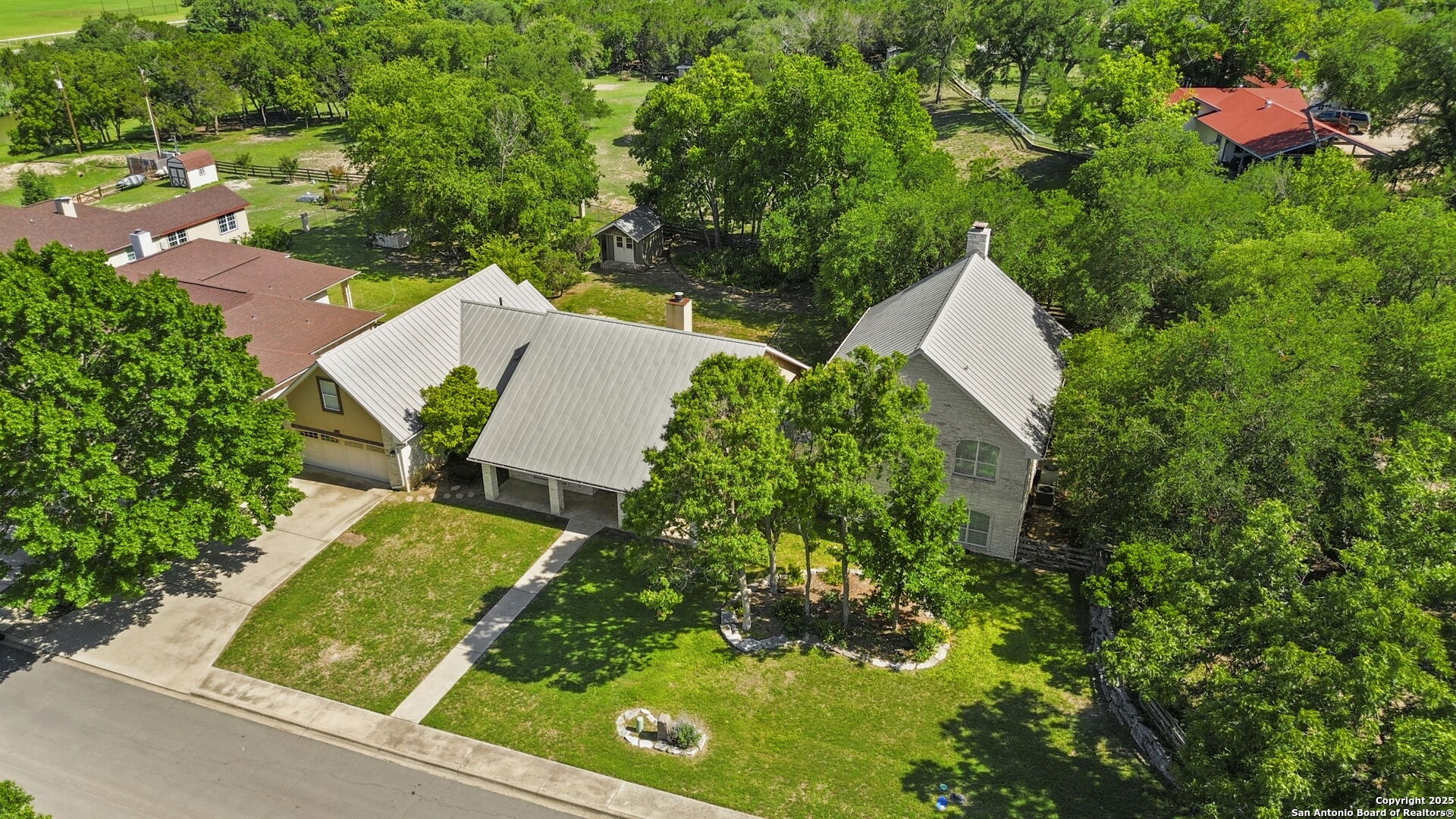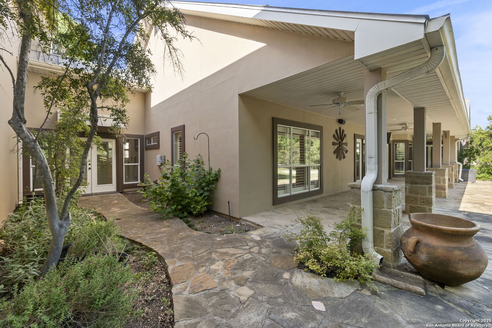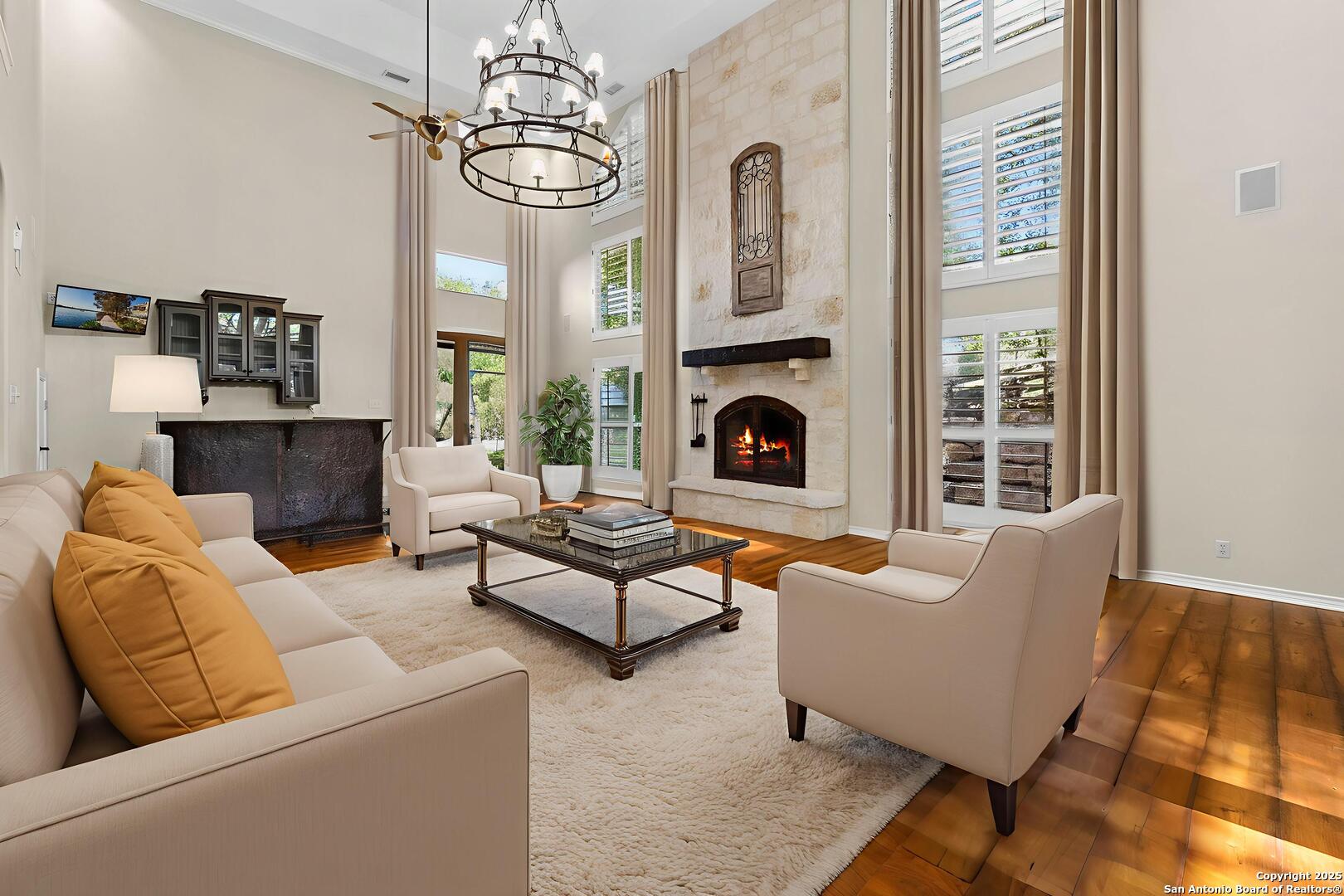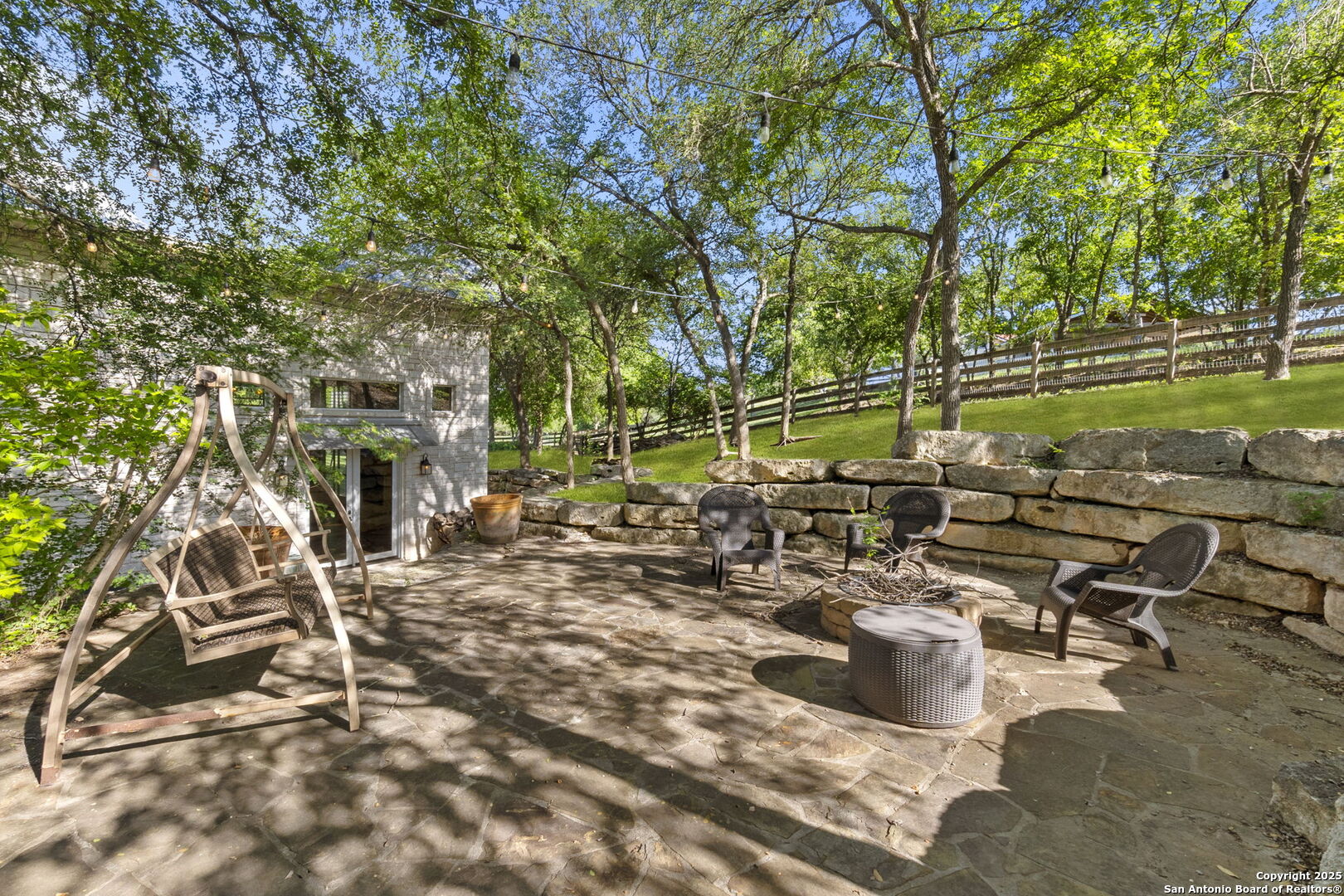 Price just improved-your dream home is now an even better value! Nestled in desirable Bluebell Estates, this stunning white stone home spans two residential lots, offering the perfect combination of in-town convenience & the serenity of country living-just a short walk to scenic Town Creek, ideal for kayaking & fishing right out your back door. Step inside to find beautiful hardwood floors, two stone wood-burning fireplaces, with custom built-ins throughout. The chef's kitchen is a culinary dream, featuring a built-in KitchenAid refrigerator, Wolf range, built-in KitchenAid oven with warming drawer-perfect for family meals or entertaining. The luxurious primary suite includes a spa-like ensuite with a frameless glass shower, soaking tub, & a closet with floor-to-ceiling custom built-ins. A second bedroom & full bath on the main level offer flexibility for multi-generational living. Entertain with ease on the oversized flagstone-covered back porch, complete with an outdoor kitchen, or relax in the courtyard by the firepit surrounded by multiple seating areas. The secondary living area boasts soaring two-story ceilings, a custom wet bar with copper accents, a show-stopping stone fireplace, & a dramatic iron chandelier. A hidden staircase leads to a media room along with two additional walk-in storage closets. Enjoy the built-in sound system extending from indoor living spaces to the back porch & hillside firepit, where rock speakers enhance every gathering. This one-of-a-kind home effortlessly blends luxury, comfort, and functionality-your perfect Hill Country lifestyle awaits!