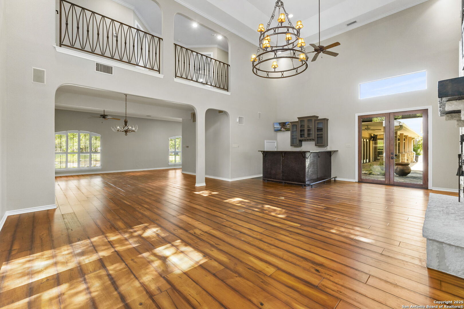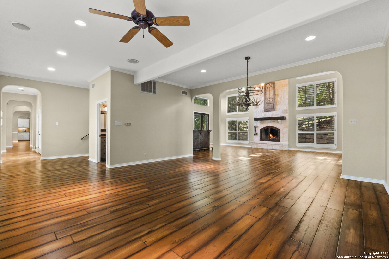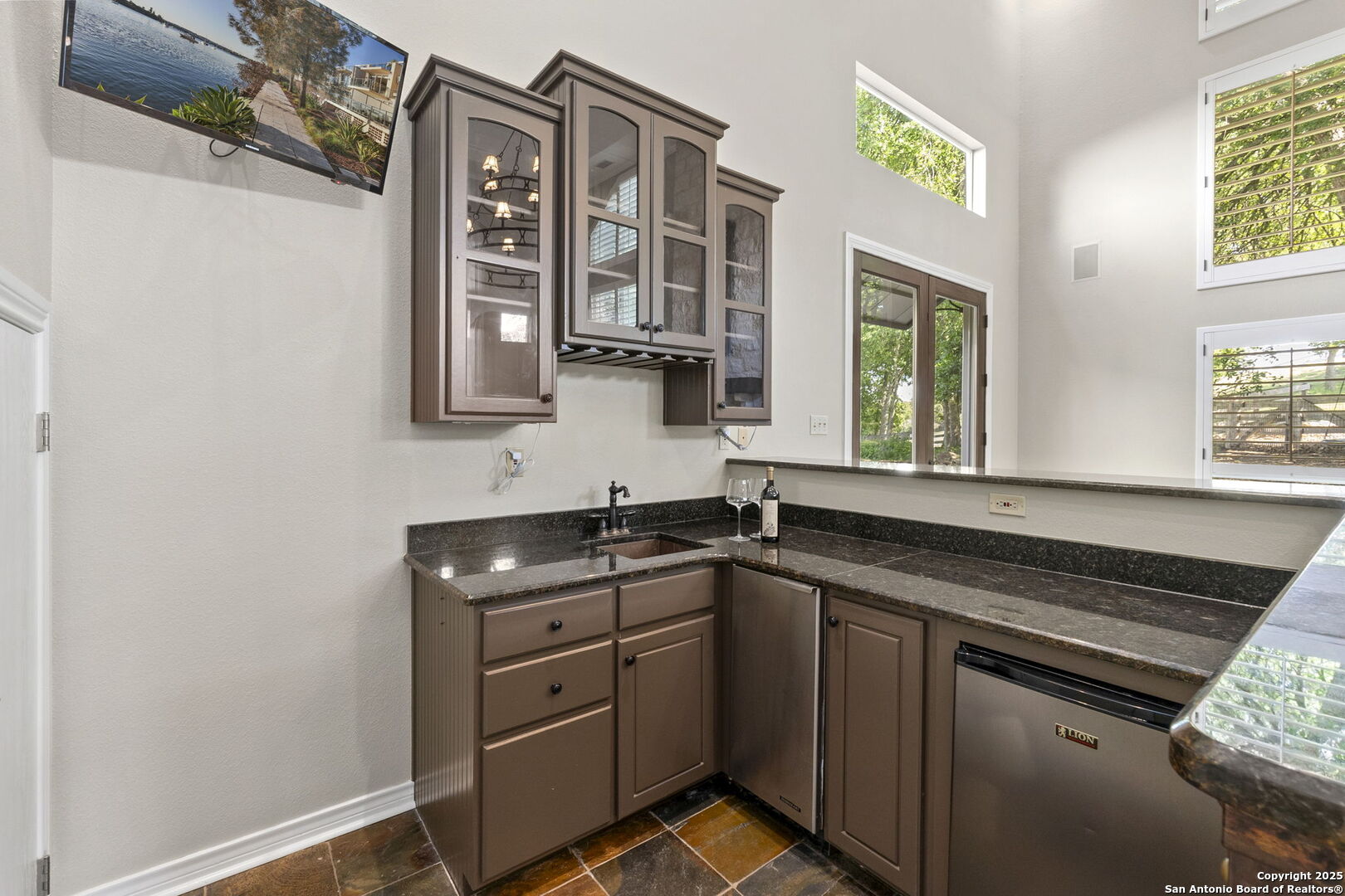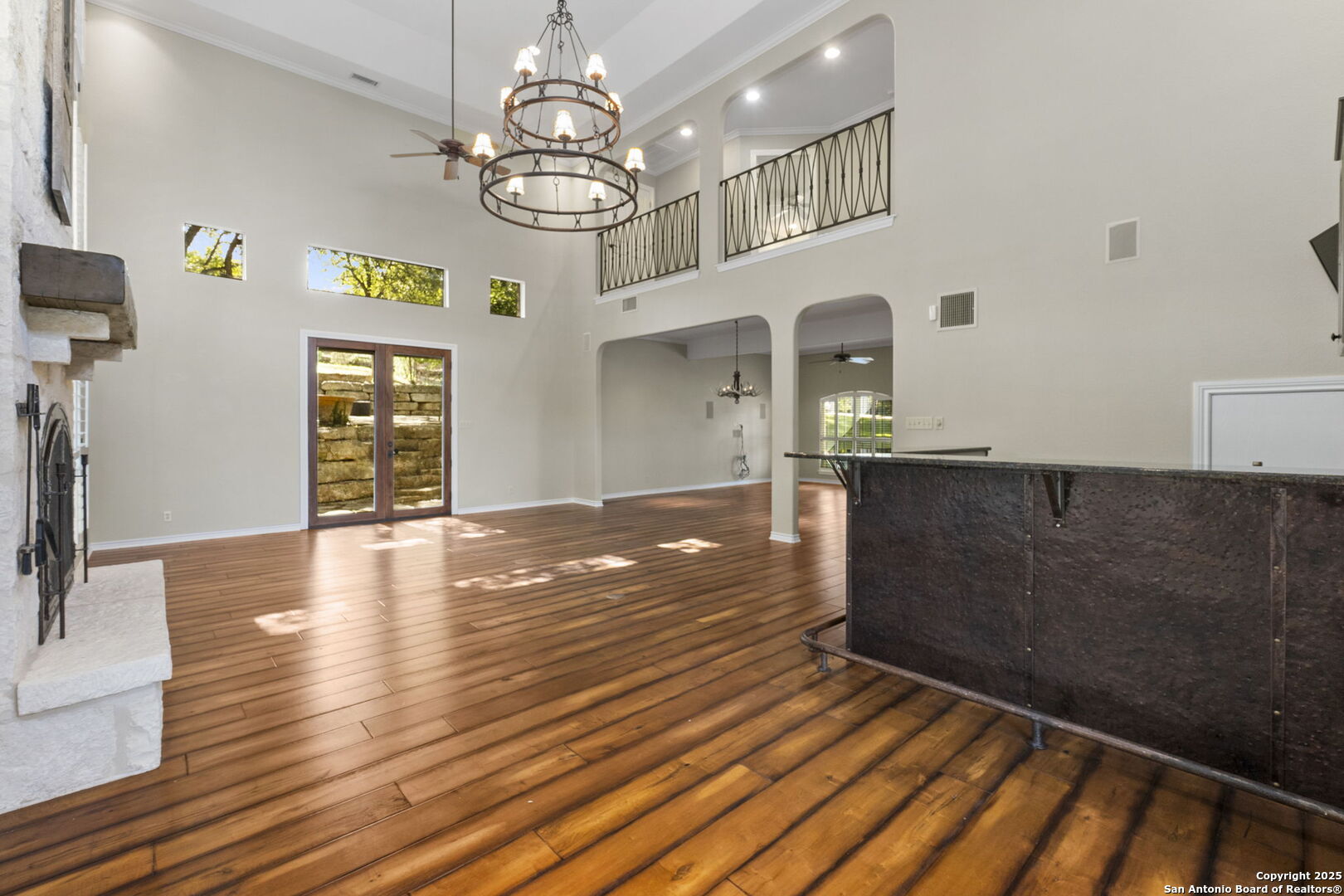 Price just improved-your dream home is now an even better value! Nestled in desirable Bluebell Estates, this stunning white stone home spans two residential lots, offering the perfect combination of in-town convenience & the serenity of country living-just a short walk to scenic Town Creek, ideal for kayaking & fishing right out your back door. Step inside to find beautiful hardwood floors, two stone wood-burning fireplaces, with custom built-ins throughout. The chef's kitchen is a culinary dream, featuring a built-in KitchenAid refrigerator, Wolf range, built-in KitchenAid oven with warming drawer-perfect for family meals or entertaining. The luxurious primary suite includes a spa-like ensuite with a frameless glass shower, soaking tub, & a closet with floor-to-ceiling custom built-ins. A second bedroom & full bath on the main level offer flexibility for multi-generational living. Entertain with ease on the oversized flagstone-covered back porch, complete with an outdoor kitchen, or relax in the courtyard by the firepit surrounded by multiple seating areas. The secondary living area boasts soaring two-story ceilings, a custom wet bar with copper accents, a show-stopping stone fireplace, & a dramatic iron chandelier. A hidden staircase leads to a media room along with two additional walk-in storage closets. Enjoy the built-in sound system extending from indoor living spaces to the back porch & hillside firepit, where rock speakers enhance every gathering. This one-of-a-kind home effortlessly blends luxury, comfort, and functionality-your perfect Hill Country lifestyle awaits!