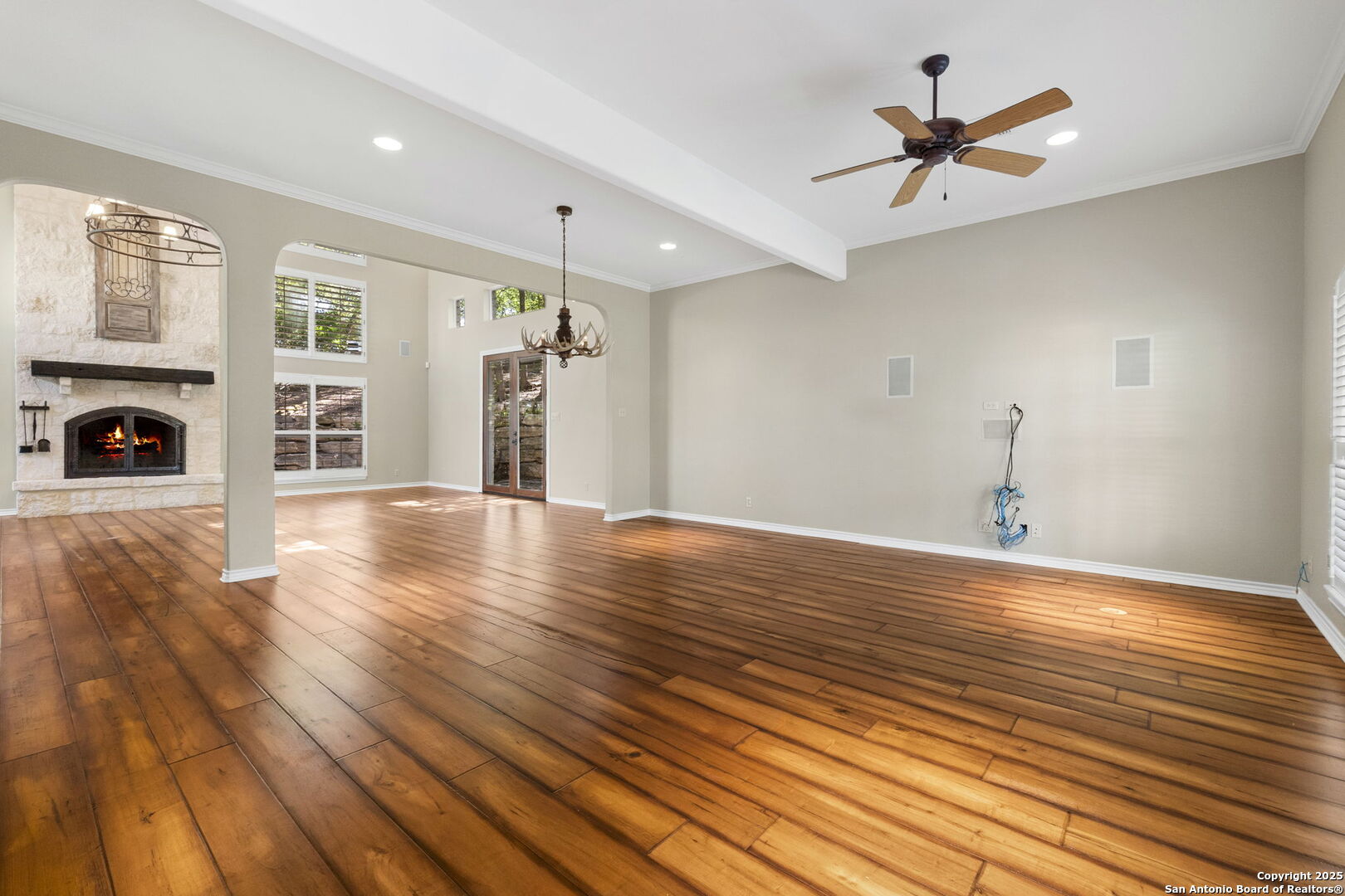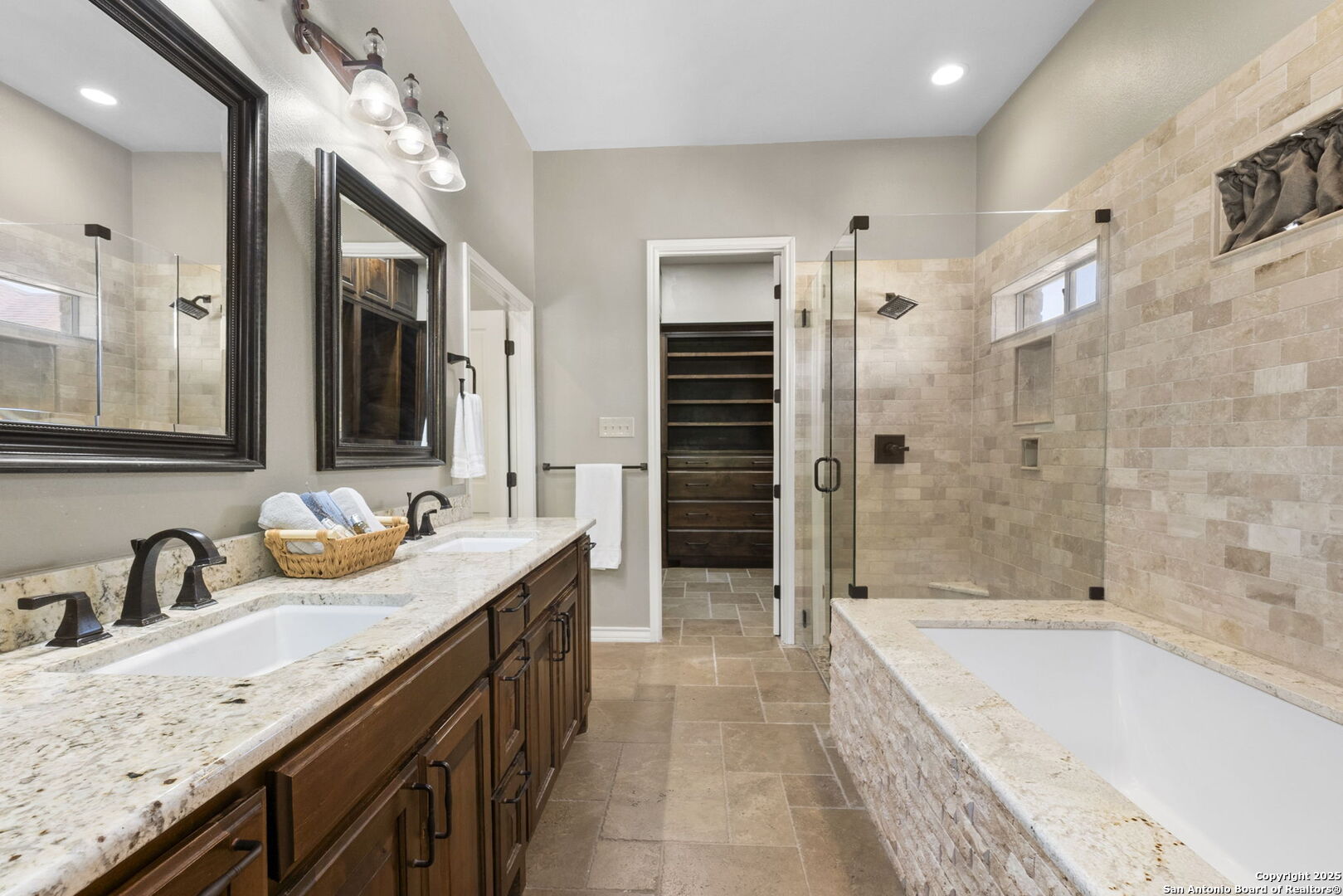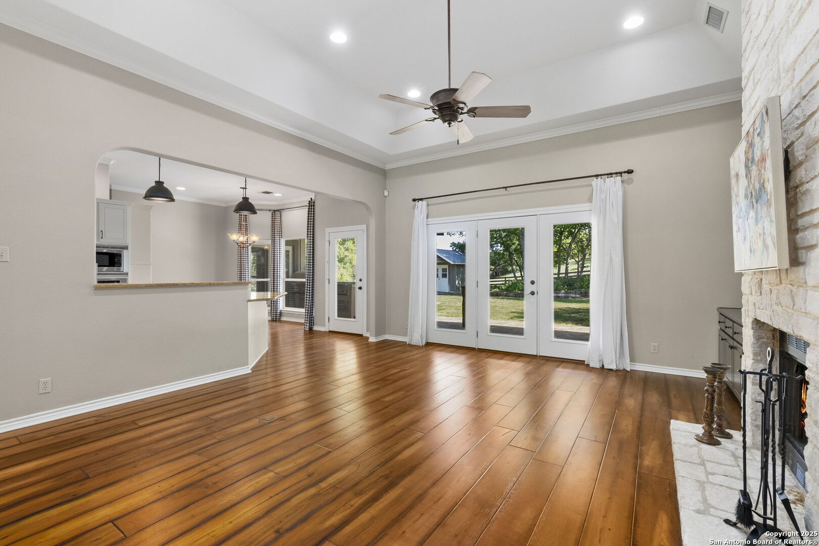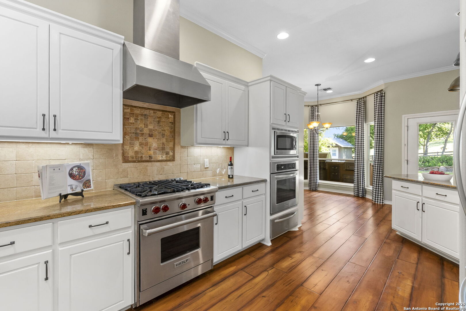 Price just improved-your dream home is now an even better value! Nestled in desirable Bluebell Estates, this stunning white stone home spans two residential lots, offering the perfect combination of in-town convenience & the serenity of country living-just a short walk to scenic Town Creek, ideal for kayaking & fishing right out your back door. Step inside to find beautiful hardwood floors, two stone wood-burning fireplaces, with custom built-ins throughout. The chef's kitchen is a culinary dream, featuring a built-in KitchenAid refrigerator, Wolf range, built-in KitchenAid oven with warming drawer-perfect for family meals or entertaining. The luxurious primary suite includes a spa-like ensuite with a frameless glass shower, soaking tub, & a closet with floor-to-ceiling custom built-ins. A second bedroom & full bath on the main level offer flexibility for multi-generational living. Entertain with ease on the oversized flagstone-covered back porch, complete with an outdoor kitchen, or relax in the courtyard by the firepit surrounded by multiple seating areas. The secondary living area boasts soaring two-story ceilings, a custom wet bar with copper accents, a show-stopping stone fireplace, & a dramatic iron chandelier. A hidden staircase leads to a media room along with two additional walk-in storage closets. Enjoy the built-in sound system extending from indoor living spaces to the back porch & hillside firepit, where rock speakers enhance every gathering. This one-of-a-kind home effortlessly blends luxury, comfort, and functionality-your perfect Hill Country lifestyle awaits!