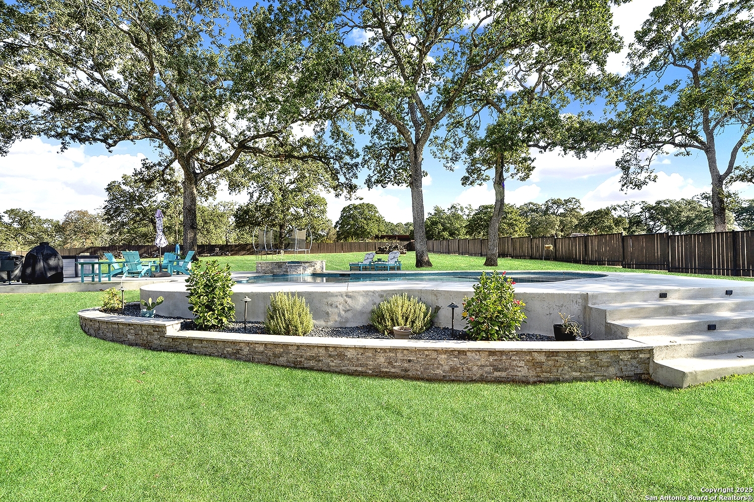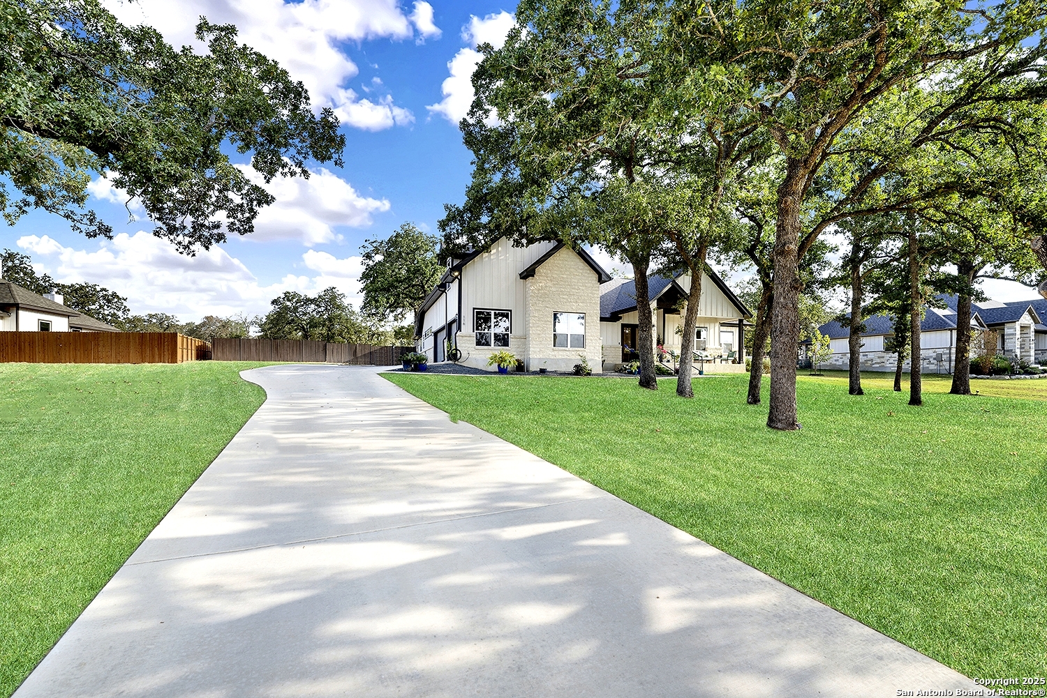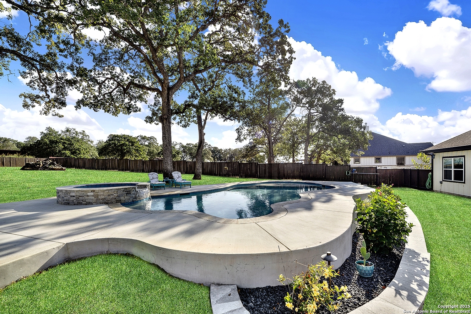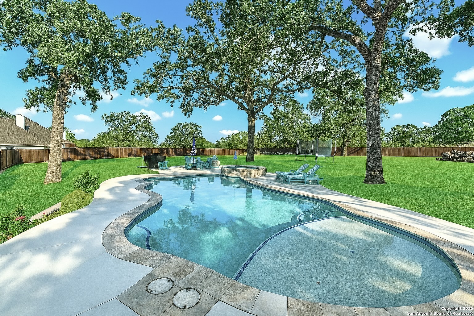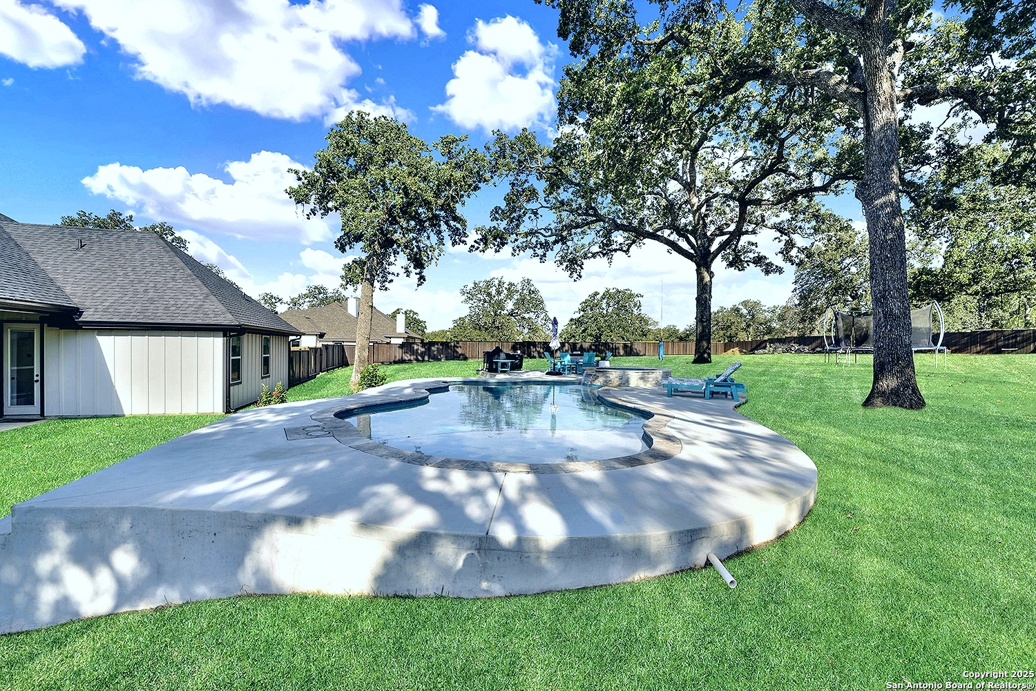 Exquisite 4-bedroom residence nestled on a full acre in the prestigious Timbers subdivision within La Vernia ISD. This thoughtfully designed home offers a sophisticated open floor plan with soaring ceilings and an expansive bonus room ideal for a media retreat or game room. The gourmet kitchen showcases granite countertops, custom cabinetry, and a remarkable hidden walk-in pantry-cleverly concealed behind what appears to be double cabinets. Propane has been added to the home, offering additional convenience and efficiency. The private master suite provides a serene escape with a spa-inspired bath, a generous walk-in closet, and access to the covered back patio. Step outside to your own backyard oasis featuring an oversized yard and sparkling pool surrounded by mature oaks-perfect for refined entertaining or peaceful relaxation. This home has a spacious 3-car garage with sleek epoxy-sealed flooring and offers so much more- it truly must be seen in person!