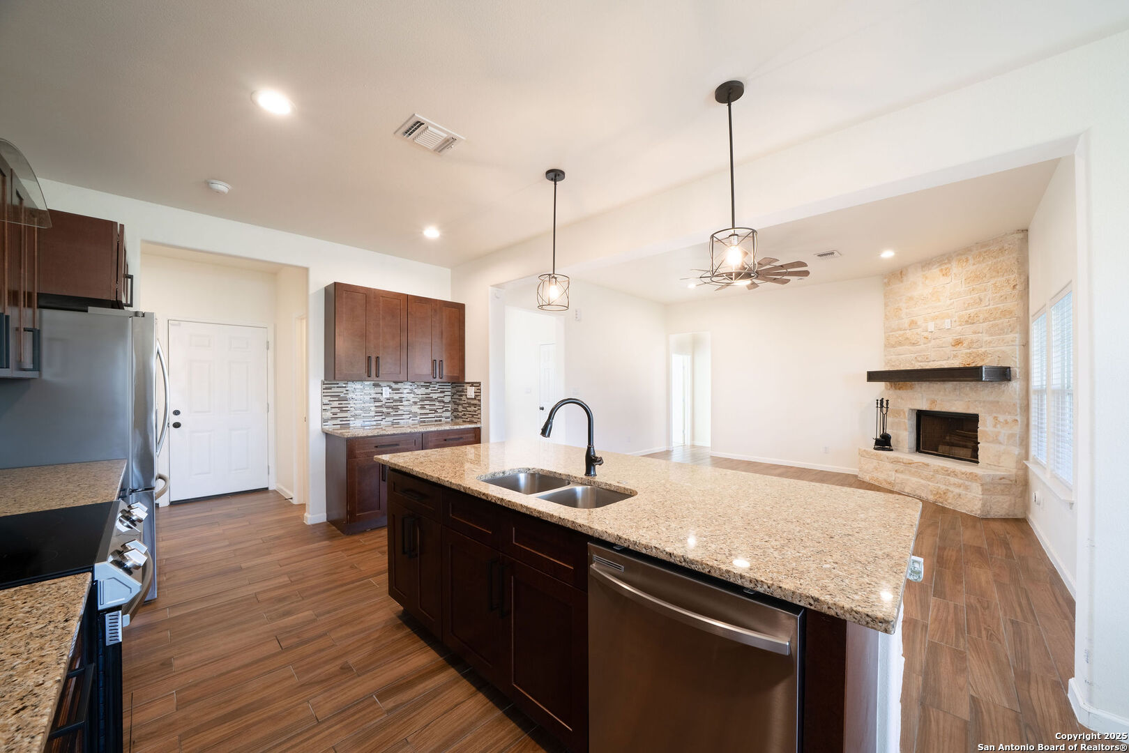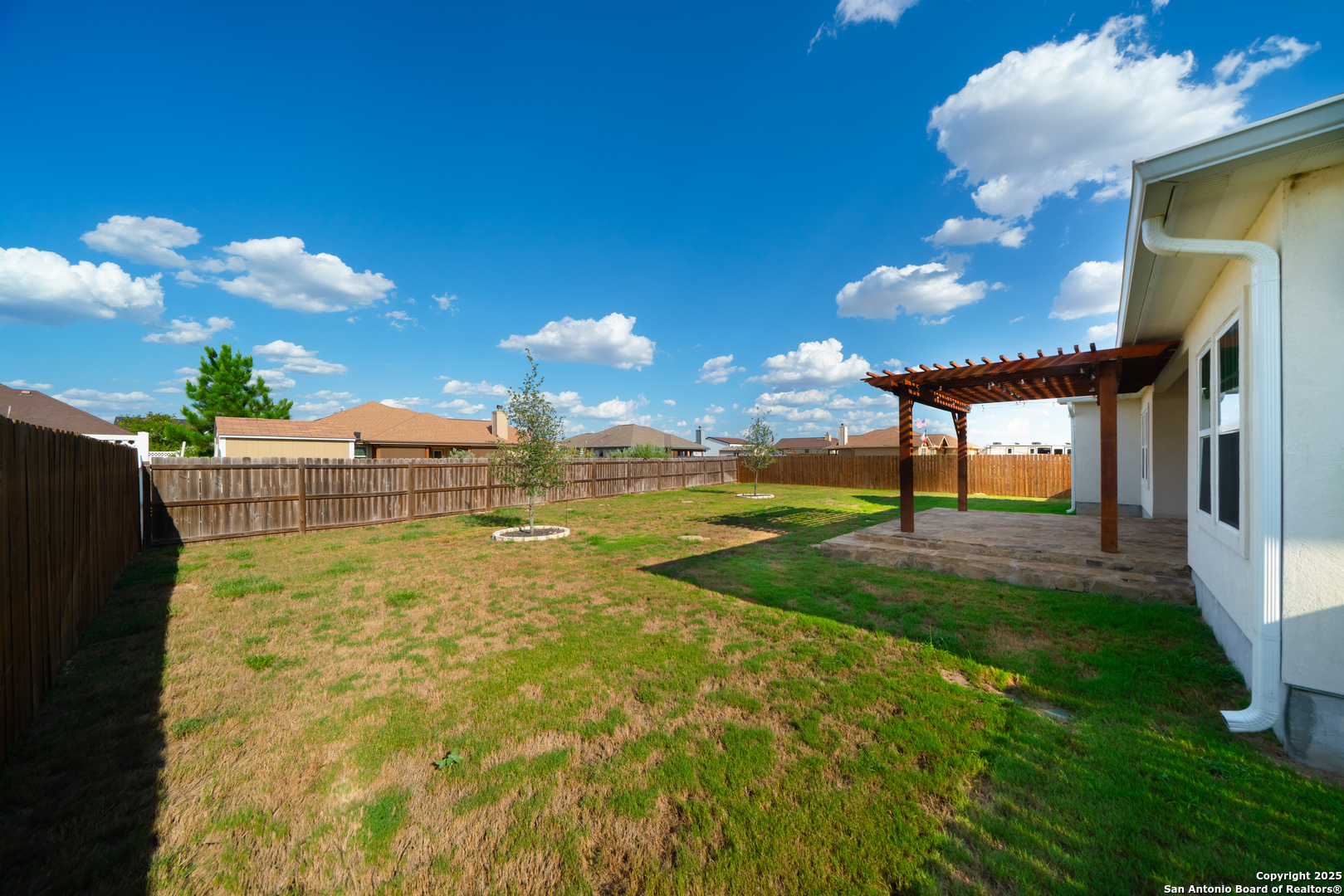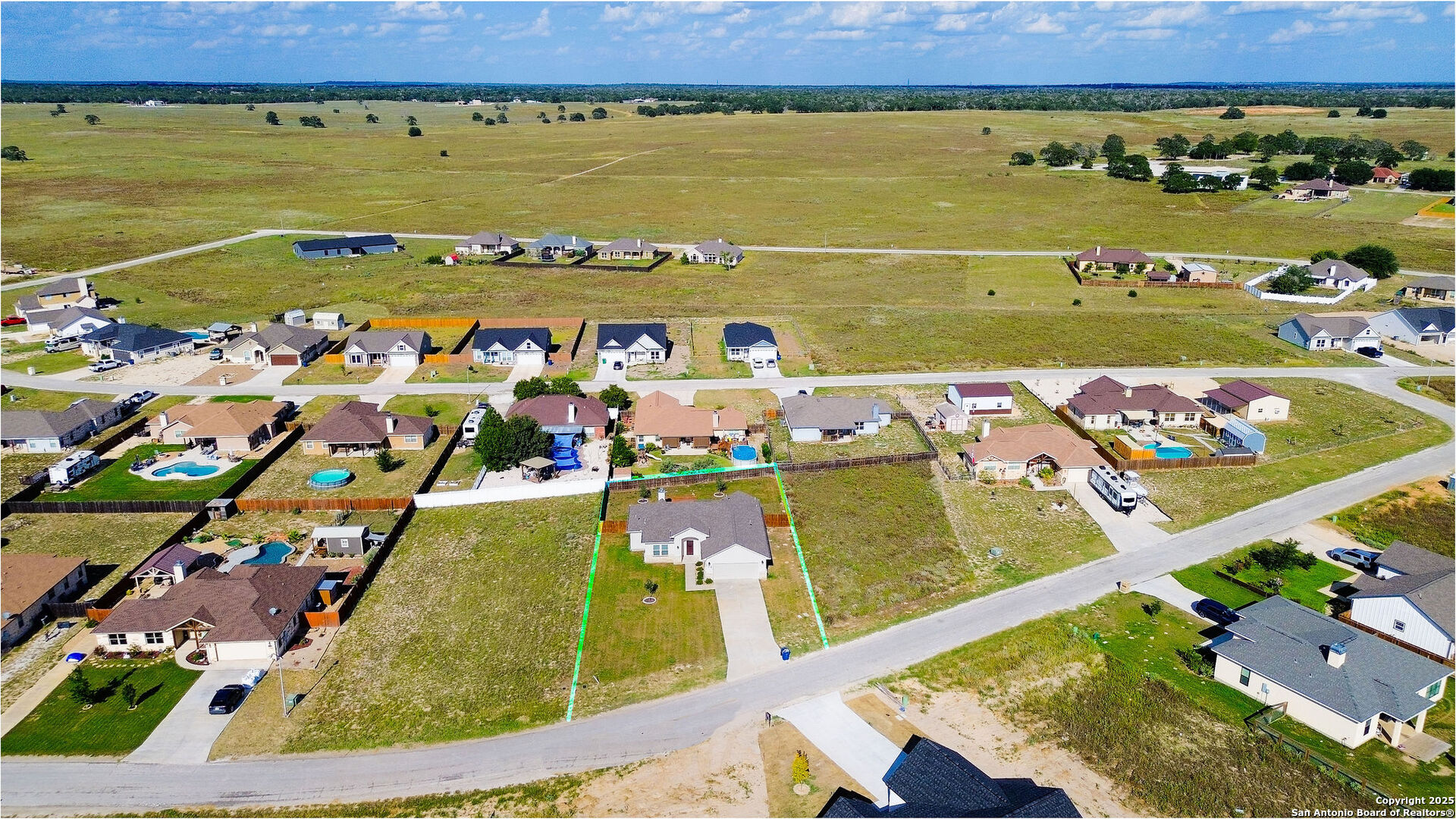 Welcome to this stunning 3 bedroom, 2 bathroom home located just 5 minutes from the city of La Vernia. Built just two years ago, this residence offers the perfect blend of modern design and timeless comfort. Situated on a spacious 0.3-acre lot with a privacy fence, the property provides both charm and seclusion. Step inside to find an open floor plan designed for effortless living and entertaining. The inviting living room showcases a beautiful rock fireplace, while the kitchen features a large island that seamlessly connects to the dining and living areas. Natural light flows throughout the home, highlighting the thoughtful upgrades and finishes. The primary suite is a true retreat with its vaulted ceiling and spa-like bathroom, with a double vanity and a stunning walk-in shower. Step outside to enjoy a covered back patio enhanced with a pergola, perfect for relaxing or entertaining in your private backyard. Don't miss the opportunity to make this beautiful La Vernia home your own-schedule your showing today!