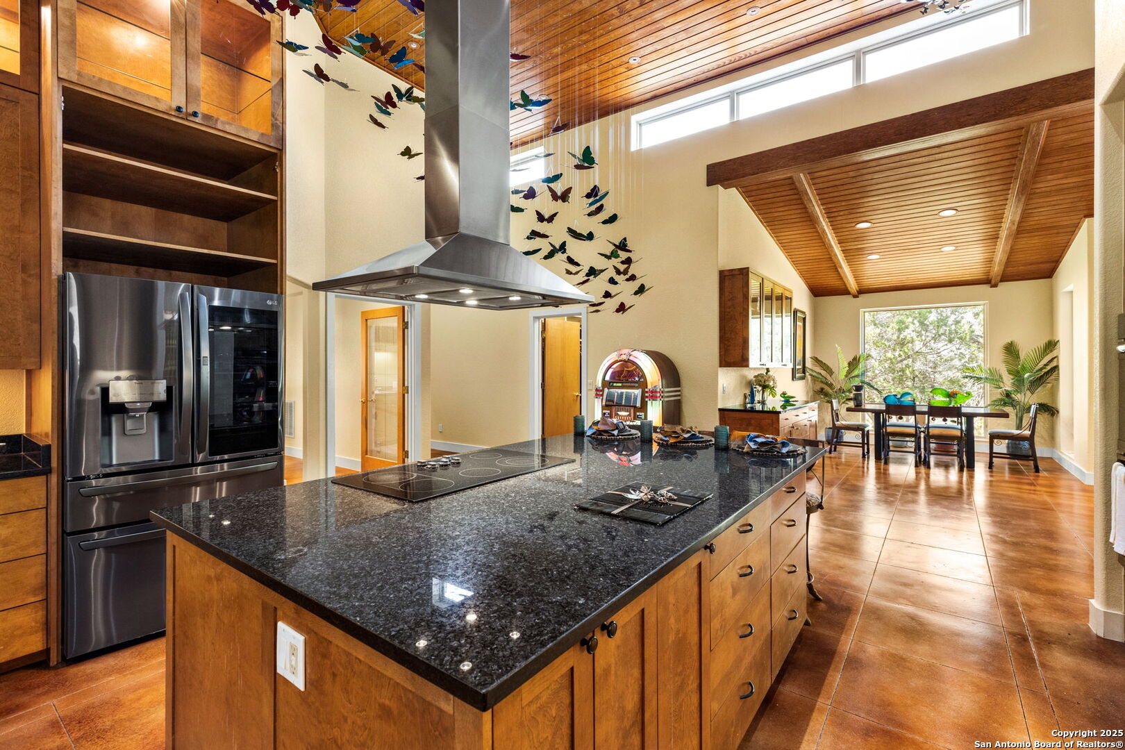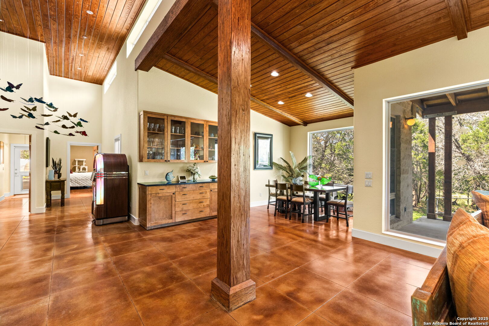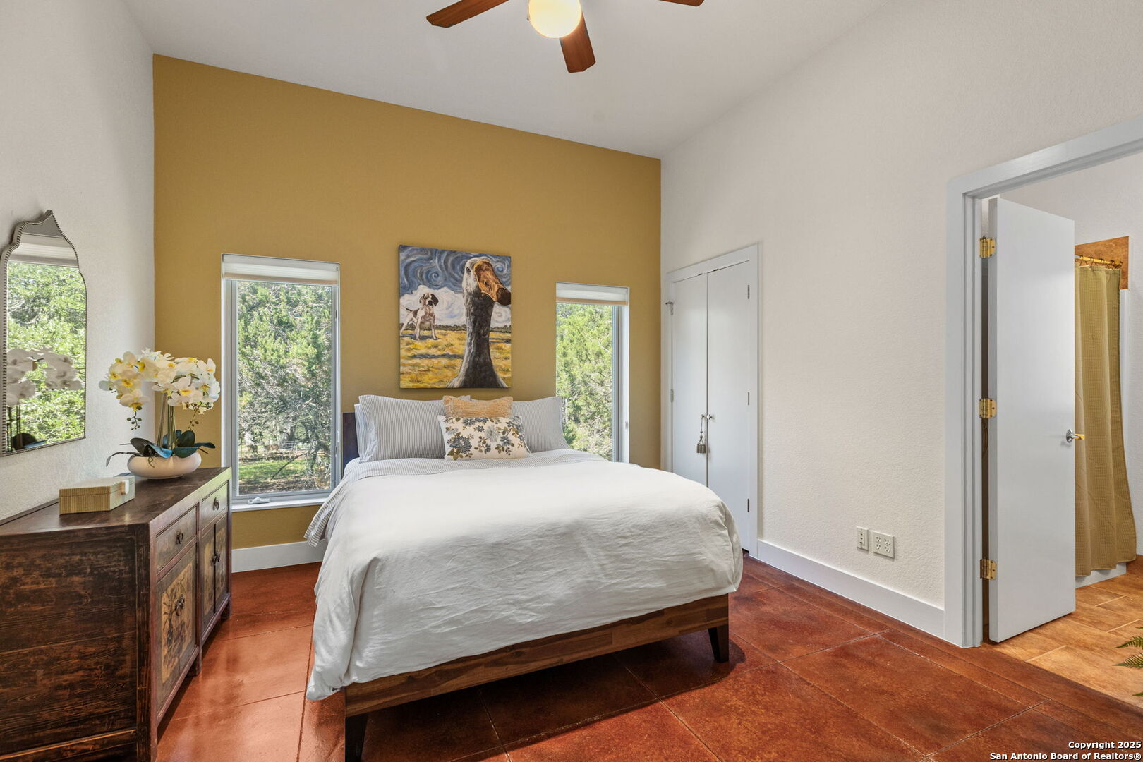 Mariposa House is a one-of-a-kind four-bedroom/four bath 3,721 square foot custom limestone exterior house on seven acres of enchanted forest teaming with wildlife in New Braunfels. Mariposa House is named for its custom butterfly sculpture with hundreds of butterflies suspended from the 20-foot kitchen ceiling. The centerpiece of this extraordinary home is its vast living area, with a wall of floor-to-ceiling windows providing a spectacular view of the property's forest and wildlife. A unique three-dimensional stucco woodburning fireplace adds warm charm to the living area space. His & her offices with floor-to-ceiling windows open onto the living area. Mariposa house's generous U-shape kitchen includes an enormous Island with a Black Pearl Granite countertop, stacked Upper Cabinets w/ Glass Fronts Lighting (52" Uppers), LG Refrigerator Conveys (French Door), Dacor 5 burner electric cooktop complete with an industrial vent soaring to the kitchen's 20-foot ceiling. The kitchen also features a workstation, extra deep kitchen sink, instant hot water spigot, a pantry w/custom built-in wine storage, and a breakfast bar. Mariposa House's primary bedroom opens onto a private patio facing the forest. The dedicated master bath includes a whirlpool bath and a separate large walk-in shower. His and her closets adjoin the master bath. An oversized 80-gallon water heater with circulation pump, dedicated to the primary living residence, assures a virtually endless supply of hot water. Mariposa House's east wing guest section includes three guest rooms with dedicated baths. The east wing comes complete with its own independent heat pump, Nest smart thermostat, and water heater. Mariposa House is a very special home, built for very special people! GENERAL AND KITCHEN FEATURES: Solid wood 4x8 leaded glass entry door, Scored stained concrete throughout, Porcelain tile in baths, Large picture windows, Oak tongue in groove ceiling in common areas, All Limestone exterior, Derbigum Roof, Double sided stucco wood burning fireplace, Ample closet space throughout home, His & hers custom closets in master bath, All wood custom cabinets, Whirlpool tub in master bath, Separate master bath large walk-in shower with rain showerhead & handheld sprayer, Large U-shape kitchen with enormous island and 20' ceiling, Black Pearl Granite countertop, LG refrigerator conveys (French door), Dacor 5 burner electric cooktop, Stacked upper cabinets w/ glass fronts & lighting (52" uppers), Workstation extra deep kitchen sink, Instant hot water spigot, Pantry w/ custom built-in wine storage, Breakfast bar, Pull out trash, mixer lift, pull out shelves, spice pull-out, 8 x 7.5 Greenhouse, 3 separate heat pumps with Nest smart thermostats, Tesla charger, One Car Garage, Two separate water heaters - 80 gallons for master bath and kitchen, plus 80 gallons for east wing guest quarters, LG washer and dryer, Backyard fountain with autofill, ADT alarm system with Nest front door camera - remote app accessible, Remington TS26-45 26-gun safe with enclosure, Front door keypad lock - remote app accessible, Verizon mobile signal booster with directional antenna, Aerated septic system, ADDITIONAL INTERIOR FEATURES: His & hers offices with custom cabinetry & shelving, Laundry room w/ 52" uppers & sink, Mud area, Pleated shade window coverings for all bedrooms & baths, Built-in bookshelves in primary bedroom & guest room, Jack & Jill guest bathroom with stand up shower, Heaters & night lights in all baths, 1x3 & 1x5 flat stock trim, Patio space @ primary bedroom, Common areas, Can lighting throughout.