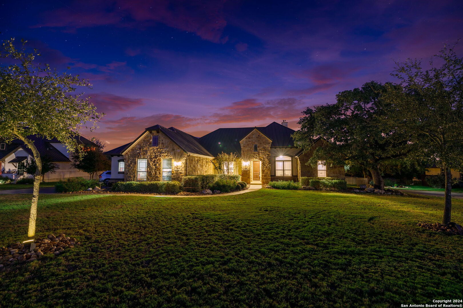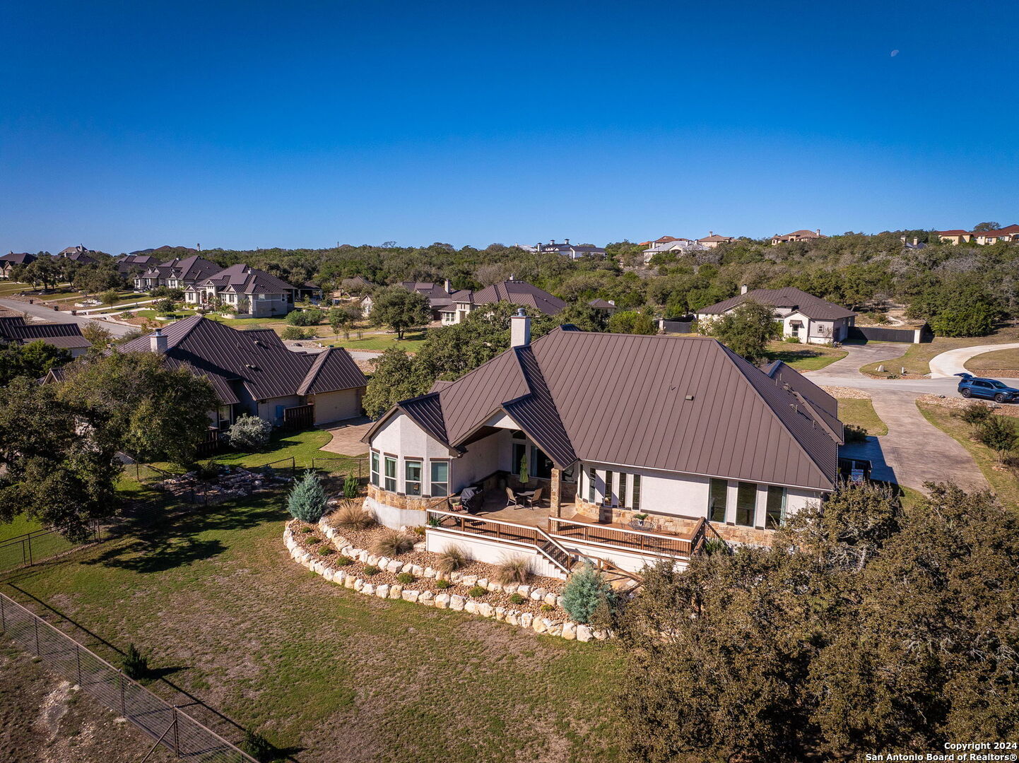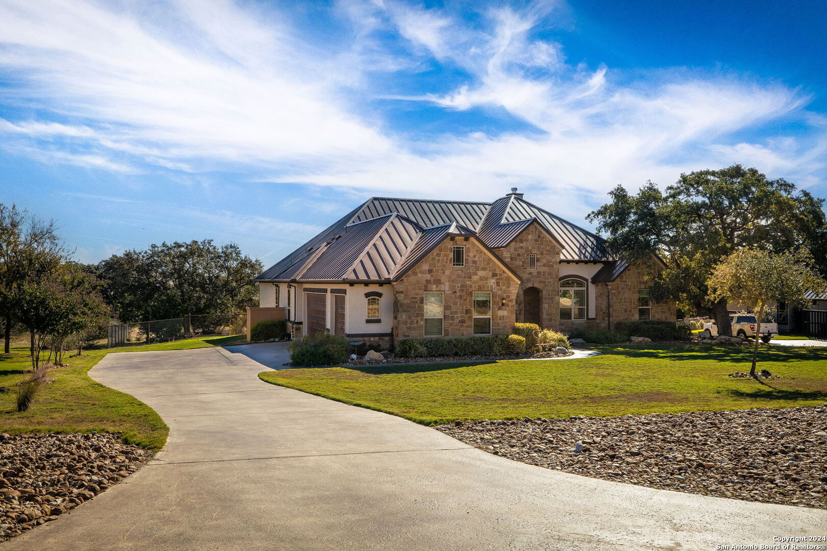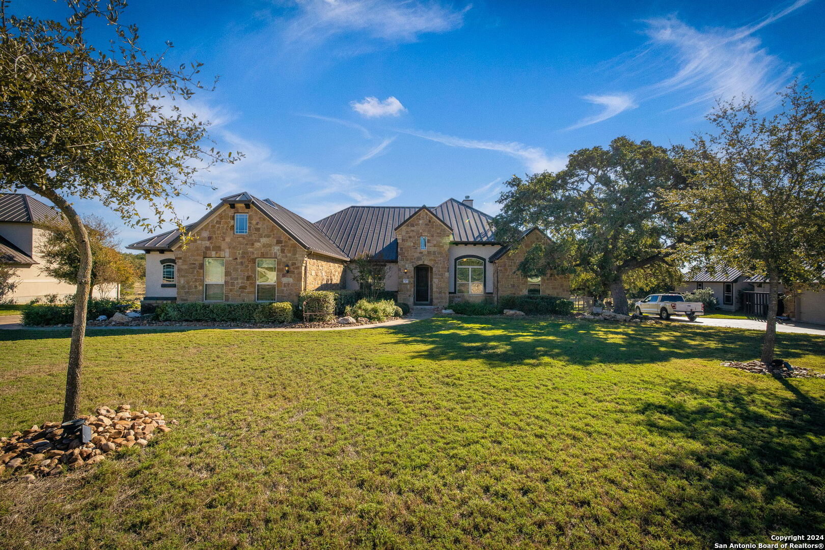 This stunning 4-bedroom, 3.5-bath home in Copper Ridge, is a true standout with its stone and stucco exterior and eye-catching metal roof. Nestled in the guard gated community of Copper Ridge with great amenities, this property combines security with a vibrant lifestyle. Inside, the thoughtful one-story layout offers a dedicated office space, a formal dining room, and an abundance of natural light. The spacious game room is perfect for entertaining, while built-in bookcases and a cozy fireplace add warmth and character to the living area. The gourmet kitchen, featuring a large island, provides ample storage and seamlessly connects to the open-concept living area. Step out onto the covered patio to take in the peaceful Hill Country views, a perfect backdrop for enjoying your morning coffee or unwinding in the evening. With its exceptional design plan, functional spaces, and scenic surroundings, this home offers everything you need for comfortable and refined living.