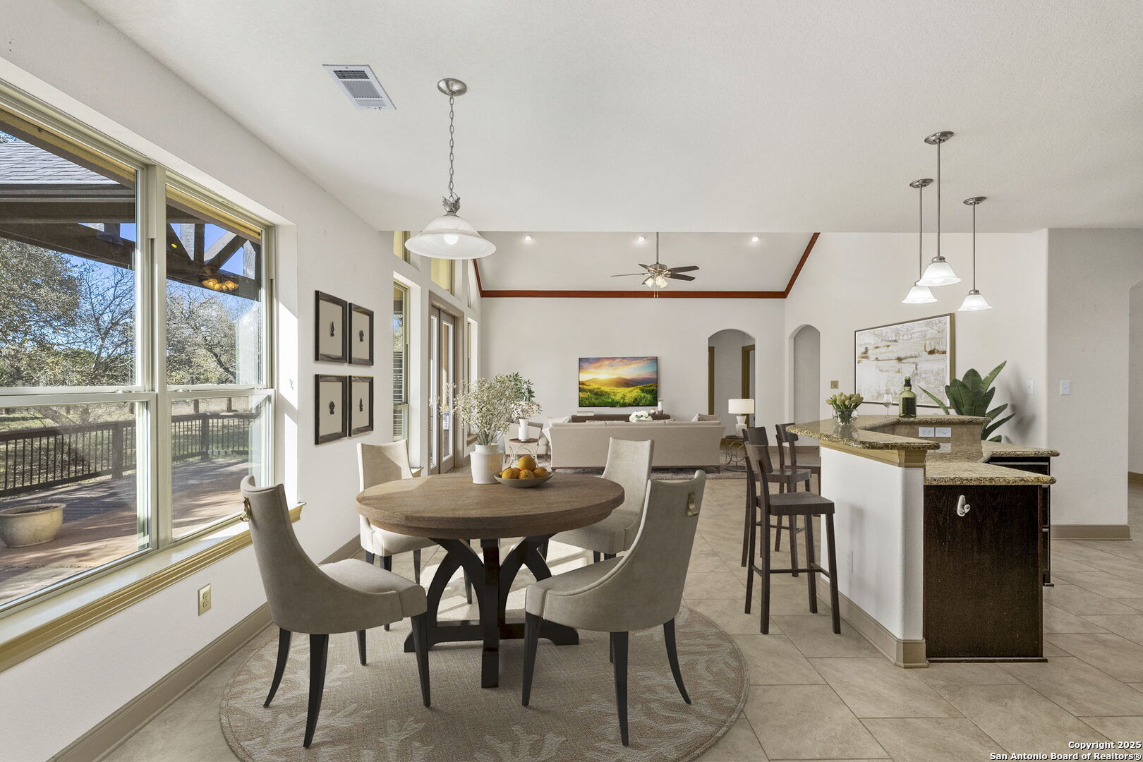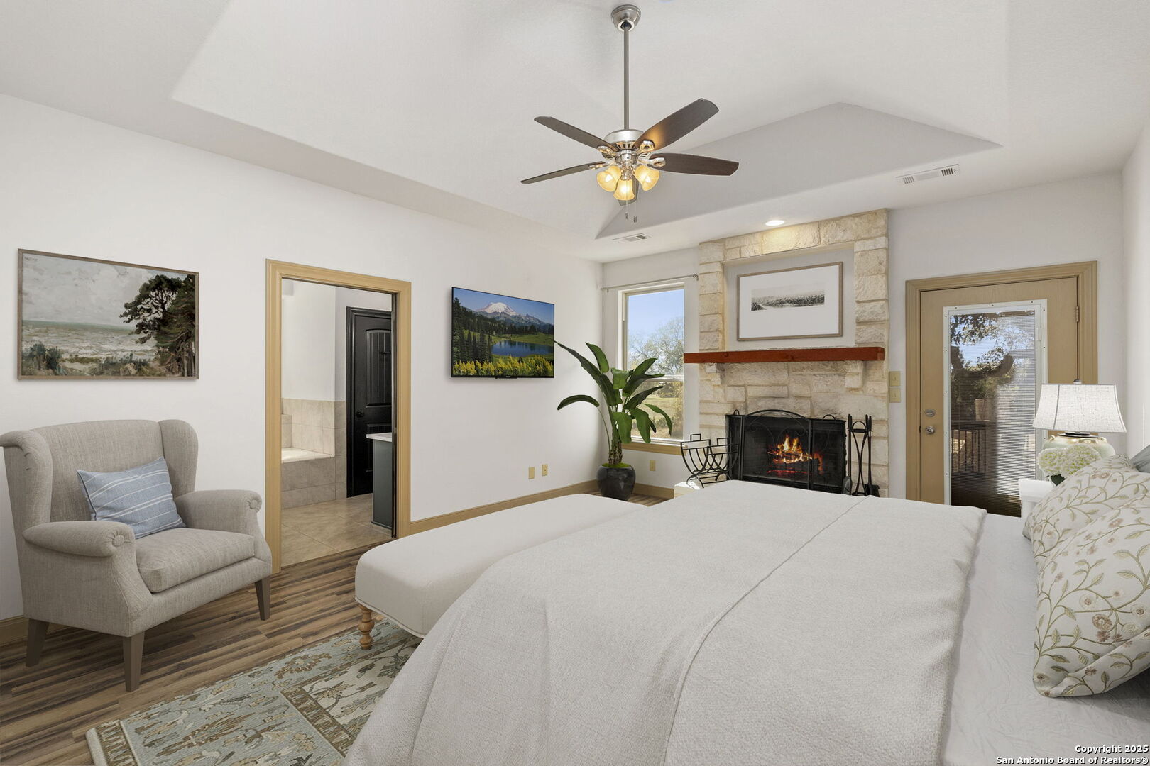 ***Motivated seller, Rate Buy Down Options or Seller Concessions available.*** Tucked away on over 2 acres in a gated community, this immaculate 3-bedroom, 2.5-bathroom one-story home blends refined finishes with peaceful Hill Country surroundings. A vaulted wood beam ceiling and expansive picture window bring light and warmth into the open-concept living area, while recessed lighting and high-end details elevate every corner of the home. The gourmet kitchen is designed to impress, featuring granite countertops, a center island, stainless steel appliances, double ovens, gas cooking, pendant lighting, 42" cabinets, and a walk-in pantry. A formal dining area adds elegance and space for hosting. In the primary suite, enjoy your own retreat with a stone fireplace, jetted garden tub, dual showerheads, makeup vanity, and walk-in closet. Secondary bedrooms are generously sized and offer flexibility for household members, guests, or a home office. Step outside to a gated backyard oasis complete with an oversized covered deck, mature trees, a 12' x 16' shed, and gas line for grilling. Additional perks include a mini-split system in the garage, water softener, and oversized garage for all your storage needs. Located in a quiet, gated neighborhood with pond access and private scenic entry to Medina River, this home offers the best of Texas Hill Country living just minutes from the Bandera. Schedule your private showing and experience this luxury country retreat for yourself! Mini split in the garage, water softener and storage unit in the back yard will convey.