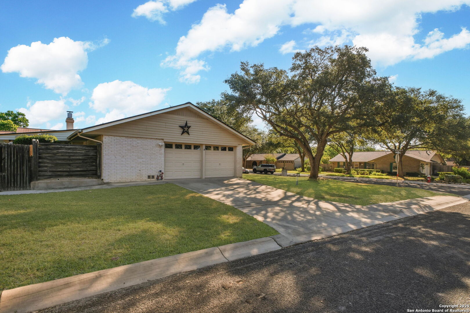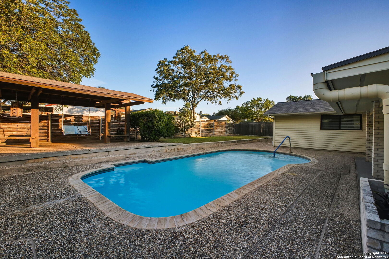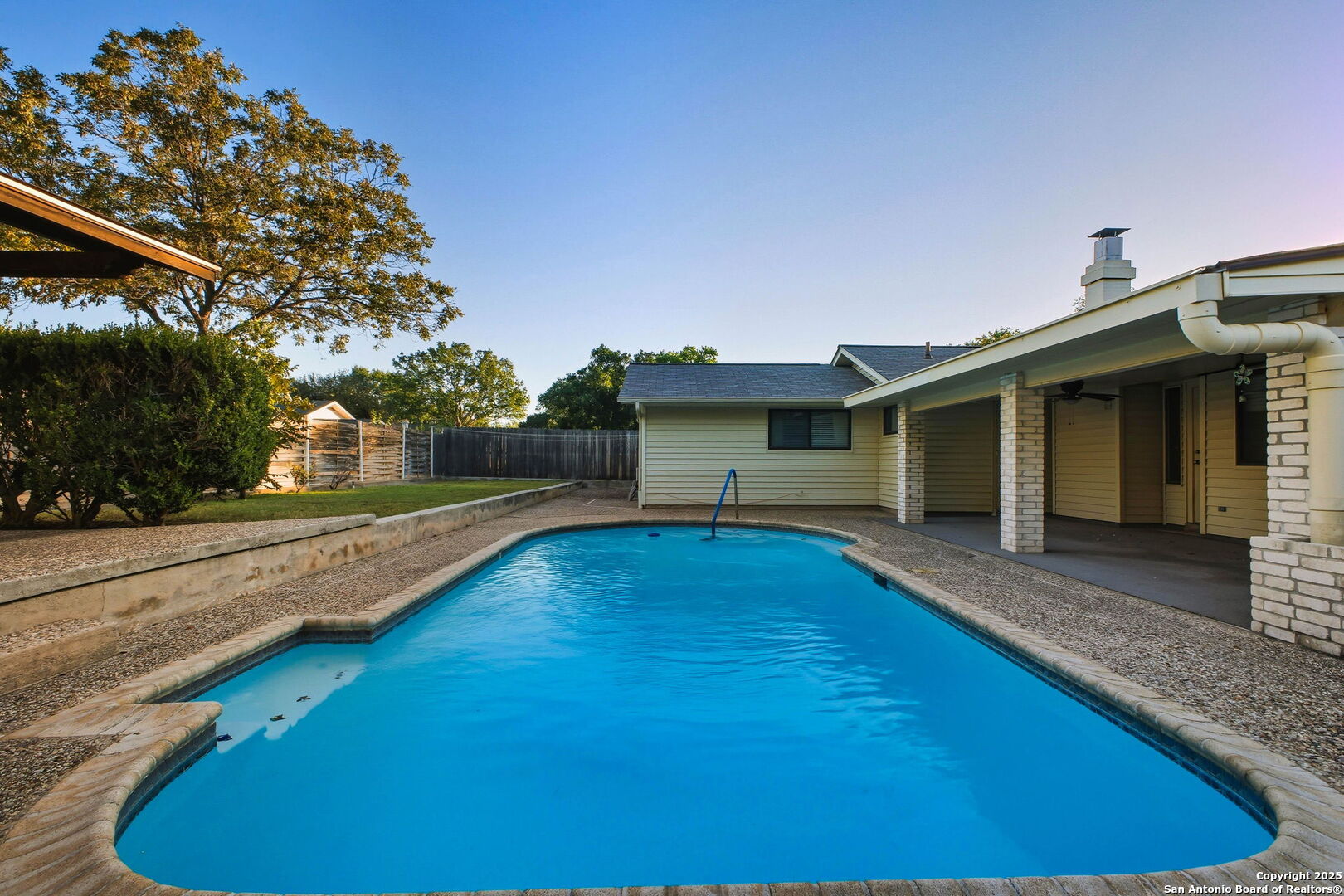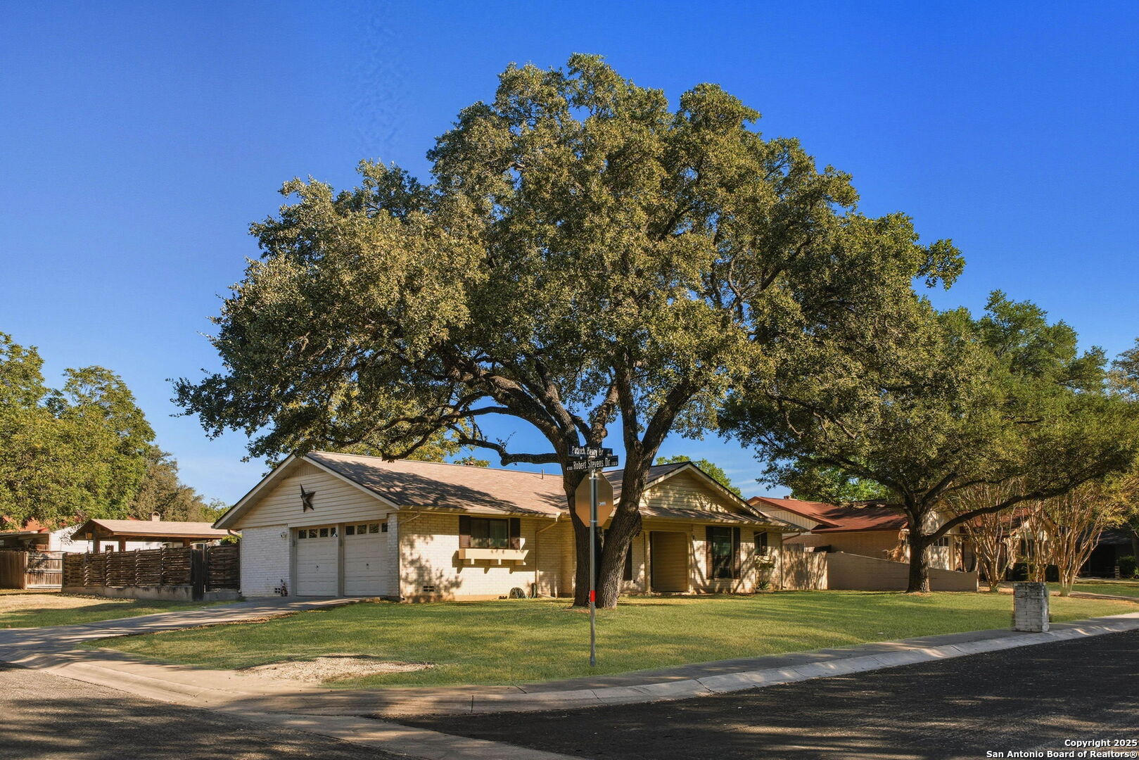 OPEN HOUSE: Saturday, Oct 18 * 1-4 PM and Sunday, Oct 19 * 12-3 PM This meticulously maintained single-story ranch sits on a spacious corner lot with a side-entry two-car garage and extra storage. Inside, you'll find four bedrooms, a large living room, and two dining areas-including a separate formal dining room. The vaulted living room with a cozy wood-burning fireplace is perfect for entertaining. Enjoy charming architectural details like wood beams and arched entryways leading to the dining room and private study/office both with new laminate flooring. Step out back to your own outdoor oasis featuring a gazebo next to a sparkling clean pool, sprinkler system, covered patio with new ceiling fans. If you're handy, you'll love the two sheds-one equipped with workbenches and power for your projects. You'll appreciate the fact that this has a diving POOL and NO HOA. Located in highly rated SCUCISD, and just minutes from JBSA Randolph and JBSA Fort Sam Houston, shopping, and dining. Don't miss it-schedule your showing today! Tons of potential here!