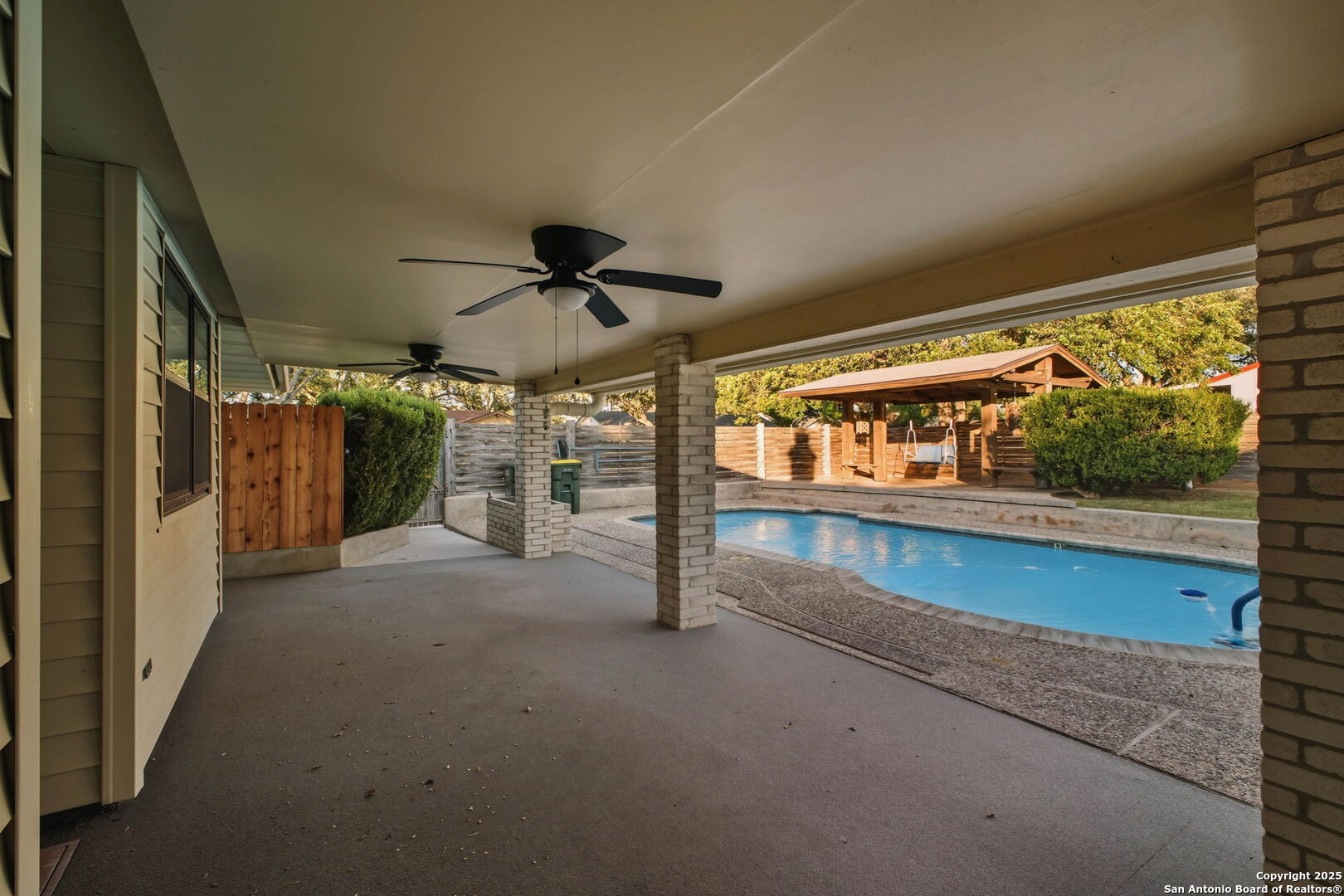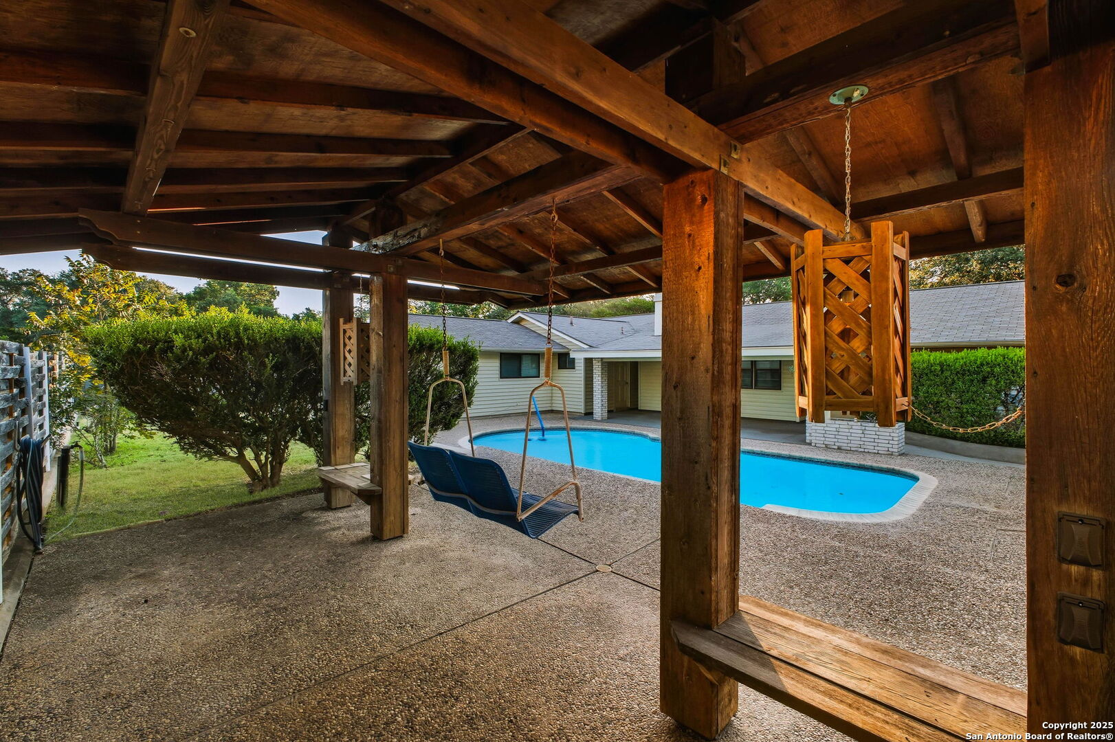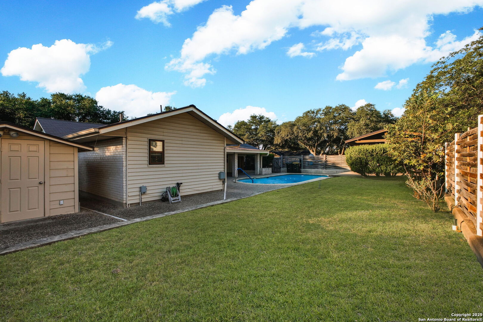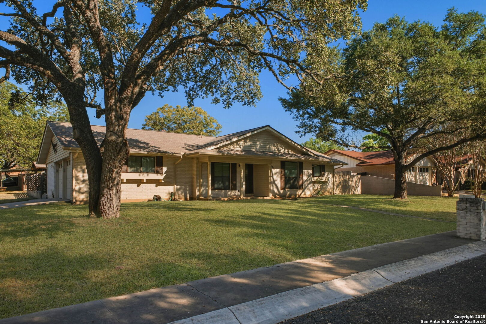 OPEN HOUSE: Saturday, Oct 18 * 1-4 PM and Sunday, Oct 19 * 12-3 PM This meticulously maintained single-story ranch sits on a spacious corner lot with a side-entry two-car garage and extra storage. Inside, you'll find four bedrooms, a large living room, and two dining areas-including a separate formal dining room. The vaulted living room with a cozy wood-burning fireplace is perfect for entertaining. Enjoy charming architectural details like wood beams and arched entryways leading to the dining room and private study/office both with new laminate flooring. Step out back to your own outdoor oasis featuring a gazebo next to a sparkling clean pool, sprinkler system, covered patio with new ceiling fans. If you're handy, you'll love the two sheds-one equipped with workbenches and power for your projects. You'll appreciate the fact that this has a diving POOL and NO HOA. Located in highly rated SCUCISD, and just minutes from JBSA Randolph and JBSA Fort Sam Houston, shopping, and dining. Don't miss it-schedule your showing today! Tons of potential here!