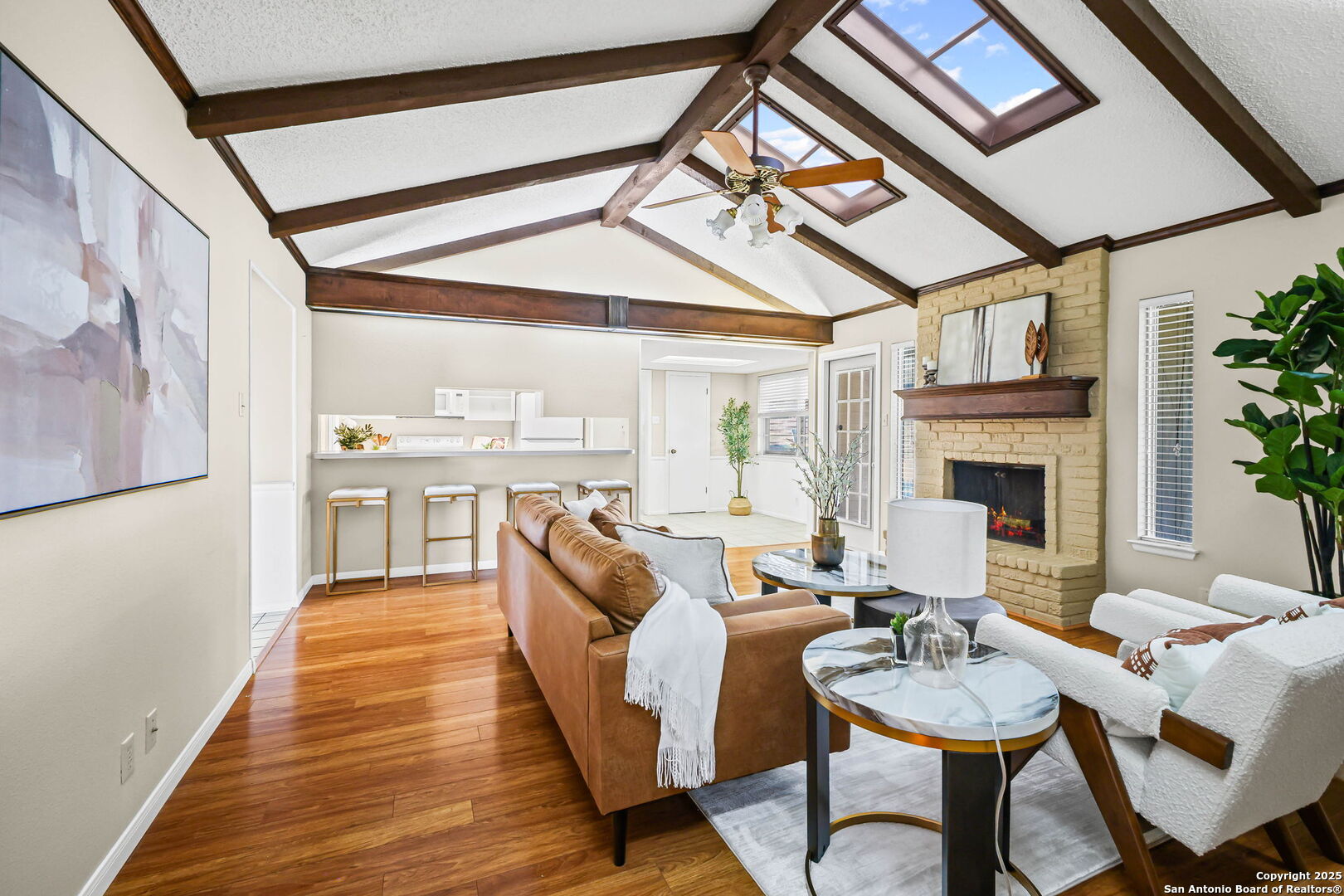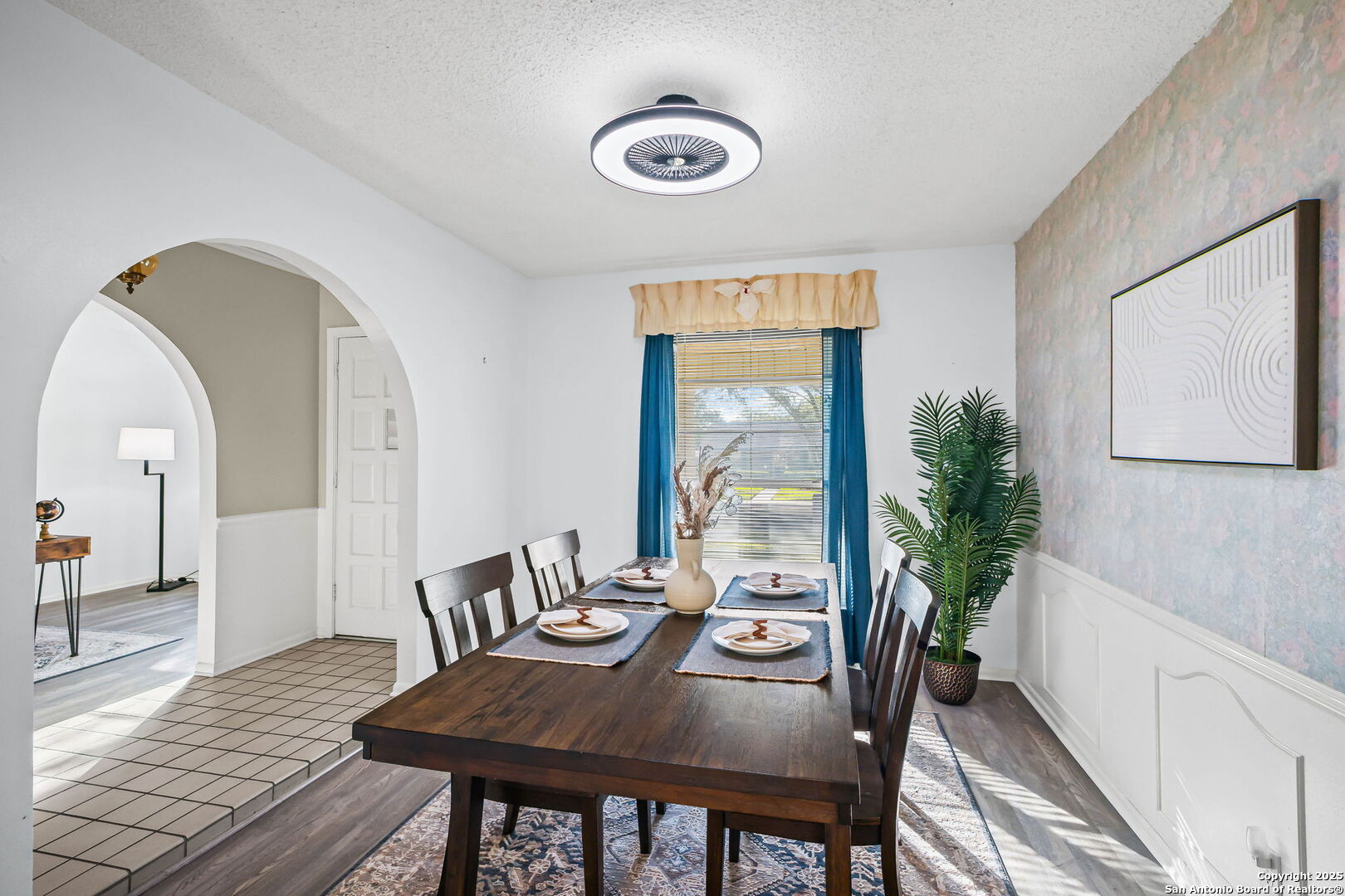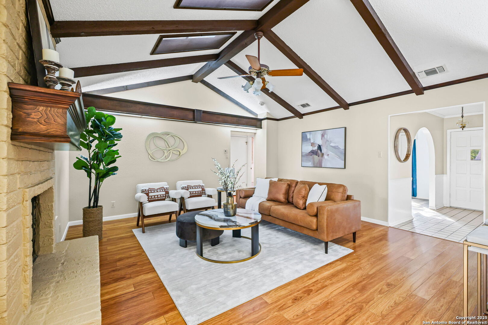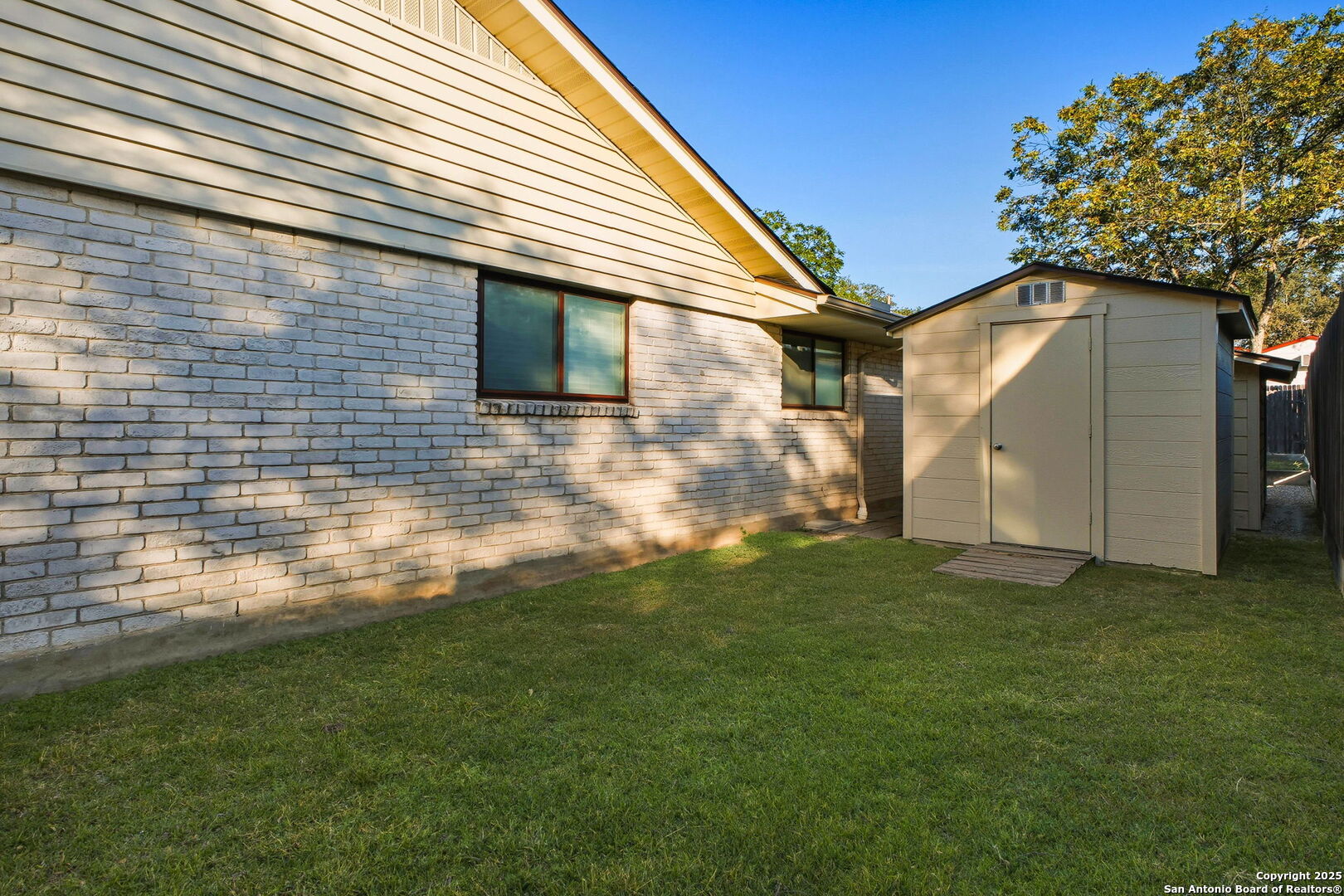 OPEN HOUSE: Saturday, Oct 18 * 1-4 PM and Sunday, Oct 19 * 12-3 PM This meticulously maintained single-story ranch sits on a spacious corner lot with a side-entry two-car garage and extra storage. Inside, you'll find four bedrooms, a large living room, and two dining areas-including a separate formal dining room. The vaulted living room with a cozy wood-burning fireplace is perfect for entertaining. Enjoy charming architectural details like wood beams and arched entryways leading to the dining room and private study/office both with new laminate flooring. Step out back to your own outdoor oasis featuring a gazebo next to a sparkling clean pool, sprinkler system, covered patio with new ceiling fans. If you're handy, you'll love the two sheds-one equipped with workbenches and power for your projects. You'll appreciate the fact that this has a diving POOL and NO HOA. Located in highly rated SCUCISD, and just minutes from JBSA Randolph and JBSA Fort Sam Houston, shopping, and dining. Don't miss it-schedule your showing today! Tons of potential here!