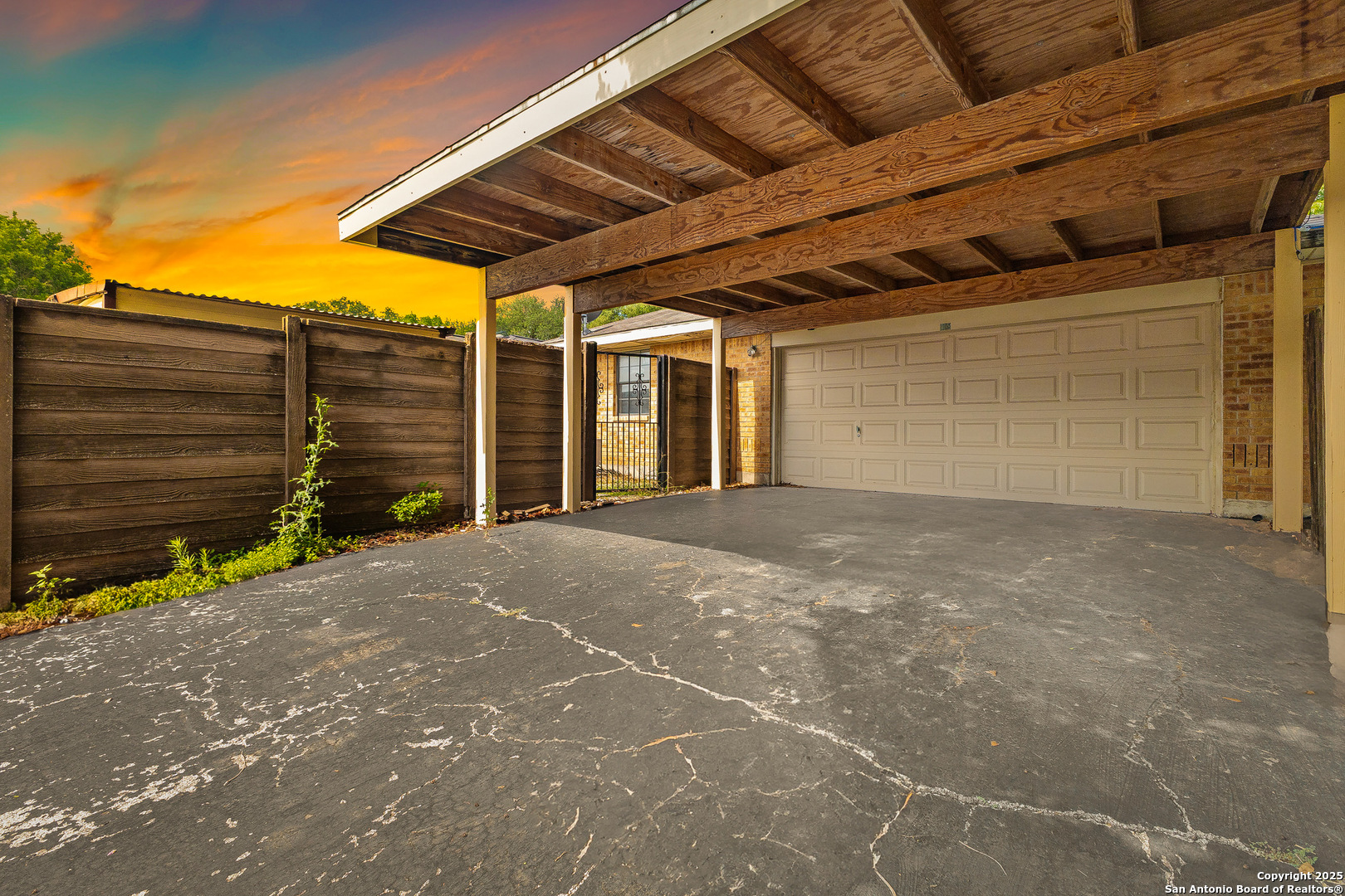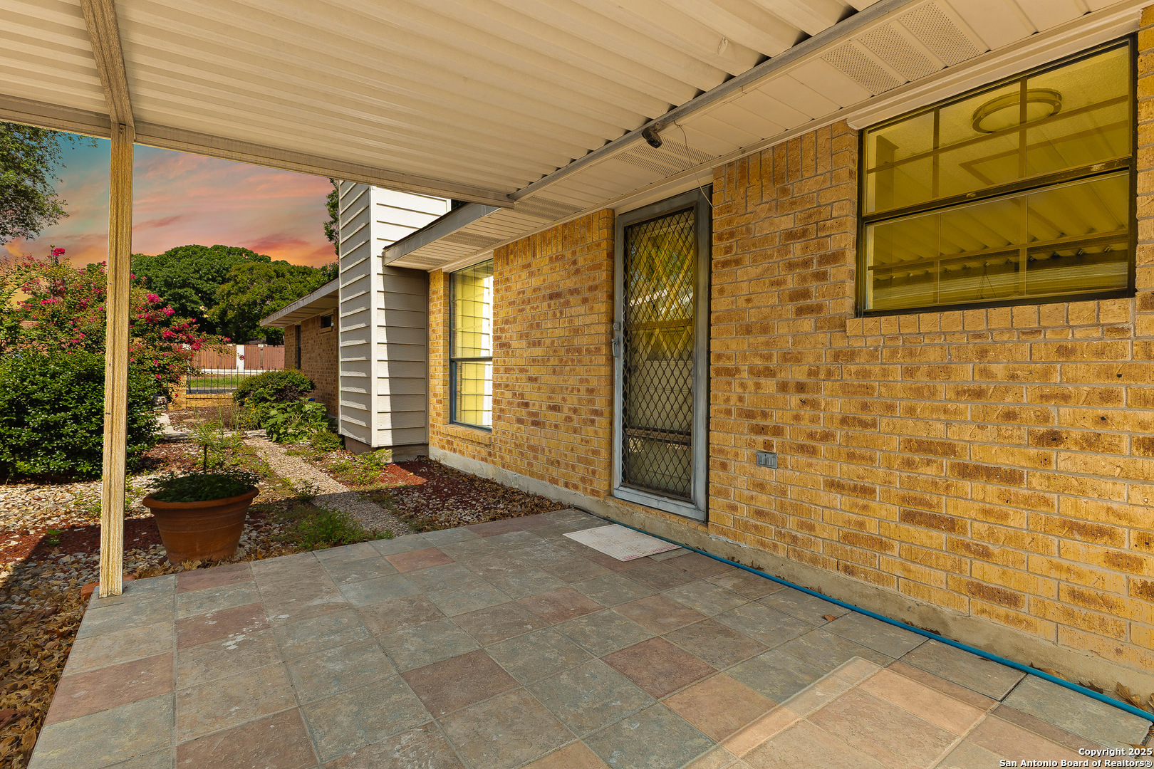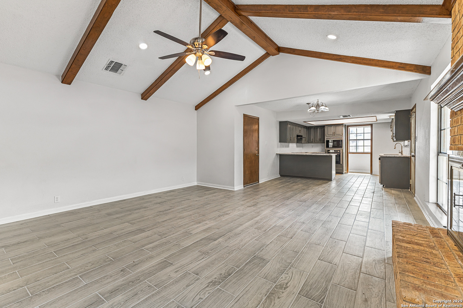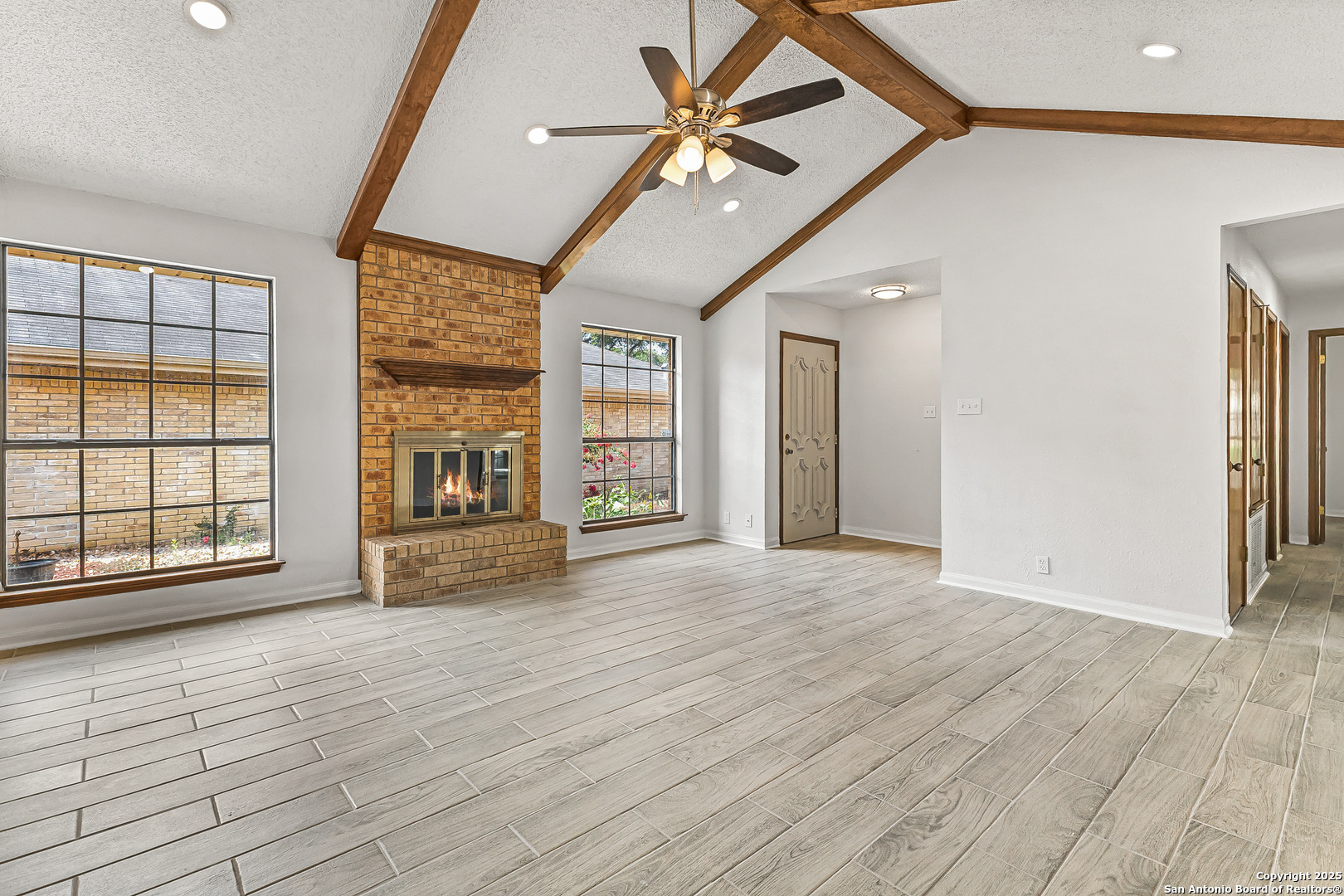 Step into this charming and unique home in the heart of Schertz, offering no carpet and easy-to-maintain landscaping. The open-concept floor plan features ceramic tile flooring throughout, creating a clean and cohesive look. Enjoy soaring ceilings with rustic wood beams and a cozy wood-burning fireplace that anchors the spacious living area. The primary suite includes a skylight and a private atrium-an ideal space to unwind with a good book or morning coffee. Located just minutes from I-35, Randolph AFB, and local shopping, this home is nestled in a quiet, established community with no HOA-a rare find in such a convenient location.
