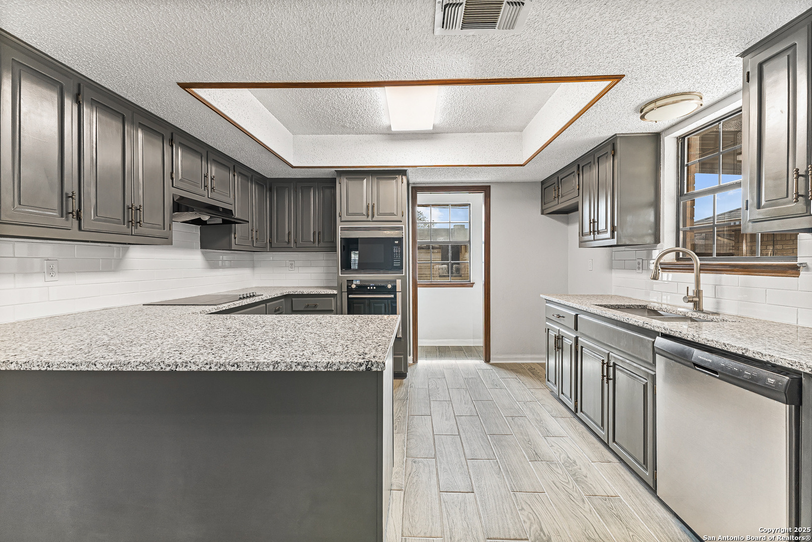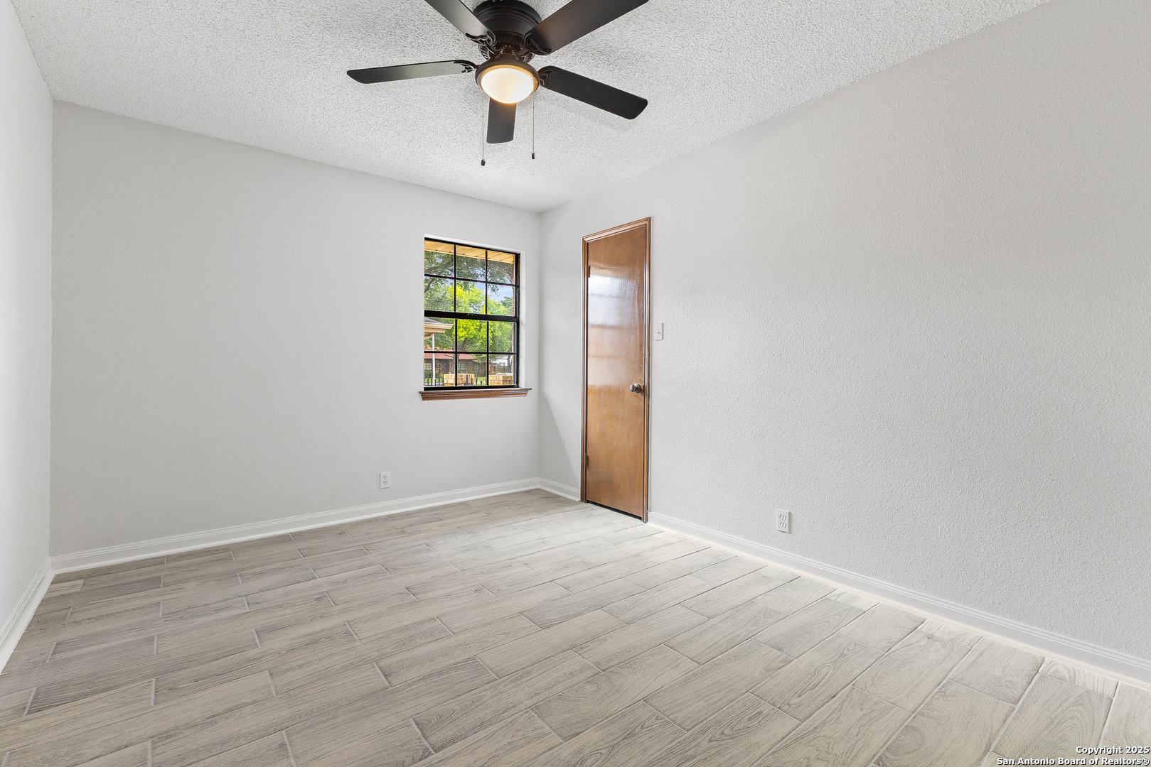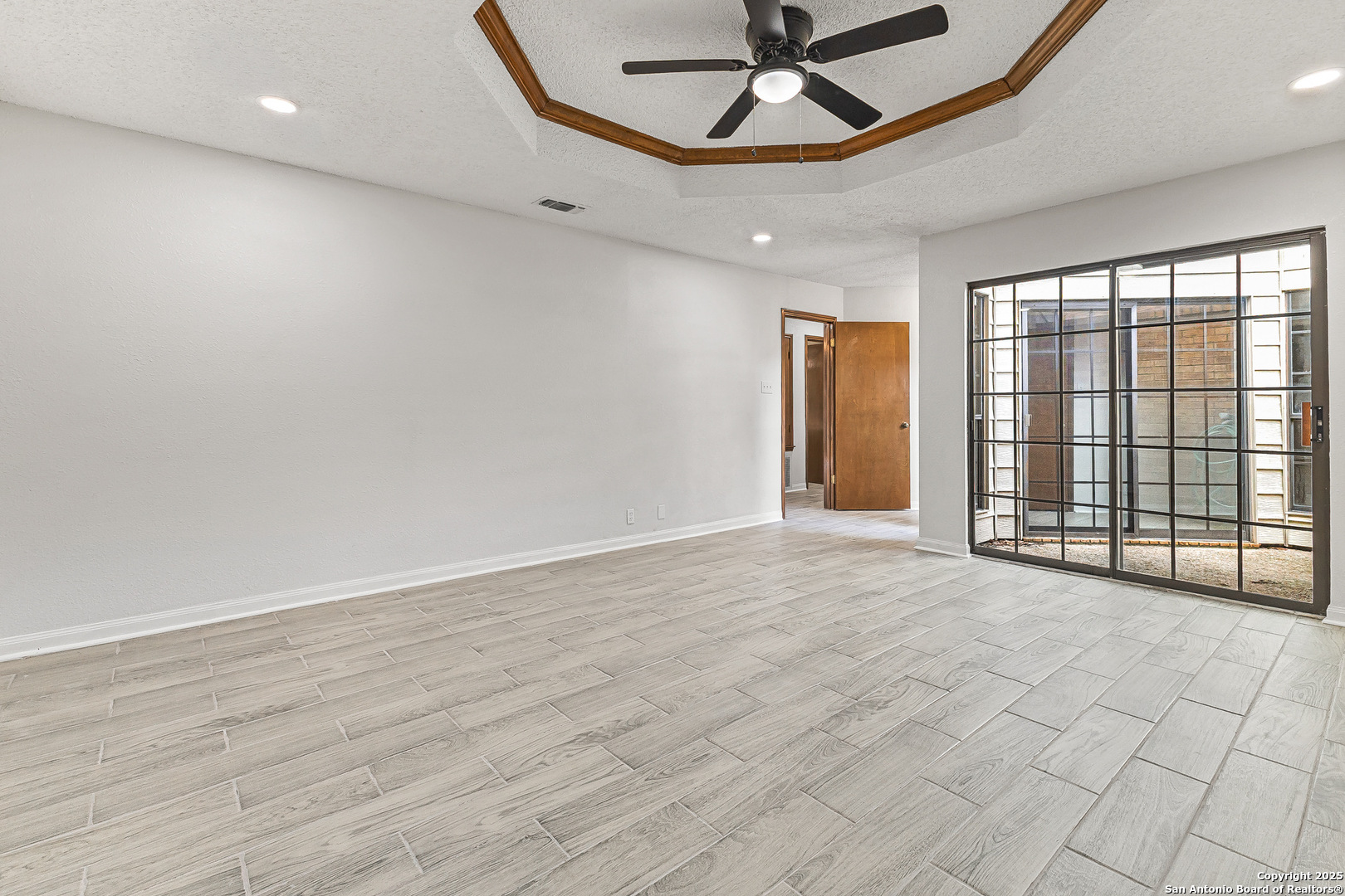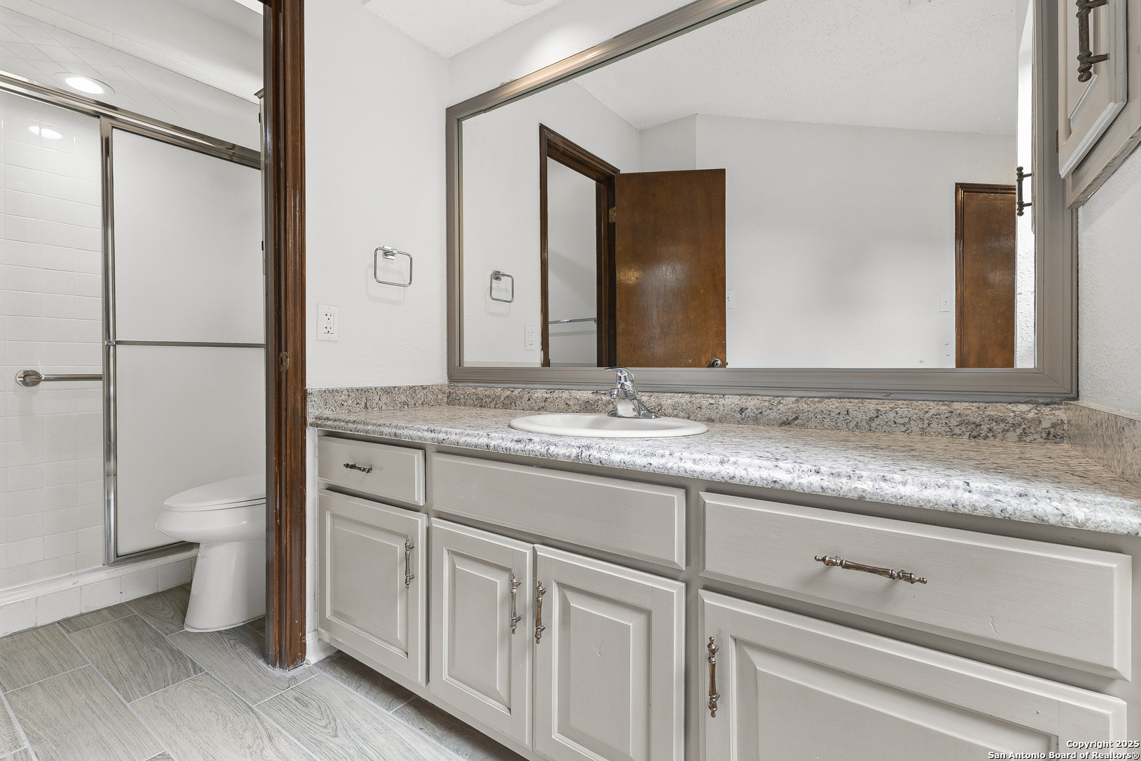 Step into this charming and unique home in the heart of Schertz, offering no carpet and easy-to-maintain landscaping. The open-concept floor plan features ceramic tile flooring throughout, creating a clean and cohesive look. Enjoy soaring ceilings with rustic wood beams and a cozy wood-burning fireplace that anchors the spacious living area. The primary suite includes a skylight and a private atrium-an ideal space to unwind with a good book or morning coffee. Located just minutes from I-35, Randolph AFB, and local shopping, this home is nestled in a quiet, established community with no HOA-a rare find in such a convenient location.