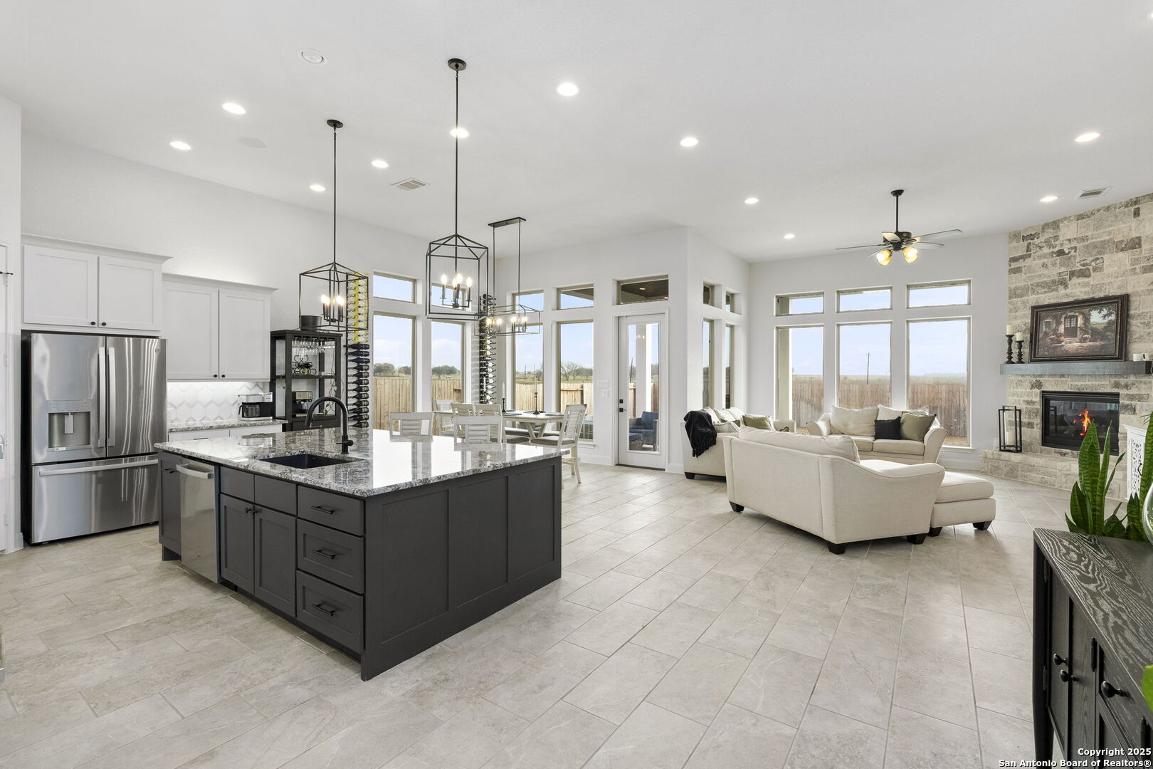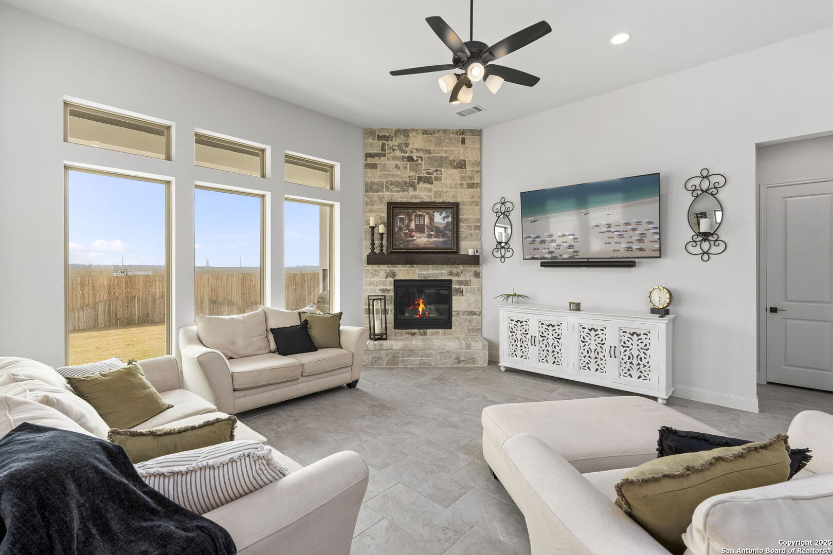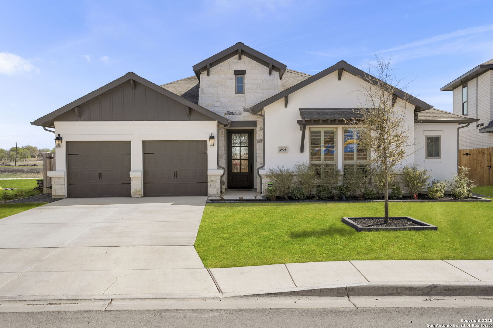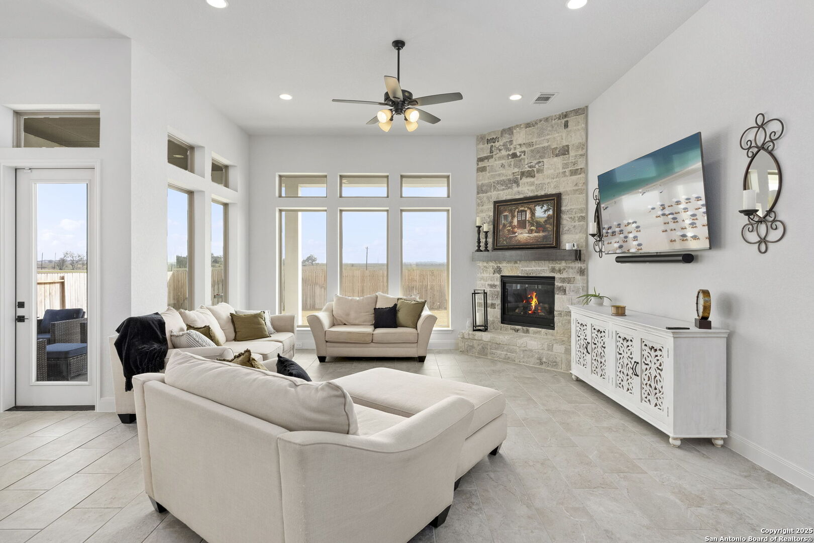 Built in 2024 by Perry Homes, this stunning 2,987 sq. ft. residence offers modern luxury and thoughtful design. Step into a grand entryway that sets the tone for this spacious home, featuring a dedicated media room complete with a projector and screen. The chef's kitchen is a culinary dream, boasting double ovens, granite countertops, a breakfast bar, and ample storage. It seamlessly opens to the dining area and living room, where a butler's bar and a striking white rock gas fireplace create a warm and inviting ambiance. Large windows flood the space with natural light while offering serene views of the country greenbelt. The primary suite is a true retreat, with an en suite bathroom featuring a garden tub, an oversized walk-in shower with a bench, a double vanity, and multiple closets-one of which conveniently connects to the utility room with additional storage. Perfect for multi-generational living or guests, one of the secondary bedrooms includes a private en suite bathroom. Two additional bedrooms share a Jack-and-Jill bathroom, ensuring comfort and privacy for all. Enjoy outdoor living on the extended covered patio, ideal for entertaining or relaxing as you take in breathtaking sunsets. Located in the highly sought-after Navarro ISD and conveniently positioned near I-10 and Hwy 46, this home offers easy access to both Seguin and New Braunfels. Plus, the 2-year and 10-year builder's warranties are still in place for added peace of mind. Don't miss this exceptional opportunity-schedule your showing today!