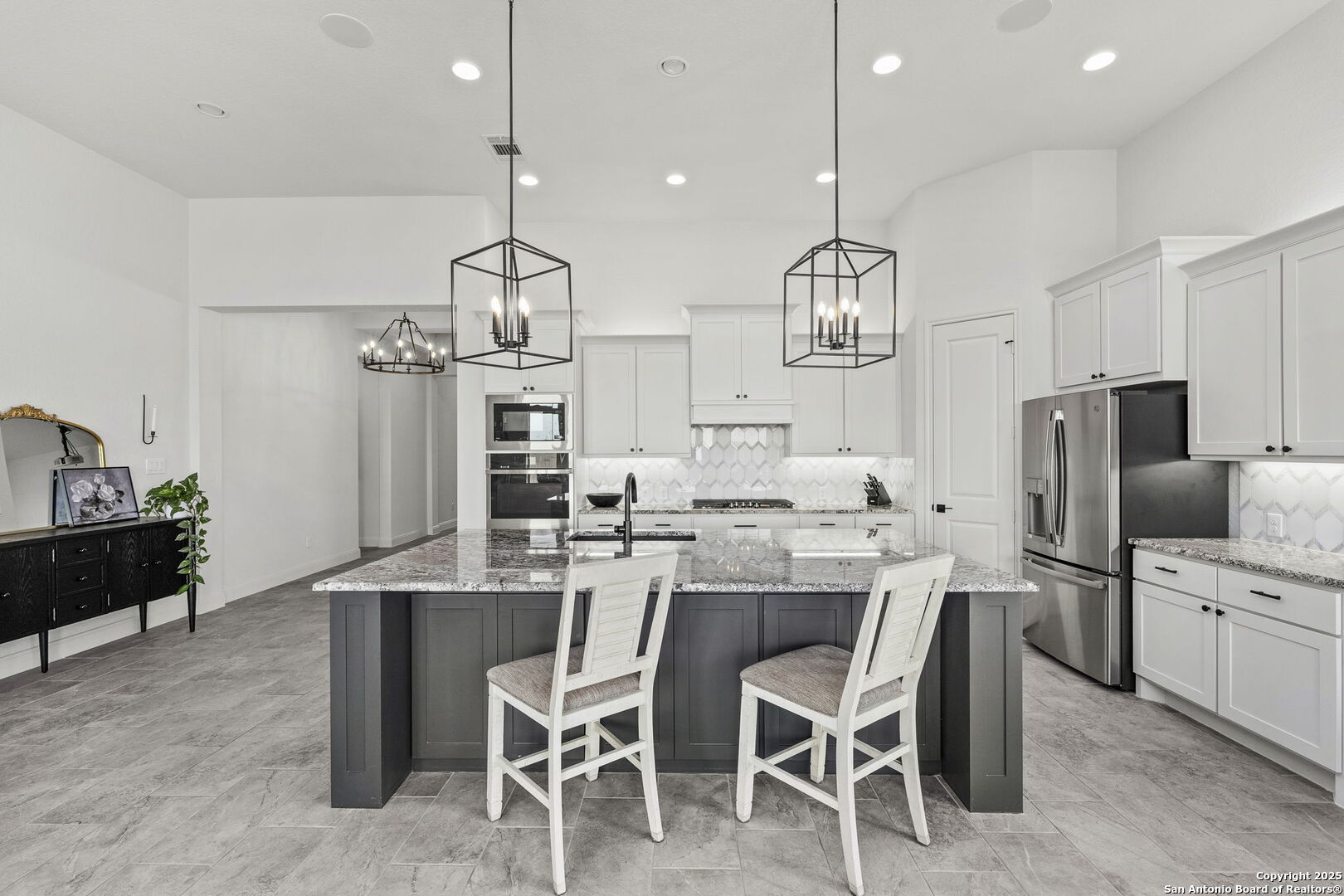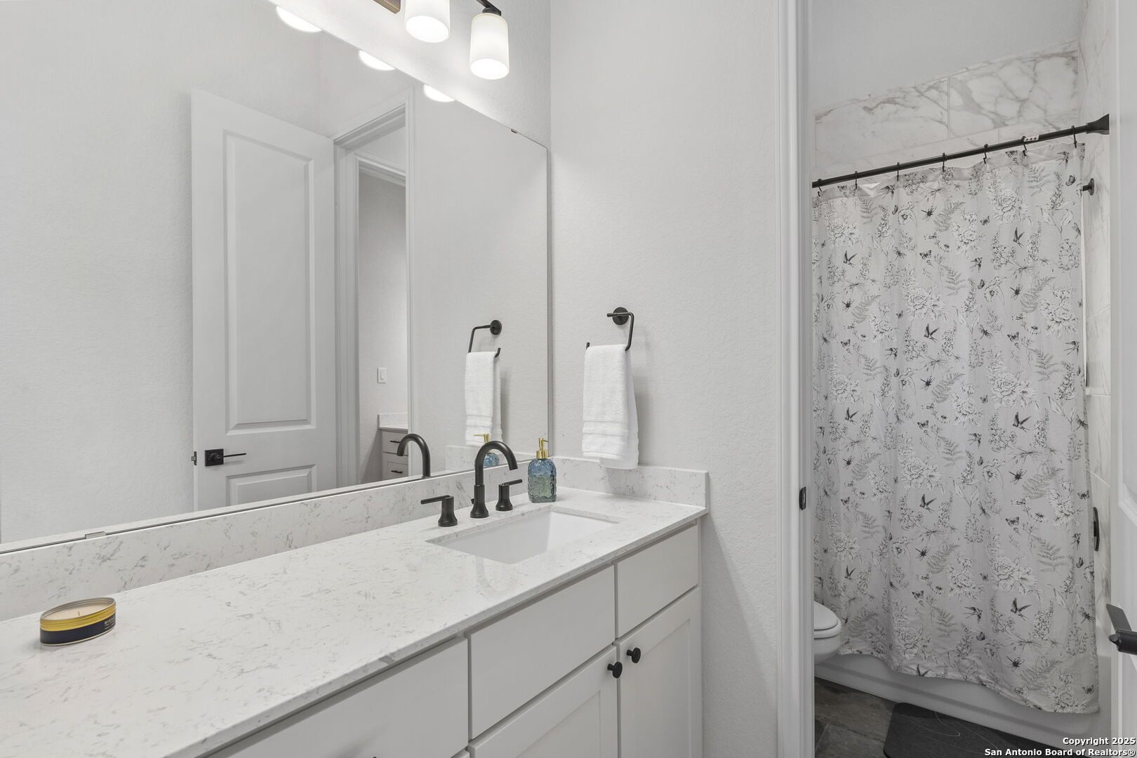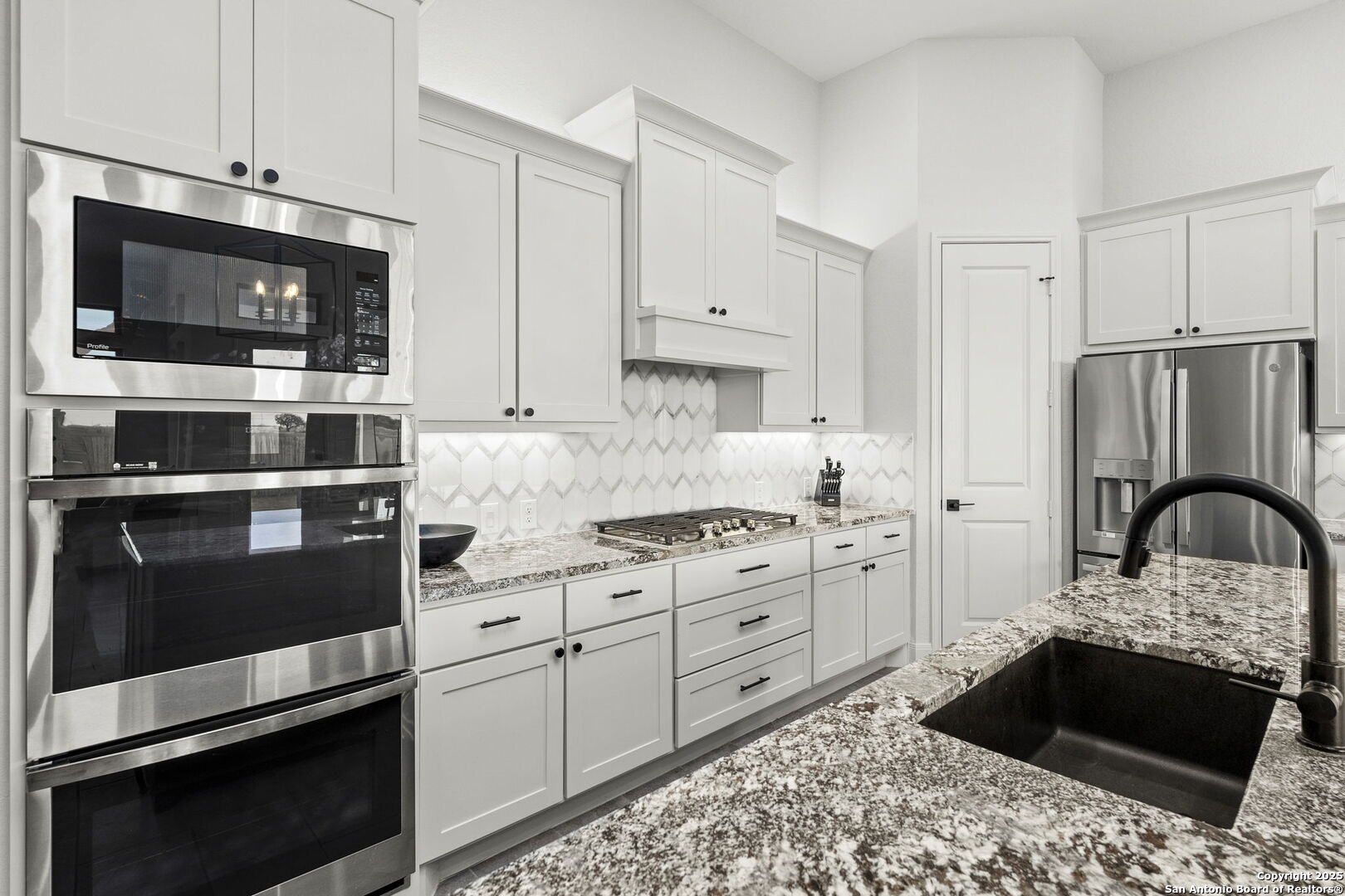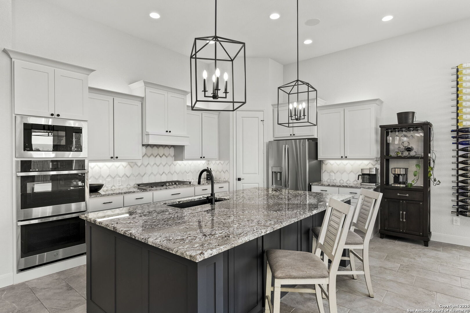 Built in 2024 by Perry Homes, this stunning 2,987 sq. ft. residence offers modern luxury and thoughtful design. Step into a grand entryway that sets the tone for this spacious home, featuring a dedicated media room complete with a projector and screen. The chef's kitchen is a culinary dream, boasting double ovens, granite countertops, a breakfast bar, and ample storage. It seamlessly opens to the dining area and living room, where a butler's bar and a striking white rock gas fireplace create a warm and inviting ambiance. Large windows flood the space with natural light while offering serene views of the country greenbelt. The primary suite is a true retreat, with an en suite bathroom featuring a garden tub, an oversized walk-in shower with a bench, a double vanity, and multiple closets-one of which conveniently connects to the utility room with additional storage. Perfect for multi-generational living or guests, one of the secondary bedrooms includes a private en suite bathroom. Two additional bedrooms share a Jack-and-Jill bathroom, ensuring comfort and privacy for all. Enjoy outdoor living on the extended covered patio, ideal for entertaining or relaxing as you take in breathtaking sunsets. Located in the highly sought-after Navarro ISD and conveniently positioned near I-10 and Hwy 46, this home offers easy access to both Seguin and New Braunfels. Plus, the 2-year and 10-year builder's warranties are still in place for added peace of mind. Don't miss this exceptional opportunity-schedule your showing today!
