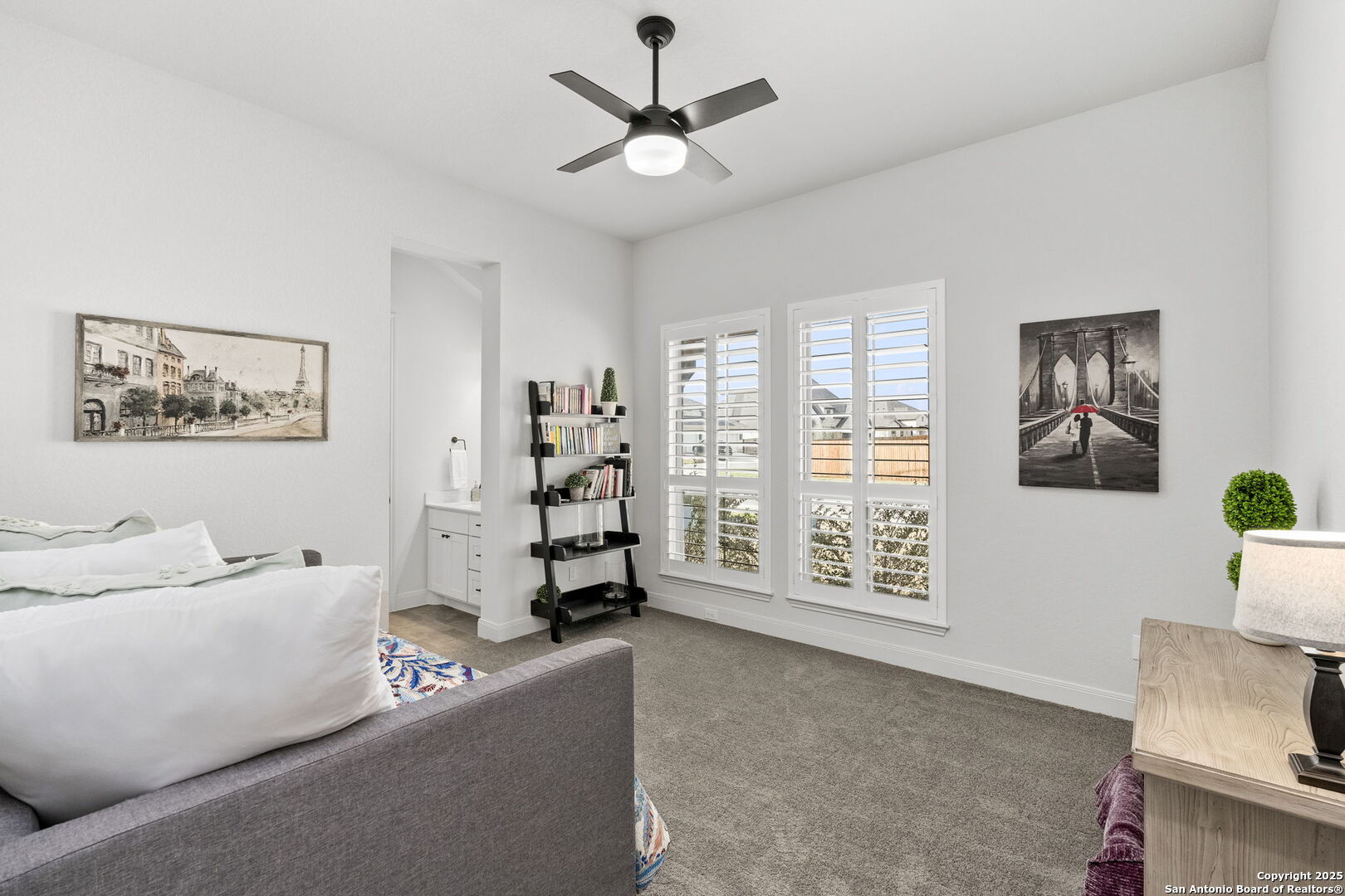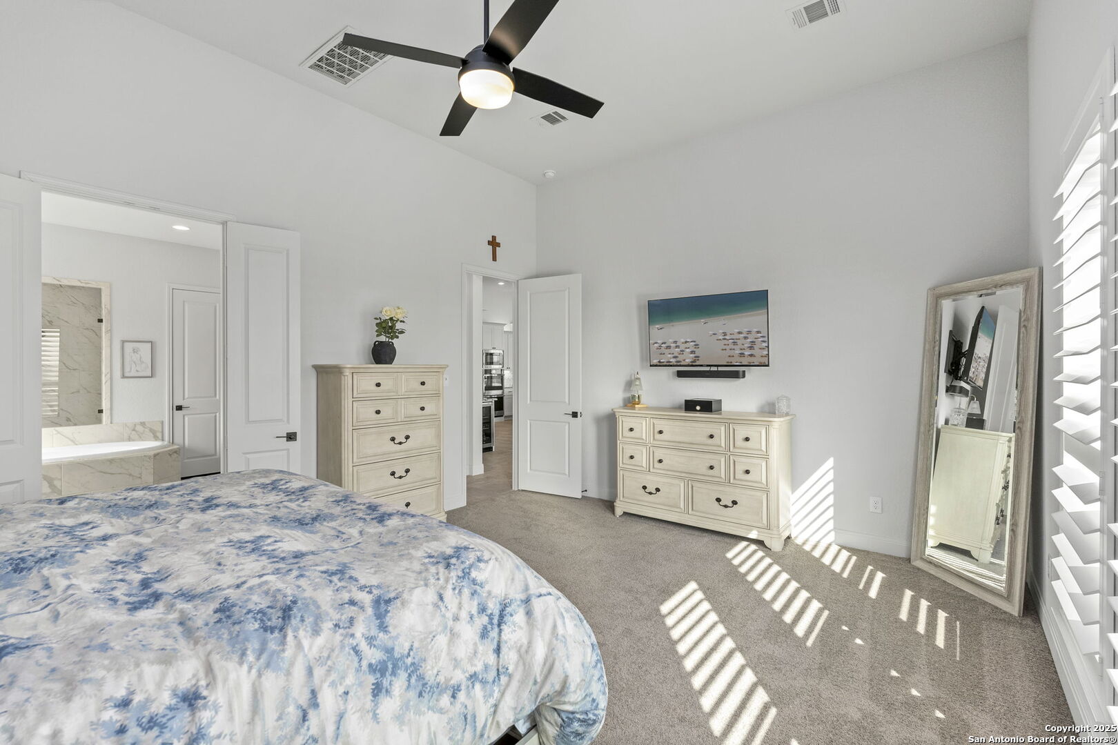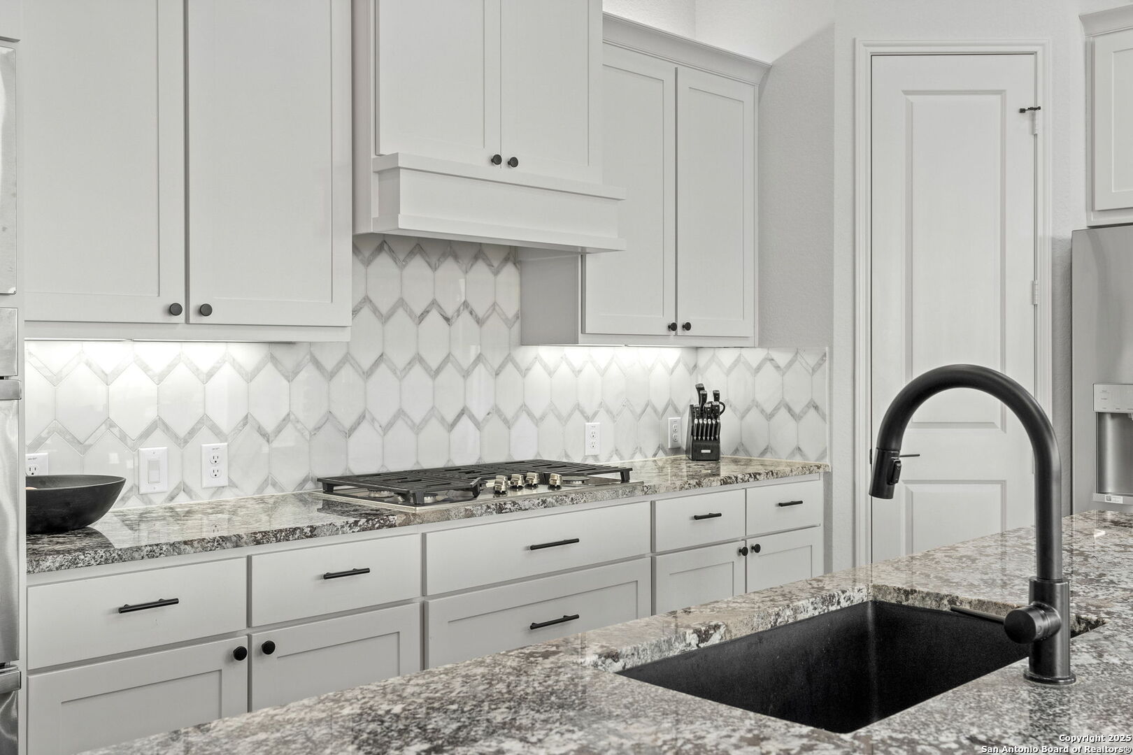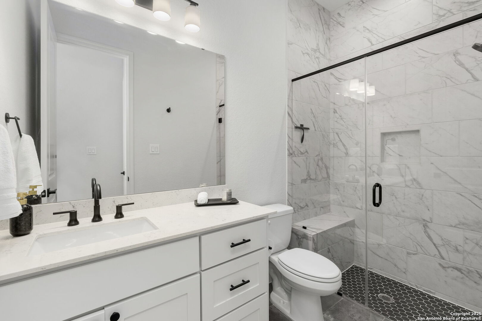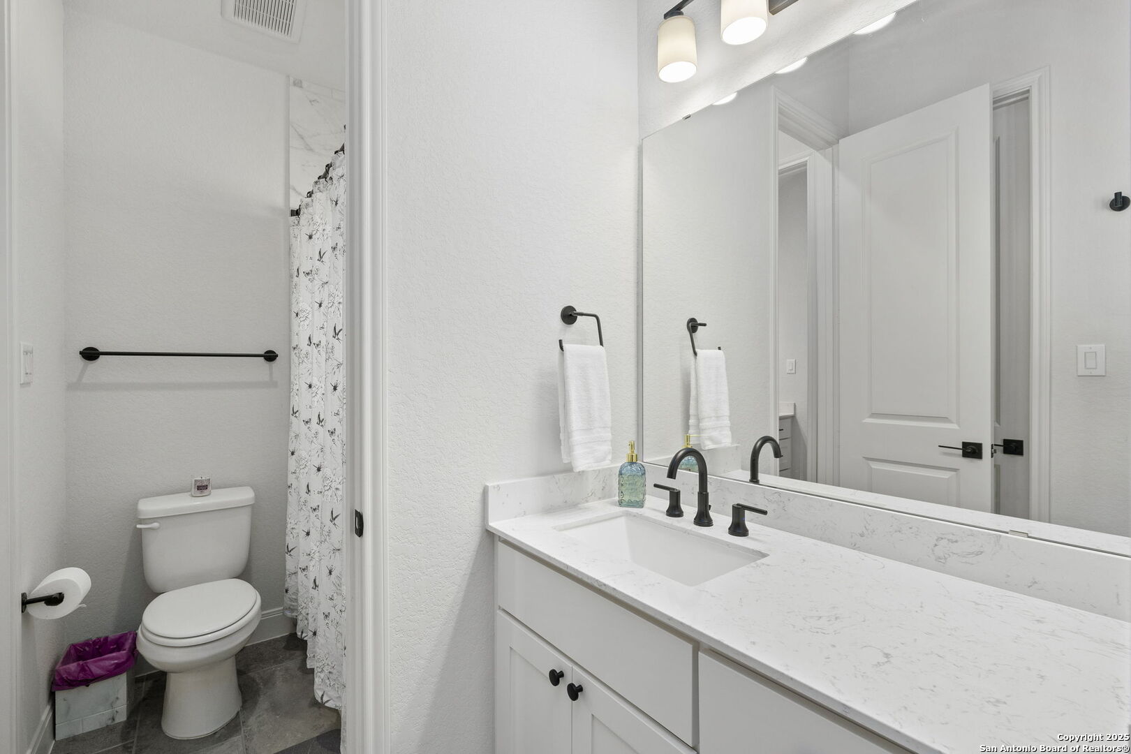 Built in 2024 by Perry Homes, this stunning 2,987 sq. ft. residence offers modern luxury and thoughtful design. Step into a grand entryway that sets the tone for this spacious home, featuring a dedicated media room complete with a projector and screen. The chef's kitchen is a culinary dream, boasting double ovens, granite countertops, a breakfast bar, and ample storage. It seamlessly opens to the dining area and living room, where a butler's bar and a striking white rock gas fireplace create a warm and inviting ambiance. Large windows flood the space with natural light while offering serene views of the country greenbelt. The primary suite is a true retreat, with an en suite bathroom featuring a garden tub, an oversized walk-in shower with a bench, a double vanity, and multiple closets-one of which conveniently connects to the utility room with additional storage. Perfect for multi-generational living or guests, one of the secondary bedrooms includes a private en suite bathroom. Two additional bedrooms share a Jack-and-Jill bathroom, ensuring comfort and privacy for all. Enjoy outdoor living on the extended covered patio, ideal for entertaining or relaxing as you take in breathtaking sunsets. Located in the highly sought-after Navarro ISD and conveniently positioned near I-10 and Hwy 46, this home offers easy access to both Seguin and New Braunfels. Plus, the 2-year and 10-year builder's warranties are still in place for added peace of mind. Don't miss this exceptional opportunity-schedule your showing today!