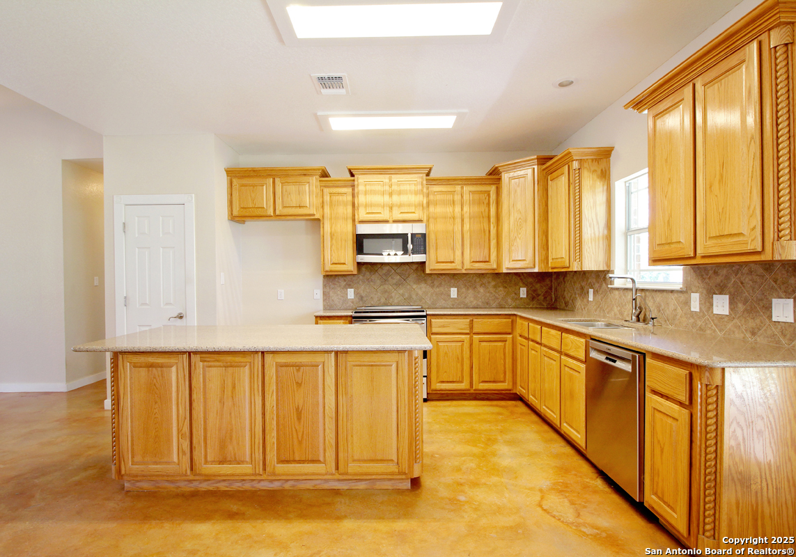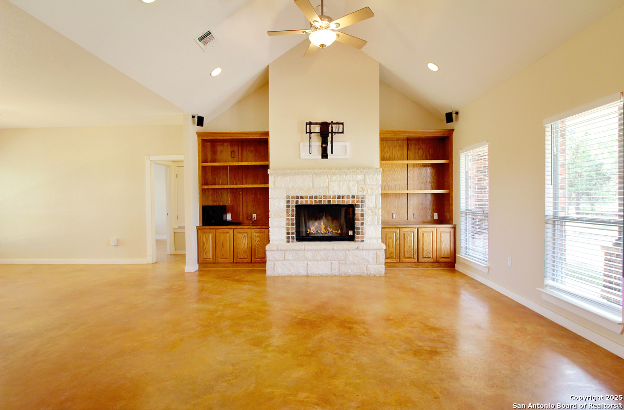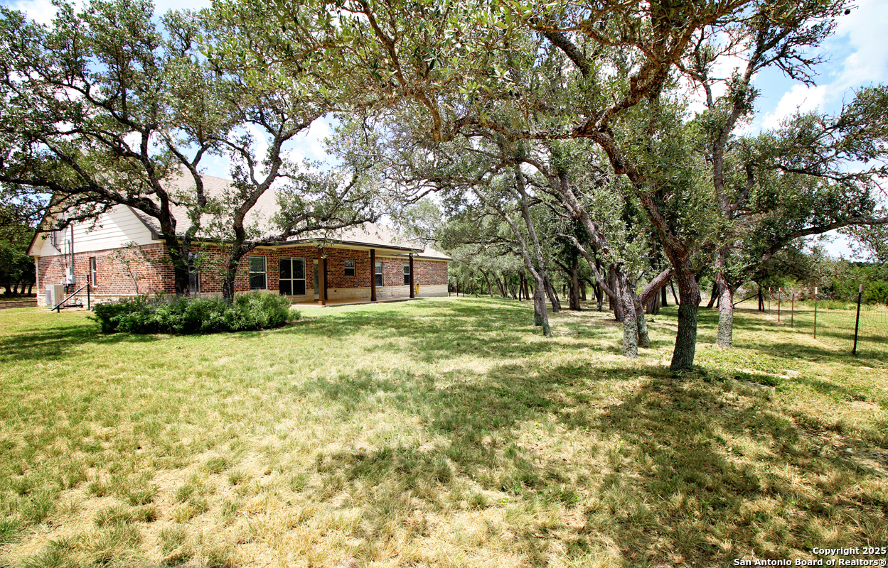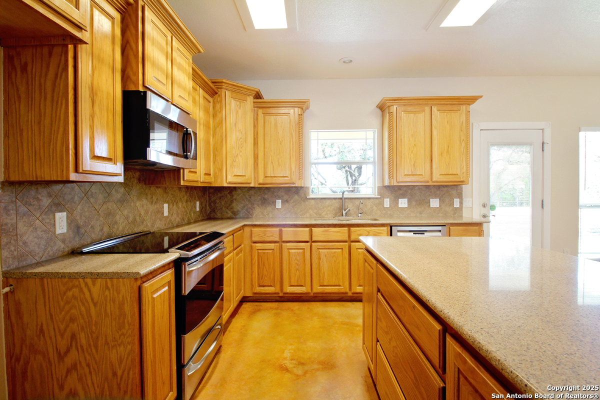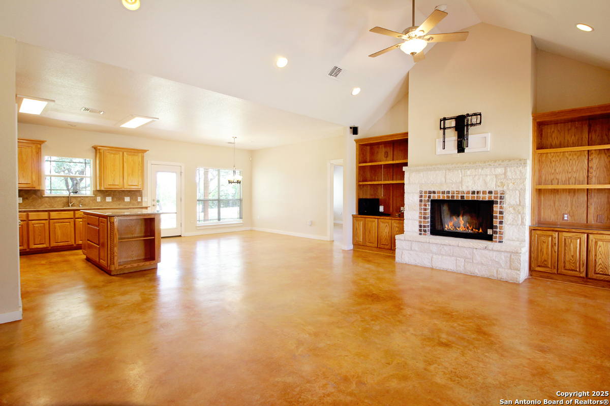 Step into the Texas Hill Country in the quiet, peaceful and relaxing Stallion Estates subdivision. This spacious and open floor plan was perfectly designed for this country home. Special features include a massive rock fireplace, split bedrooms, high ceilings and stained concrete floors throughout. The gourmet island kitchen features SS appliances and multiple custom cabinets. Every room was well thought-out in design and function. Built-ins include an office with generous desktops, cabinets and storage, large utility room with more counter workspace and another work room in the garage. Oversized garage with spacious driveway. Very nice, covered backyard patio. US 281 provides immediate access to San Antonio and Blanco, Johnson City and Austin.