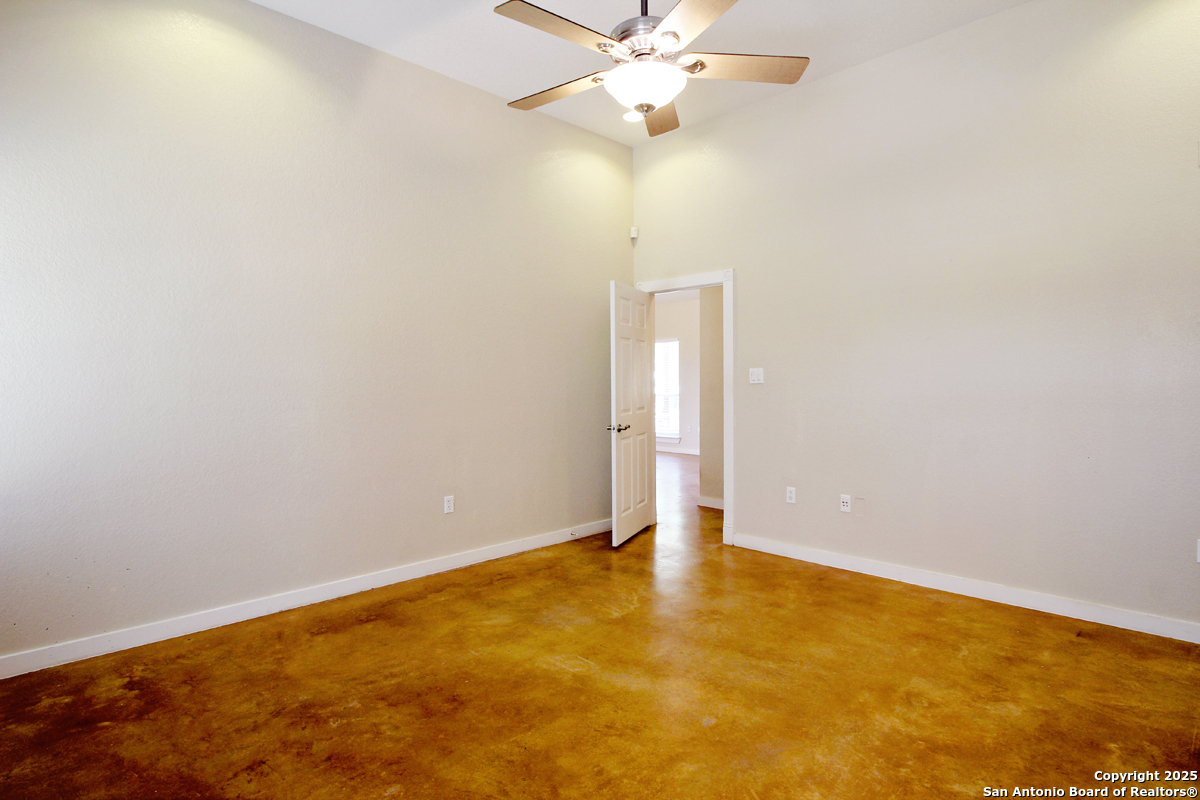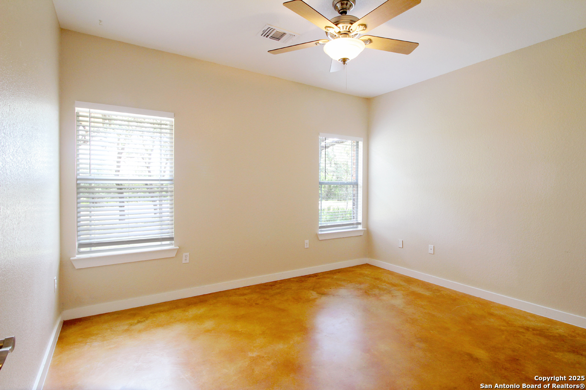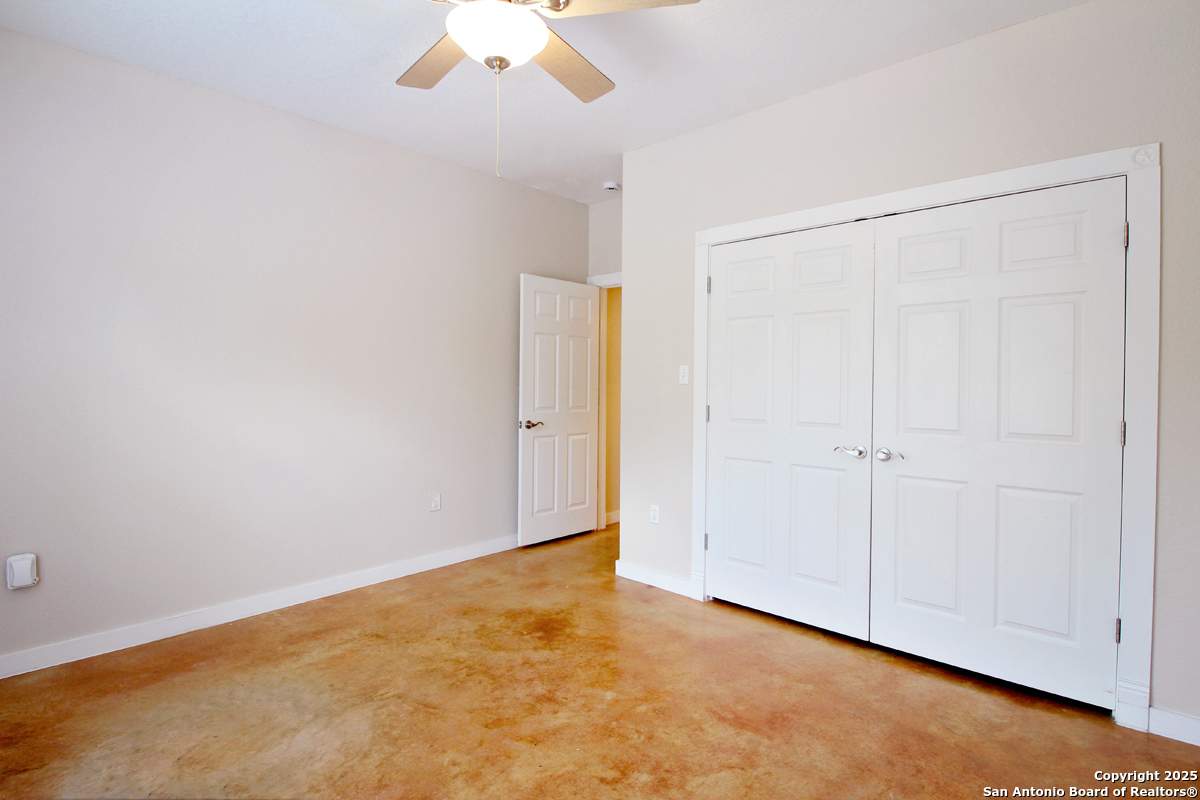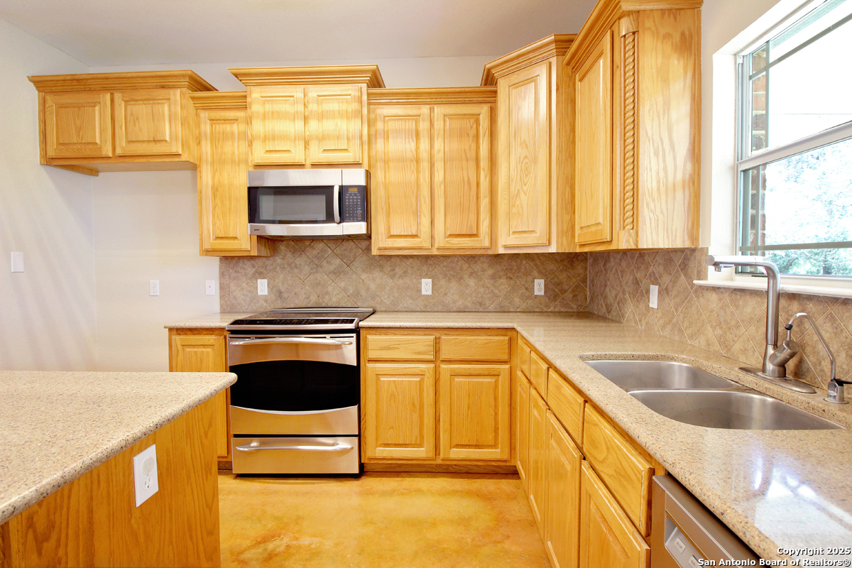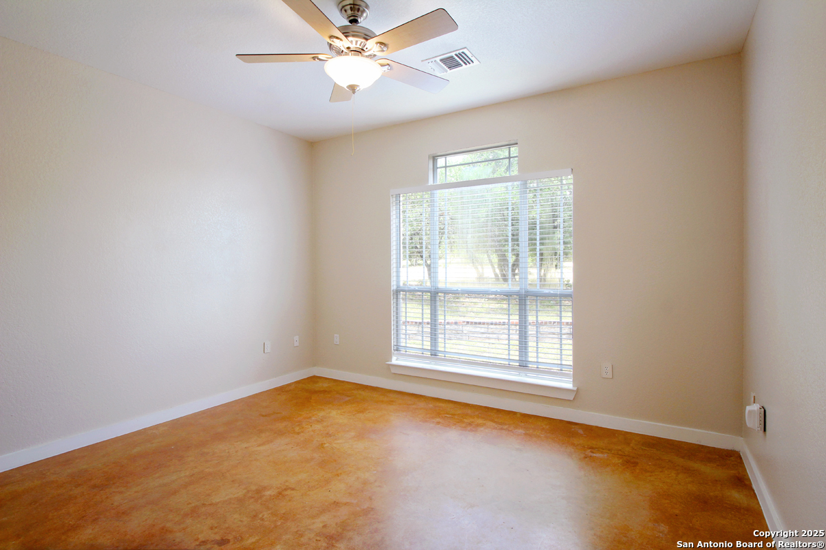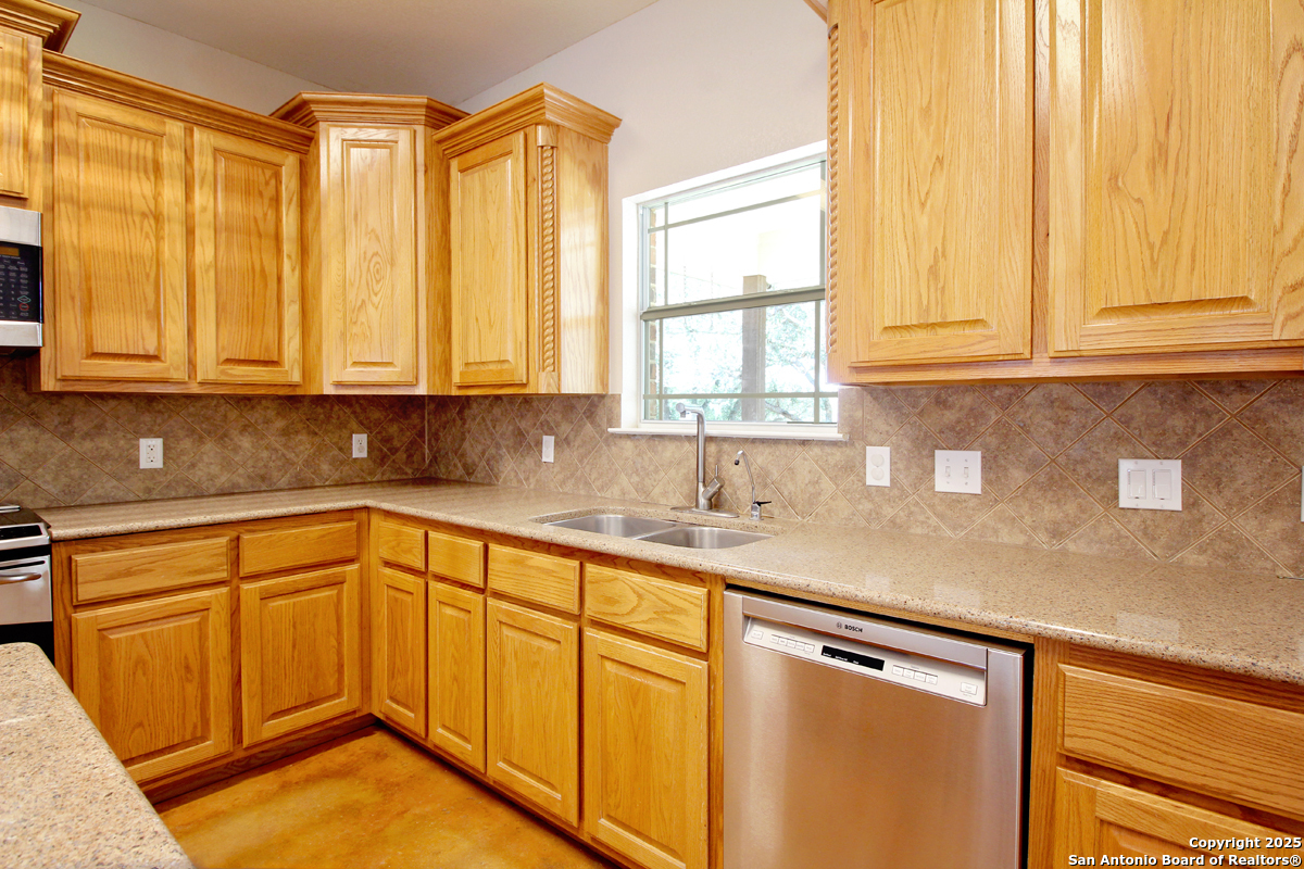 Step into the Texas Hill Country in the quiet, peaceful and relaxing Stallion Estates subdivision. This spacious and open floor plan was perfectly designed for this country home. Special features include a massive rock fireplace, split bedrooms, high ceilings and stained concrete floors throughout. The gourmet island kitchen features SS appliances and multiple custom cabinets. Every room was well thought-out in design and function. Built-ins include an office with generous desktops, cabinets and storage, large utility room with more counter workspace and another work room in the garage. Oversized garage with spacious driveway. Very nice, covered backyard patio. US 281 provides immediate access to San Antonio and Blanco, Johnson City and Austin.