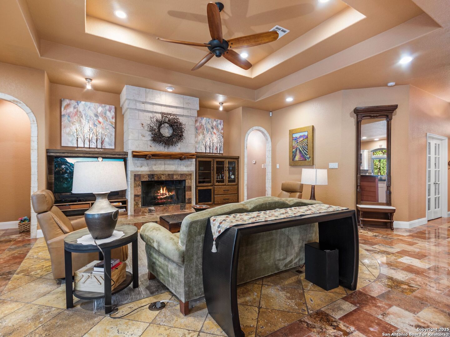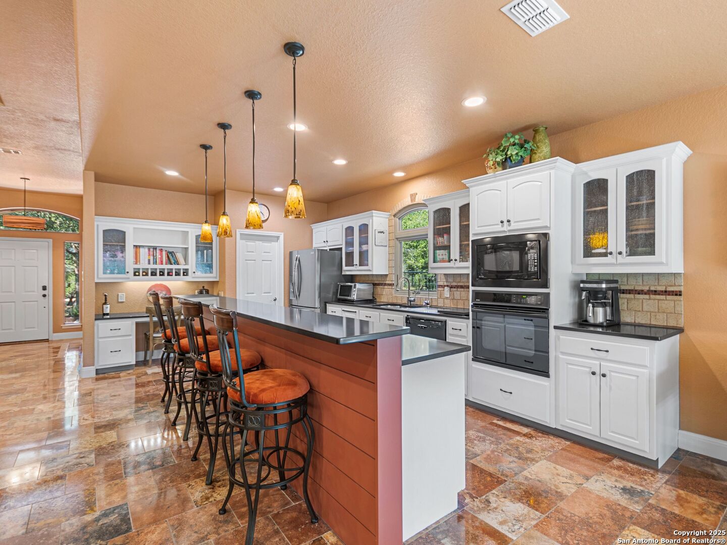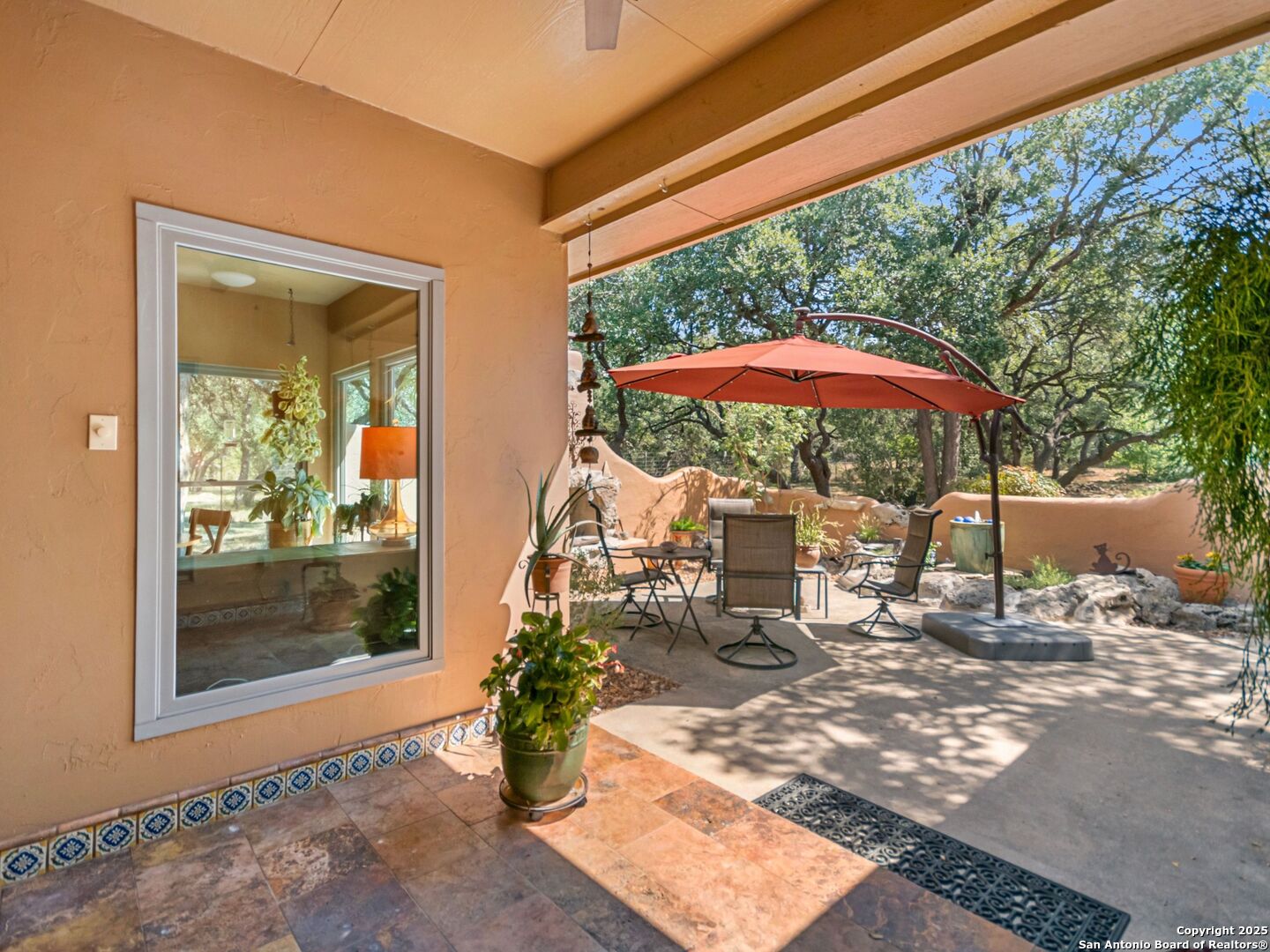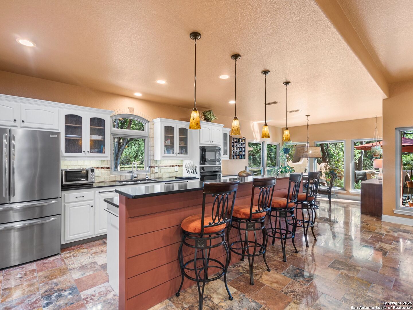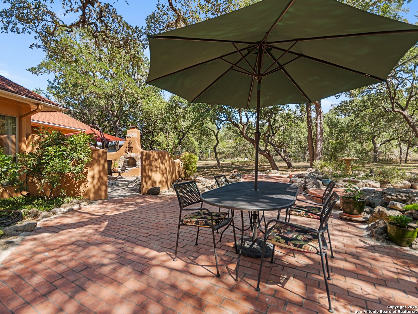 Welcome home to your tranquil escape in the heart of the Texas Hill Country. This impeccably clean and well-maintained property offers the perfect blend of functionality, charm, and serenity - all within the boundaries of a friendly community featuring private Guadalupe River access through the HOA park. Step inside and be greeted by an abundance of natural light that highlights the spacious layout and elegant stone flooring throughout the main living areas. Set up for either three bedrooms and an office or take advantage of the potential for a double office setup, this home easily accommodates both family life and work-from-home needs. At the heart of the home lies the stunning chef-inspired kitchen, designed for both everyday living and entertaining. Enjoy a large island that provides ample workspace and storage, perfect for preparing gourmet meals or gathering with guests. The breakfast area features huge windows that flood the space with light and offer sweeping views of the outdoors, truly bringing the outside in. Enjoy Texas evenings around your custom outdoor fireplace or gather with friends around the fire pit under the stars. The expansive outdoor living spaces are made for entertaining and peaceful relaxation. The fully fenced 2-acre lot is ideal for animals, and includes raised garden beds, a garden shed, and a workshop - everything you need for a self-sustaining lifestyle. Located within the prestigious Smithson Valley High School district, this home combines country comfort with convenient access to top-rated schools and amenities. Whether you're dreaming of a peaceful retreat, a hobby farm, or a place to simply enjoy wide-open spaces and nature, this home offers it all and more.