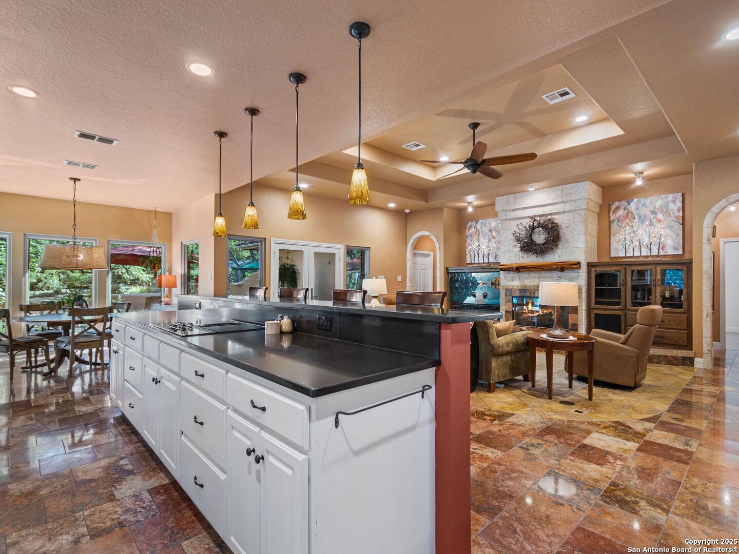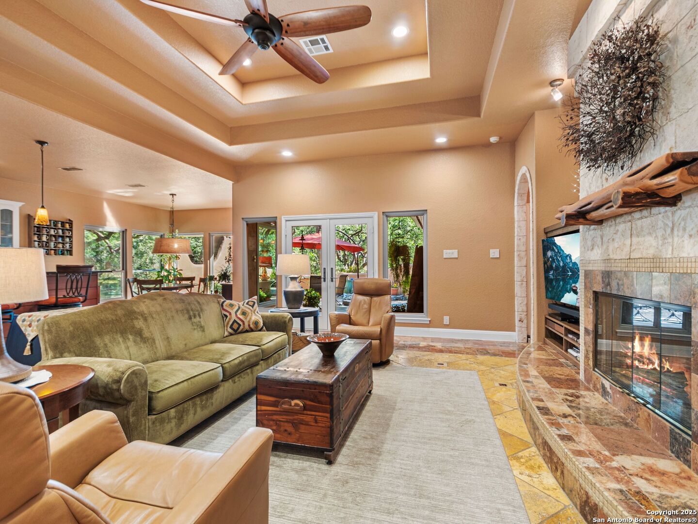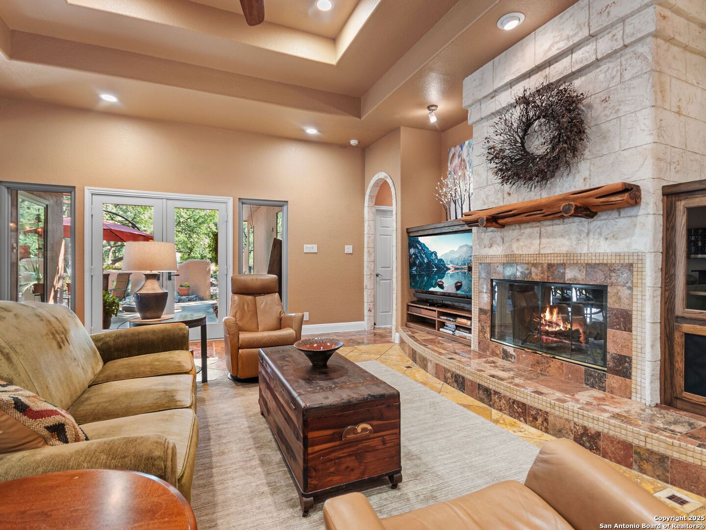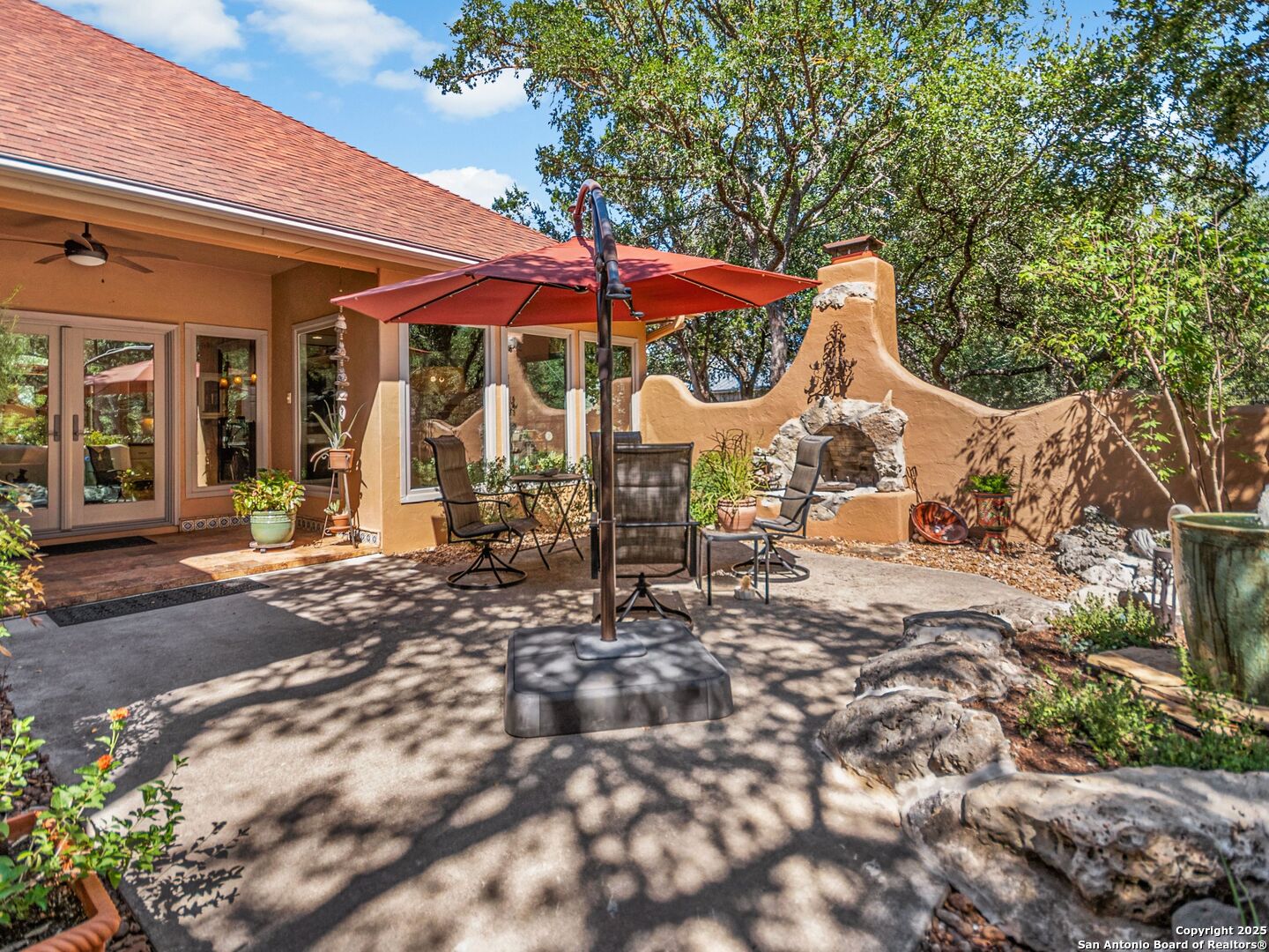 Welcome home to your tranquil escape in the heart of the Texas Hill Country. This impeccably clean and well-maintained property offers the perfect blend of functionality, charm, and serenity - all within the boundaries of a friendly community featuring private Guadalupe River access through the HOA park. Step inside and be greeted by an abundance of natural light that highlights the spacious layout and elegant stone flooring throughout the main living areas. Set up for either three bedrooms and an office or take advantage of the potential for a double office setup, this home easily accommodates both family life and work-from-home needs. At the heart of the home lies the stunning chef-inspired kitchen, designed for both everyday living and entertaining. Enjoy a large island that provides ample workspace and storage, perfect for preparing gourmet meals or gathering with guests. The breakfast area features huge windows that flood the space with light and offer sweeping views of the outdoors, truly bringing the outside in. Enjoy Texas evenings around your custom outdoor fireplace or gather with friends around the fire pit under the stars. The expansive outdoor living spaces are made for entertaining and peaceful relaxation. The fully fenced 2-acre lot is ideal for animals, and includes raised garden beds, a garden shed, and a workshop - everything you need for a self-sustaining lifestyle. Located within the prestigious Smithson Valley High School district, this home combines country comfort with convenient access to top-rated schools and amenities. Whether you're dreaming of a peaceful retreat, a hobby farm, or a place to simply enjoy wide-open spaces and nature, this home offers it all and more.