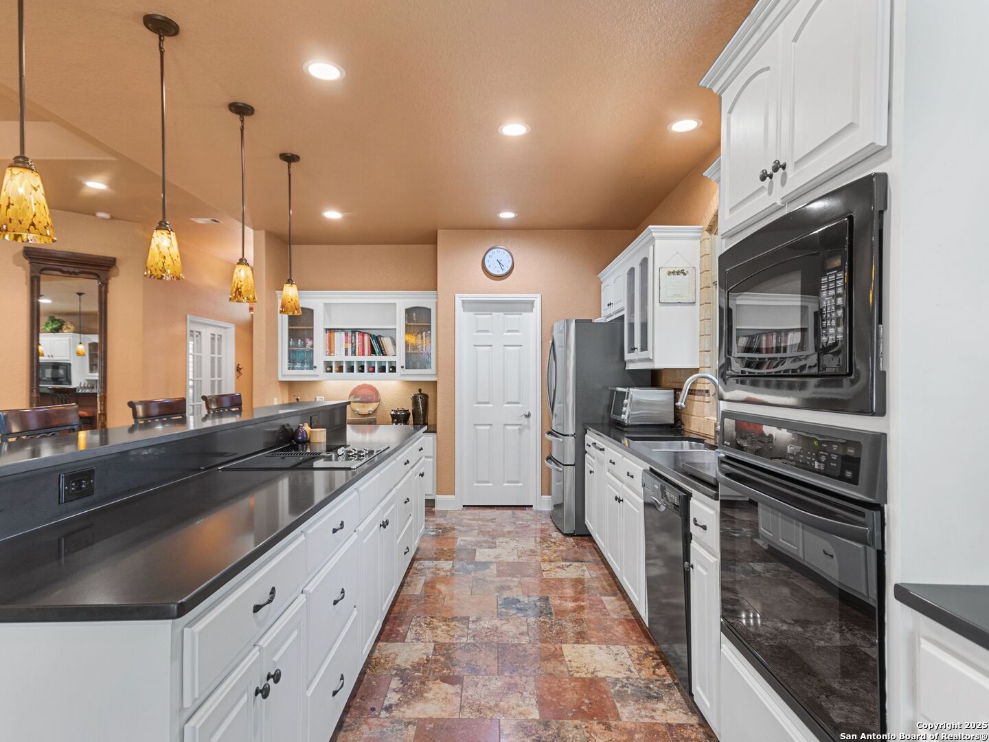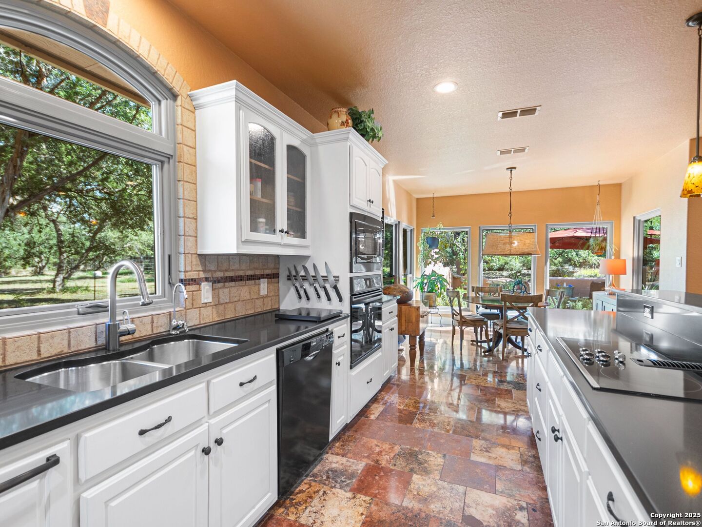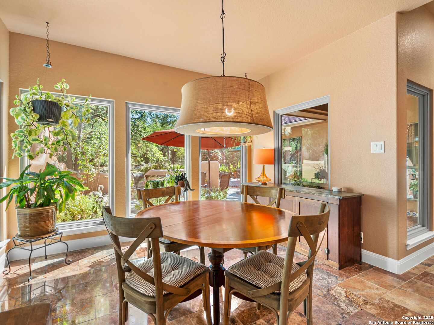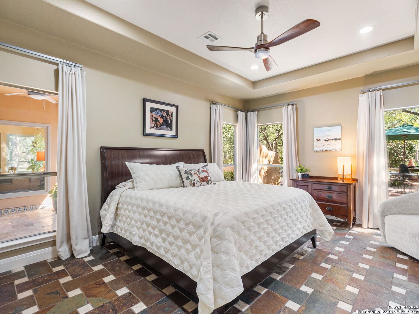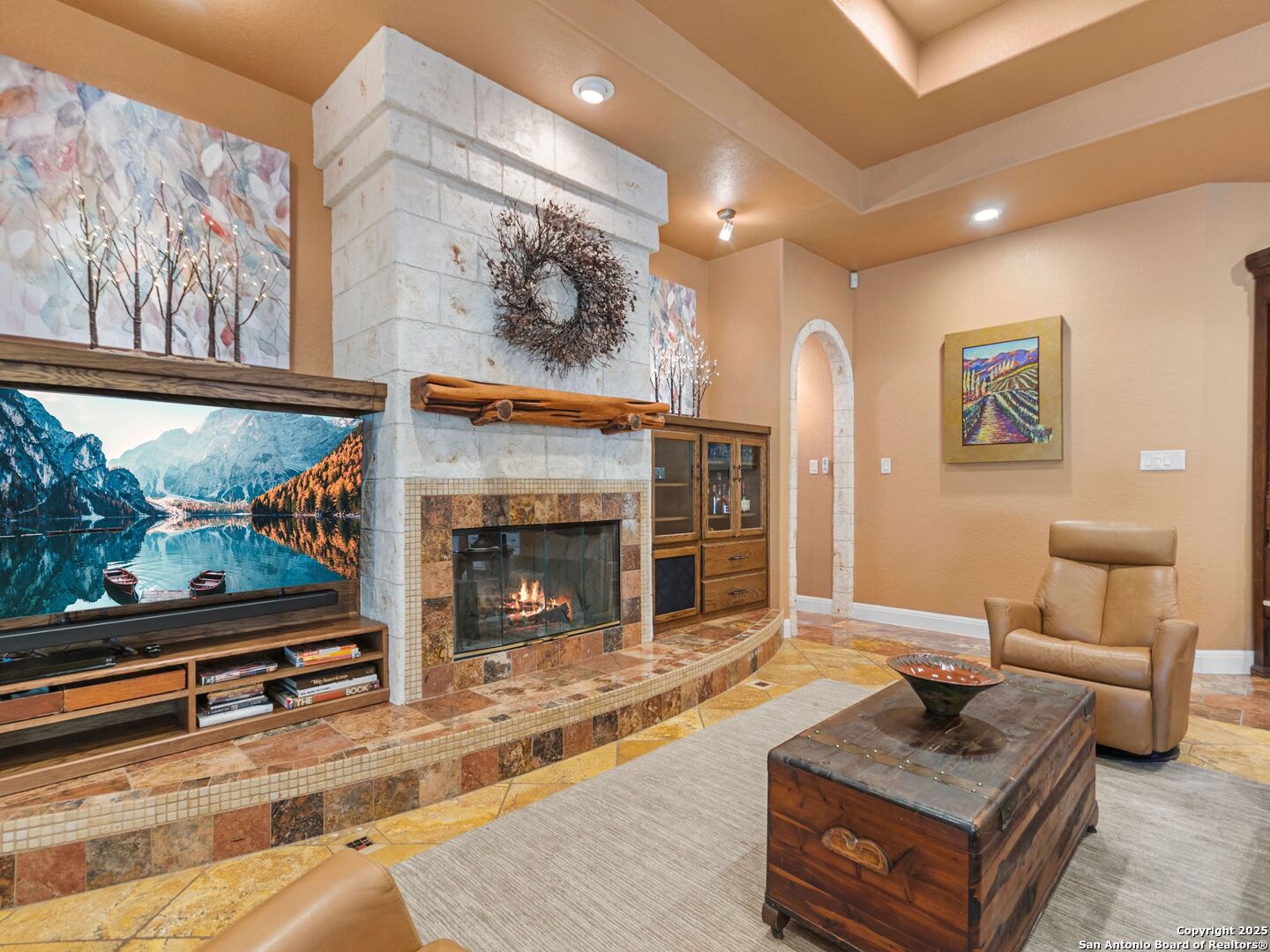 Welcome home to your tranquil escape in the heart of the Texas Hill Country. This impeccably clean and well-maintained property offers the perfect blend of functionality, charm, and serenity - all within the boundaries of a friendly community featuring private Guadalupe River access through the HOA park. Step inside and be greeted by an abundance of natural light that highlights the spacious layout and elegant stone flooring throughout the main living areas. Set up for either three bedrooms and an office or take advantage of the potential for a double office setup, this home easily accommodates both family life and work-from-home needs. At the heart of the home lies the stunning chef-inspired kitchen, designed for both everyday living and entertaining. Enjoy a large island that provides ample workspace and storage, perfect for preparing gourmet meals or gathering with guests. The breakfast area features huge windows that flood the space with light and offer sweeping views of the outdoors, truly bringing the outside in. Enjoy Texas evenings around your custom outdoor fireplace or gather with friends around the fire pit under the stars. The expansive outdoor living spaces are made for entertaining and peaceful relaxation. The fully fenced 2-acre lot is ideal for animals, and includes raised garden beds, a garden shed, and a workshop - everything you need for a self-sustaining lifestyle. Located within the prestigious Smithson Valley High School district, this home combines country comfort with convenient access to top-rated schools and amenities. Whether you're dreaming of a peaceful retreat, a hobby farm, or a place to simply enjoy wide-open spaces and nature, this home offers it all and more.