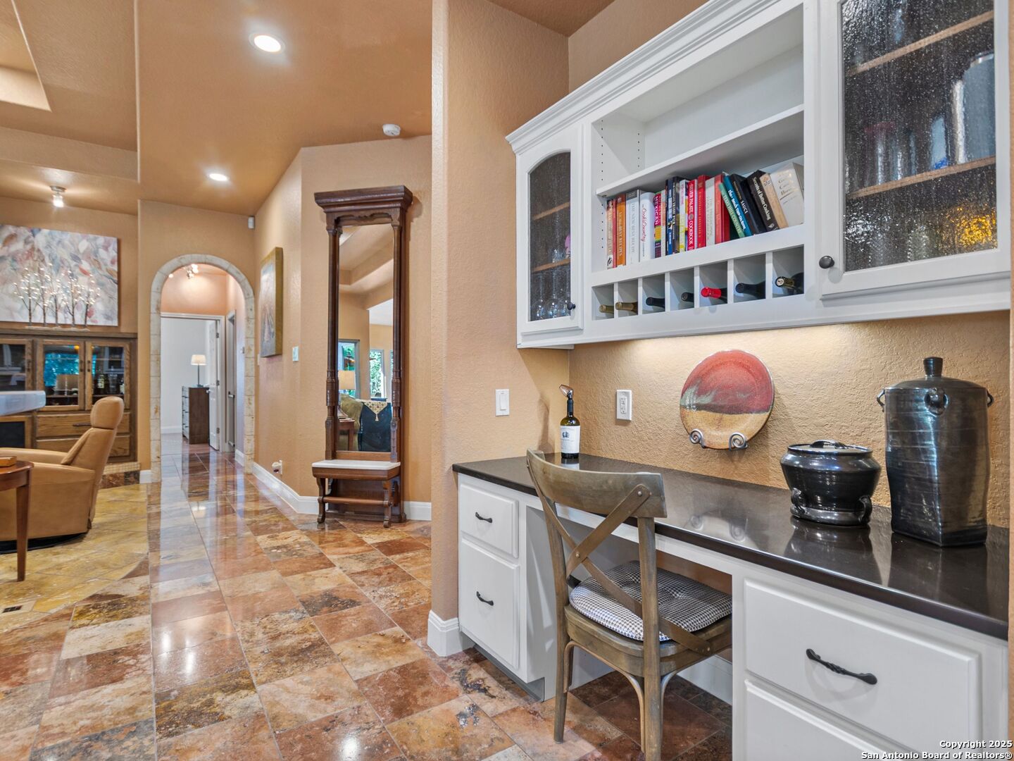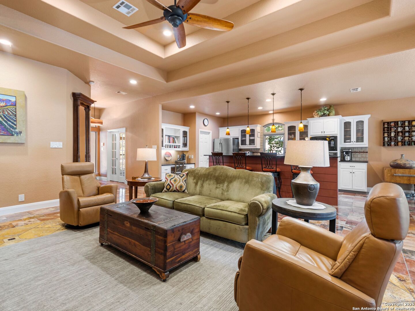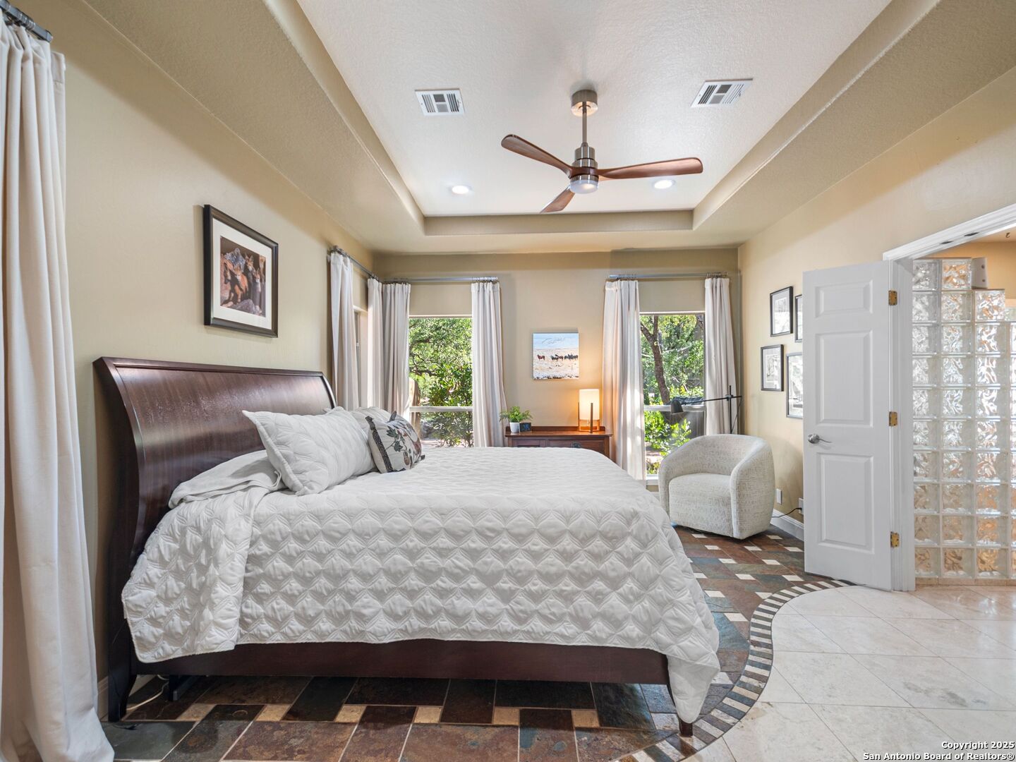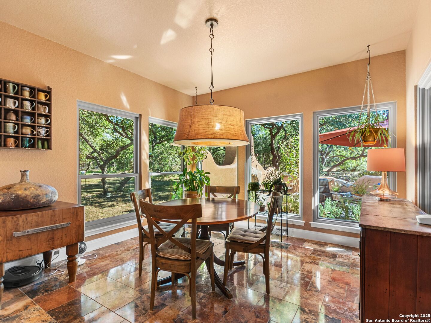 Welcome home to your tranquil escape in the heart of the Texas Hill Country. This impeccably clean and well-maintained property offers the perfect blend of functionality, charm, and serenity - all within the boundaries of a friendly community featuring private Guadalupe River access through the HOA park. Step inside and be greeted by an abundance of natural light that highlights the spacious layout and elegant stone flooring throughout the main living areas. Set up for either three bedrooms and an office or take advantage of the potential for a double office setup, this home easily accommodates both family life and work-from-home needs. At the heart of the home lies the stunning chef-inspired kitchen, designed for both everyday living and entertaining. Enjoy a large island that provides ample workspace and storage, perfect for preparing gourmet meals or gathering with guests. The breakfast area features huge windows that flood the space with light and offer sweeping views of the outdoors, truly bringing the outside in. Enjoy Texas evenings around your custom outdoor fireplace or gather with friends around the fire pit under the stars. The expansive outdoor living spaces are made for entertaining and peaceful relaxation. The fully fenced 2-acre lot is ideal for animals, and includes raised garden beds, a garden shed, and a workshop - everything you need for a self-sustaining lifestyle. Located within the prestigious Smithson Valley High School district, this home combines country comfort with convenient access to top-rated schools and amenities. Whether you're dreaming of a peaceful retreat, a hobby farm, or a place to simply enjoy wide-open spaces and nature, this home offers it all and more.