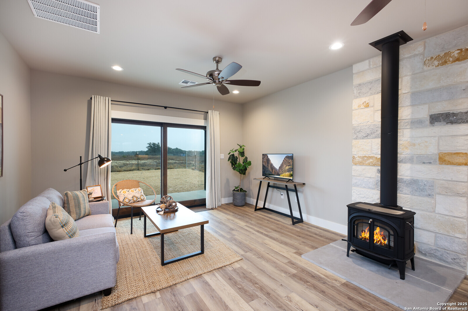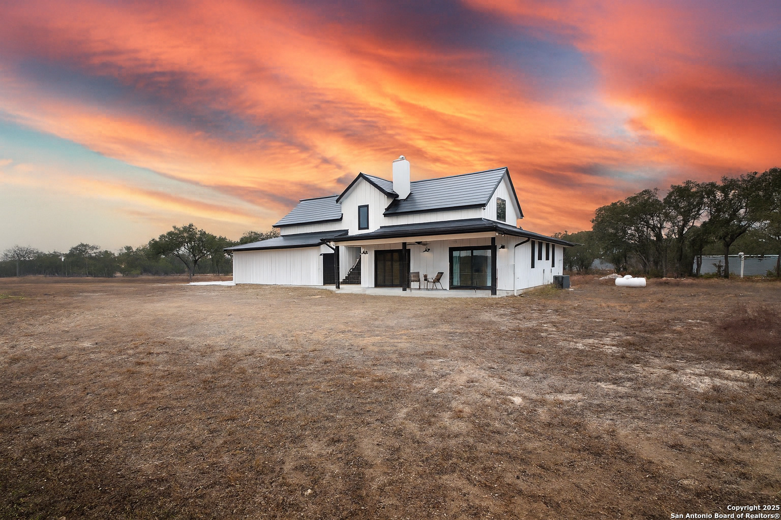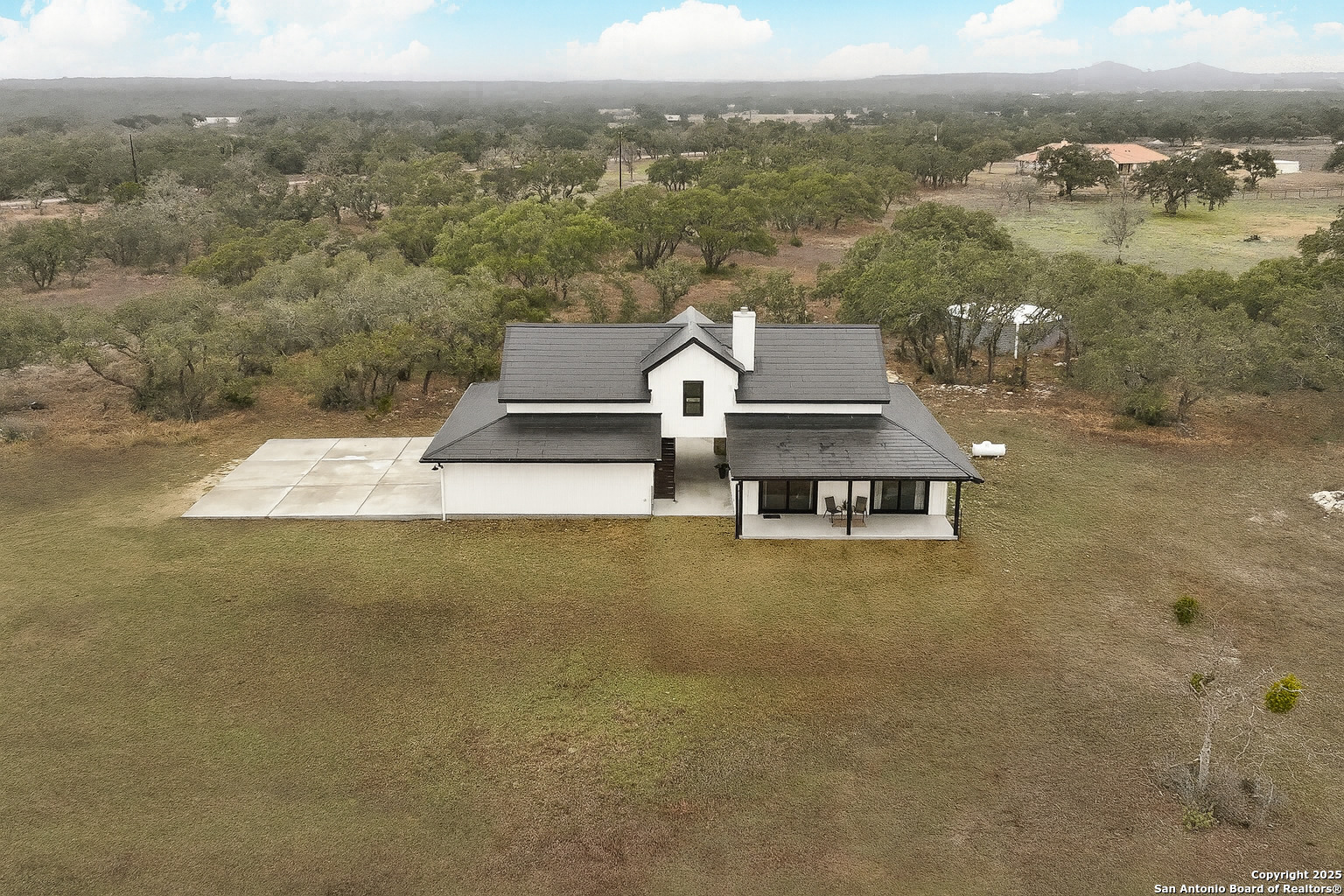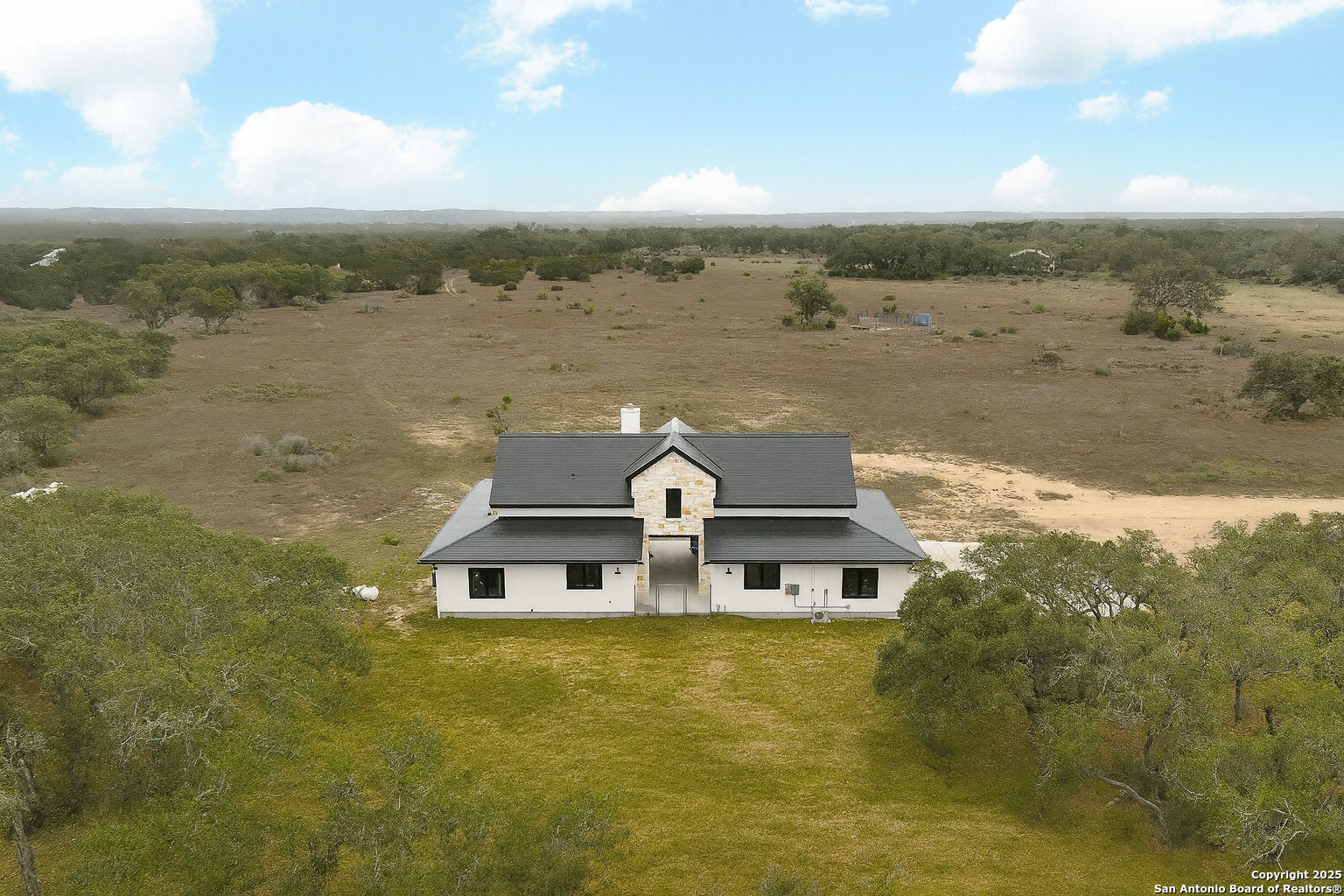 Experience sustainable, private, and self-sufficient living in this 2023 Bo Williams custom-built farmhouse, designed for off-grid independence without sacrificing modern comforts. Situated on 20 fully fenced acres in Twin Peaks Ranches, a 500+ acre subdivision with 20-acre minimum tracts & minimal POA restrictions, this property also benefits from a wildlife exemption keeping property taxes low. This 2,200 sq. ft., 3-bedroom, 3-bathroom home is completely self-sustaining, featuring a Tesla Solar Shingles Roof with two Tesla Powerwalls, a 29,000-gallon rainwater catchment system, a triple-filtered Viqua water purification system, private septic, RUUD dual-zone HVAC, spray foam insulation, and double-pane no-grid windows. The open-concept living, dining, and kitchen area includes Taj Mahal Quartzite countertops, a Kohler Apron Farmhouse sink, Monogram gas appliances, and a walk-in pantry with pull-out storage. A Dauntless Vermont Cast Iron Wood Stove with a Hill Country stone accent wall provides heat and a wood-fired cooking option. Strategically positioned for solar efficiency and N-to-S winds, the home enjoys a constant cool breeze through the breezeways. Move-in ready with high-end finishes, energy efficiency, & complete off-grid functionality, this rare Texas Hill Country retreat offers modern luxury with total independence. Located just 3 miles from Highway 281, this property provides quick access to Spring Branch, Blanco, and Bulverde & Canyon Lake while being only 45 minutes from San Antonio International Airport and 1 hour from Austin Airport. Enjoy the best of secluded living with easy access to major city conveniences.