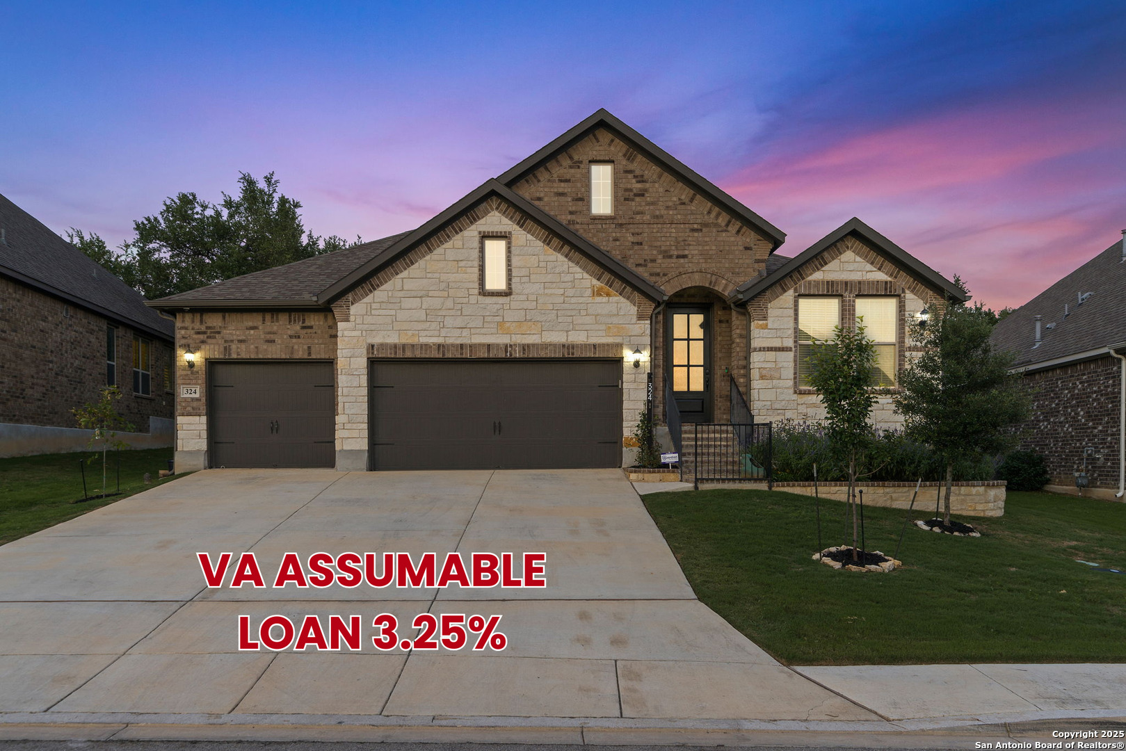 Assumable VA loan of 3.25. Modern comfort meets thoughtful design at 324 Rhapsody Ridge in San Antonio. This beautifully upgraded home offers standout curb appeal with a charming brick front porch and brick-paved stairs that warmly welcome you inside. Step into a light-filled interior featuring wood-look tile floors, soaring 8-foot doors, high ceiling and lots of natural light. Enjoy a chef-inspired kitchen with gas cooking, a huge pantry, tons of cabinets & counter top space, plus an oversized island perfect for entertaining. The home office is equipped with a premium network system and wiring-ideal for remote work or a high-performance setup. The media room is pre-wired for immersive surround sound, including Dolby Atmos. Separate dining and break rooms!! Retreat to the spacious primary suite boasting an upgraded walk-in shower, and large walk-in closet. while the private backyard offers a peaceful escape with clumping bamboo for natural privacy. Enjoy gas and plumbing hookups on the patio-ready for your future outdoor kitchen or grill setup. Additional highlights include a water softener, reverse osmosis system, and 3 car-garage offering everyday comfort and quality. With style, substance, and smart-home features throughout, this home is truly move-in ready. Tech lovers will appreciate the advanced features throughout, including a monitored security system, four exterior cameras, two interior cameras, a Guardian doorbell, and robust upgraded networking-complete with a router, switch, and two hot spots. Schedule your private showing today and experience the exceptional lifestyle at 324 Rhapsody Ridge!