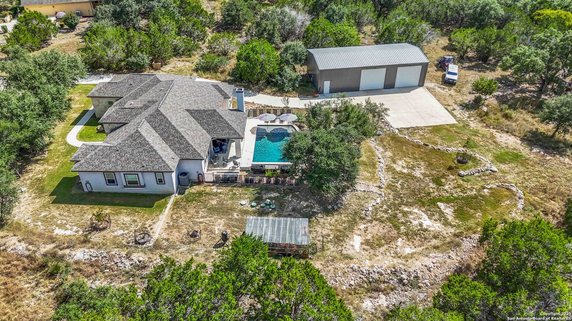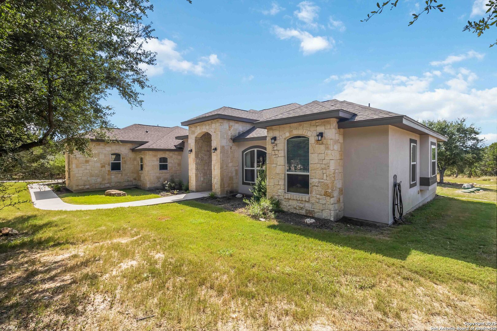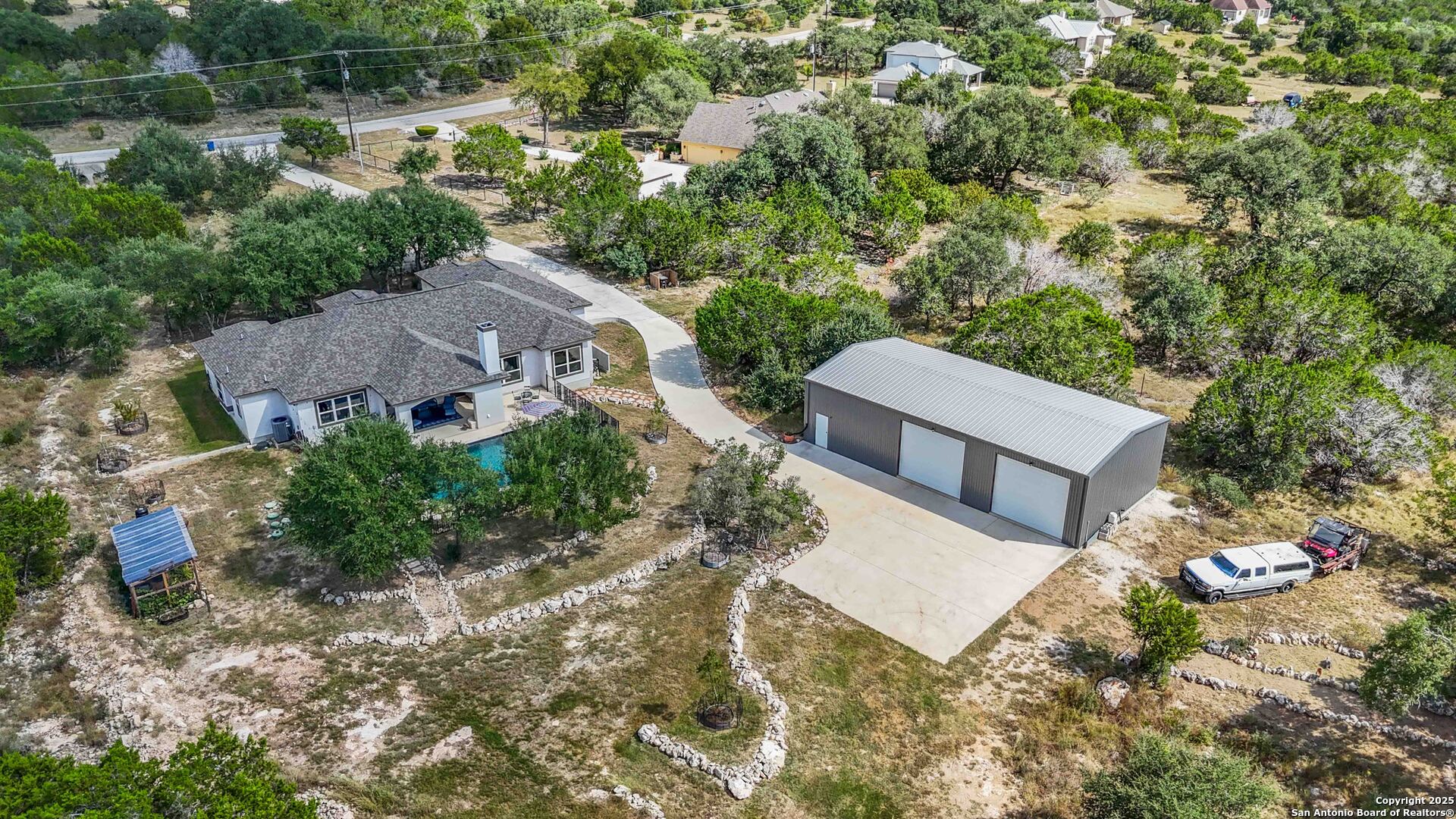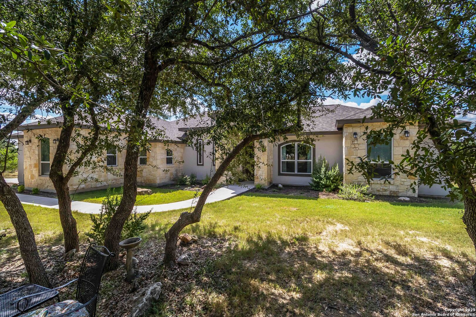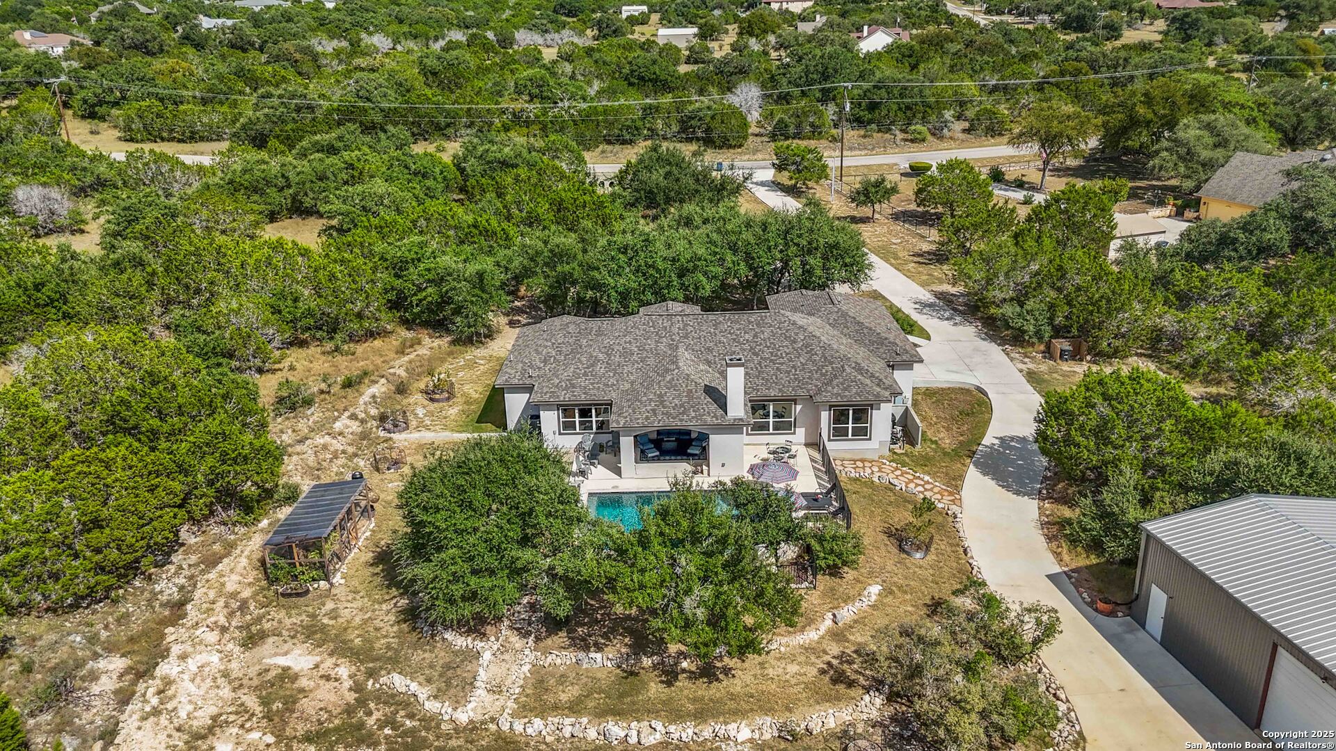 Step into hill country elegance with this striking one story residence, nestled on a sprawling 3.36 acre lot in the exclusive Mystic Shores community. Boasting 3 bedrooms, 2.5 baths, and 2,544 sq ft of thoughtfully designed living space. This home delivers both comfort and sophistication. The open-concept layout flows effortlessly from the foyer through the main living area and into the chef's kitchen, complete with a generous center island, breakfast bar, granite surfaces, and custom cabinetry. Tray and stepped ceilings accent many rooms, while strategically placed wall niches offer subtle architectural interest. Retreat to the primary suite, offering a sitting alcove, double vanities, a garden tub, separate shower, and a large Bespoke walk-in closet. Two additional bedrooms are supported by a full bathroom and a powder room, ideal for guests or flexible use. A dedicated game or media room adds extra living potential with it's own powder room, closet and outdoor access leading the the pool! Step outside into your private outdoor haven. A sparkling in-ground pool with an elegant water feature that adds a touch of resort-style luxury. An oversized covered patio anchored by a built-in fireplace invites year-round enjoyment, whether it's quiet mornings or entertaining under the stars. Nestled in the backyard, the gazebo offers a serene, shaded retreat ideal for morning coffee, evening gatherings, or quiet afternoons surrounded by nature. Just steps away, the greenhouse provides a year-round haven for gardening enthusiasts-whether you're growing fresh herbs, vibrant flowers, or seasonal vegetables, this space is both functional and inspiring. The versatile 30' x 60' metal RV building offers exceptional functionality and space, ideal for storing RVs, boats, vehicles, equipment, or even converting into a workshop or hobby space. Built to last with durable steel construction, this structure features high-clearance entry, wide roll-up doors, and ample interior room for oversized vehicles and storage needs. Whether you're a full-time RV enthusiast, collector, or business owner, this building provides the security, space, and flexibility to accommodate a wide range of uses. Beyond your front door, Mystic Shores rewards residents with expansive amenities: parks, trails, community pool access, lakefront recreation, and more - all within a community that blends natural beauty, privacy, and convenience. Don't miss the chance to own a move-in ready, architecturally rich home in one of Spring Branch's most desirable enclaves.