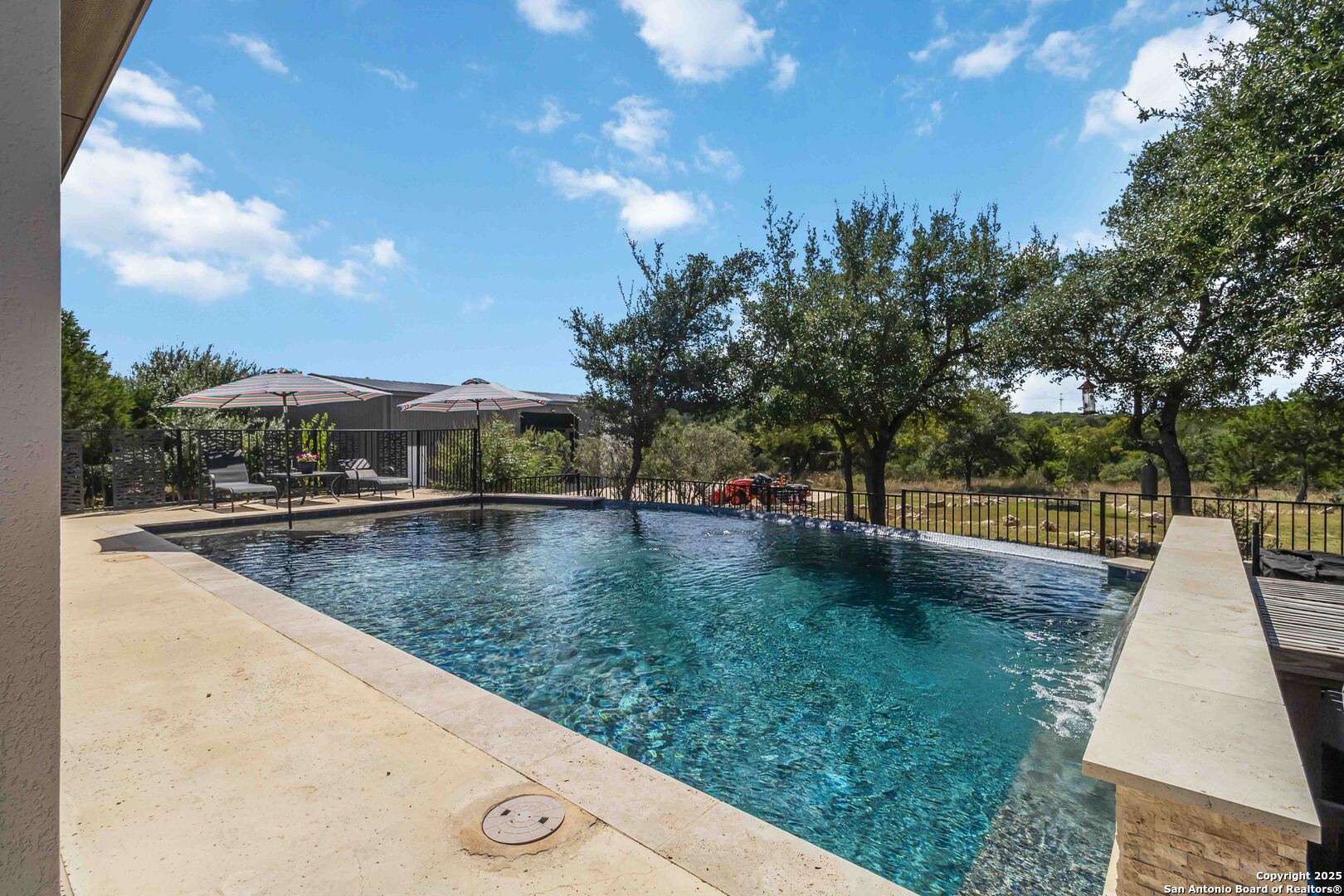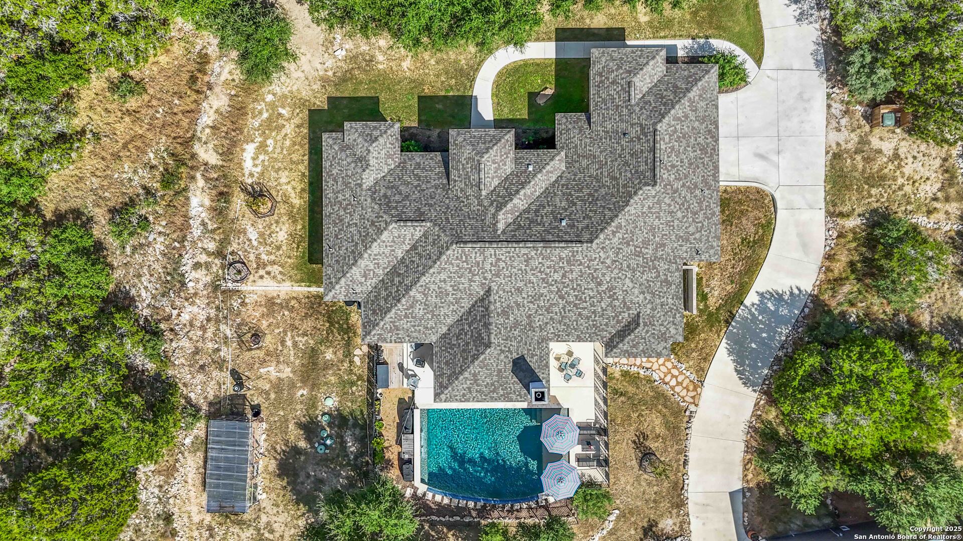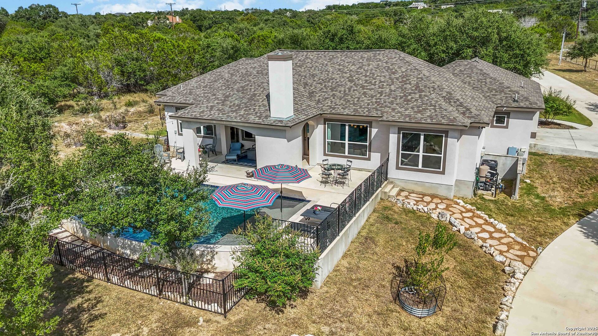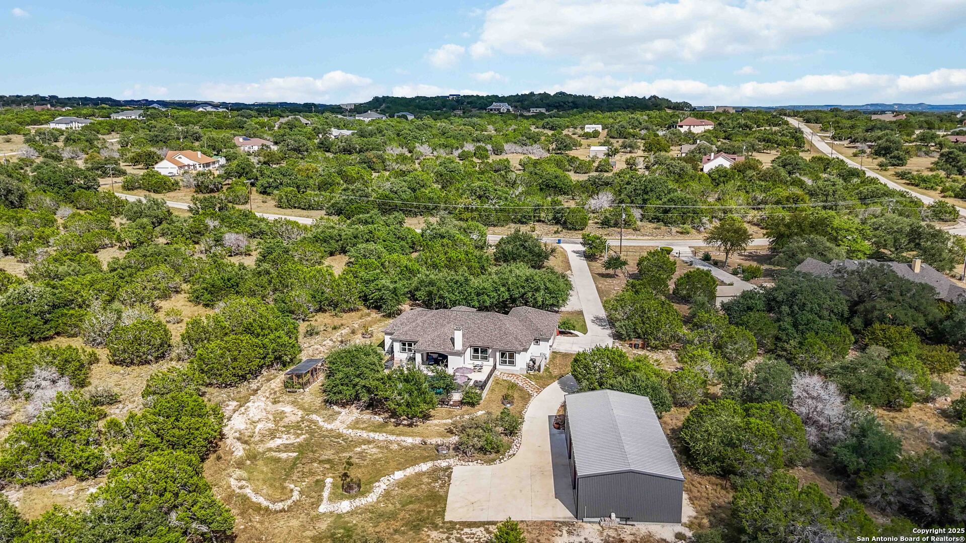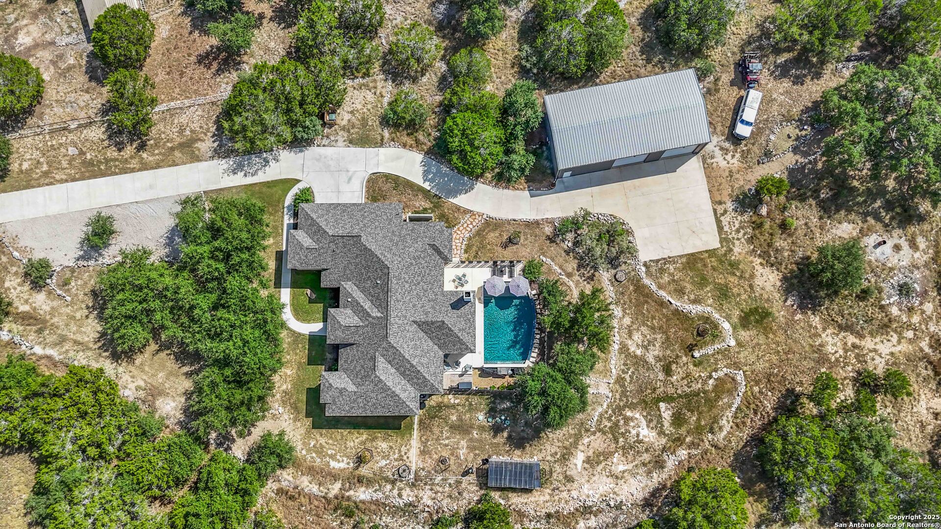 Step into hill country elegance with this striking one story residence, nestled on a sprawling 3.36 acre lot in the exclusive Mystic Shores community. Boasting 3 bedrooms, 2.5 baths, and 2,544 sq ft of thoughtfully designed living space. This home delivers both comfort and sophistication. The open-concept layout flows effortlessly from the foyer through the main living area and into the chef's kitchen, complete with a generous center island, breakfast bar, granite surfaces, and custom cabinetry. Tray and stepped ceilings accent many rooms, while strategically placed wall niches offer subtle architectural interest. Retreat to the primary suite, offering a sitting alcove, double vanities, a garden tub, separate shower, and a large Bespoke walk-in closet. Two additional bedrooms are supported by a full bathroom and a powder room, ideal for guests or flexible use. A dedicated game or media room adds extra living potential with it's own powder room, closet and outdoor access leading the the pool! Step outside into your private outdoor haven. A sparkling in-ground pool with an elegant water feature that adds a touch of resort-style luxury. An oversized covered patio anchored by a built-in fireplace invites year-round enjoyment, whether it's quiet mornings or entertaining under the stars. Nestled in the backyard, the gazebo offers a serene, shaded retreat ideal for morning coffee, evening gatherings, or quiet afternoons surrounded by nature. Just steps away, the greenhouse provides a year-round haven for gardening enthusiasts-whether you're growing fresh herbs, vibrant flowers, or seasonal vegetables, this space is both functional and inspiring. The versatile 30' x 60' metal RV building offers exceptional functionality and space, ideal for storing RVs, boats, vehicles, equipment, or even converting into a workshop or hobby space. Built to last with durable steel construction, this structure features high-clearance entry, wide roll-up doors, and ample interior room for oversized vehicles and storage needs. Whether you're a full-time RV enthusiast, collector, or business owner, this building provides the security, space, and flexibility to accommodate a wide range of uses. Beyond your front door, Mystic Shores rewards residents with expansive amenities: parks, trails, community pool access, lakefront recreation, and more - all within a community that blends natural beauty, privacy, and convenience. Don't miss the chance to own a move-in ready, architecturally rich home in one of Spring Branch's most desirable enclaves.