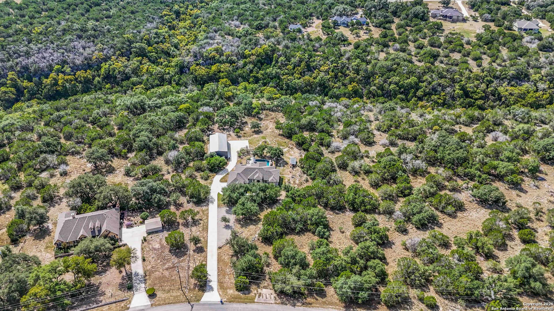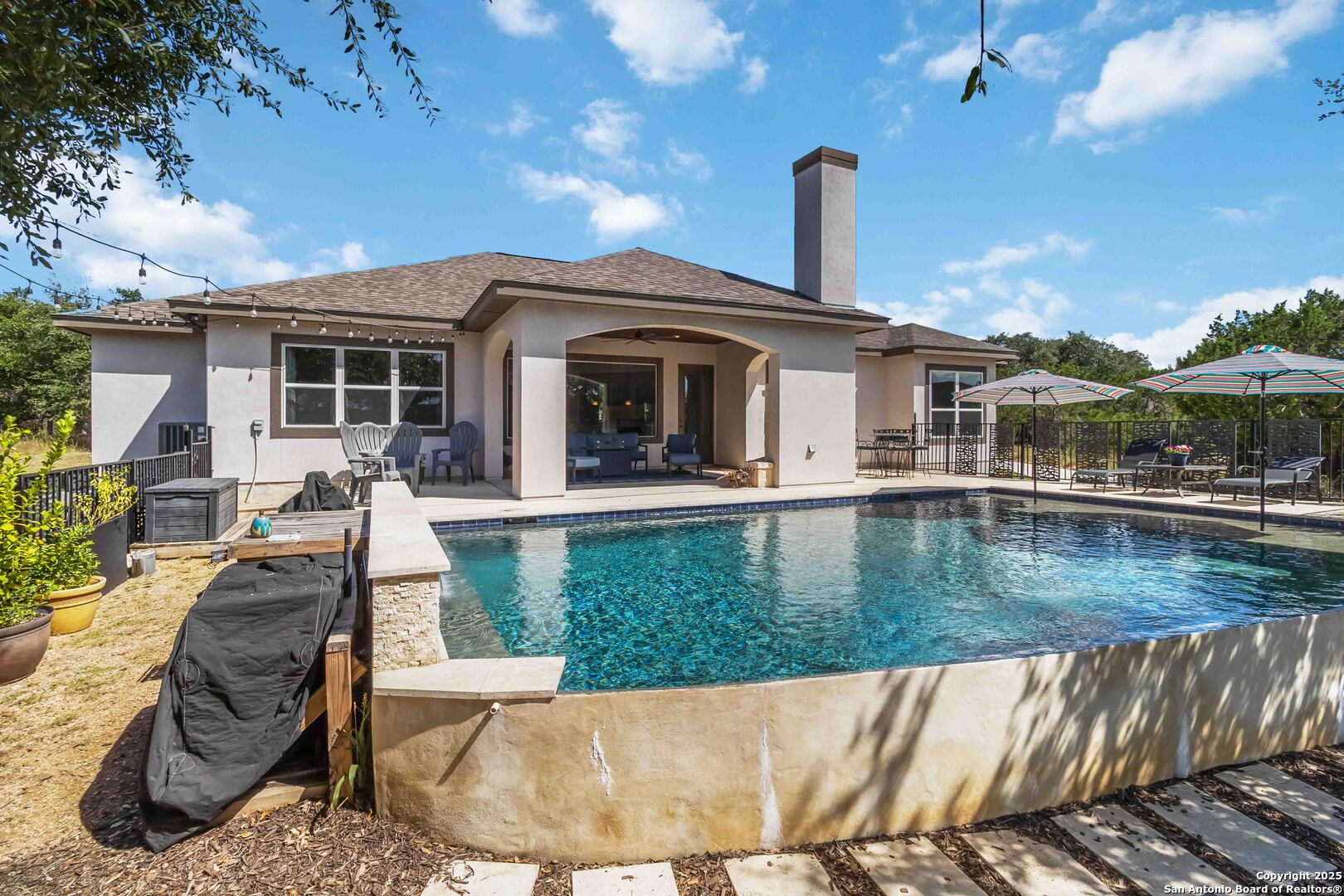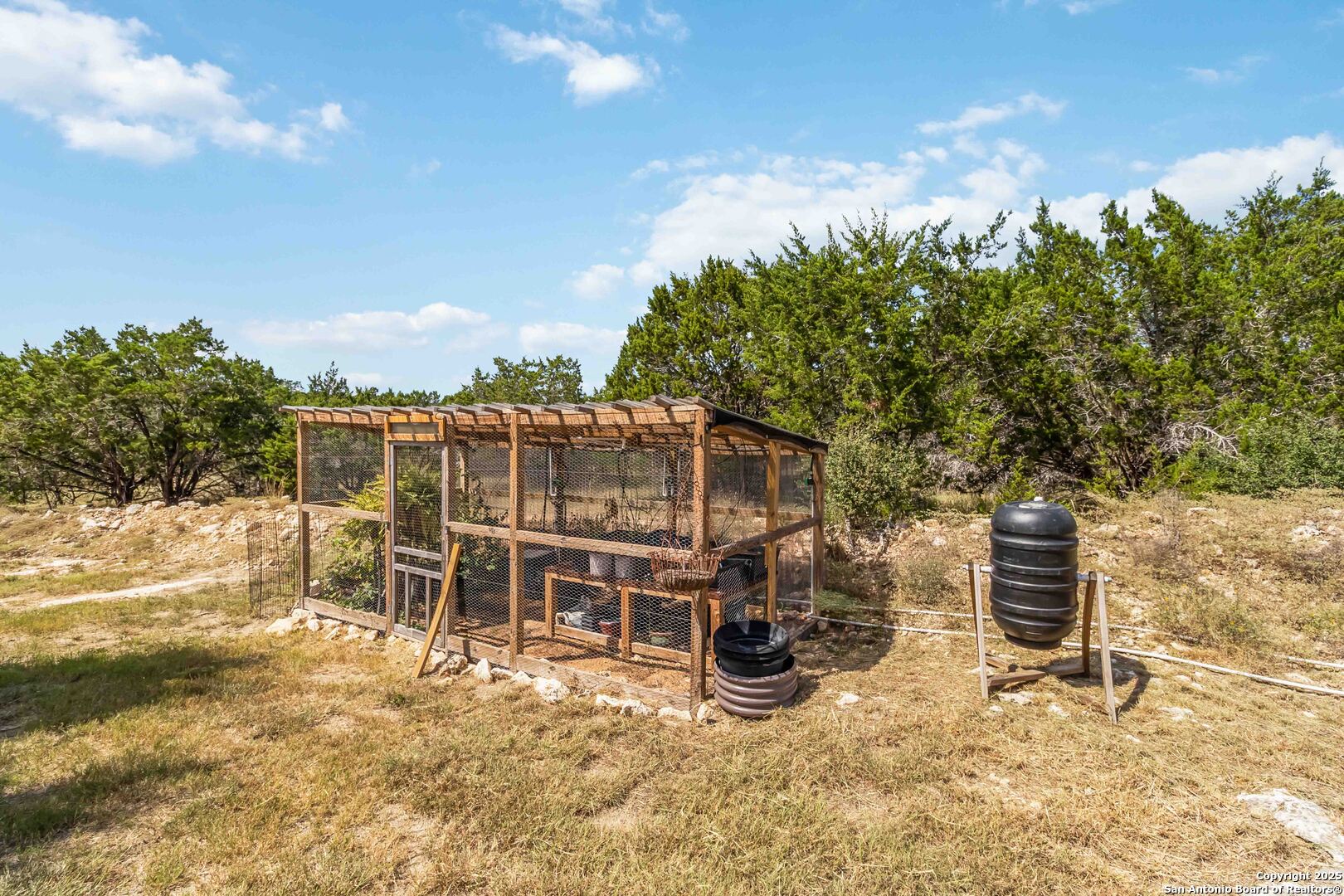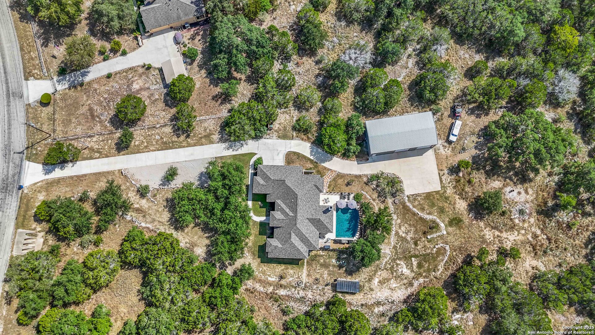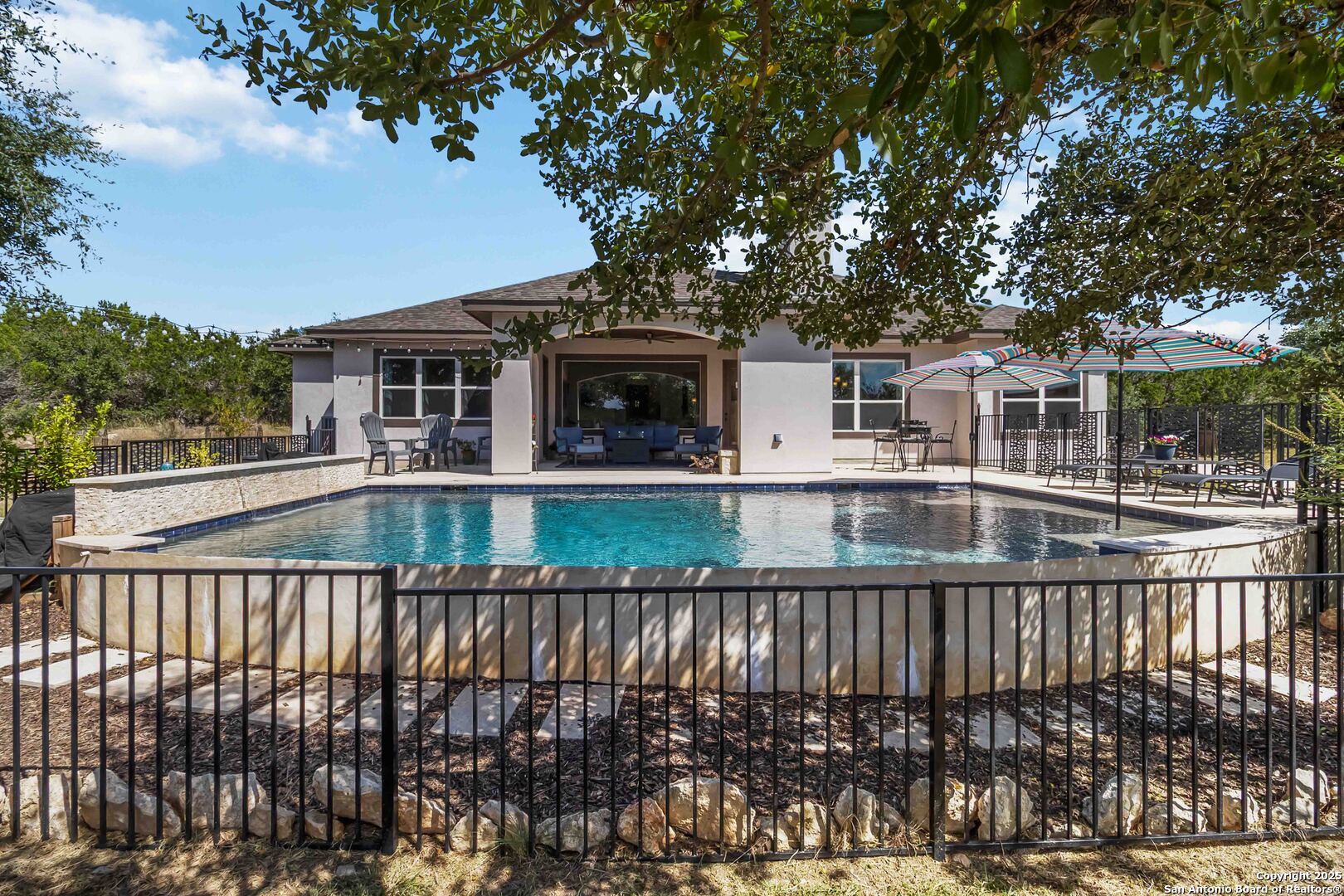 Step into hill country elegance with this striking one story residence, nestled on a sprawling 3.36 acre lot in the exclusive Mystic Shores community. Boasting 3 bedrooms, 2.5 baths, and 2,544 sq ft of thoughtfully designed living space. This home delivers both comfort and sophistication. The open-concept layout flows effortlessly from the foyer through the main living area and into the chef's kitchen, complete with a generous center island, breakfast bar, granite surfaces, and custom cabinetry. Tray and stepped ceilings accent many rooms, while strategically placed wall niches offer subtle architectural interest. Retreat to the primary suite, offering a sitting alcove, double vanities, a garden tub, separate shower, and a large Bespoke walk-in closet. Two additional bedrooms are supported by a full bathroom and a powder room, ideal for guests or flexible use. A dedicated game or media room adds extra living potential with it's own powder room, closet and outdoor access leading the the pool! Step outside into your private outdoor haven. A sparkling in-ground pool with an elegant water feature that adds a touch of resort-style luxury. An oversized covered patio anchored by a built-in fireplace invites year-round enjoyment, whether it's quiet mornings or entertaining under the stars. Nestled in the backyard, the gazebo offers a serene, shaded retreat ideal for morning coffee, evening gatherings, or quiet afternoons surrounded by nature. Just steps away, the greenhouse provides a year-round haven for gardening enthusiasts-whether you're growing fresh herbs, vibrant flowers, or seasonal vegetables, this space is both functional and inspiring. The versatile 30' x 60' metal RV building offers exceptional functionality and space, ideal for storing RVs, boats, vehicles, equipment, or even converting into a workshop or hobby space. Built to last with durable steel construction, this structure features high-clearance entry, wide roll-up doors, and ample interior room for oversized vehicles and storage needs. Whether you're a full-time RV enthusiast, collector, or business owner, this building provides the security, space, and flexibility to accommodate a wide range of uses. Beyond your front door, Mystic Shores rewards residents with expansive amenities: parks, trails, community pool access, lakefront recreation, and more - all within a community that blends natural beauty, privacy, and convenience. Don't miss the chance to own a move-in ready, architecturally rich home in one of Spring Branch's most desirable enclaves.