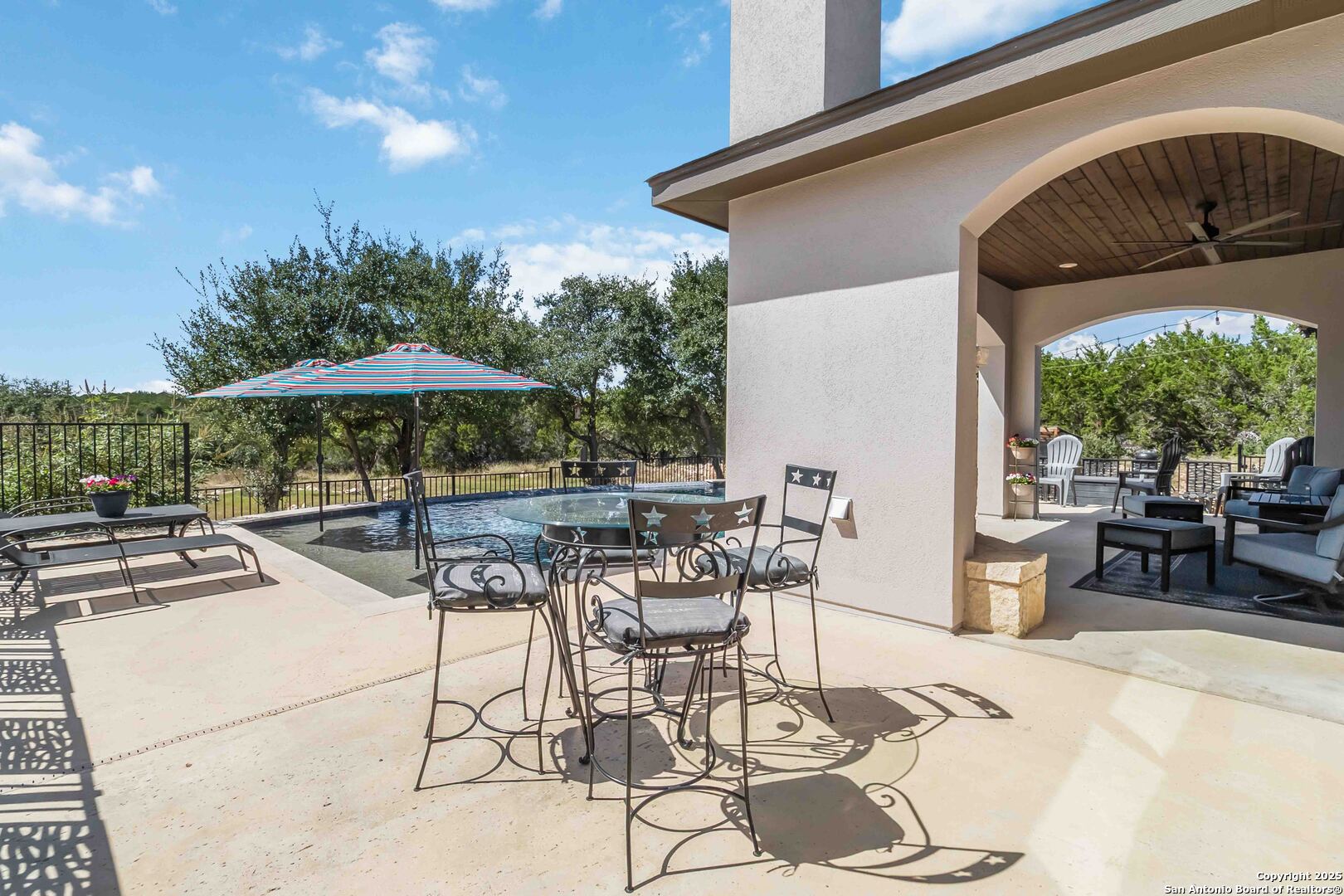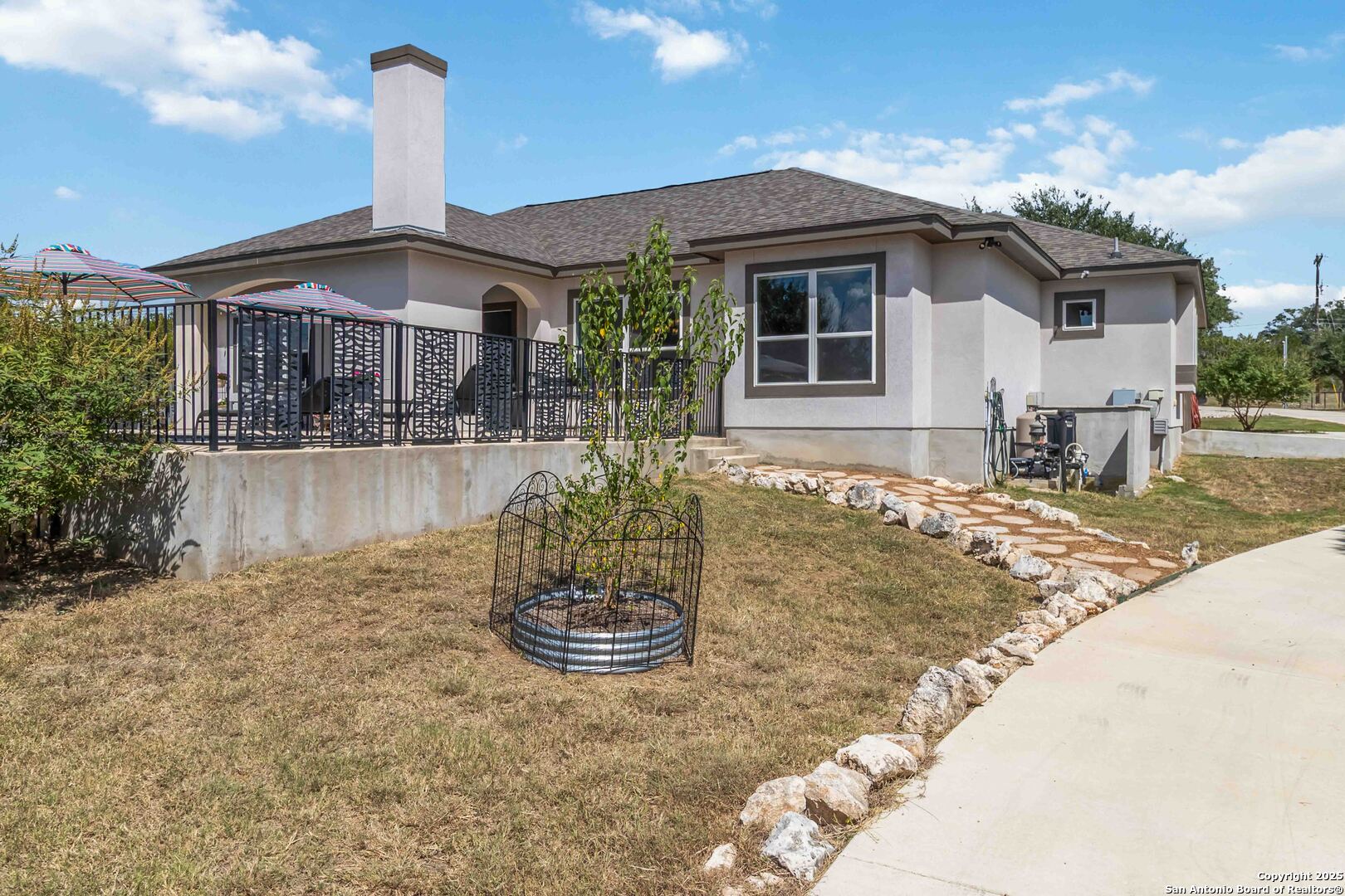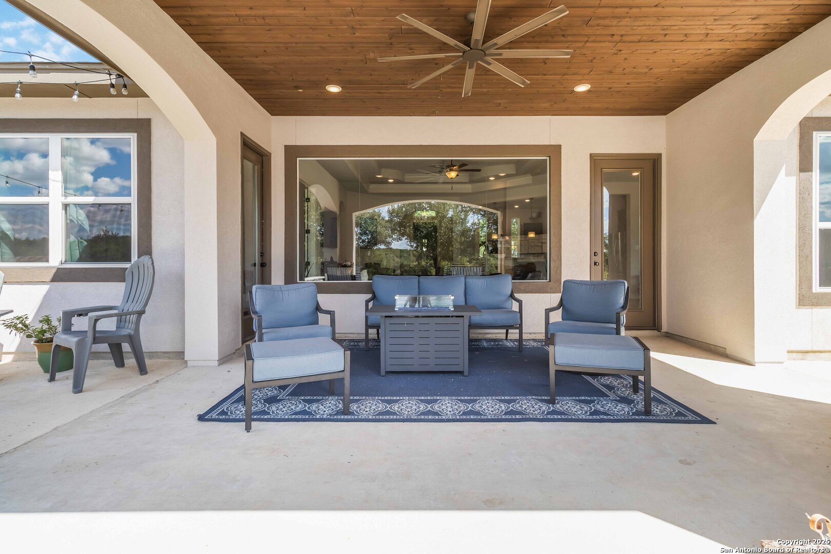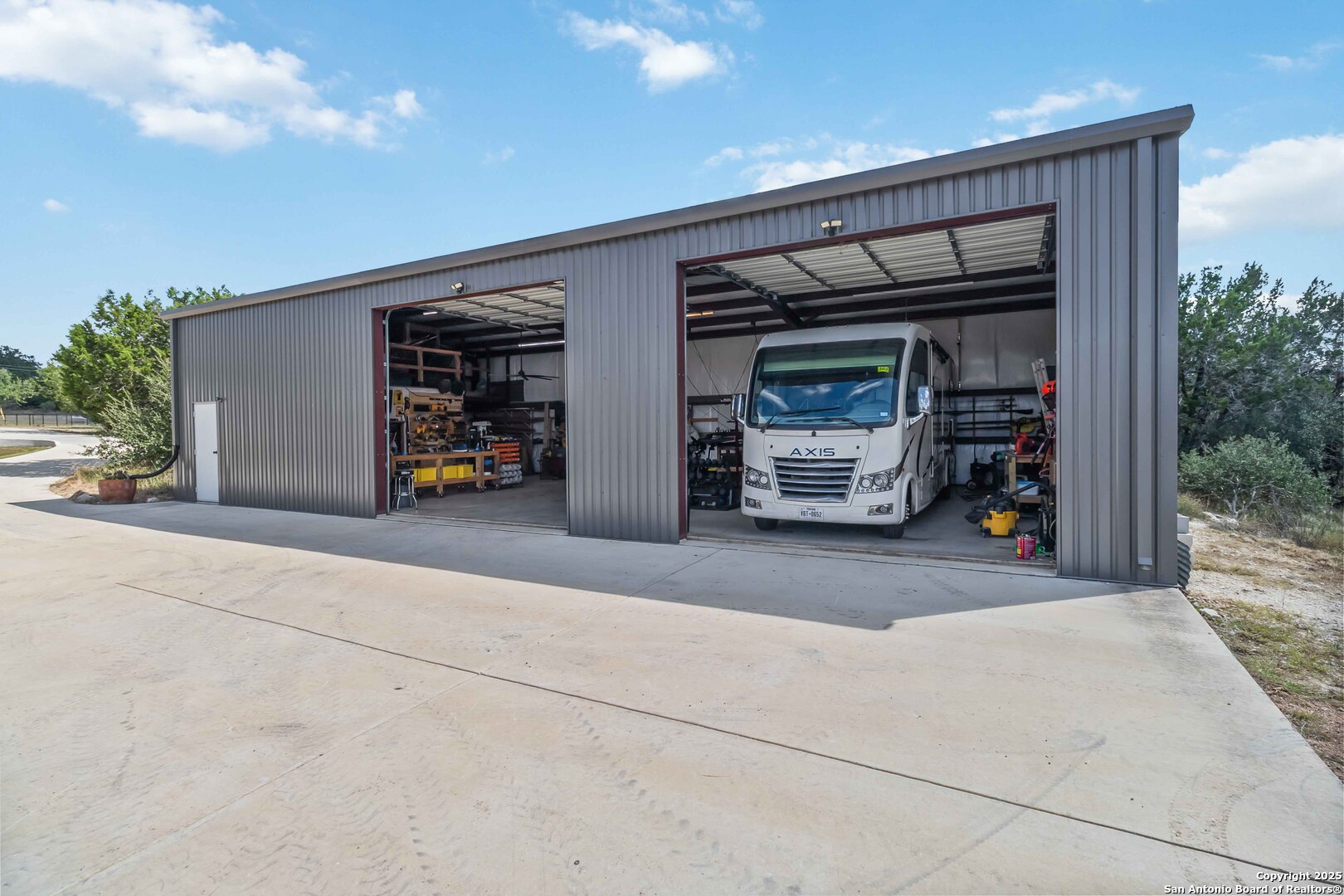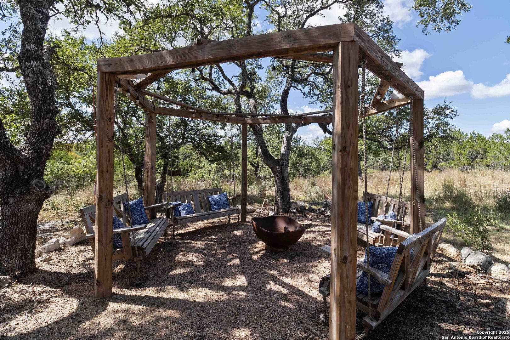 Step into hill country elegance with this striking one story residence, nestled on a sprawling 3.36 acre lot in the exclusive Mystic Shores community. Boasting 3 bedrooms, 2.5 baths, and 2,544 sq ft of thoughtfully designed living space. This home delivers both comfort and sophistication. The open-concept layout flows effortlessly from the foyer through the main living area and into the chef's kitchen, complete with a generous center island, breakfast bar, granite surfaces, and custom cabinetry. Tray and stepped ceilings accent many rooms, while strategically placed wall niches offer subtle architectural interest. Retreat to the primary suite, offering a sitting alcove, double vanities, a garden tub, separate shower, and a large Bespoke walk-in closet. Two additional bedrooms are supported by a full bathroom and a powder room, ideal for guests or flexible use. A dedicated game or media room adds extra living potential with it's own powder room, closet and outdoor access leading the the pool! Step outside into your private outdoor haven. A sparkling in-ground pool with an elegant water feature that adds a touch of resort-style luxury. An oversized covered patio anchored by a built-in fireplace invites year-round enjoyment, whether it's quiet mornings or entertaining under the stars. Nestled in the backyard, the gazebo offers a serene, shaded retreat ideal for morning coffee, evening gatherings, or quiet afternoons surrounded by nature. Just steps away, the greenhouse provides a year-round haven for gardening enthusiasts-whether you're growing fresh herbs, vibrant flowers, or seasonal vegetables, this space is both functional and inspiring. The versatile 30' x 60' metal RV building offers exceptional functionality and space, ideal for storing RVs, boats, vehicles, equipment, or even converting into a workshop or hobby space. Built to last with durable steel construction, this structure features high-clearance entry, wide roll-up doors, and ample interior room for oversized vehicles and storage needs. Whether you're a full-time RV enthusiast, collector, or business owner, this building provides the security, space, and flexibility to accommodate a wide range of uses. Beyond your front door, Mystic Shores rewards residents with expansive amenities: parks, trails, community pool access, lakefront recreation, and more - all within a community that blends natural beauty, privacy, and convenience. Don't miss the chance to own a move-in ready, architecturally rich home in one of Spring Branch's most desirable enclaves.